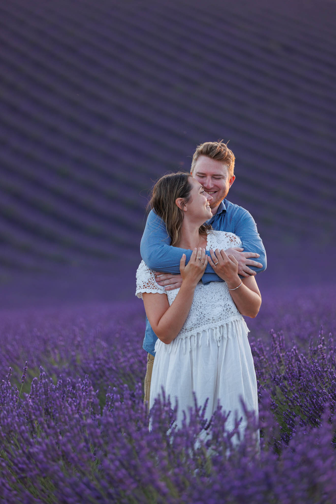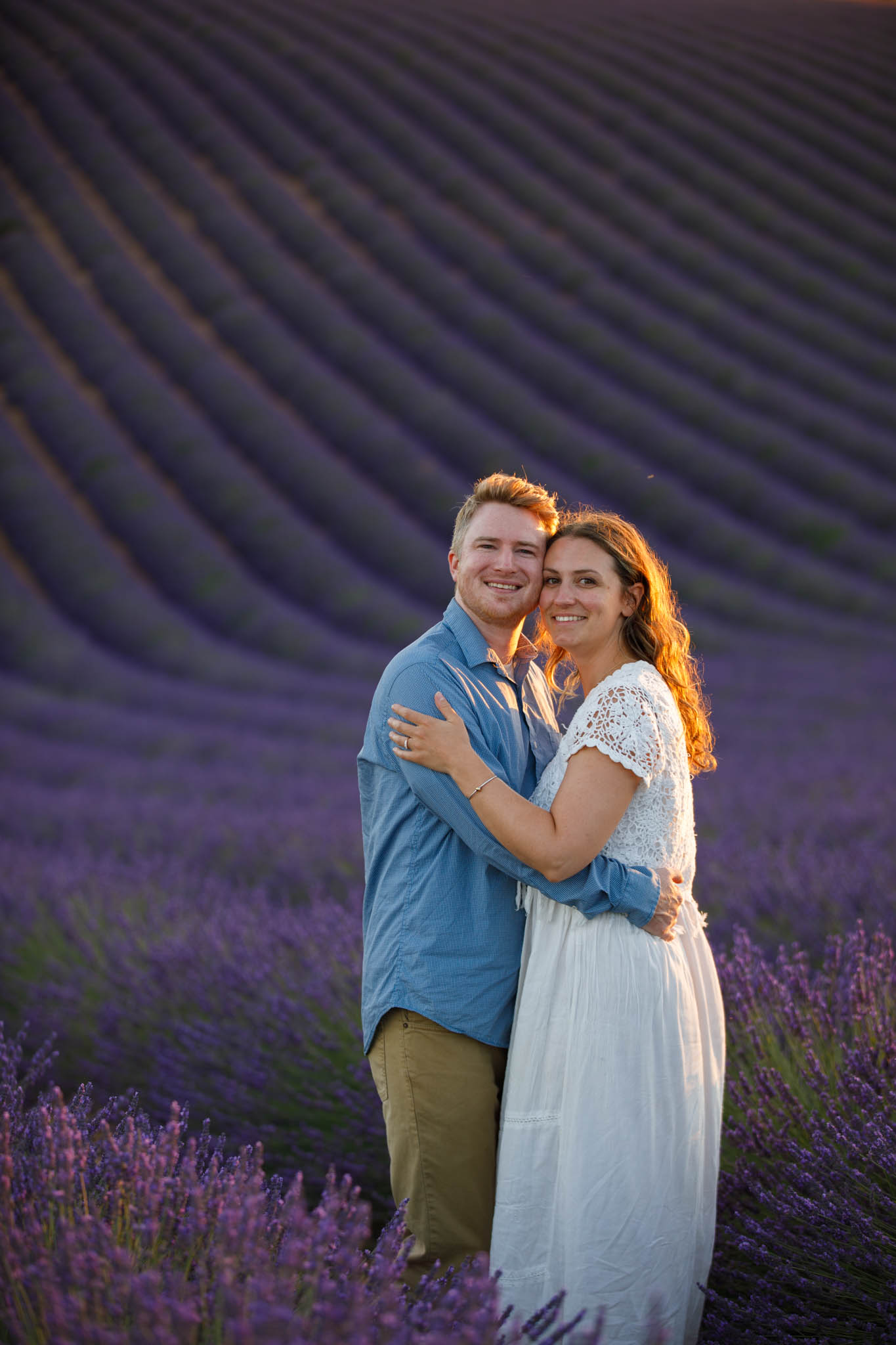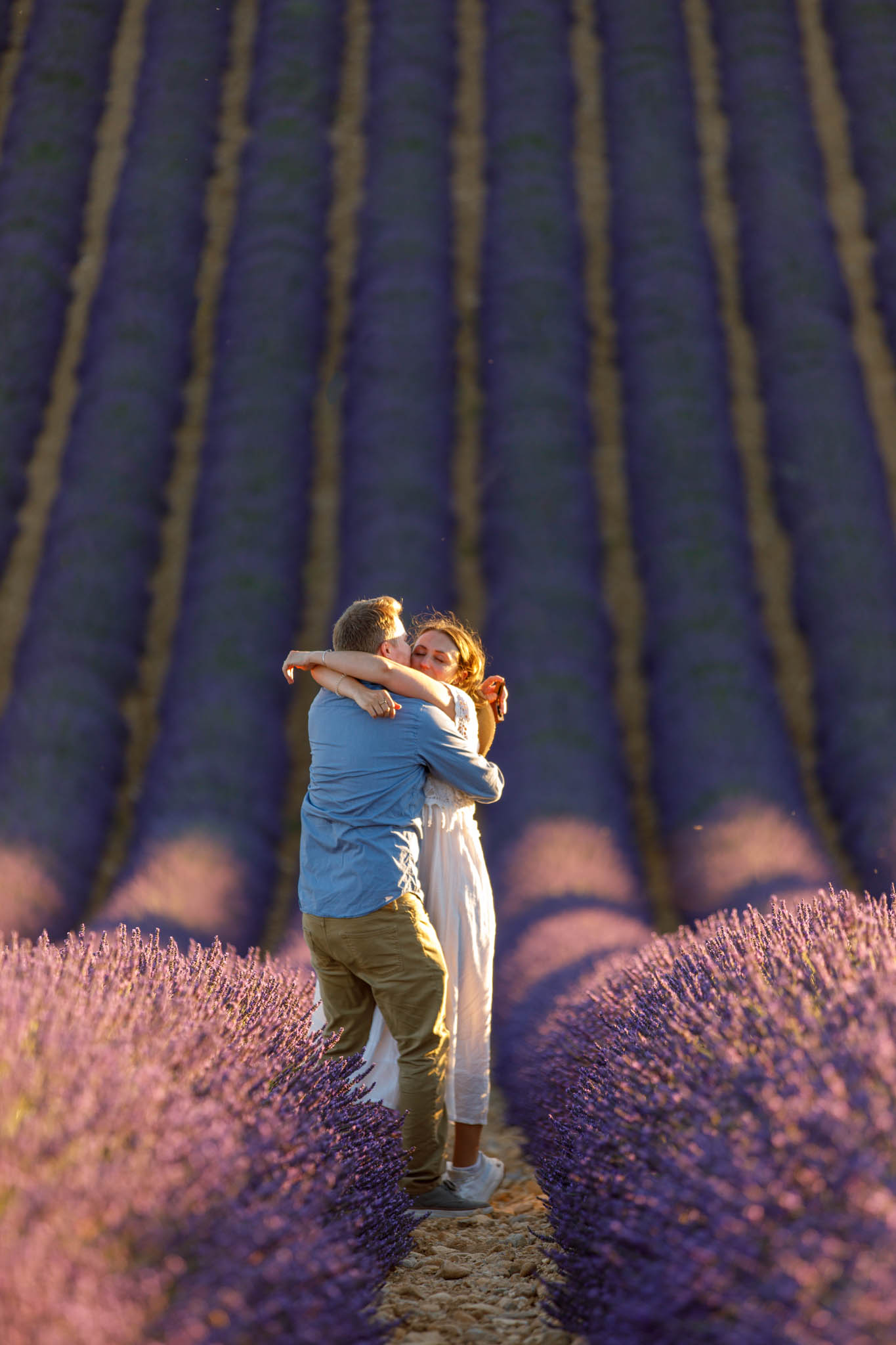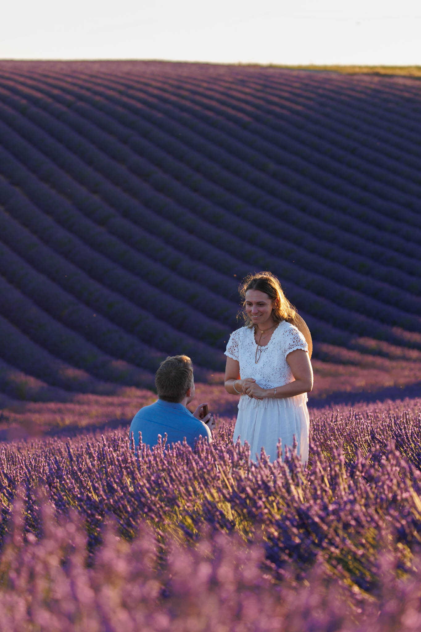 In early July, T carefully planned a sunset proposal for E in the lavender fields near Valensole. He chose what we call the “Dip Field”, a beautiful spot about ten minutes from the village. The field is known for its dramatic slope, which makes the lavender appear to stretch on endlessly from certain angles and creates a naturally cinematic backdrop.