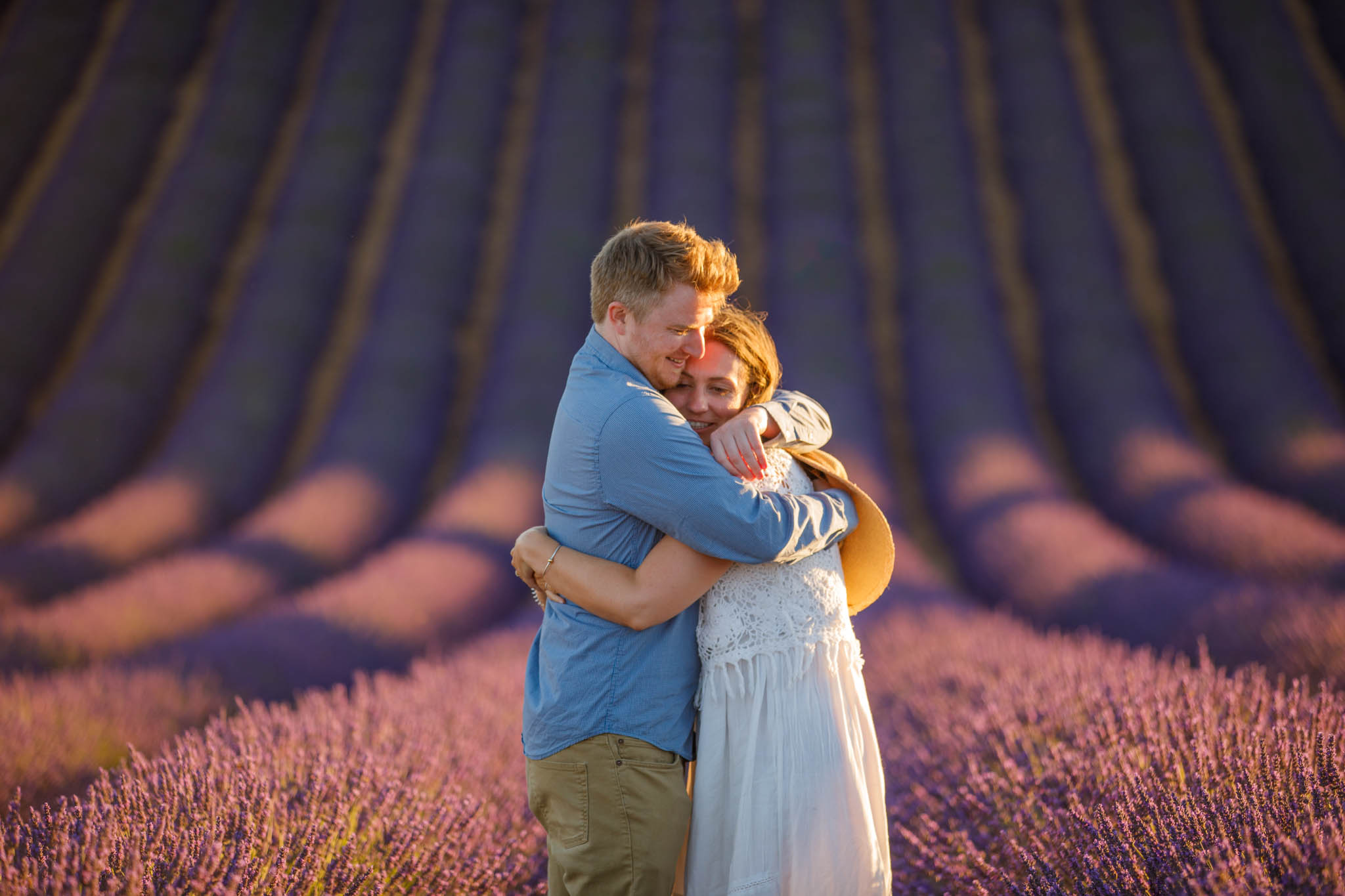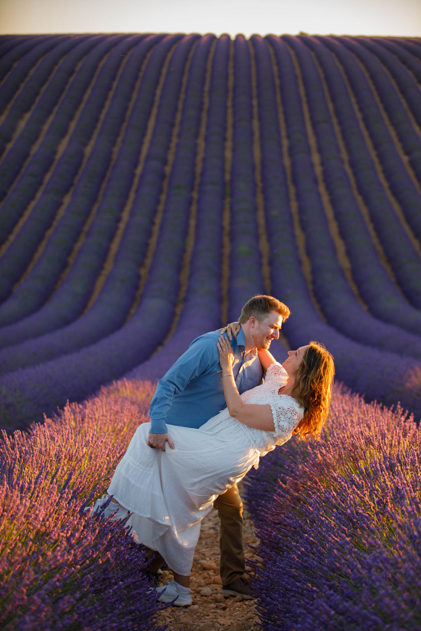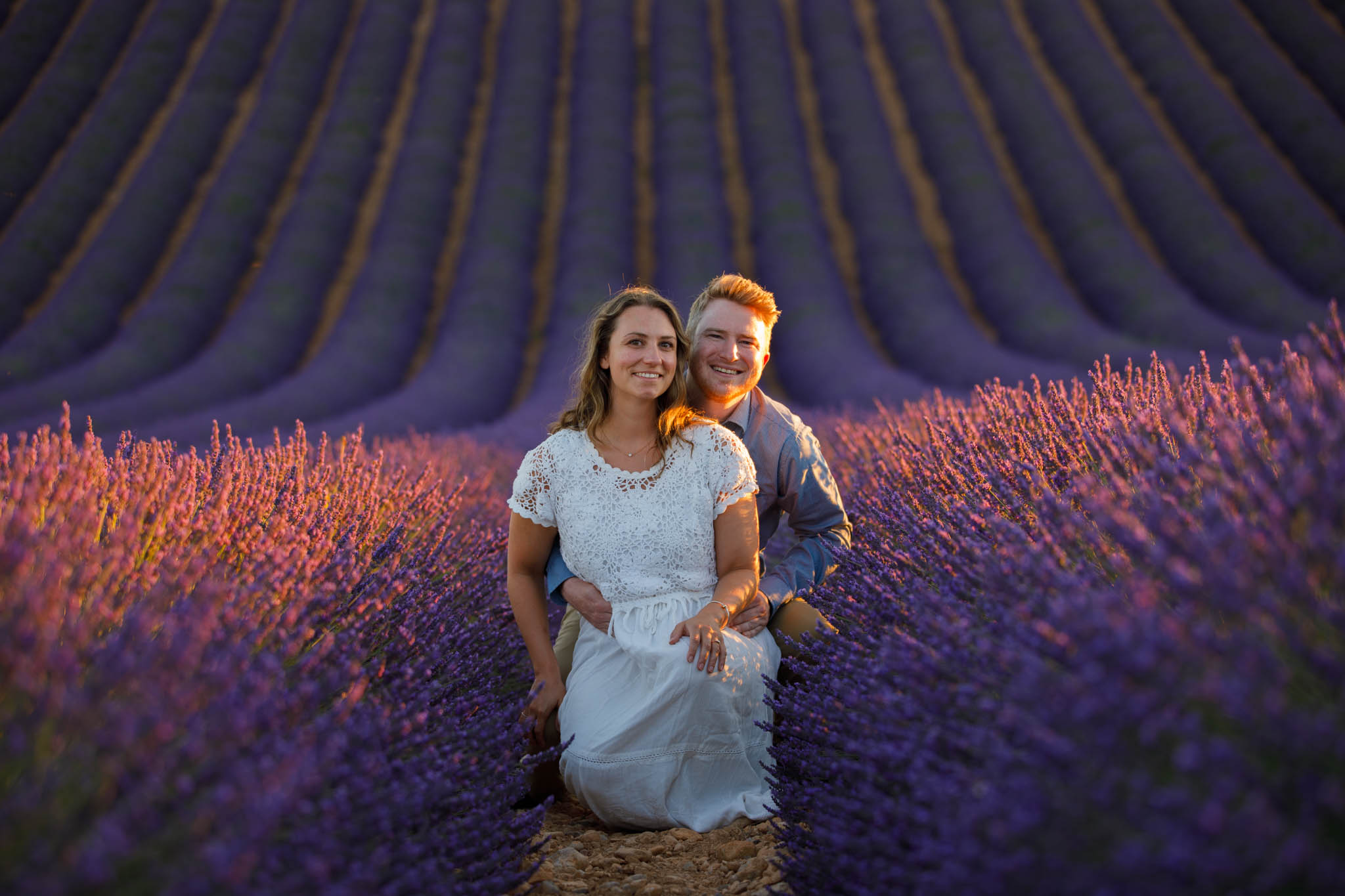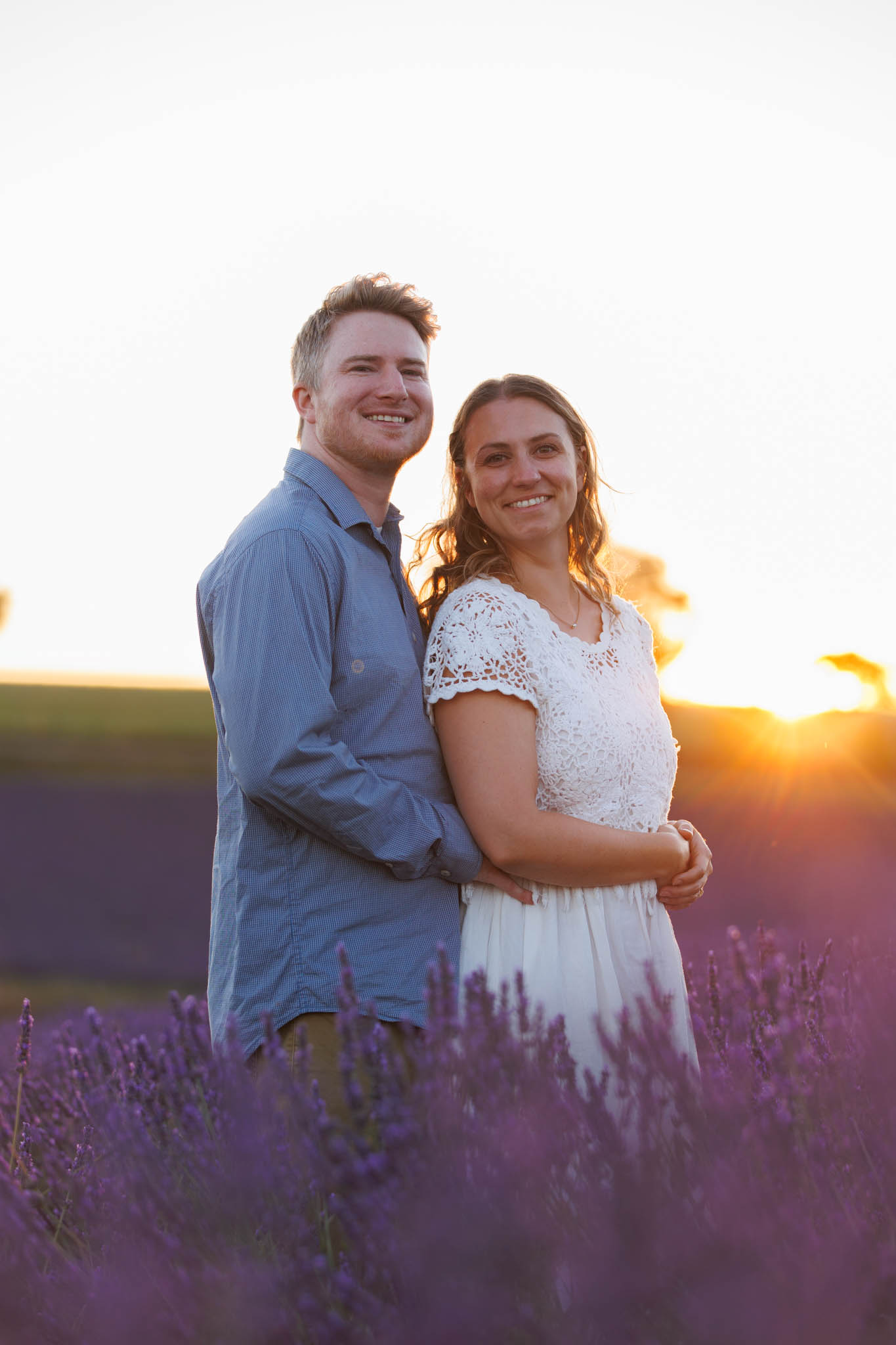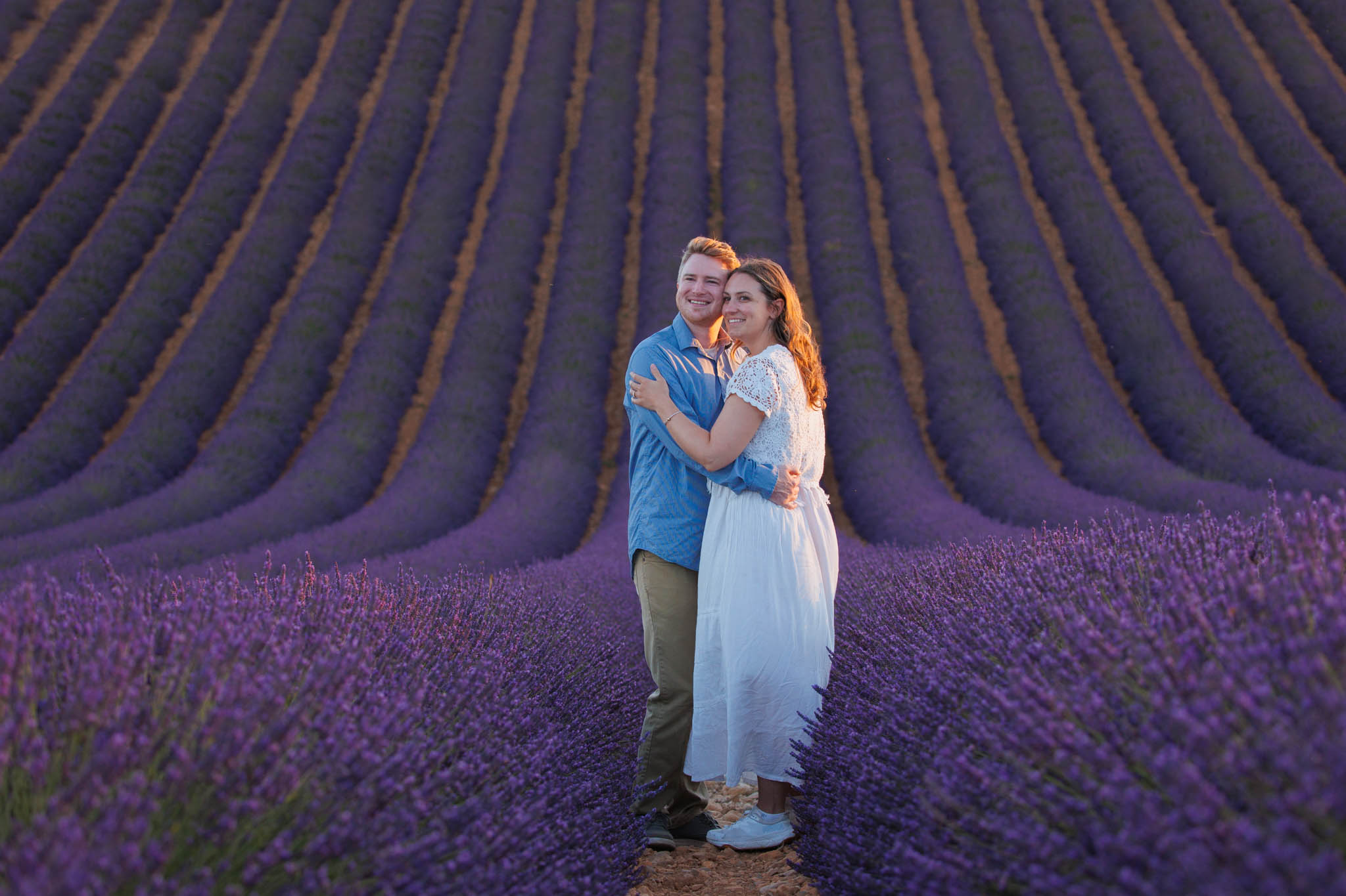 In early July, T carefully planned a sunset proposal for E in the lavender fields near Valensole. He chose what we call the “Dip Field”, a beautiful spot about ten minutes from the village. The field is known for its dramatic slope, which makes the lavender appear to stretch on endlessly from certain angles and creates a naturally cinematic backdrop.