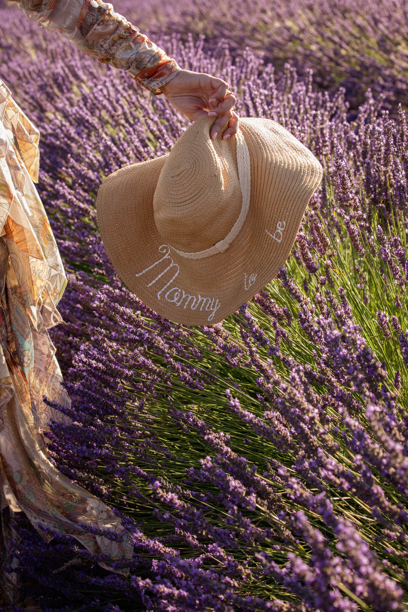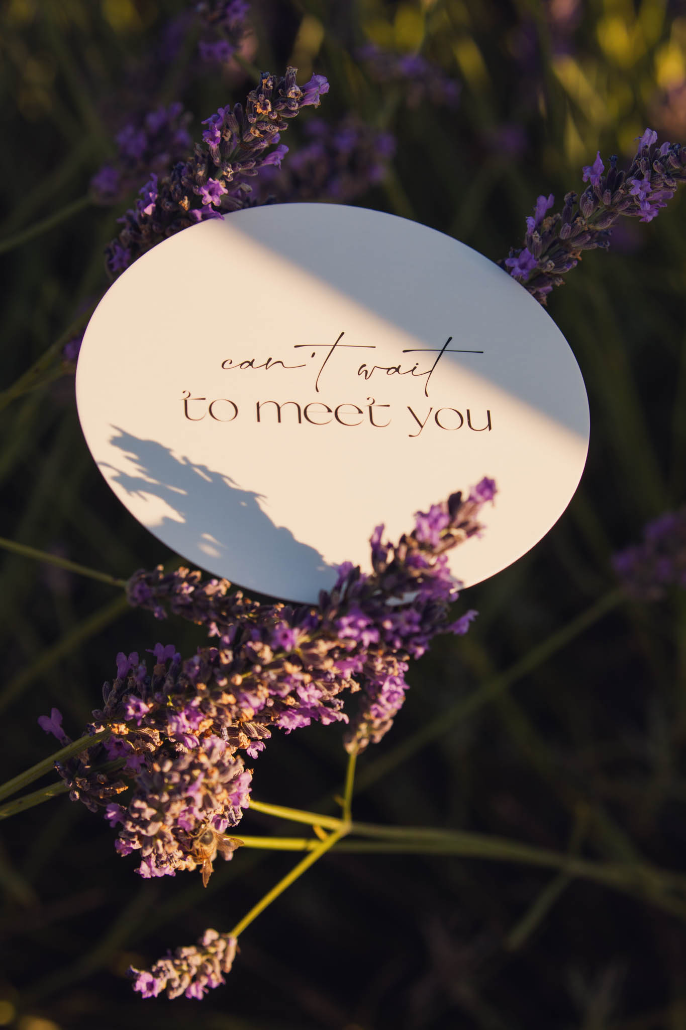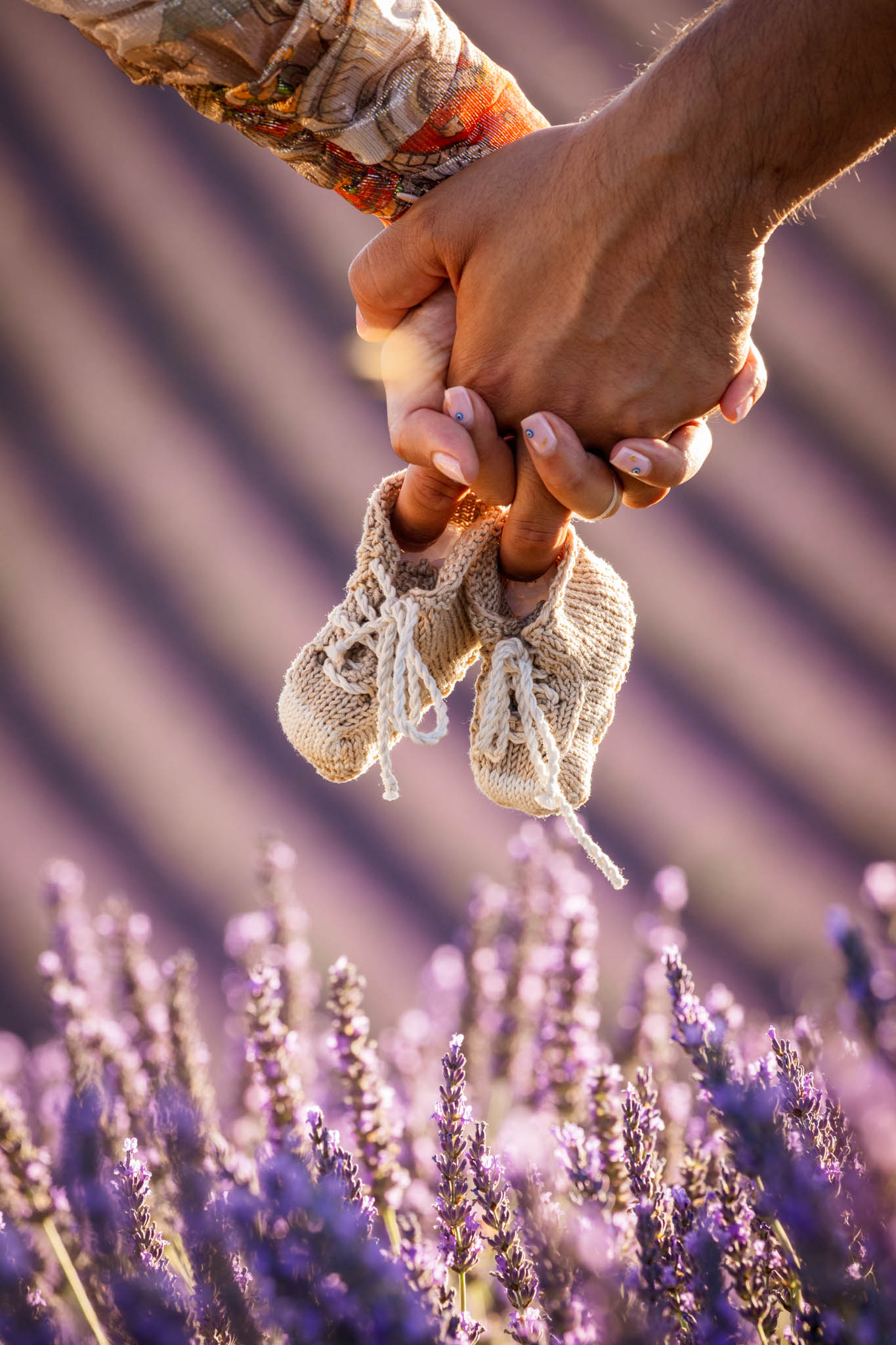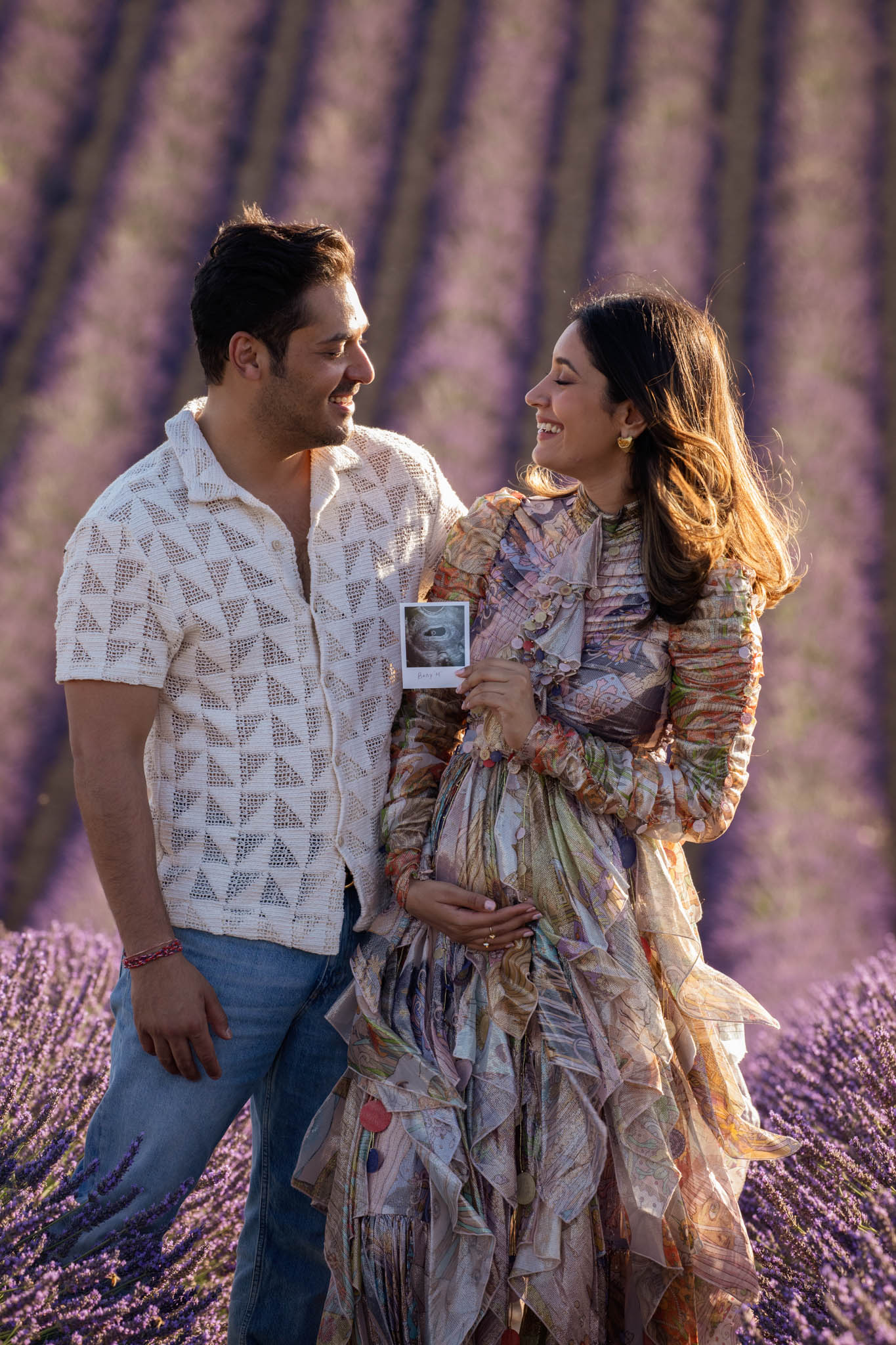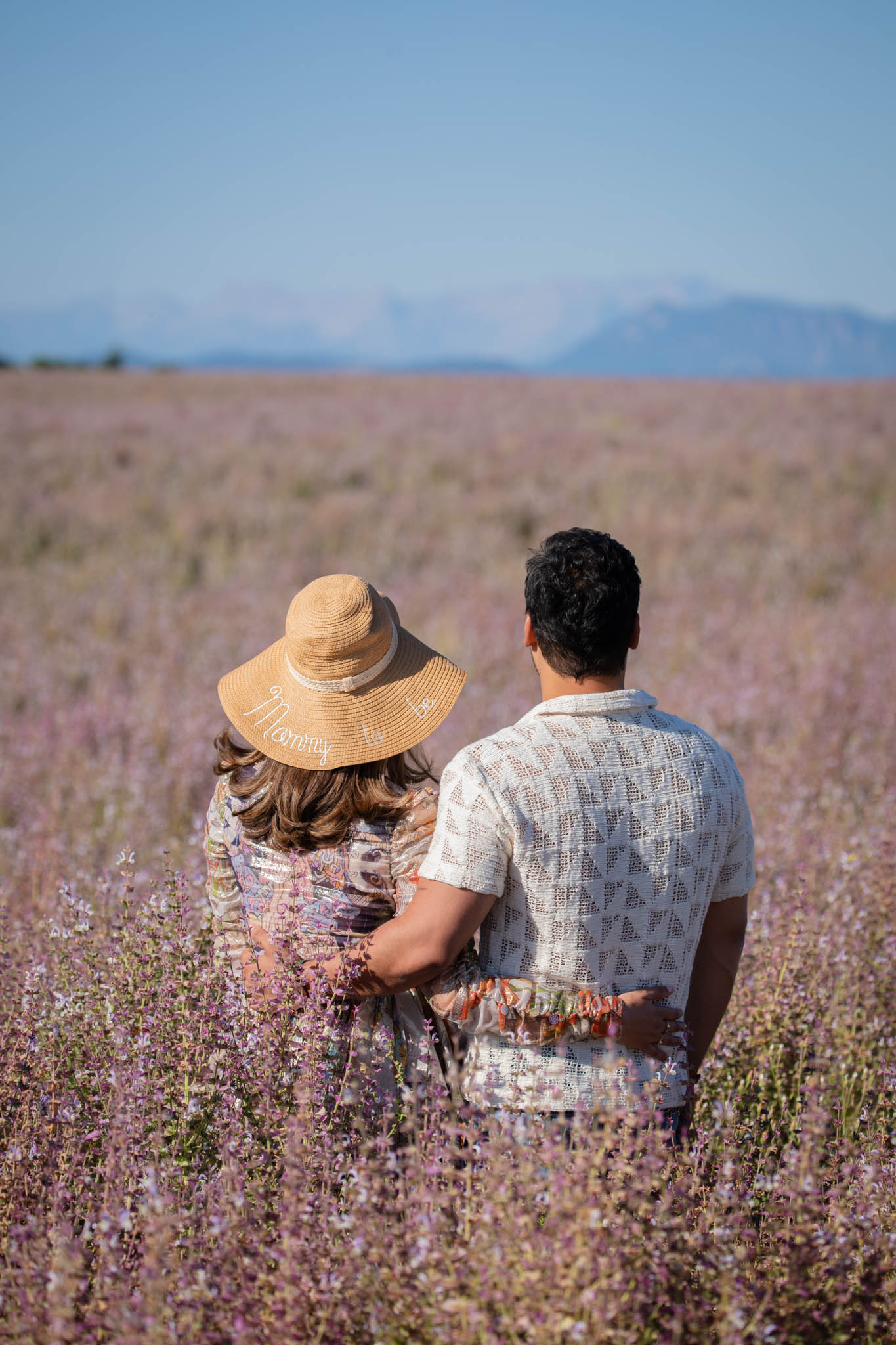 We began the session in a beautiful sage field close to Valensole. A and S prepared exceptionally well for this session, which made a big difference. They brought thoughtful props to celebrate their baby girl, which really elevates maternity sessions.