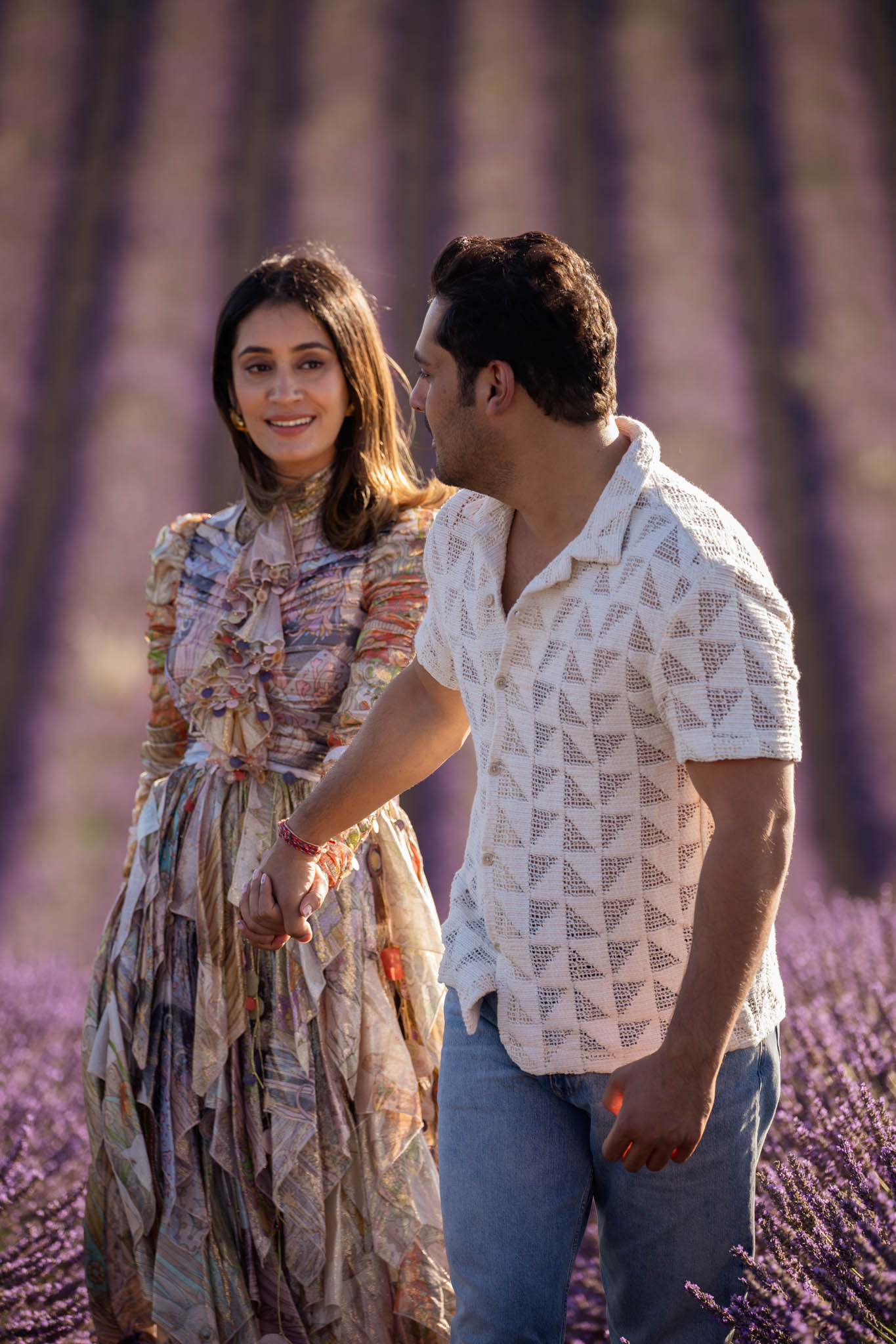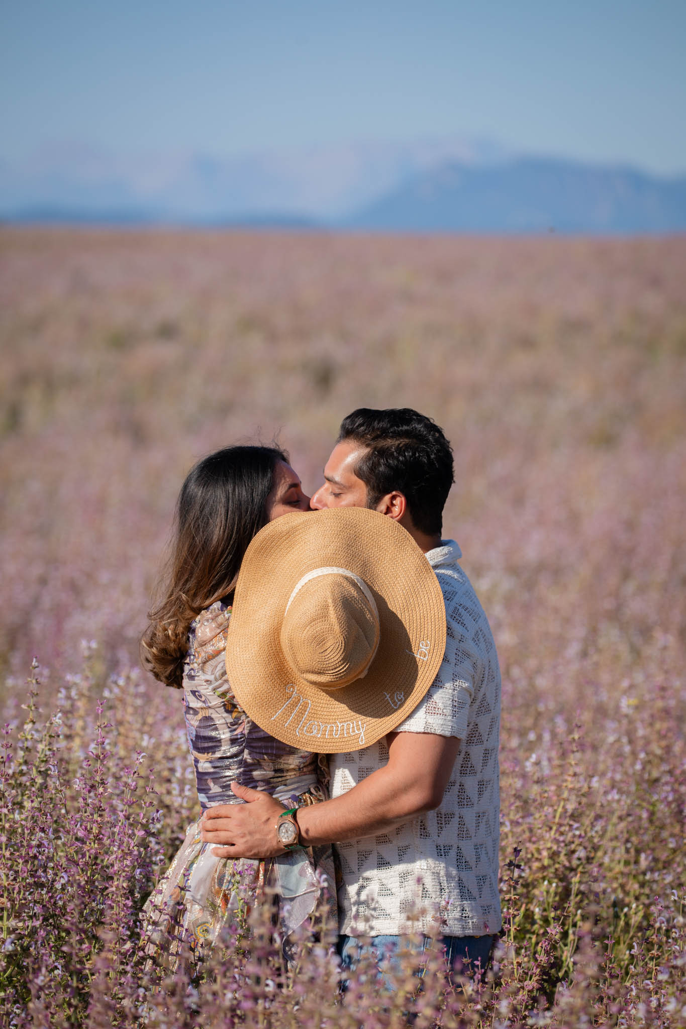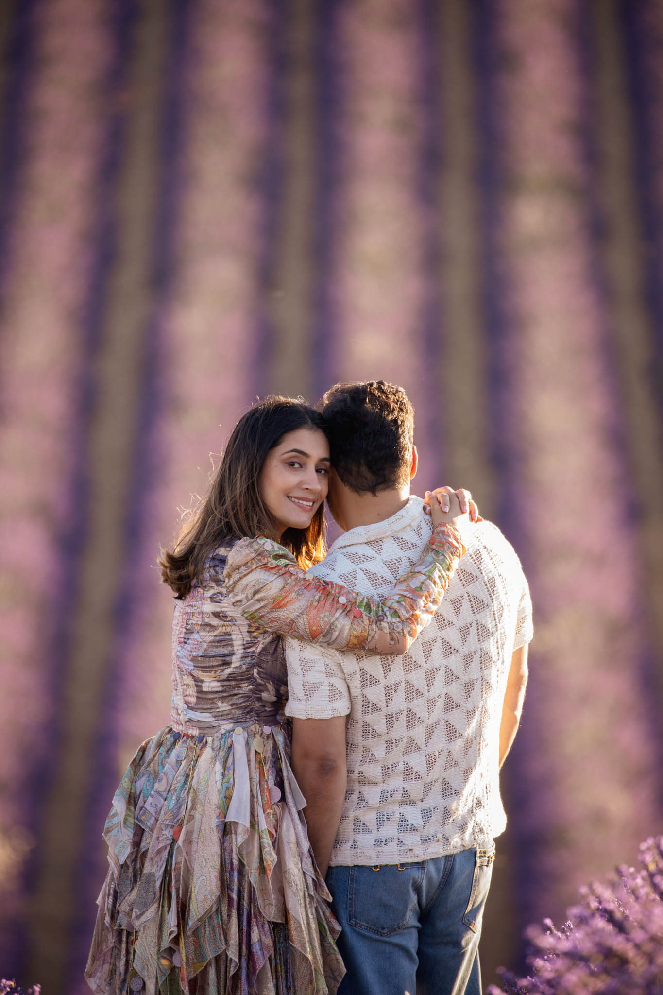 This session took place in mid-July in the Valensole region. A and S were visiting from India and had only one day in the area, so we scheduled a two-hour session from 18:00 to 20:00. The timing allowed us to capture the soft evening light as the sun approached the horizon. They did not want full sunset lighting because they needed to leave at 20:00 to return to Nice, so we focused on the soft lighting just before sunset.