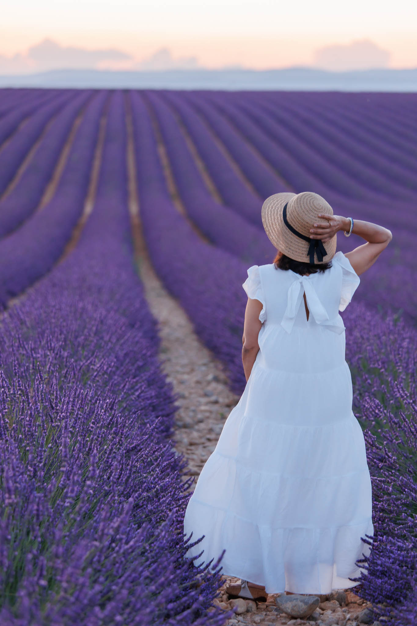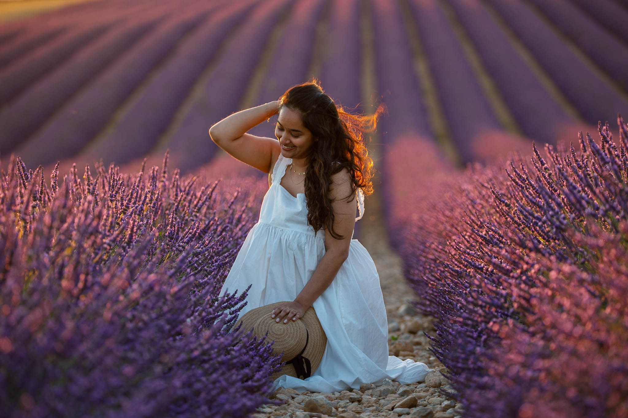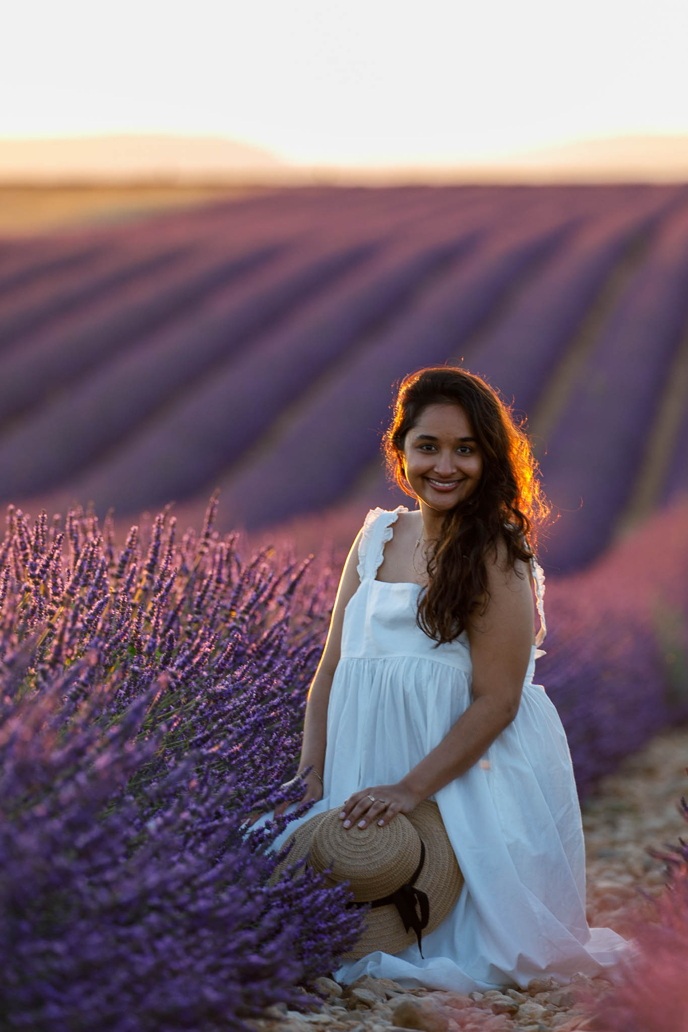 This session took place in early July, in one of our favourite fields between Lavandes Angelvin and the town of Valensole. The last week of June and the first week of July are some of the best times to photograph in the lavender fields. At this point, the lavender is fully vibrant, the light is soft and golden, and the fields feel expansive and romantic.