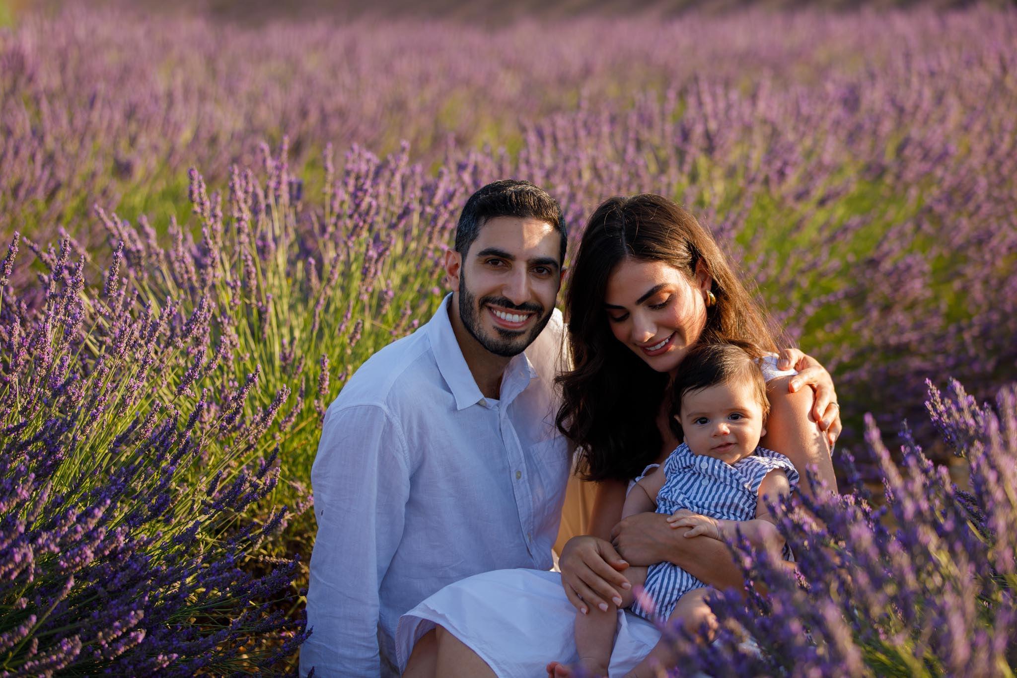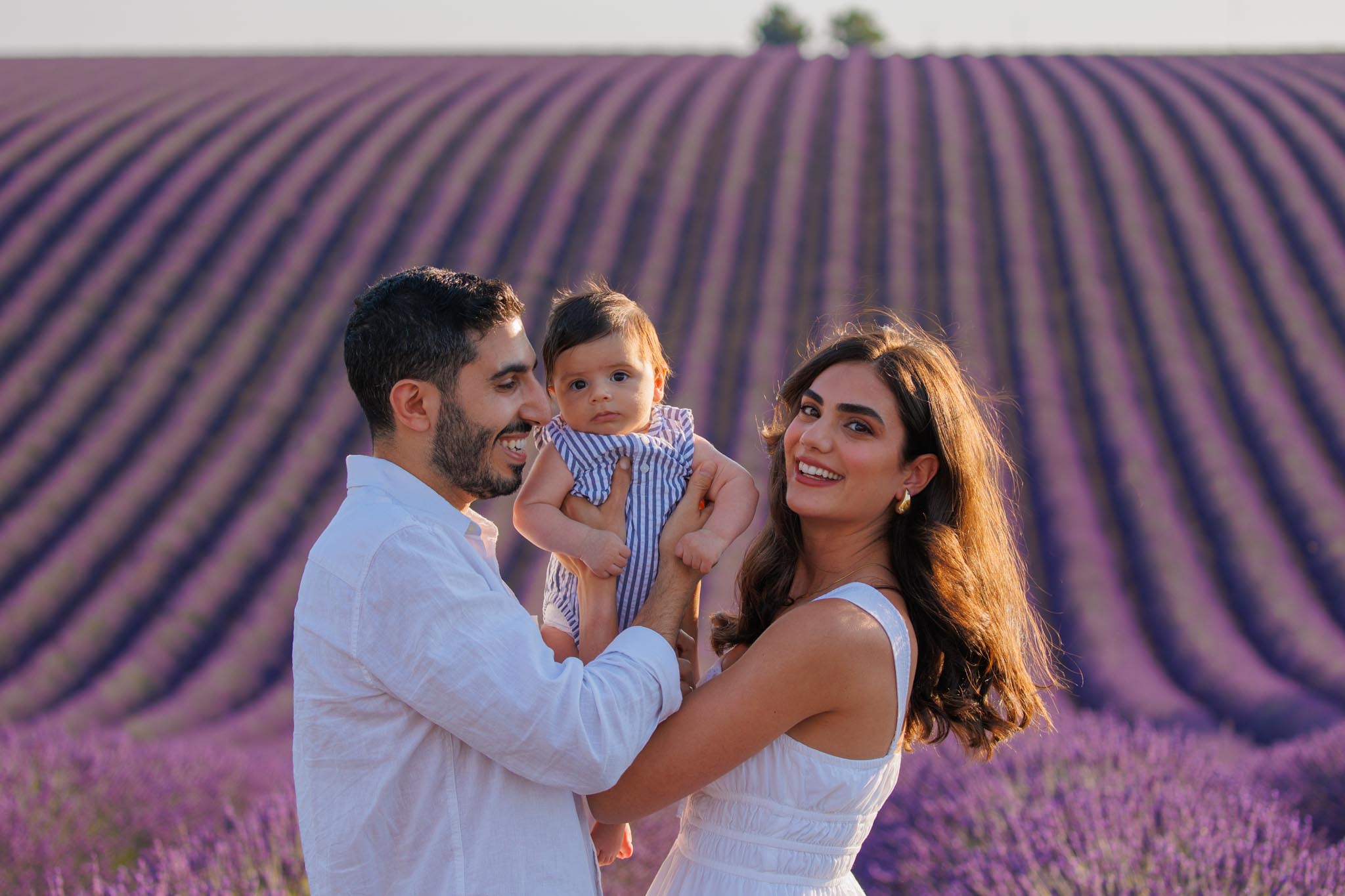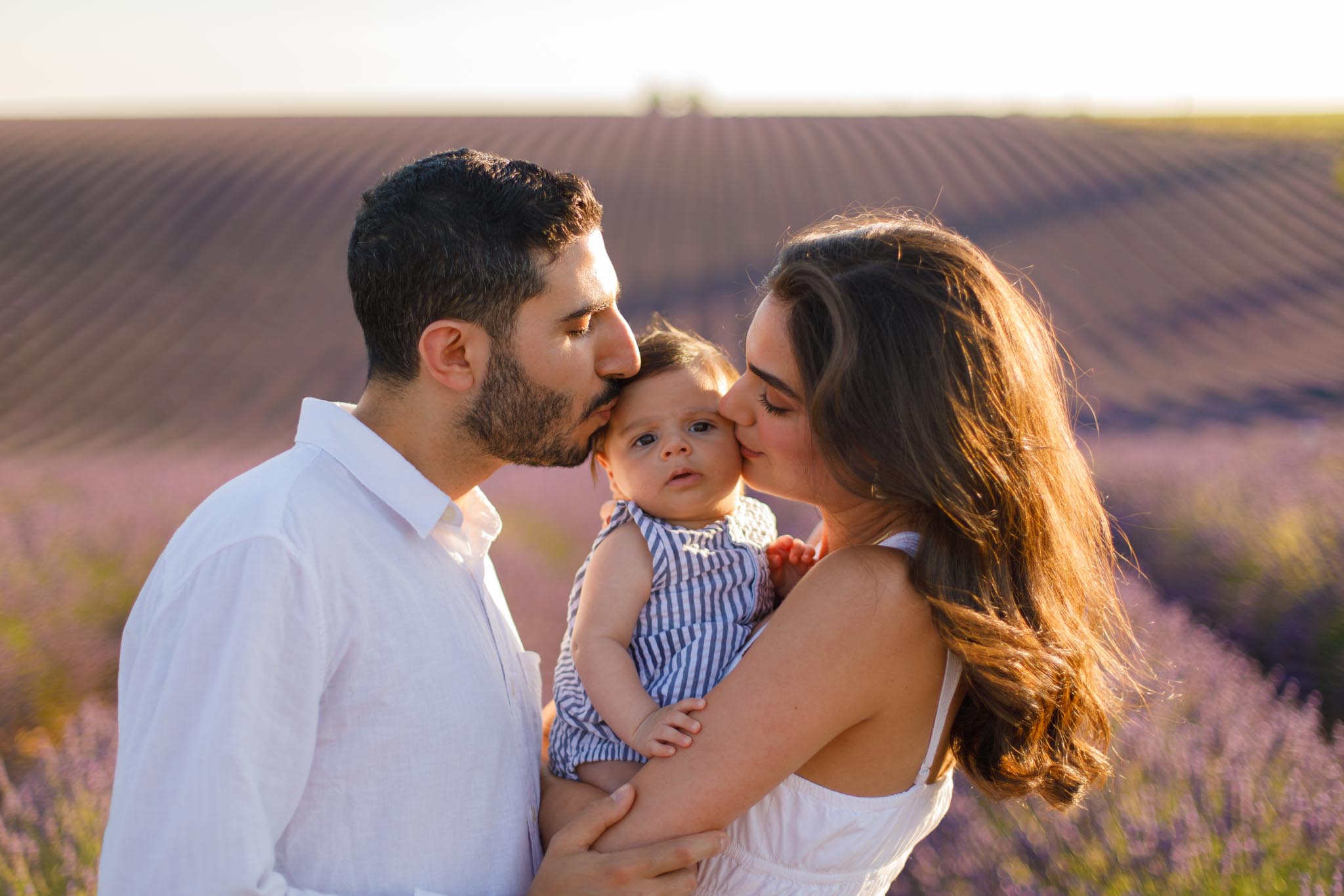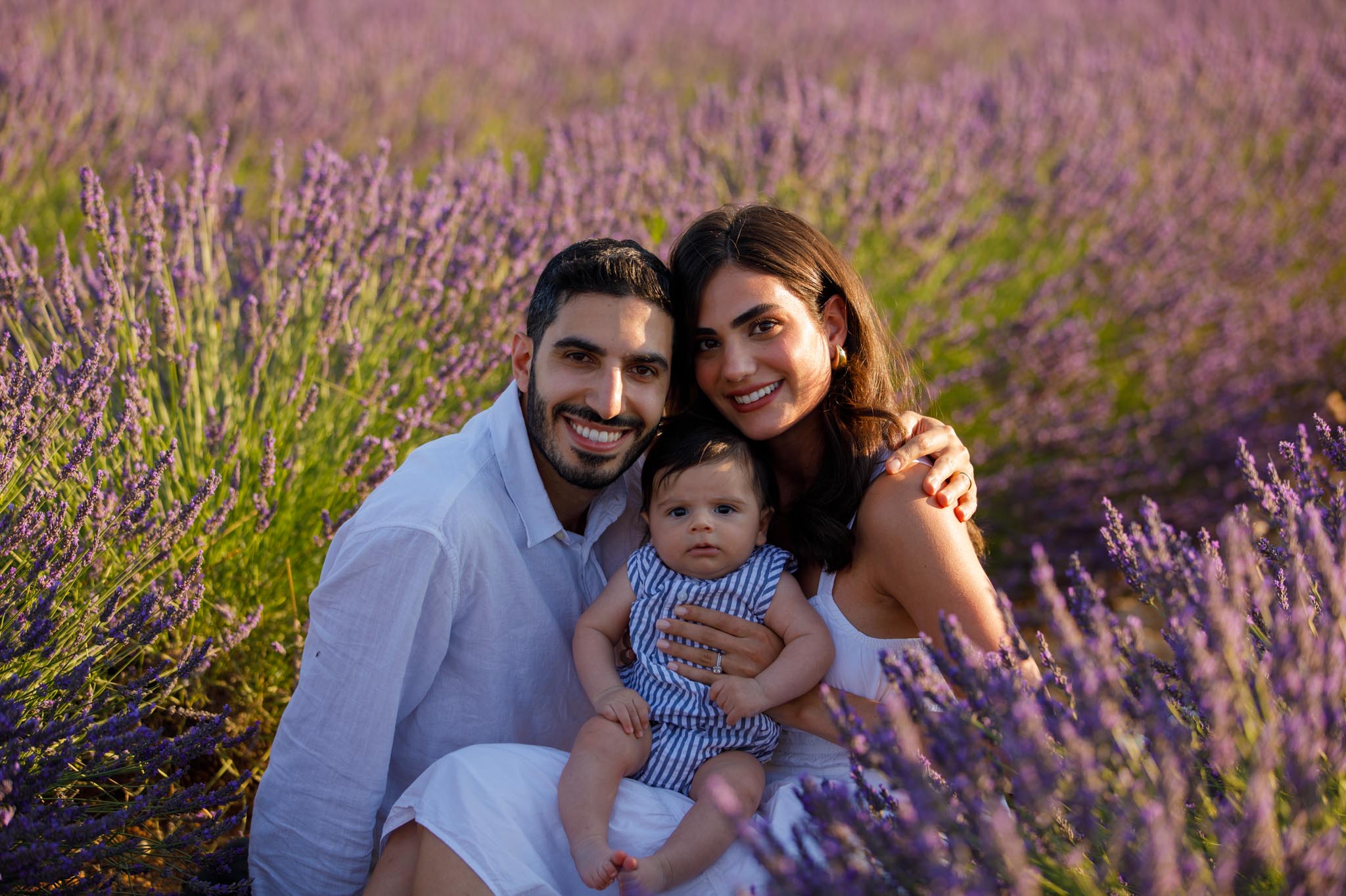 The second part of the session took place a few days later on 8 July 2024 from 19:45 to 20:15, surrounded by the lavender fields of Provence. This timing was chosen carefully to keep the light airy and bright rather than sunset-dramatic, perfect for soft family imagery with a newborn.