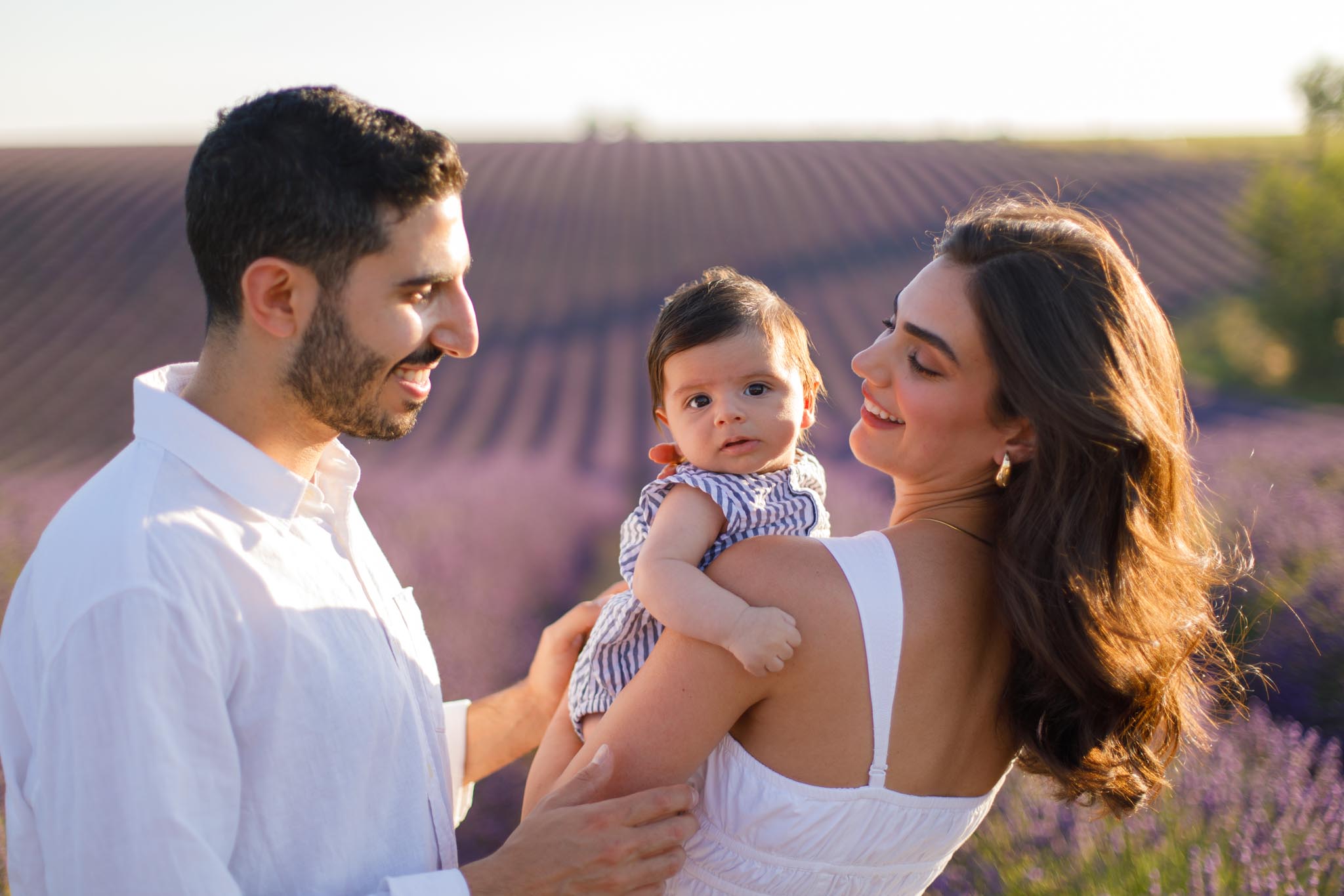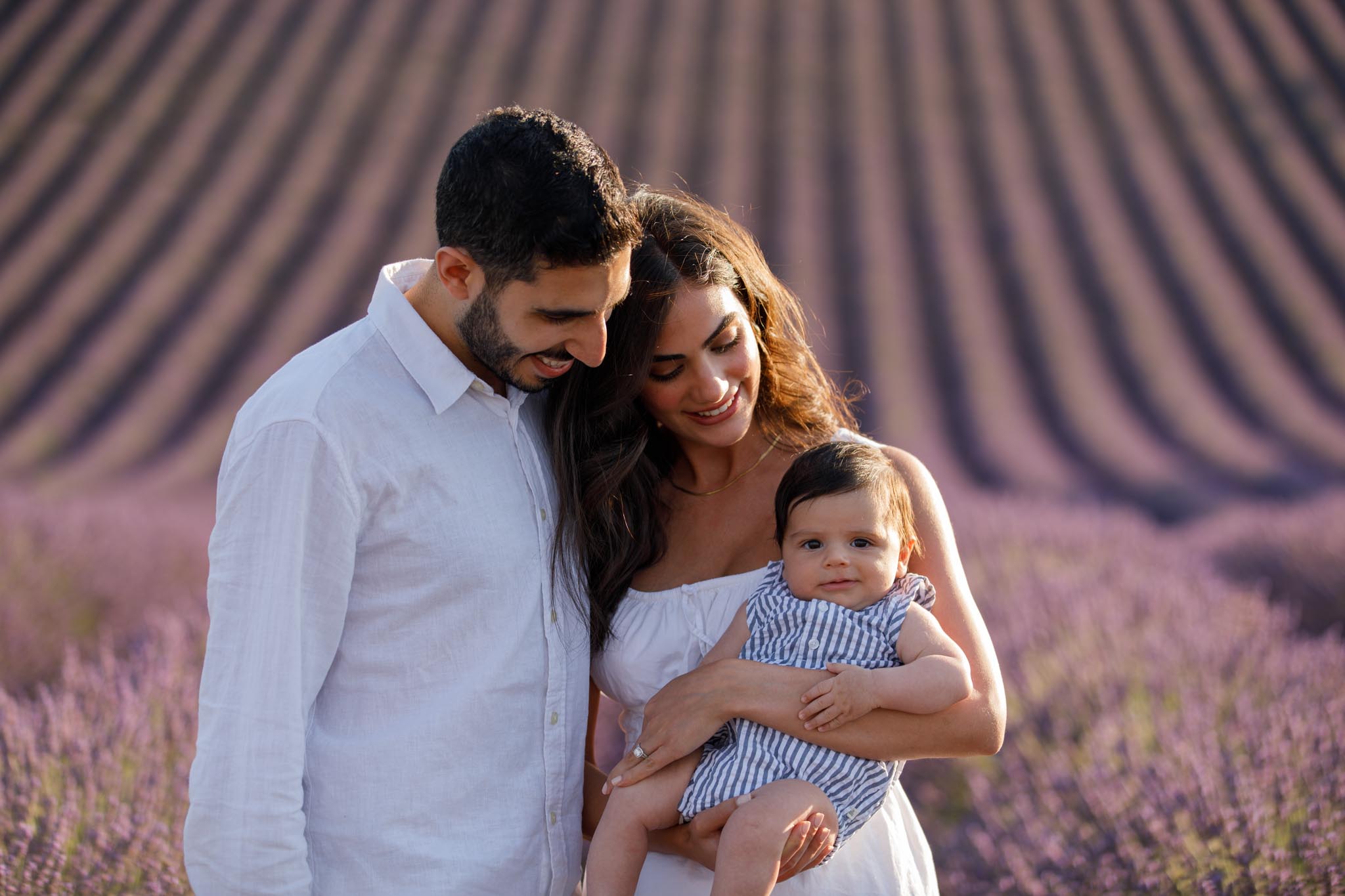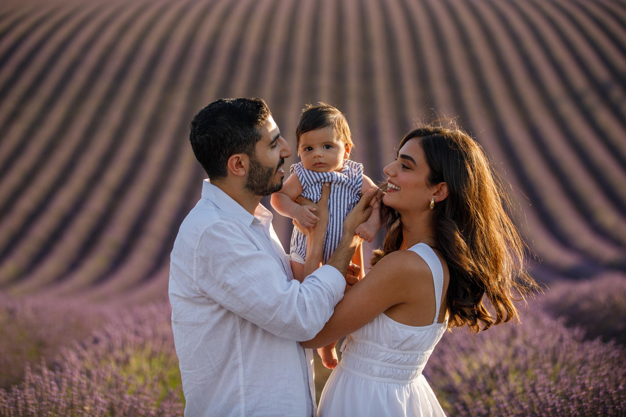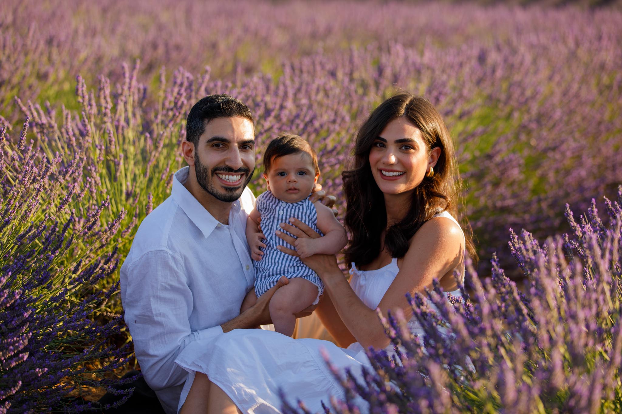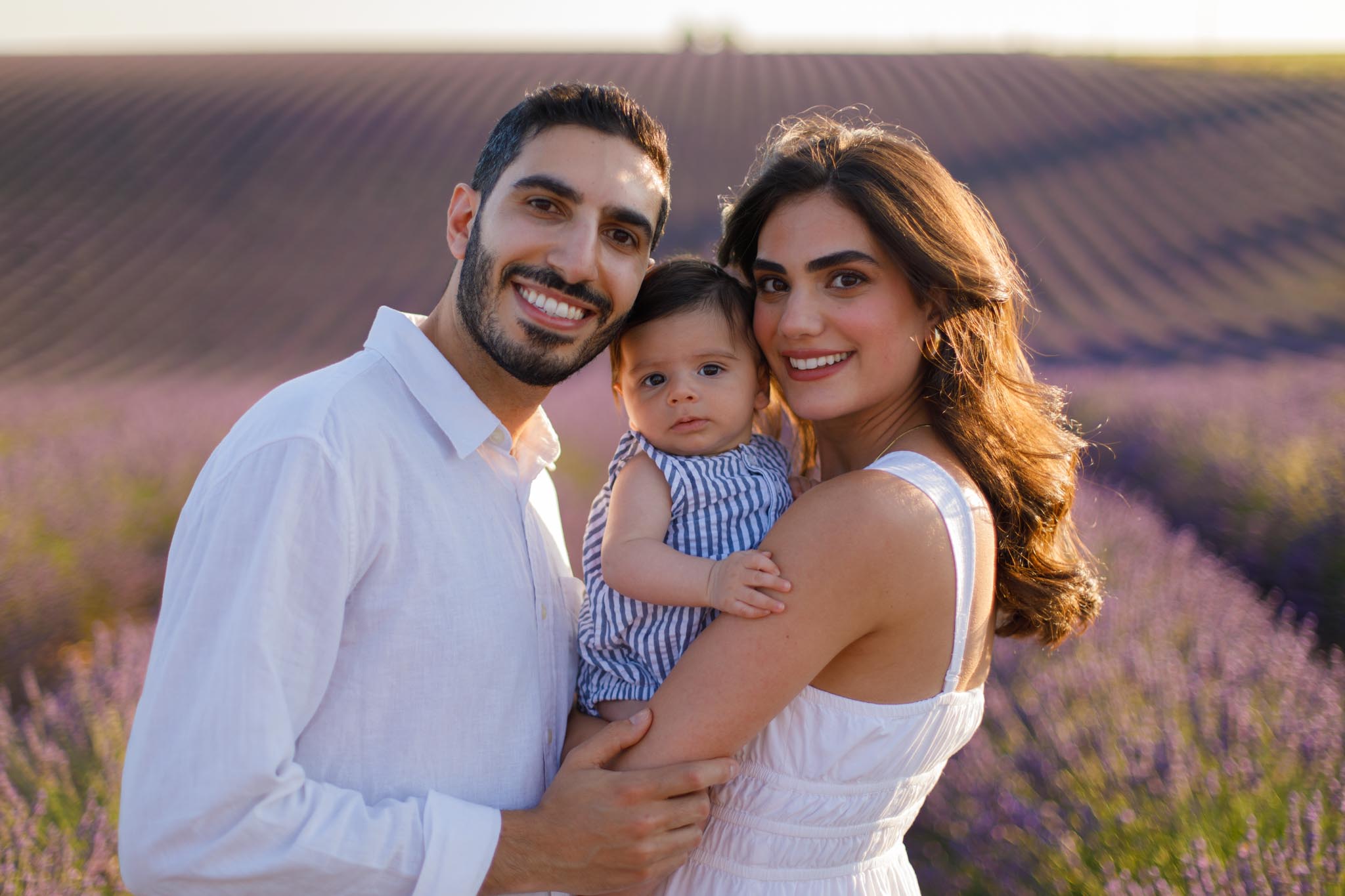 The second part of the session took place a few days later on 8 July 2024 from 19:45 to 20:15, surrounded by the lavender fields of Provence. This timing was chosen carefully to keep the light airy and bright rather than sunset-dramatic, perfect for soft family imagery with a newborn.