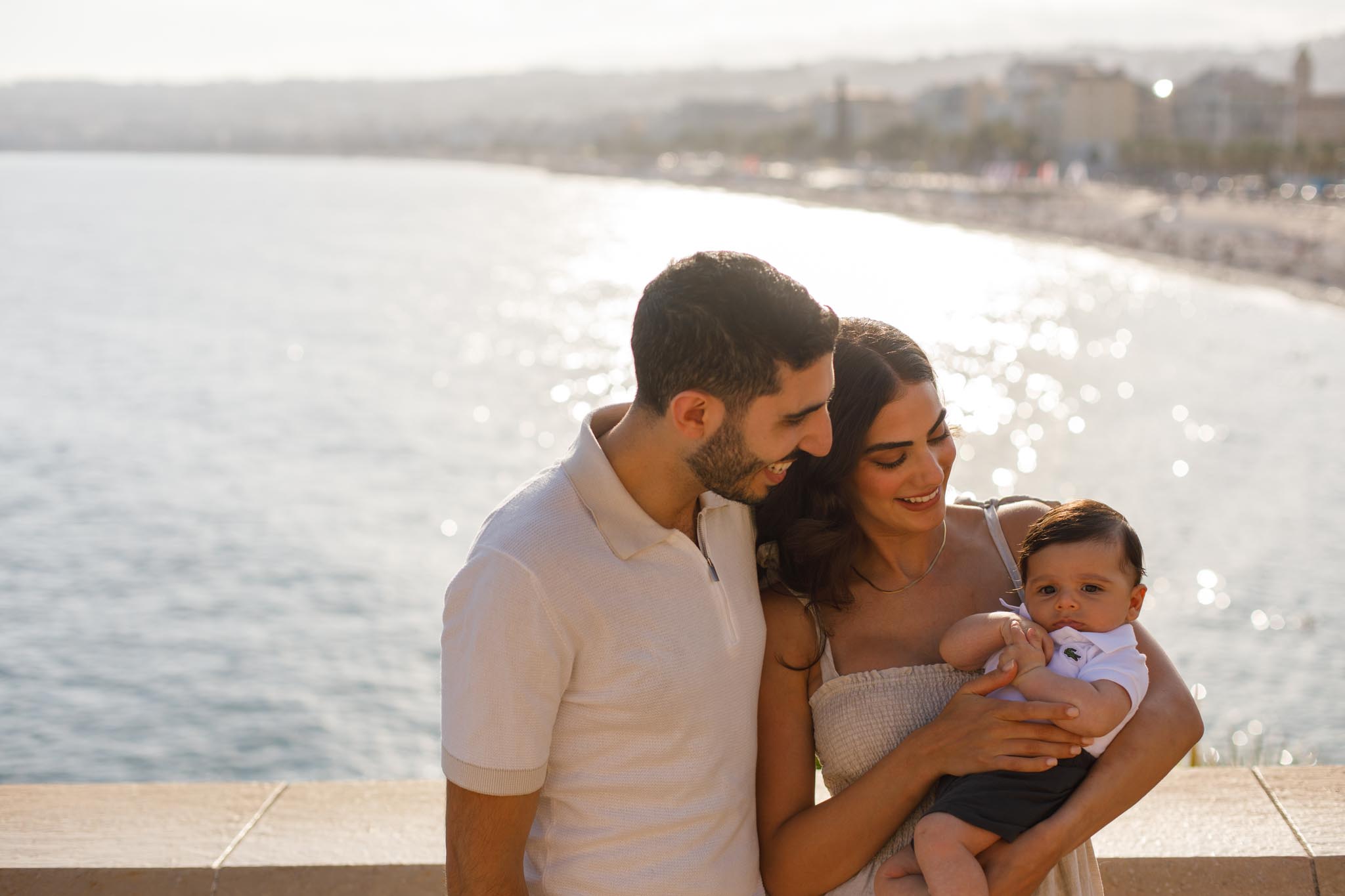 After a few quiet moments and portraits together, we slowly walked toward Port Pympia, where the light softened slightly while still remaining warm and clear. The focus throughout was on natural interaction between the parents and their baby, capturing tender, authentic moments.