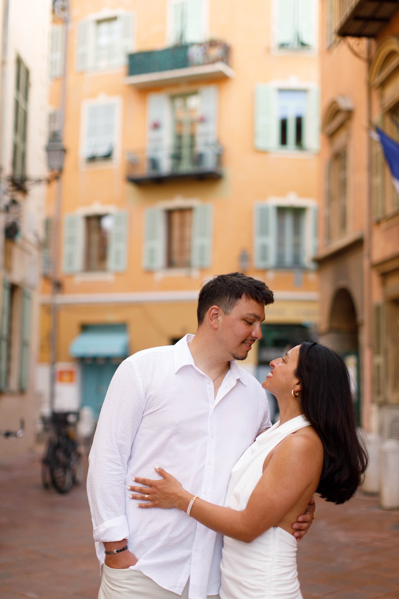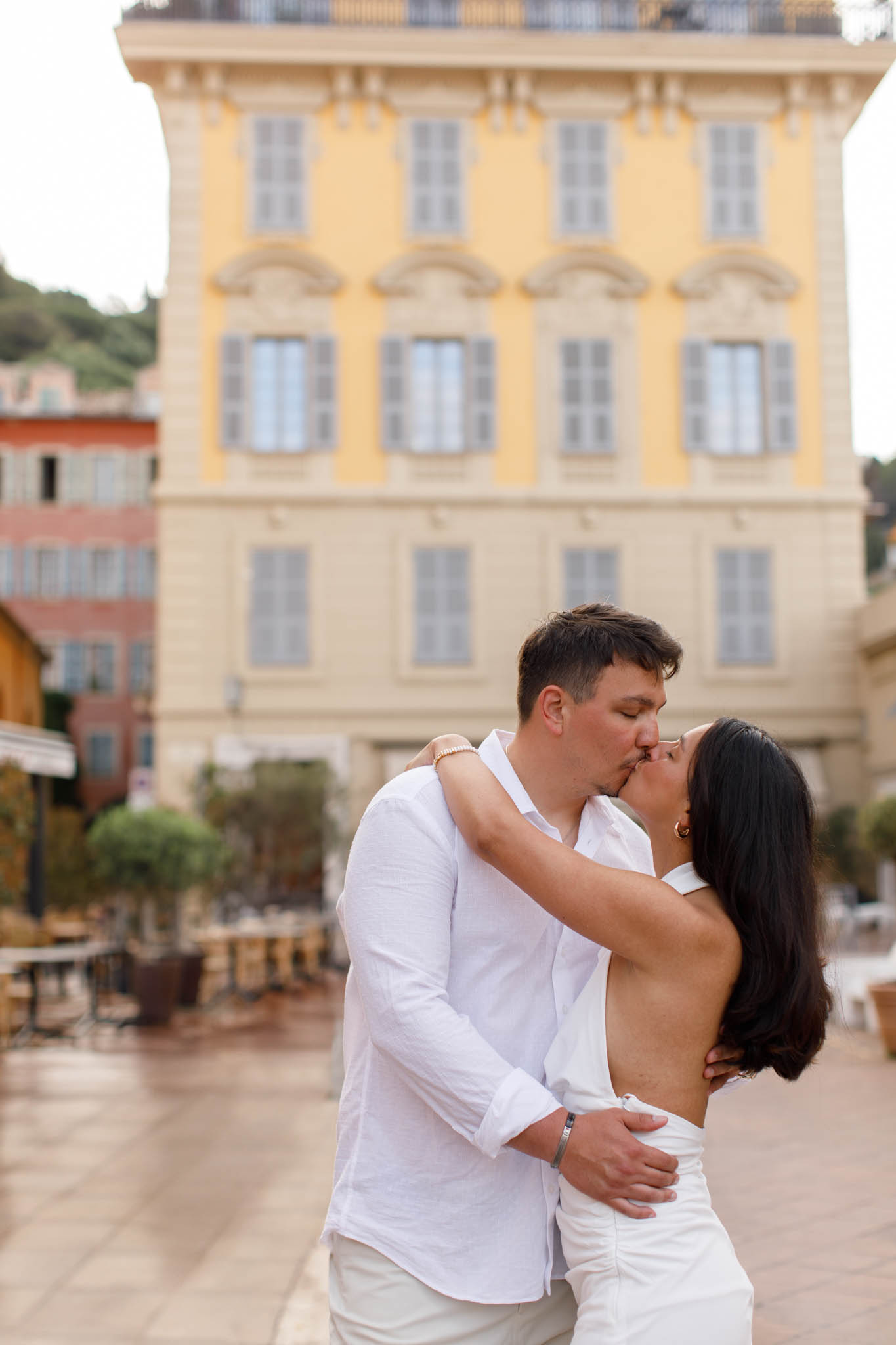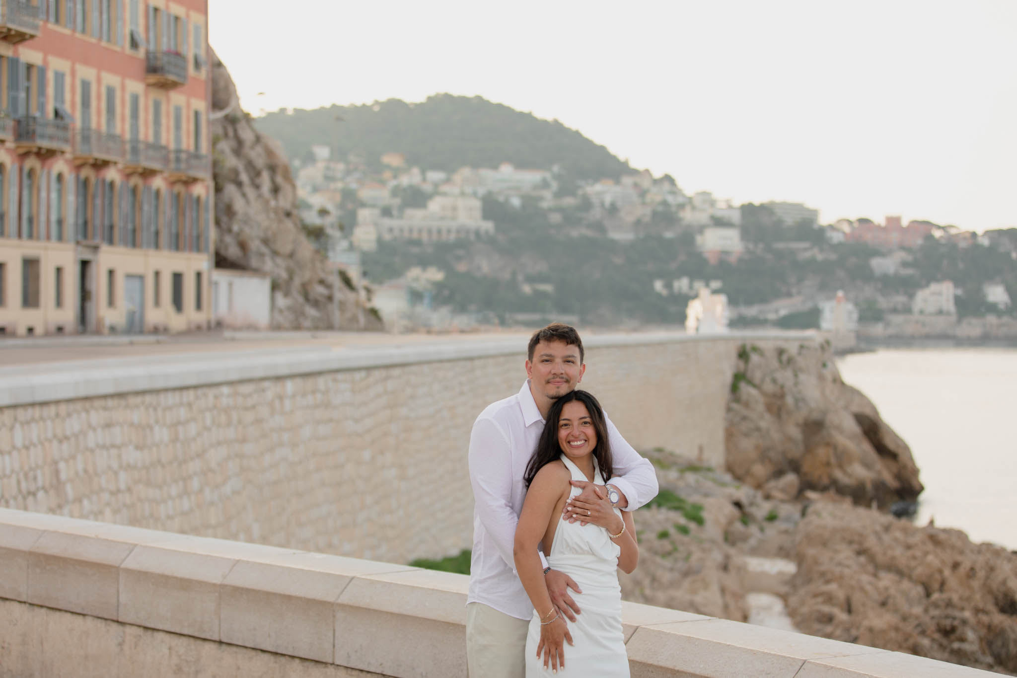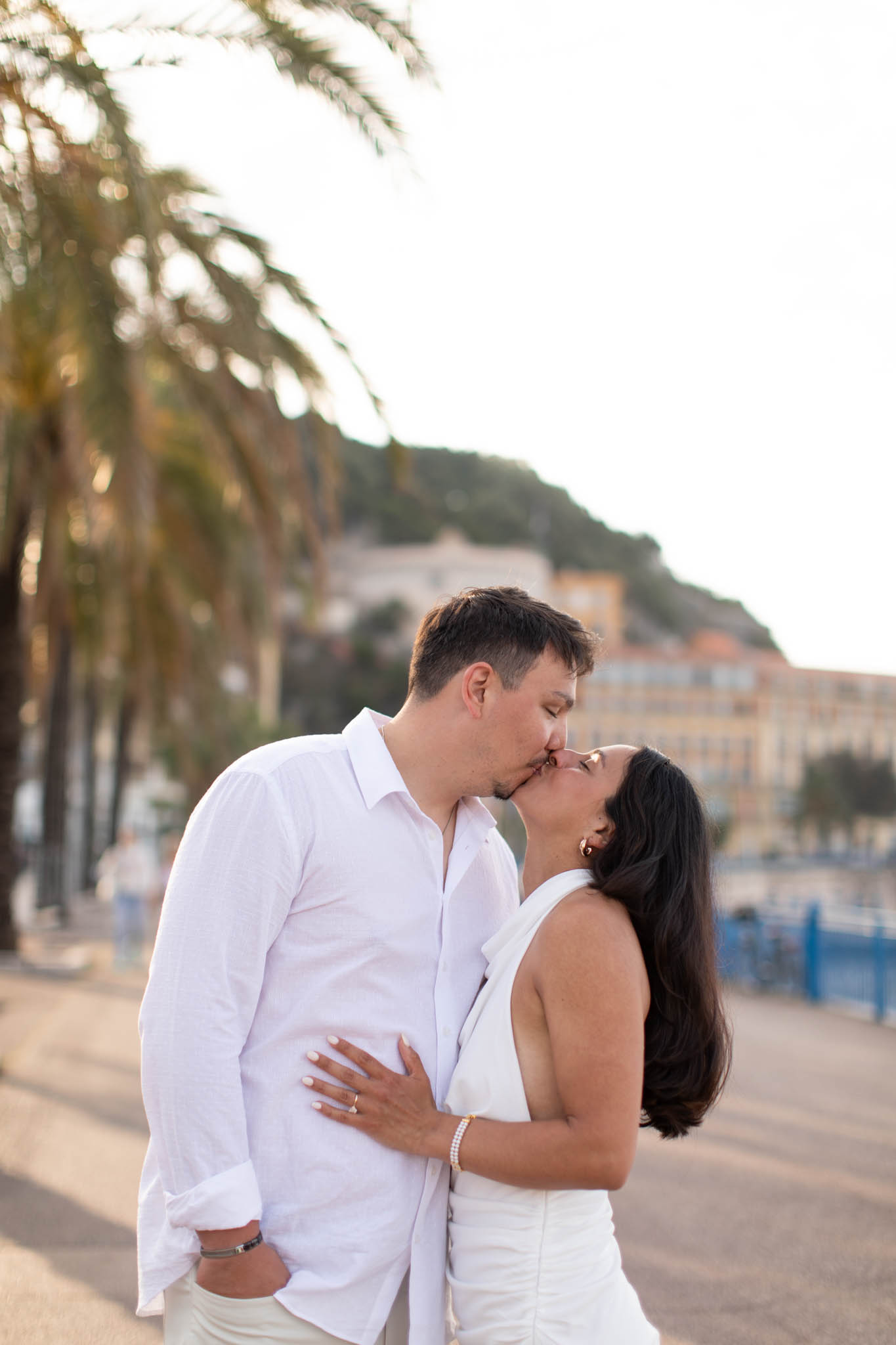 K and M had just got engaged a few days earlier in the Italian Riviera. They wanted to keep the proposal private, which meant there were no photographs of the moment itself. Now, in Nice, they came to capture their newly engaged joy in a relaxed, romantic photo session. This wasn't about recreating the proposal, but about taking time to celebrate their engagement and have beautiful memories together.