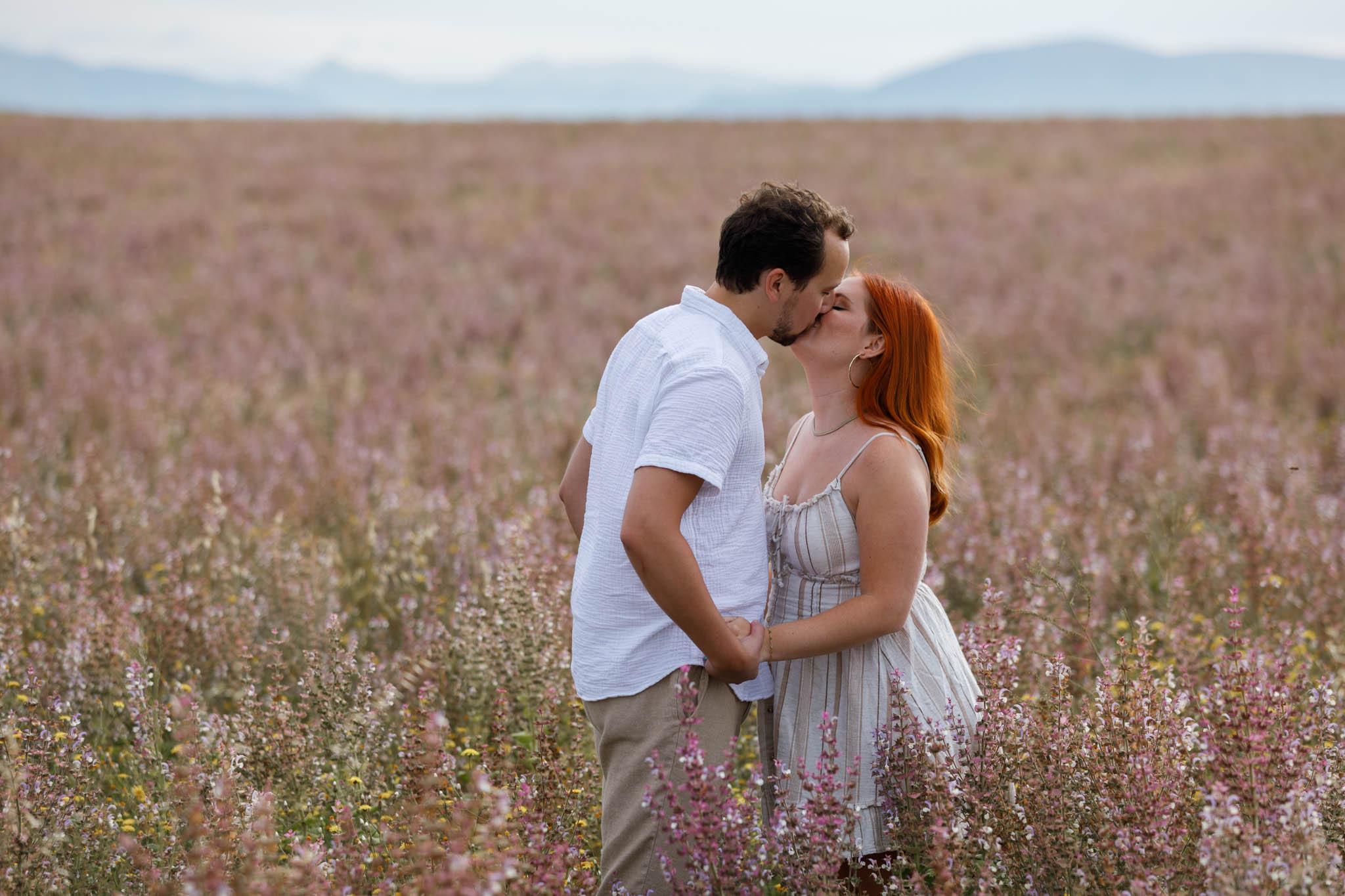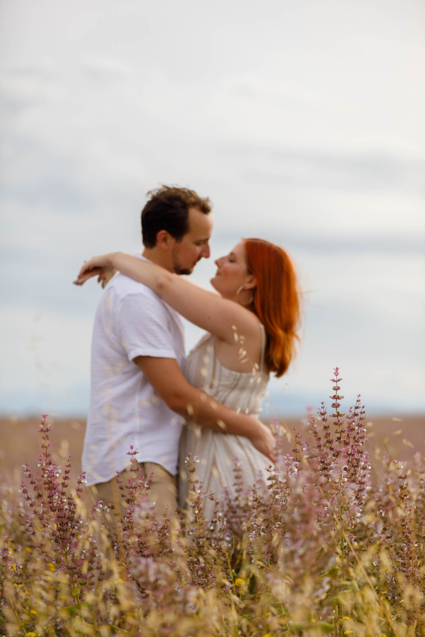 The sage field offers a completely different look. The tones are softer, with subtle pink and muted hues that contrast nicely with the purple lavender. Visually, it is very pretty and delicate, even though the scent of sage is not quite as lovely as lavender. The change in texture and colour added variety to the session and gave H and B a different style of images within the same shoot.