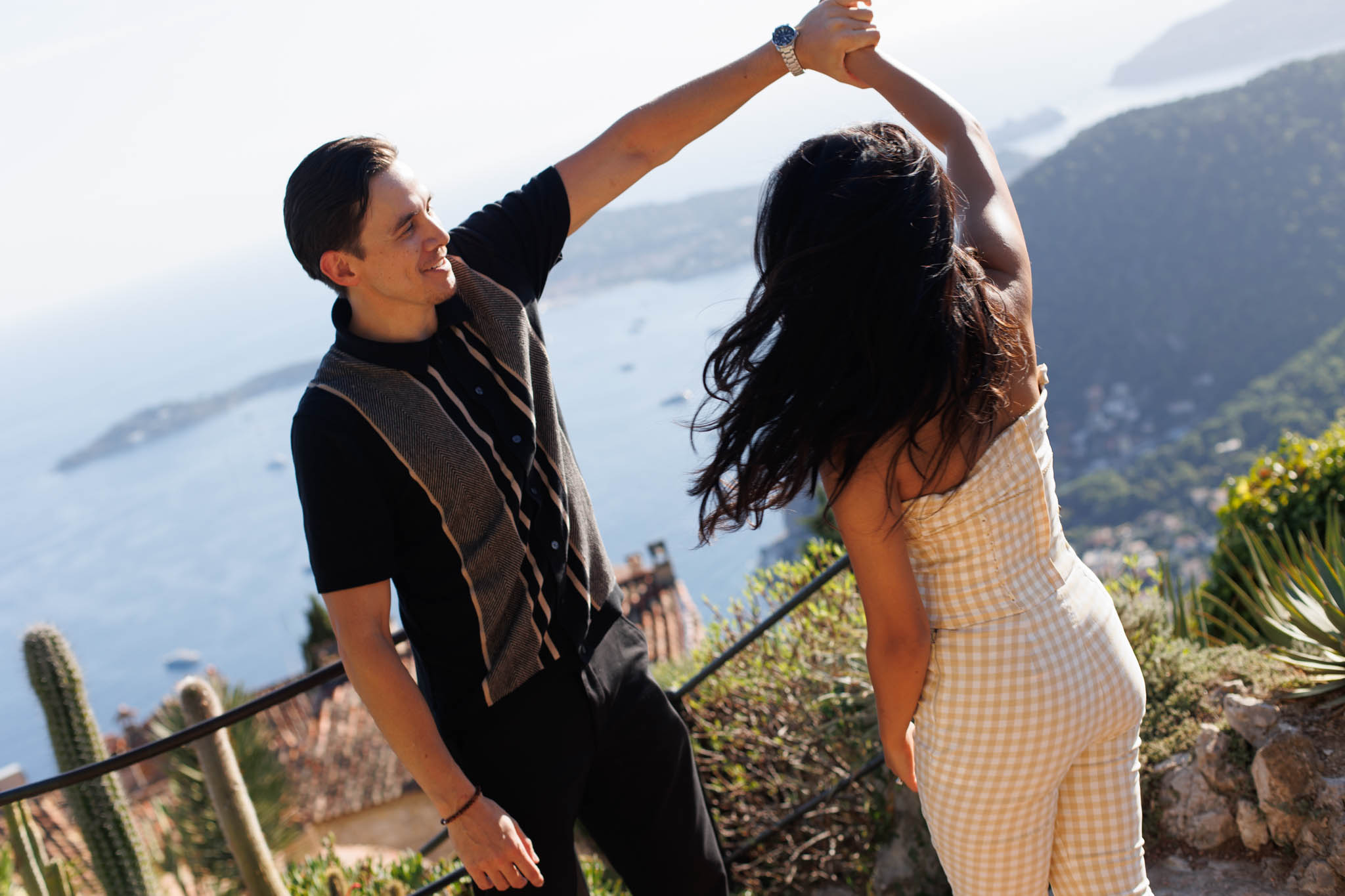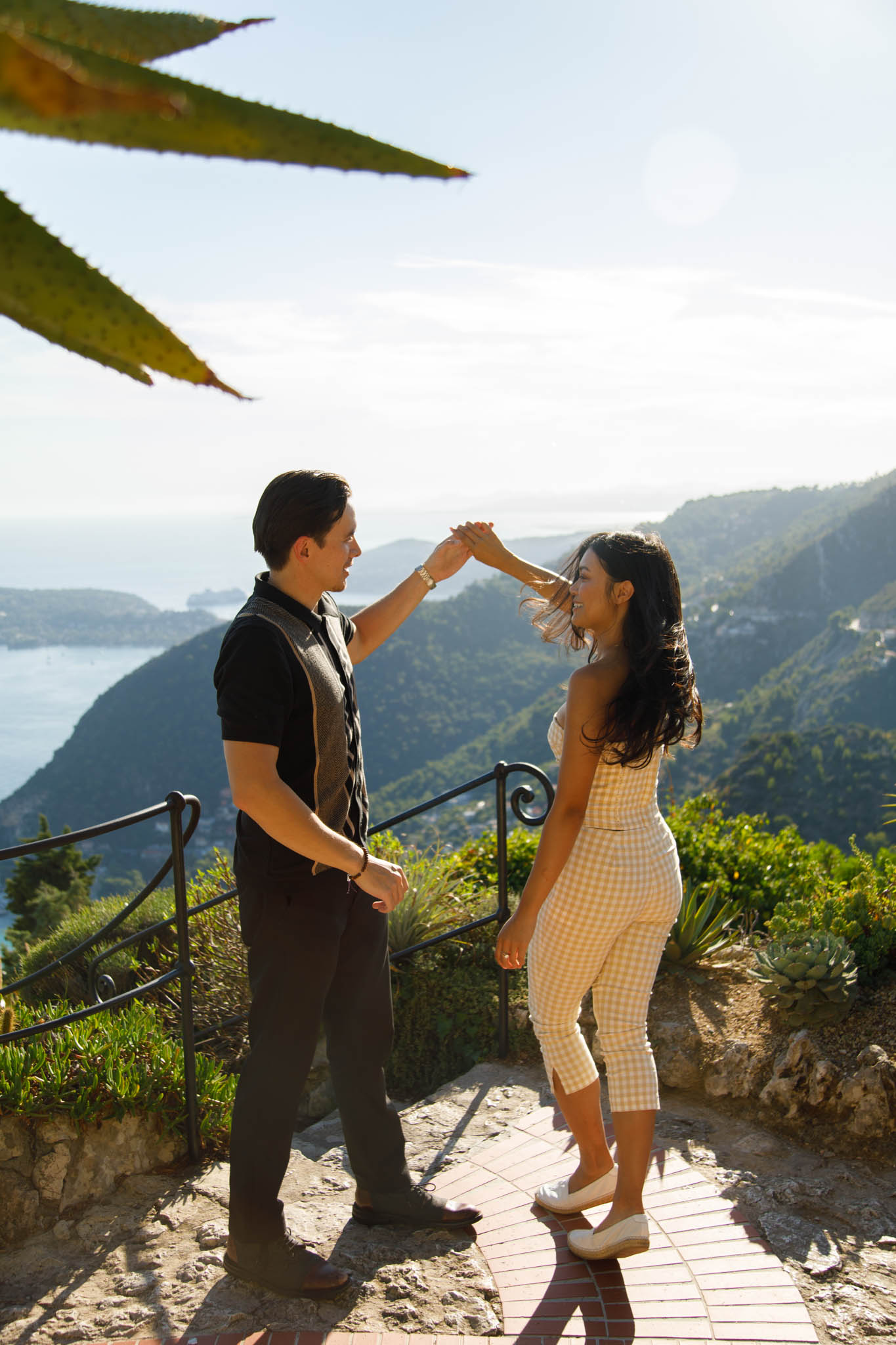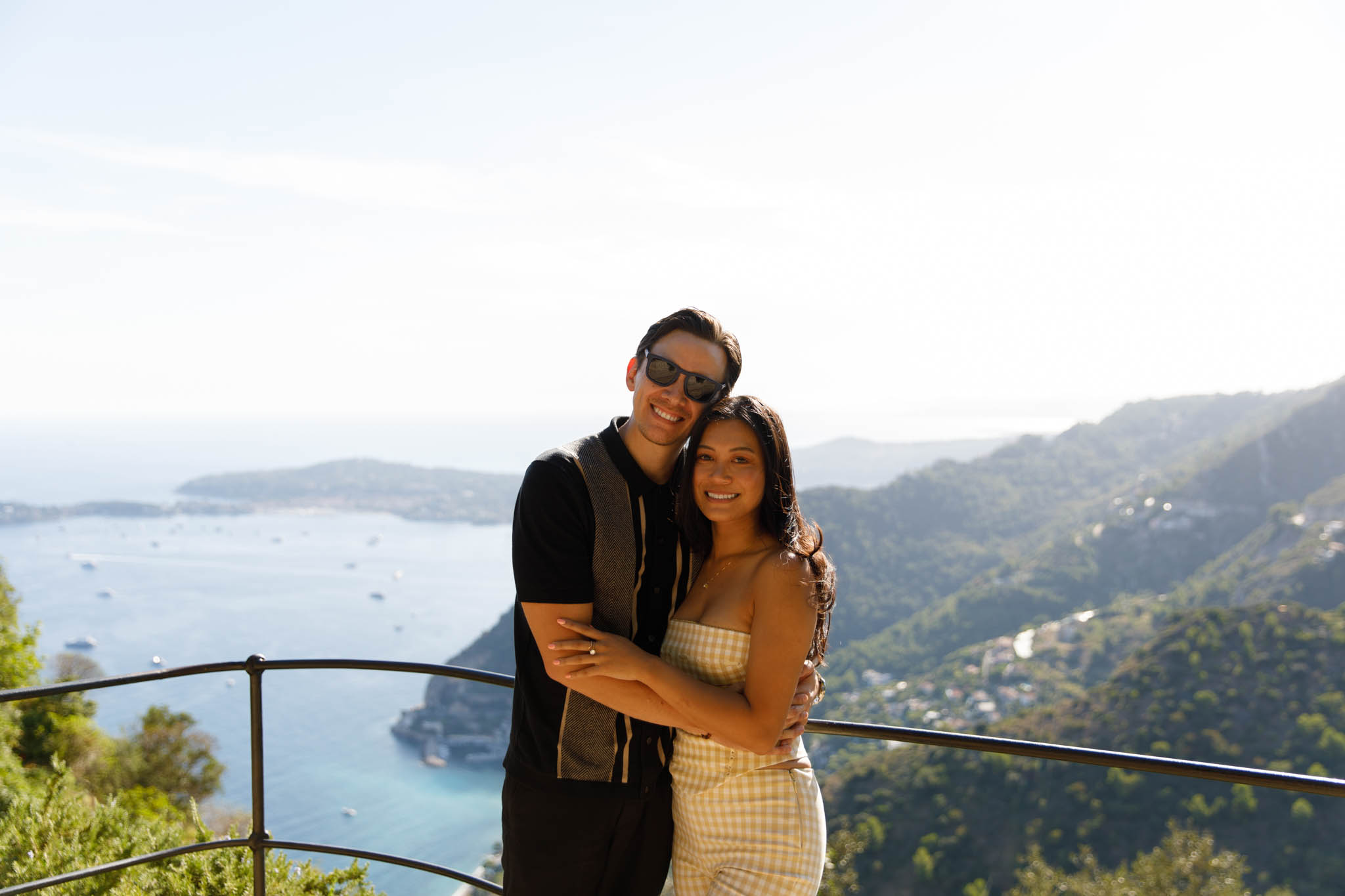 On this special day, T planned a heartfelt proposal to M at the Jardin Exotique in Èze. Because they were travelling with a friend, T had to coordinate a timing that kept the moment a complete surprise. He incorporated a personal touch by having M’s favourite artists appear in a video message, which she saw just before the proposal—creating a beautifully emotional and unique start to the moment.