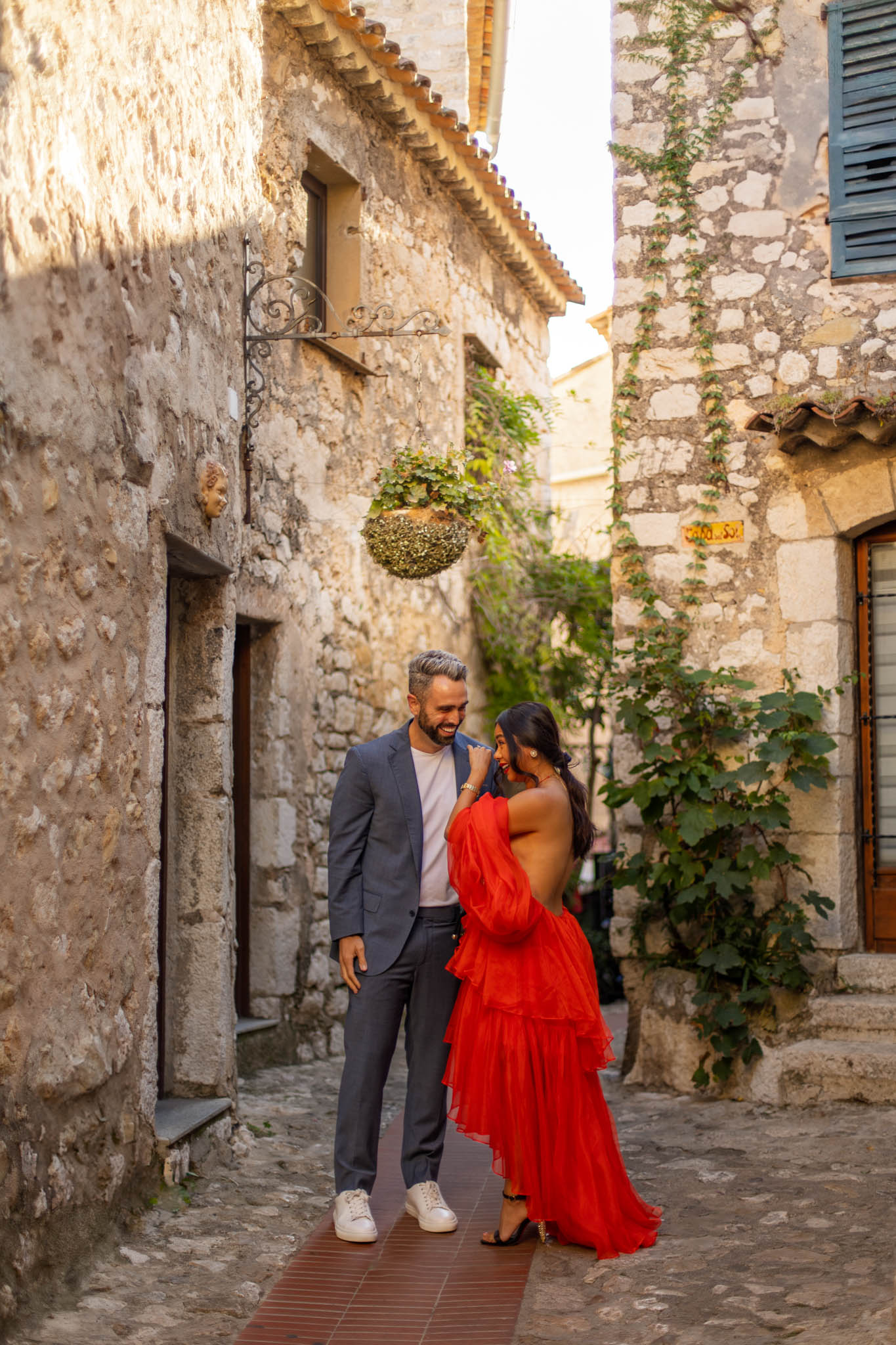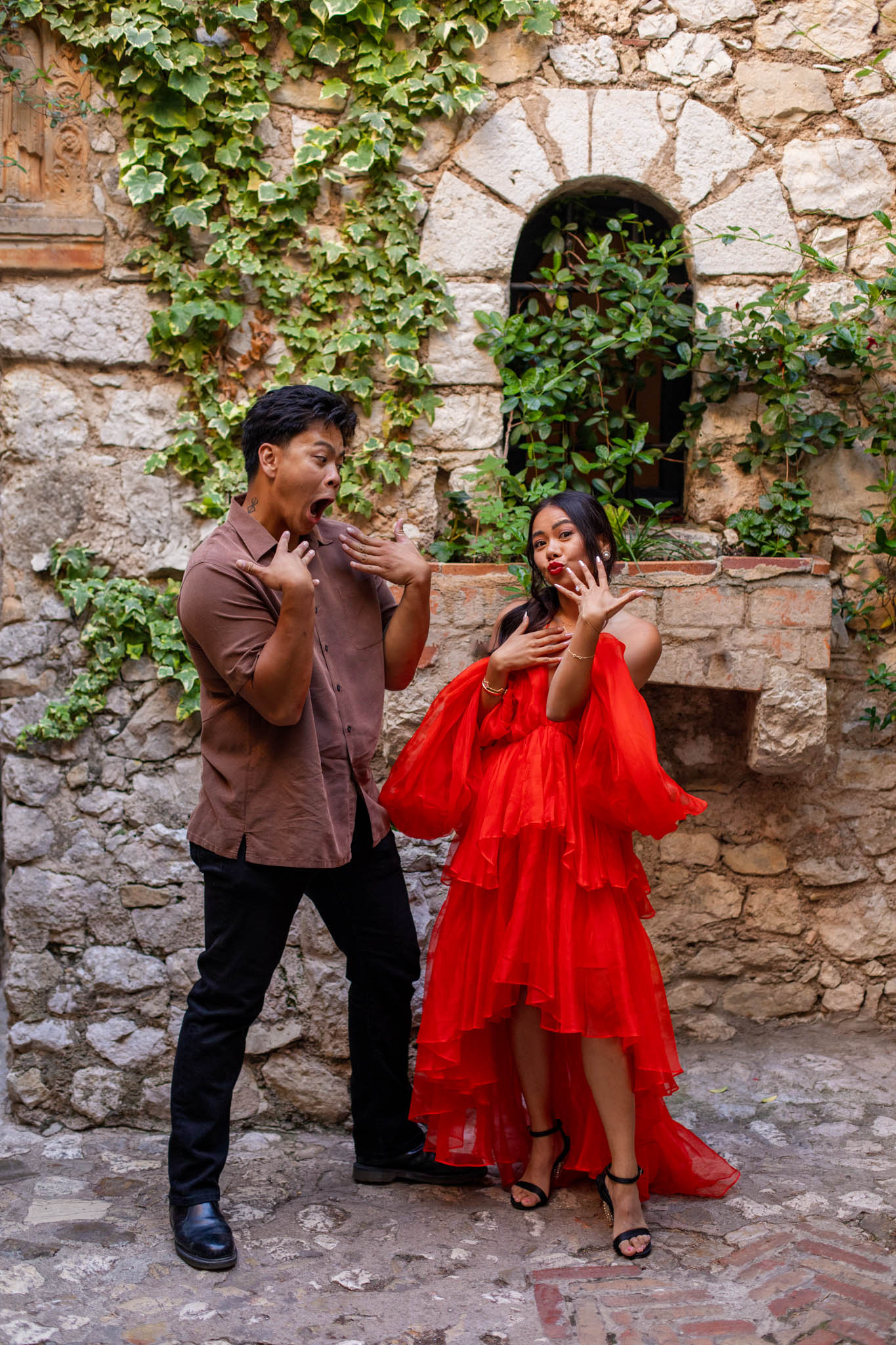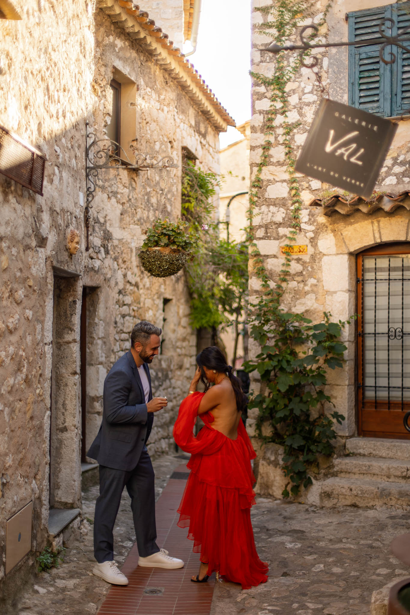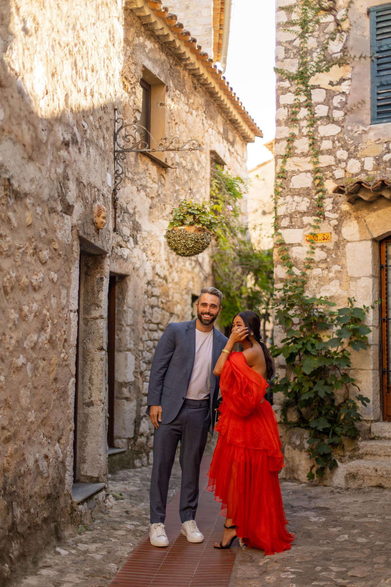 C had thoughtfully planned to propose to K, knowing that she would much prefer the charm of narrow alleyways and quiet stone streets over a formal garden setting. Instead of dramatic viewpoints or grand terraces, he chose one of Èze’s intimate passageways— a location full of character and soft Mediterranean light. In a funny twist of fate, K and C were staying at Château Eza, and it turned out their room was located just beside the very street we had selected. None of us had expected that coincidence. He proposed while pretending to walk back to their room. The proposal itself was incredibly sweet. As C got down on one knee, the quiet stone street felt suspended in time.