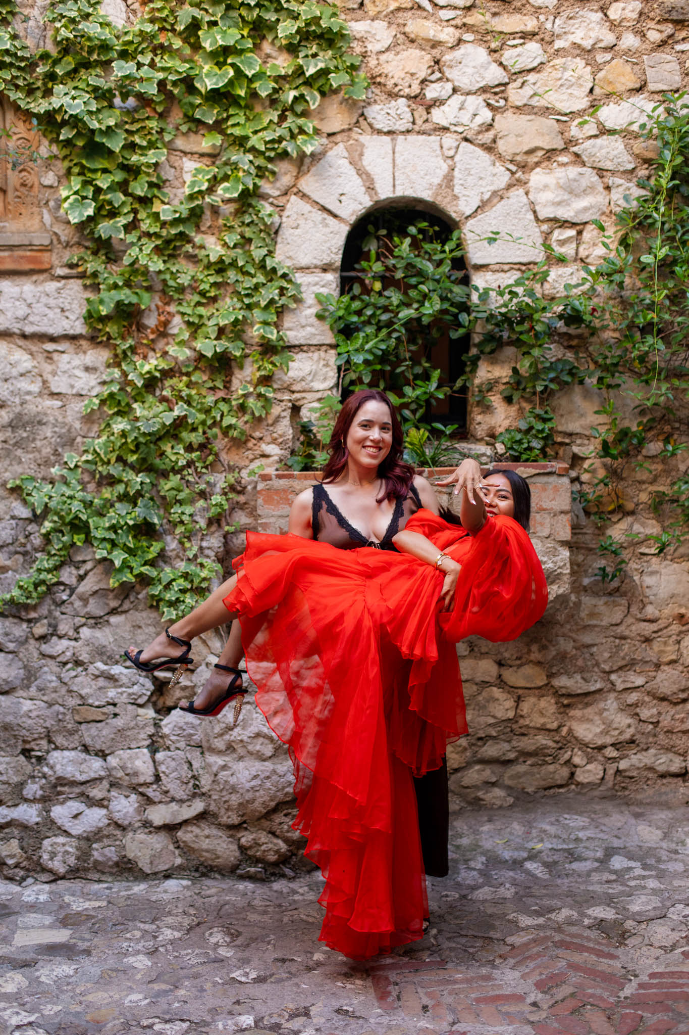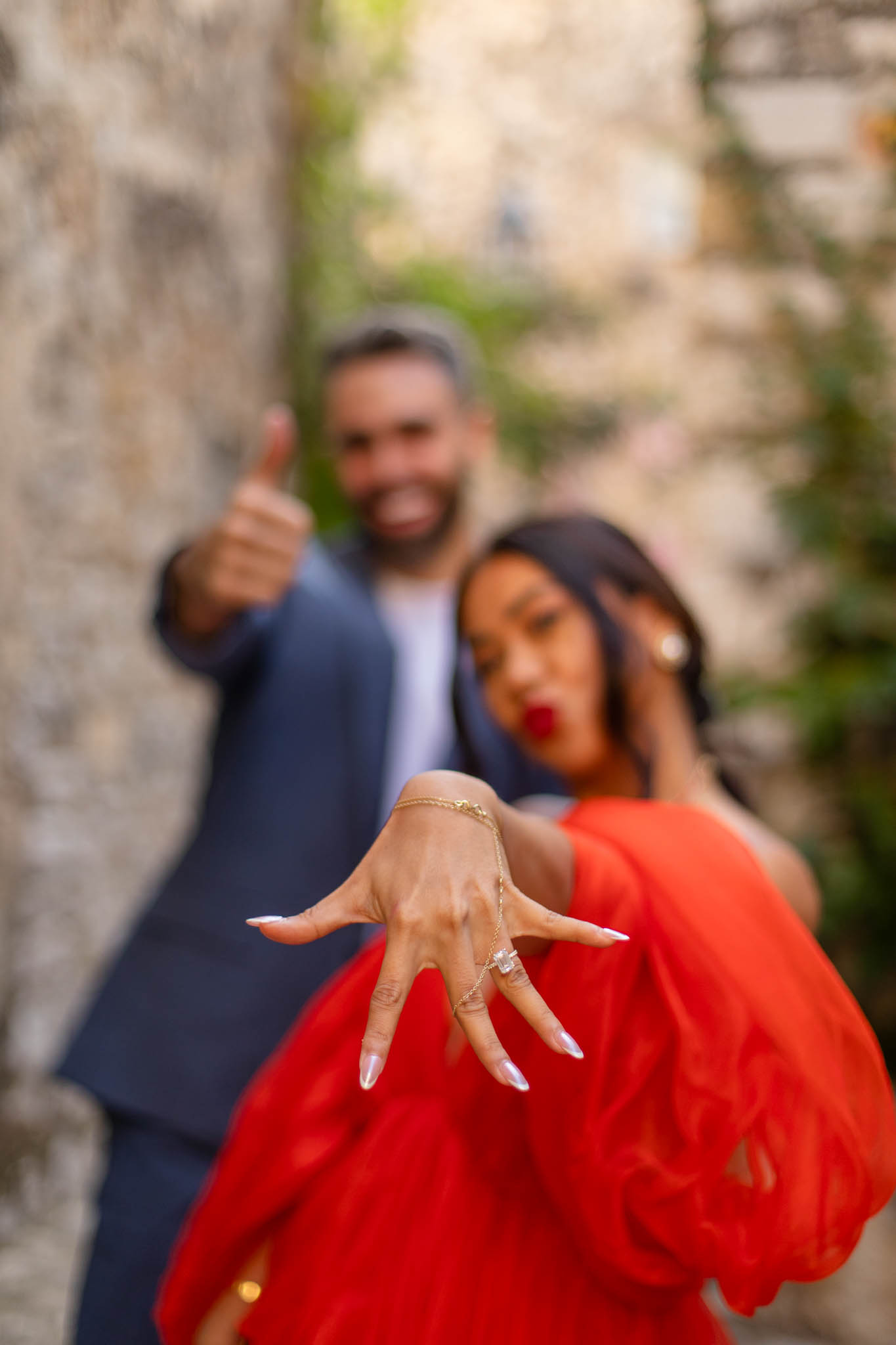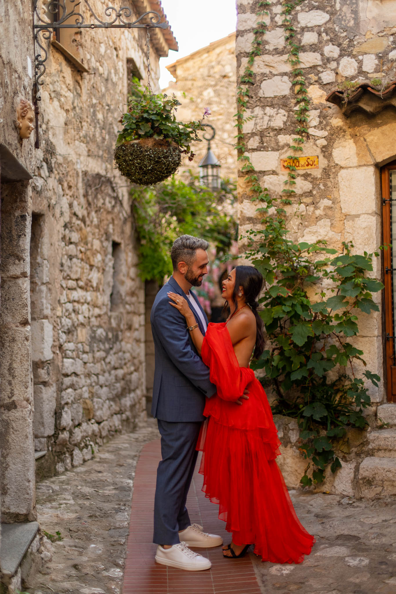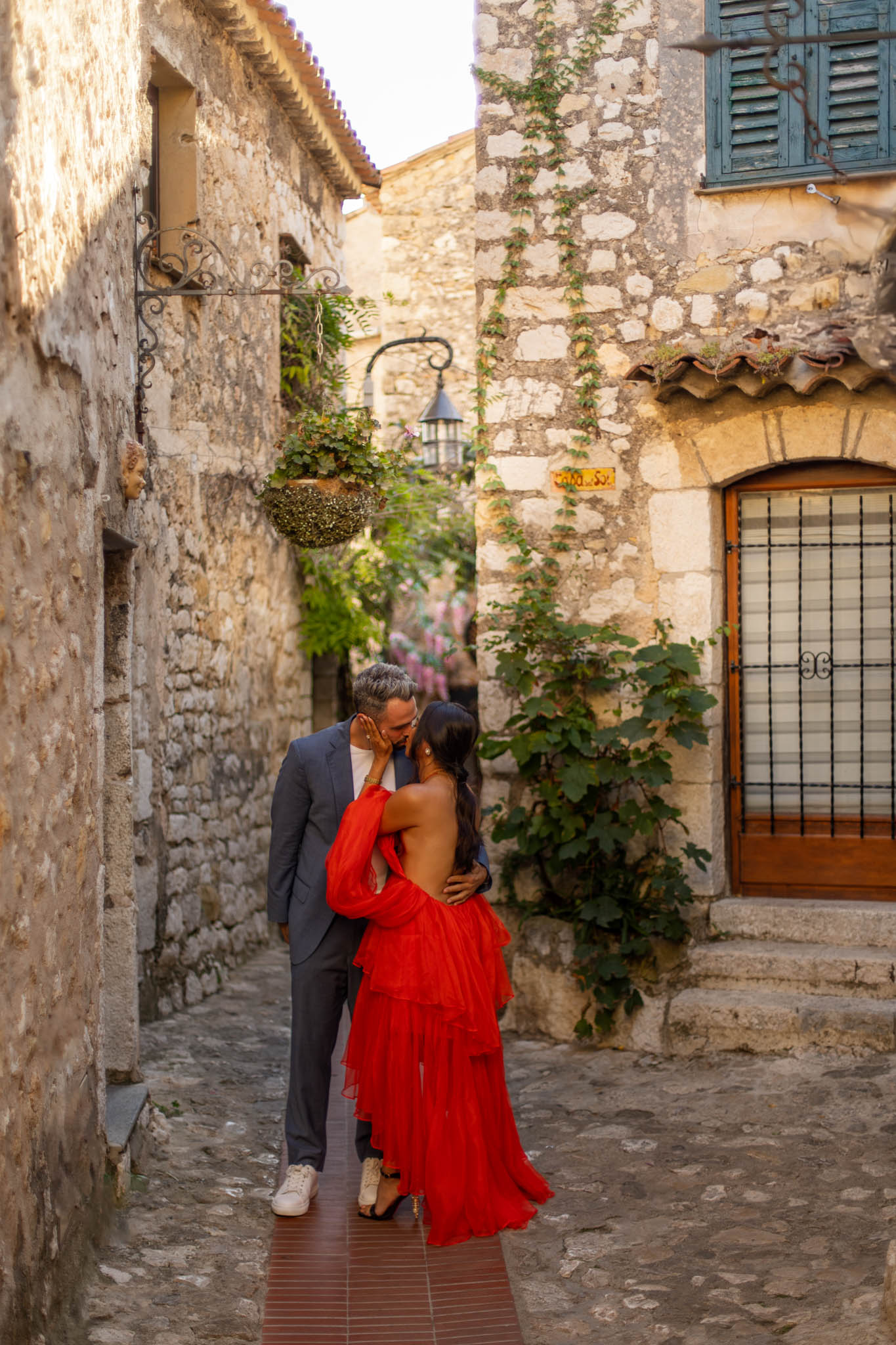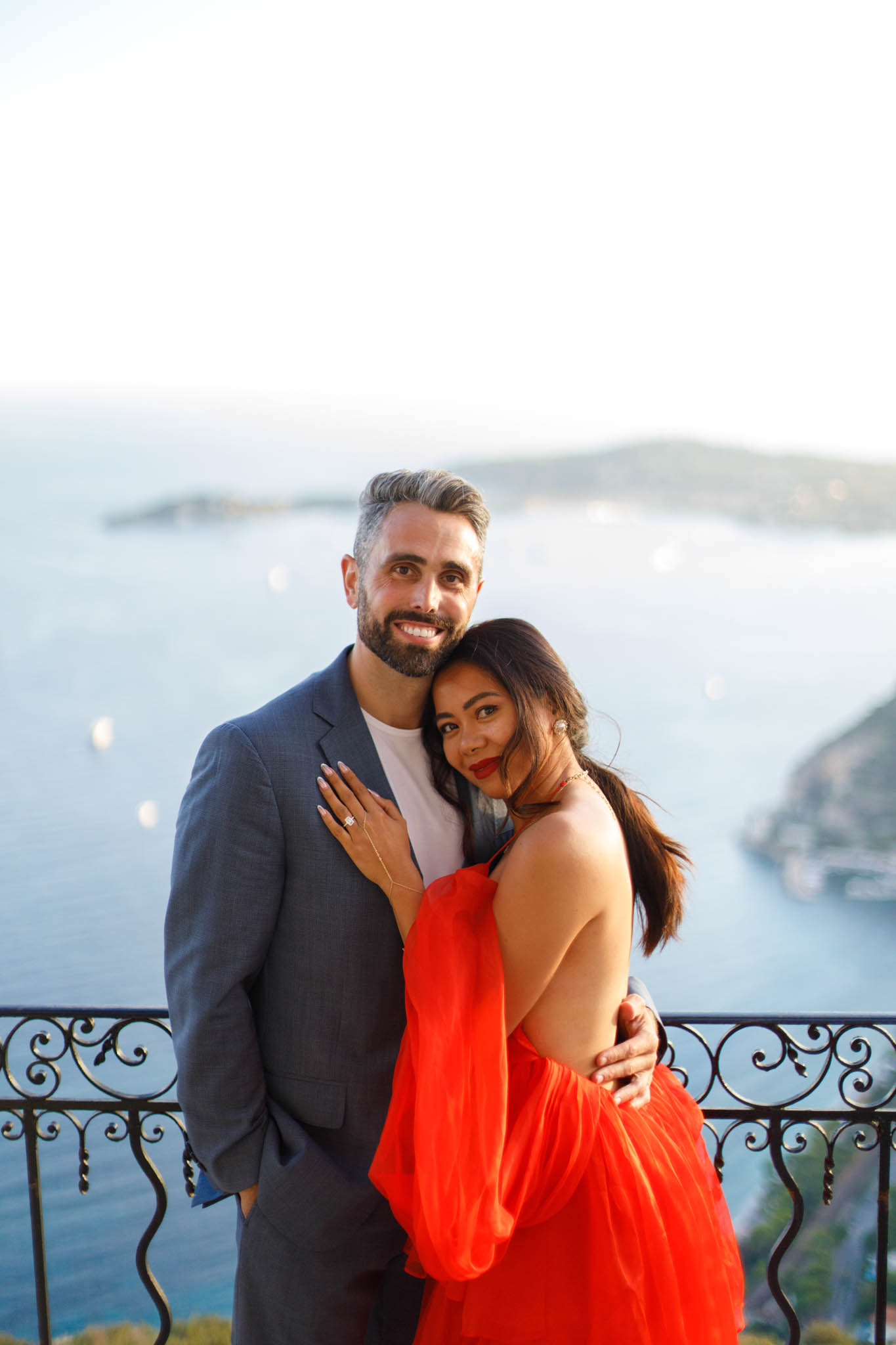 C had thoughtfully planned to propose to K, knowing that she would much prefer the charm of narrow alleyways and quiet stone streets over a formal garden setting. Instead of dramatic viewpoints or grand terraces, he chose one of Èze’s intimate passageways— a location full of character and soft Mediterranean light. In a funny twist of fate, K and C were staying at Château Eza, and it turned out their room was located just beside the very street we had selected. None of us had expected that coincidence. He proposed while pretending to walk back to their room. The proposal itself was incredibly sweet. As C got down on one knee, the quiet stone street felt suspended in time.
