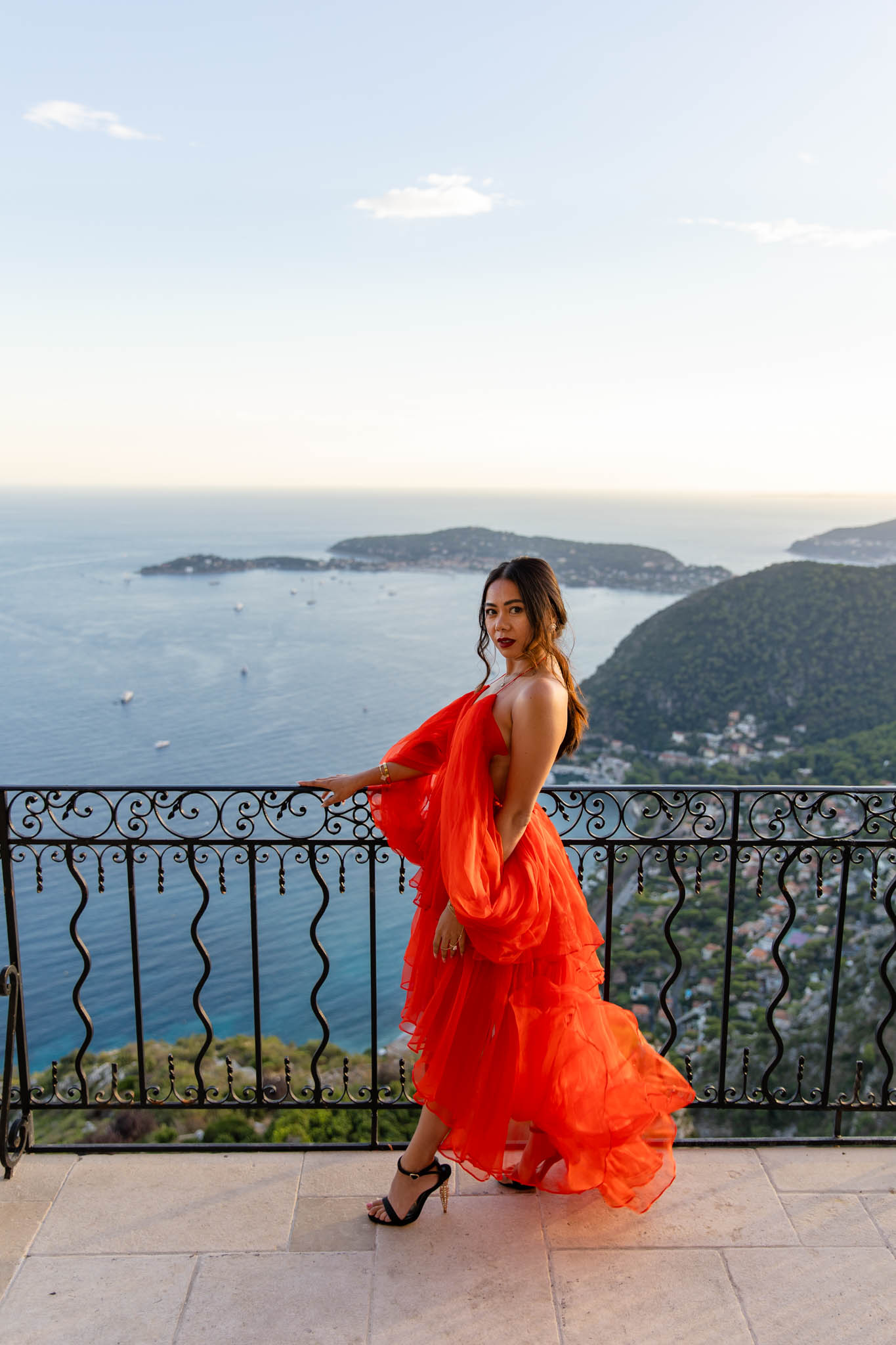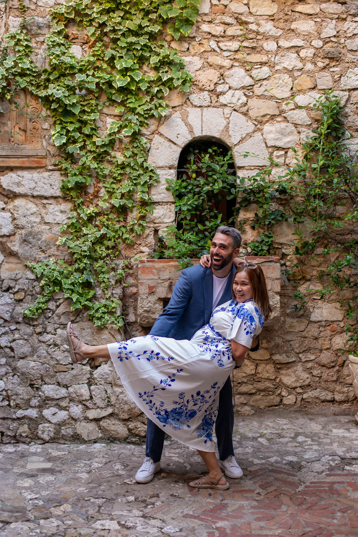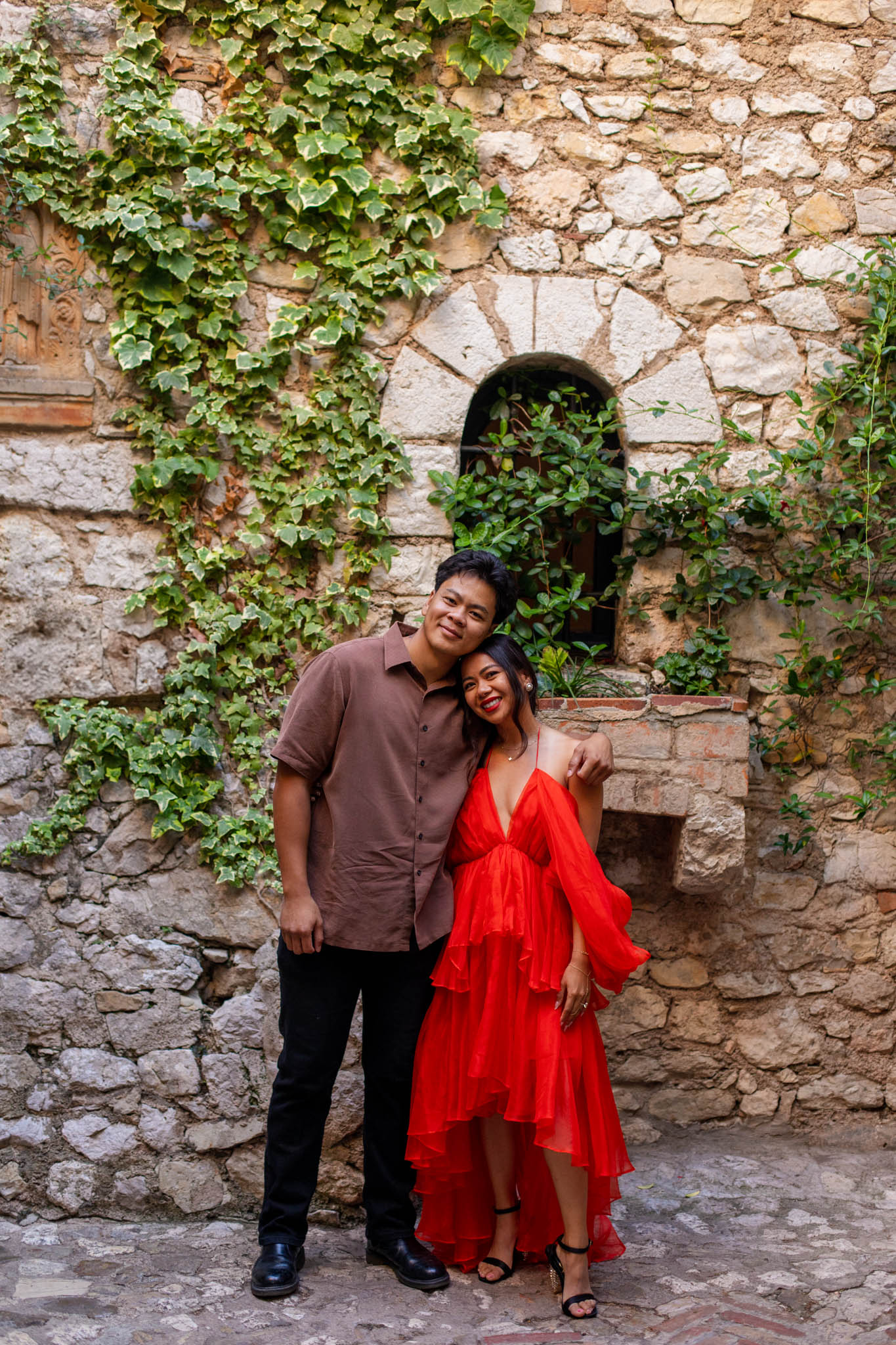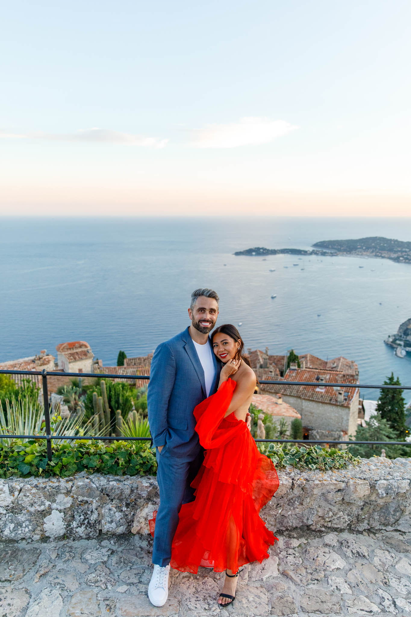 After spending time in the alleyways, we made our way back toward the hotel area for portraits overlooking the Mediterranean. In Èze village, unobstructed sea views are limited to a few select locations, including Château Eza, La Chèvre d’Or, and the renowned garden. K and C wanted photographs that included the sea, so we incorporated these iconic vantage points into the second part of the session.