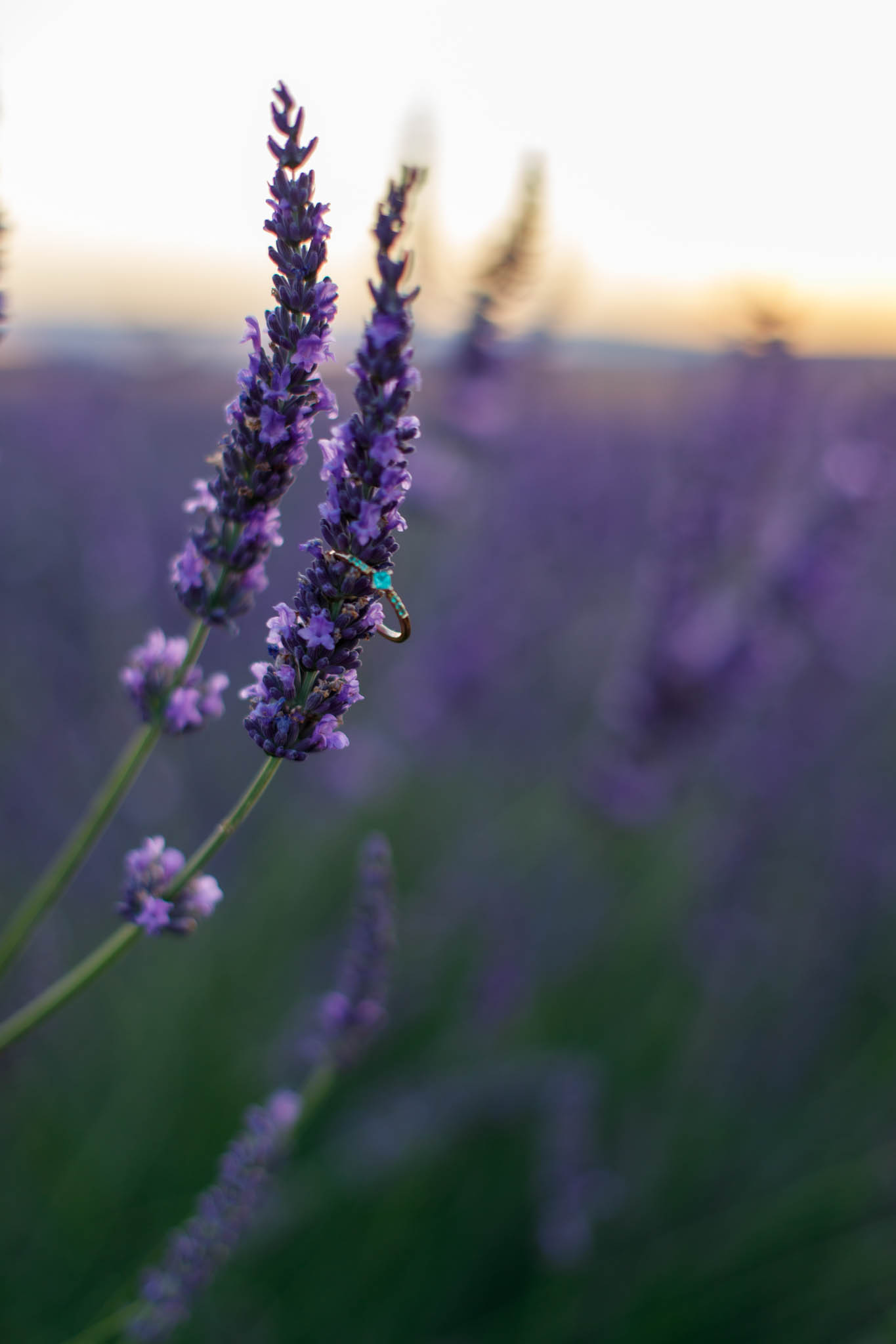 We captured a mixture of candid celebration shots and more composed portraits among the lavender rows. The ring deserved its own moment as well. It was a stunning green stone, striking and unique, glowing beautifully in the soft sunset light. We photographed close-ups of the ring against the lavender, which complemented the colour perfectly.