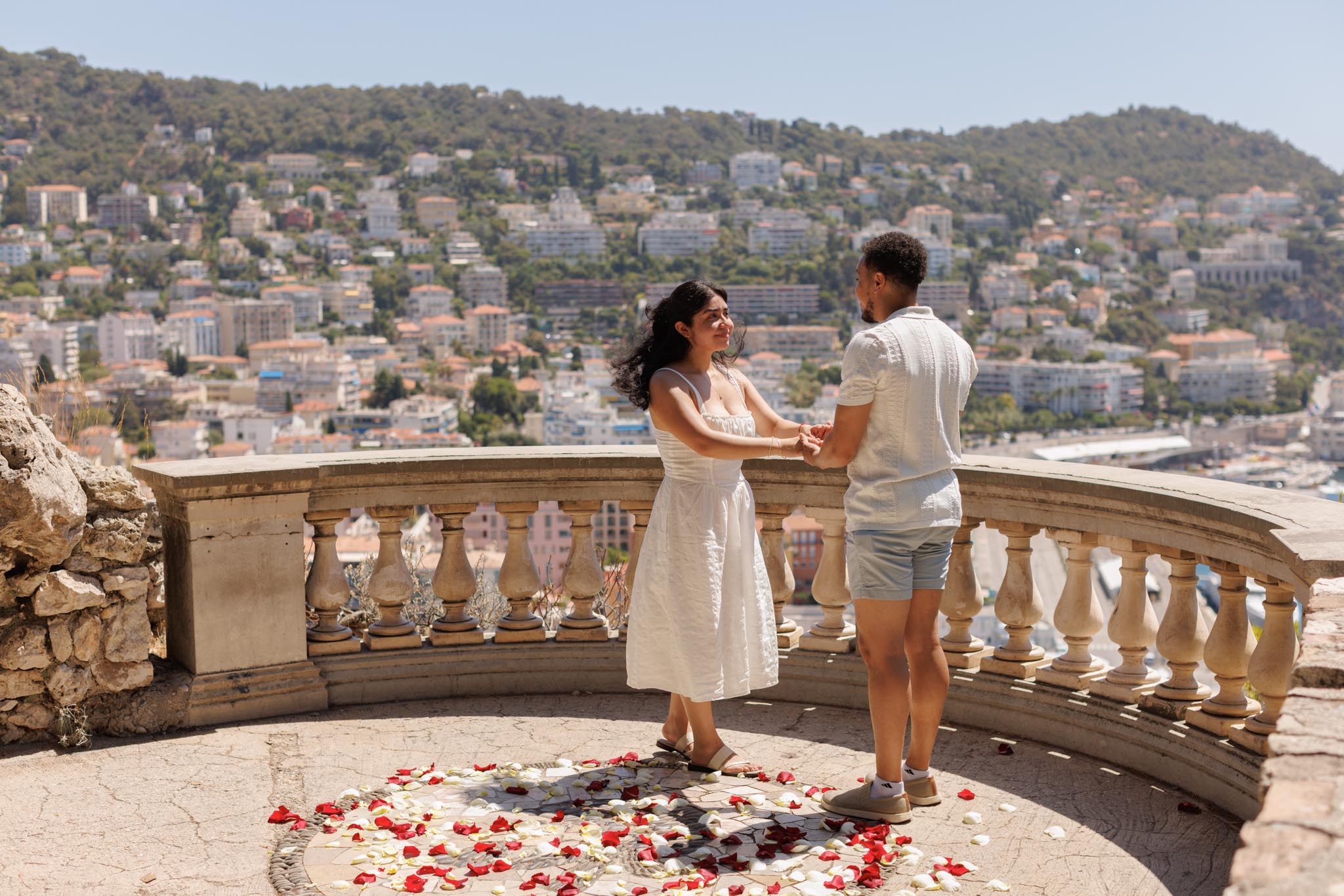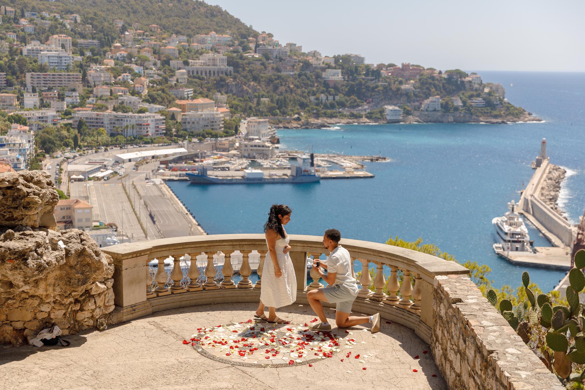 S reached out to plan a very simple and intimate proposal in Nice, choosing a quick session focused purely on capturing the moment itself. We selected a viewpoint at Colline du Château overlooking Port Lympia, one of the most striking coastal views in the city.