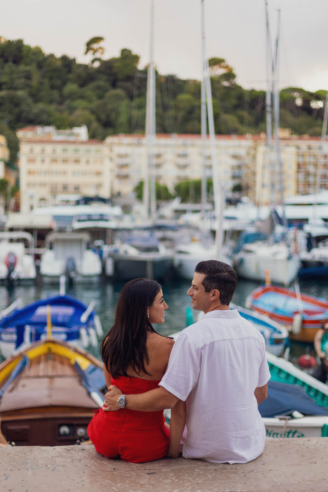 Most of the session took place at Port Lympia, the harbour area K especially loved. Her red dress paired beautifully with the colours of the port, adding a vibrant contrast against the boats, pastel buildings, and glowing evening light. Although we do not photograph here often, the location proved to be a perfect choice, particularly with the soft sunset that appeared that evening.