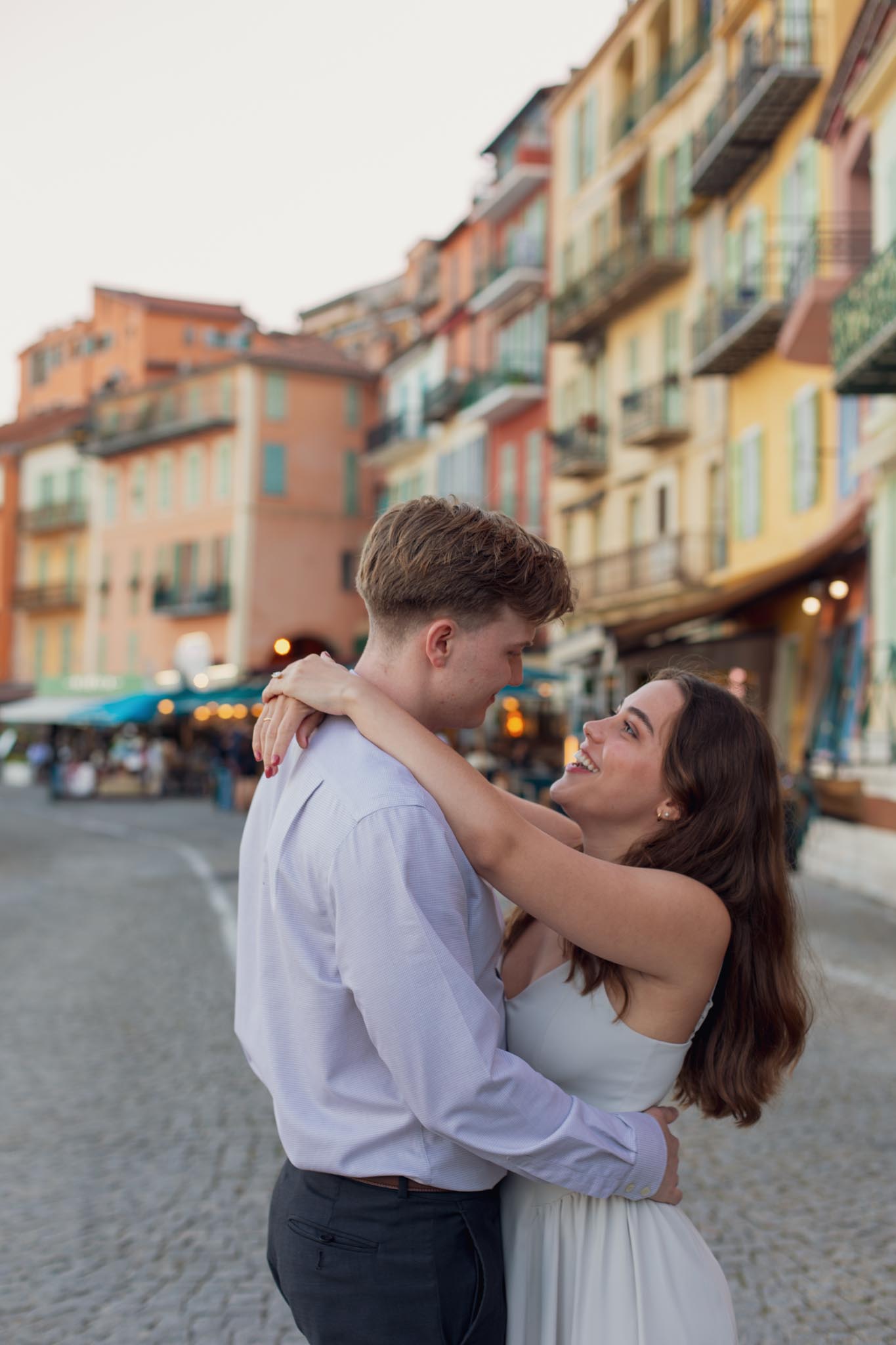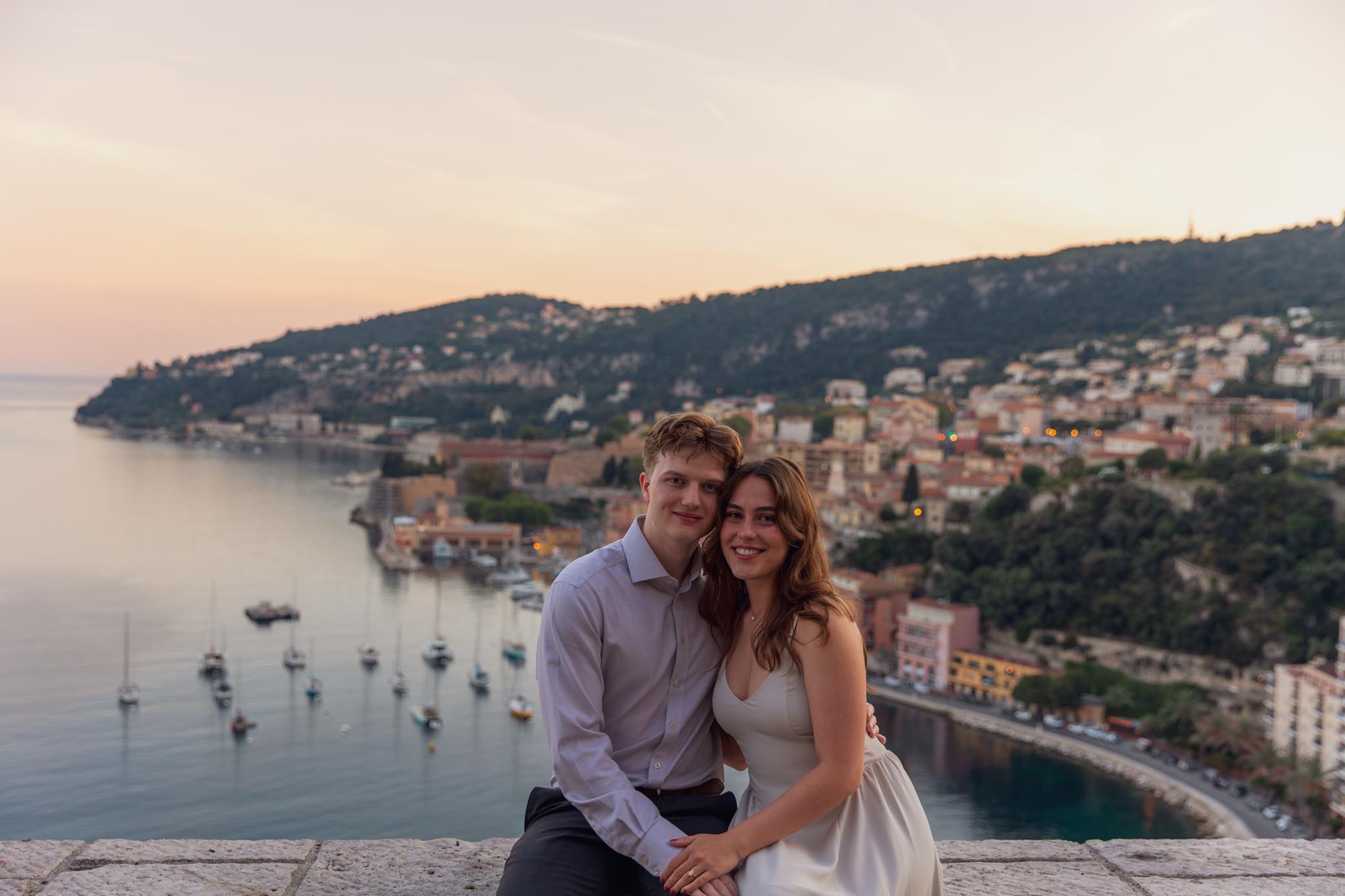 Although sunset occurs later in May, Villefranche-sur-Mer sits within a bay where the sun disappears behind the mountains much earlier. By the time the session began, there was no direct sunlight, creating gentle, even evening light throughout the town. This was exactly the atmosphere R and A were hoping for, especially for the panoramic viewpoint later in the shoot.