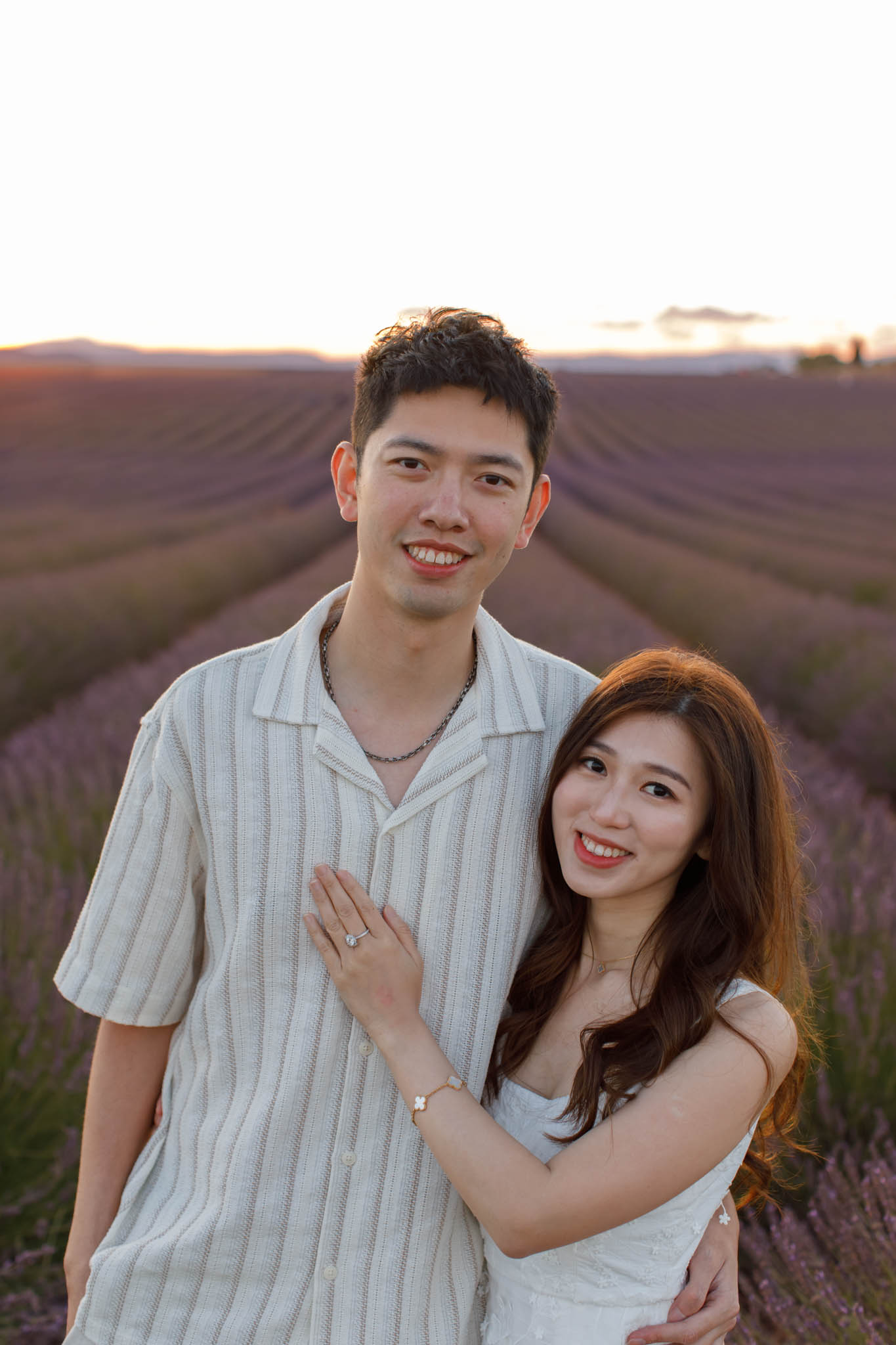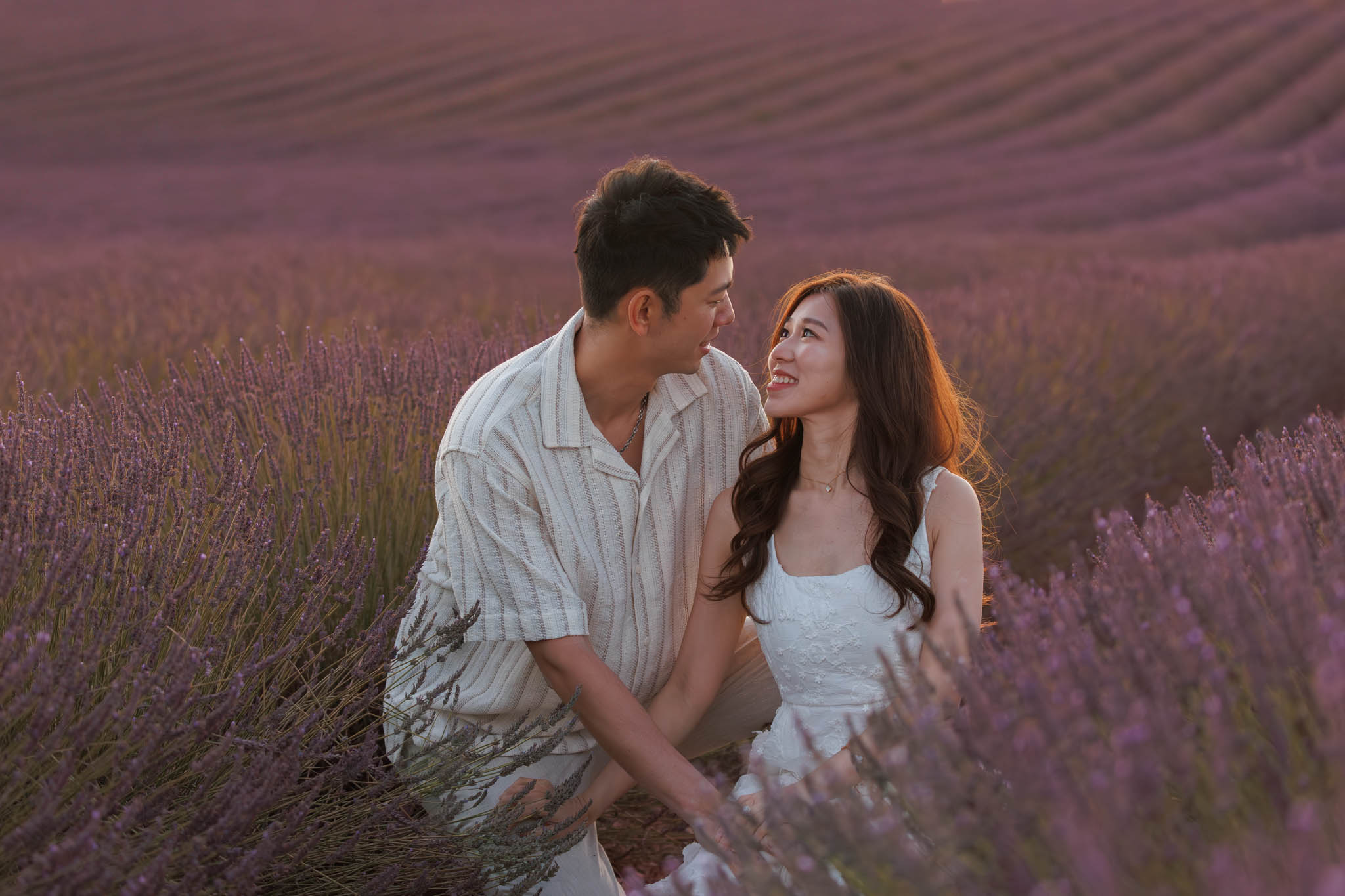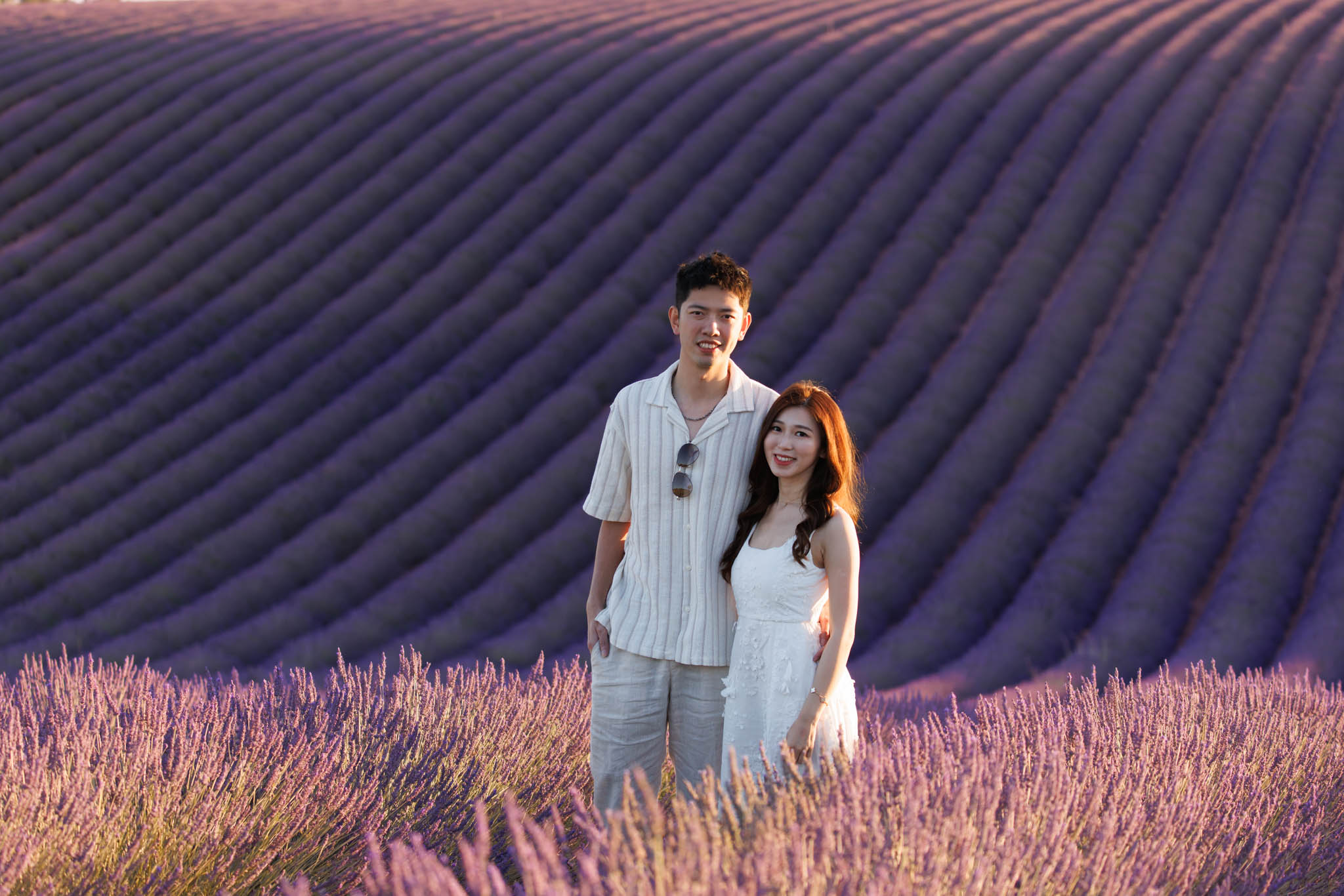 In early July, J and K joined us for a sunset session from 20:30 to 21:30. K thought it was just a regular photo session, so to keep the surprise, we started at the Dip Field. The lighting from the setting sun gave a beautiful glow across the lavender, and the dramatic slope of the field made it look like it stretched on forever. We captured a lot of fun and romantic shots here before heading to the main proposal location.