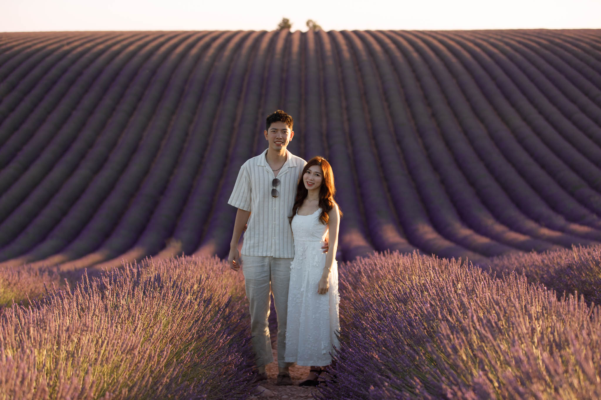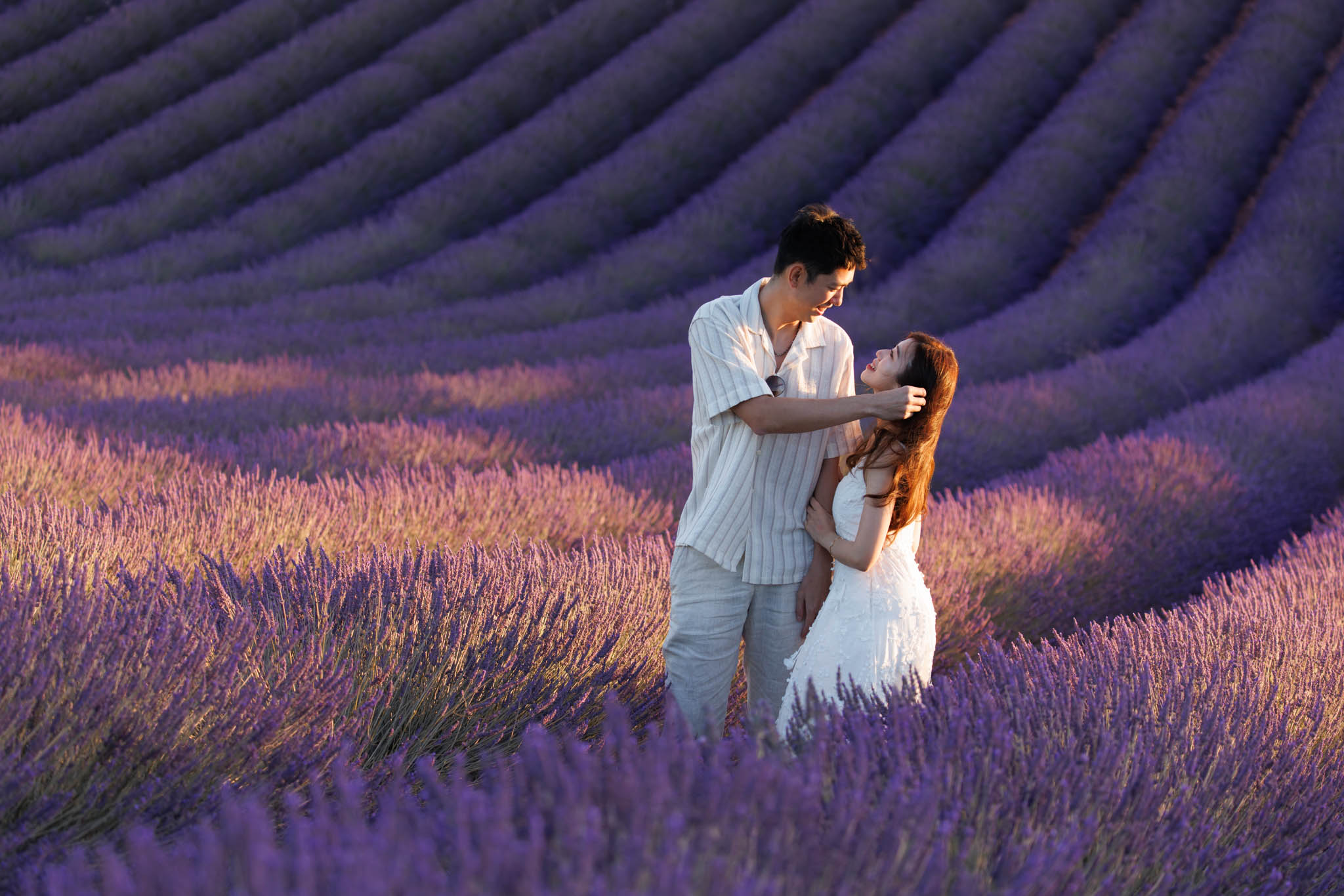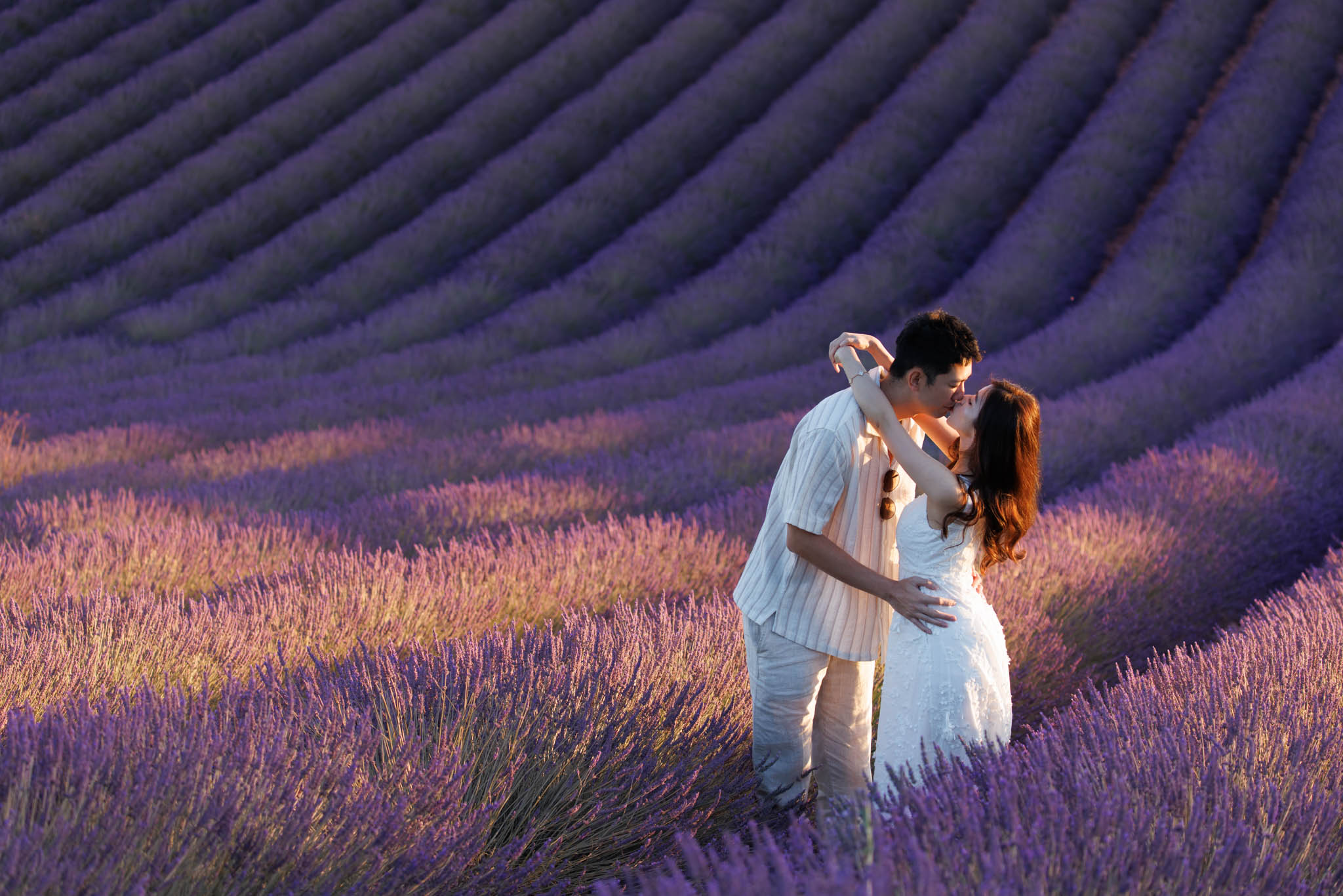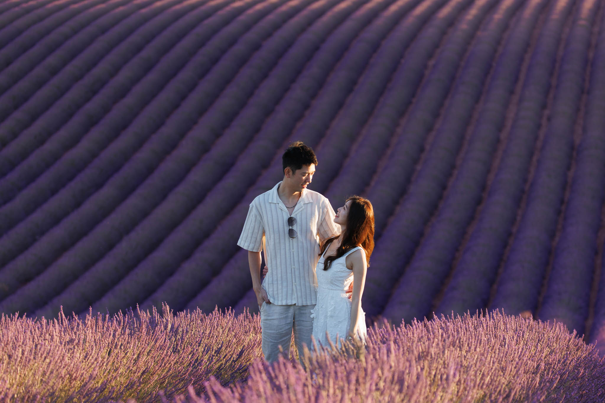In early July, J and K joined us for a sunset session from 20:30 to 21:30. K thought it was just a regular photo session, so to keep the surprise, we started at the Dip Field. The lighting from the setting sun gave a beautiful glow across the lavender, and the dramatic slope of the field made it look like it stretched on forever. We captured a lot of fun and romantic shots here before heading to the main proposal location.