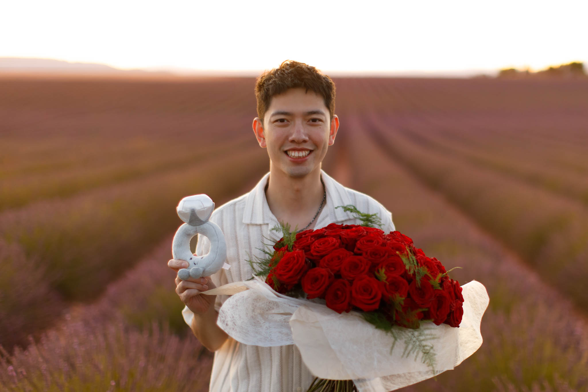 Next, we moved to the Sunset Field, where Jay planned to propose. The timing was perfect, with the sky glowing pink and orange behind them. J had brought thoughtful props, including a bouquet of 50 roses and a toy engagement ring, which made the moment extra special. He got down on one knee, and the proposal was as magical as it could be.