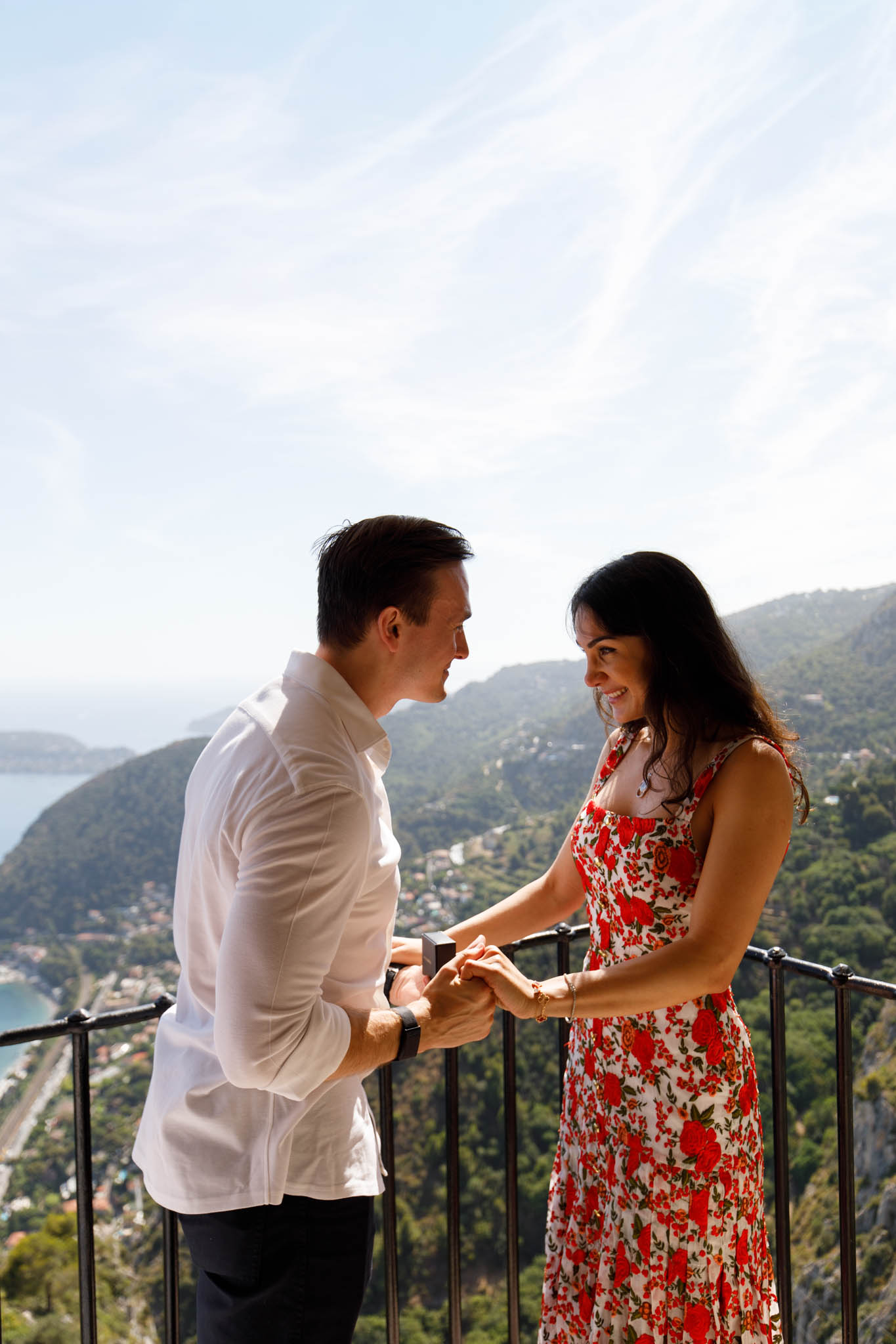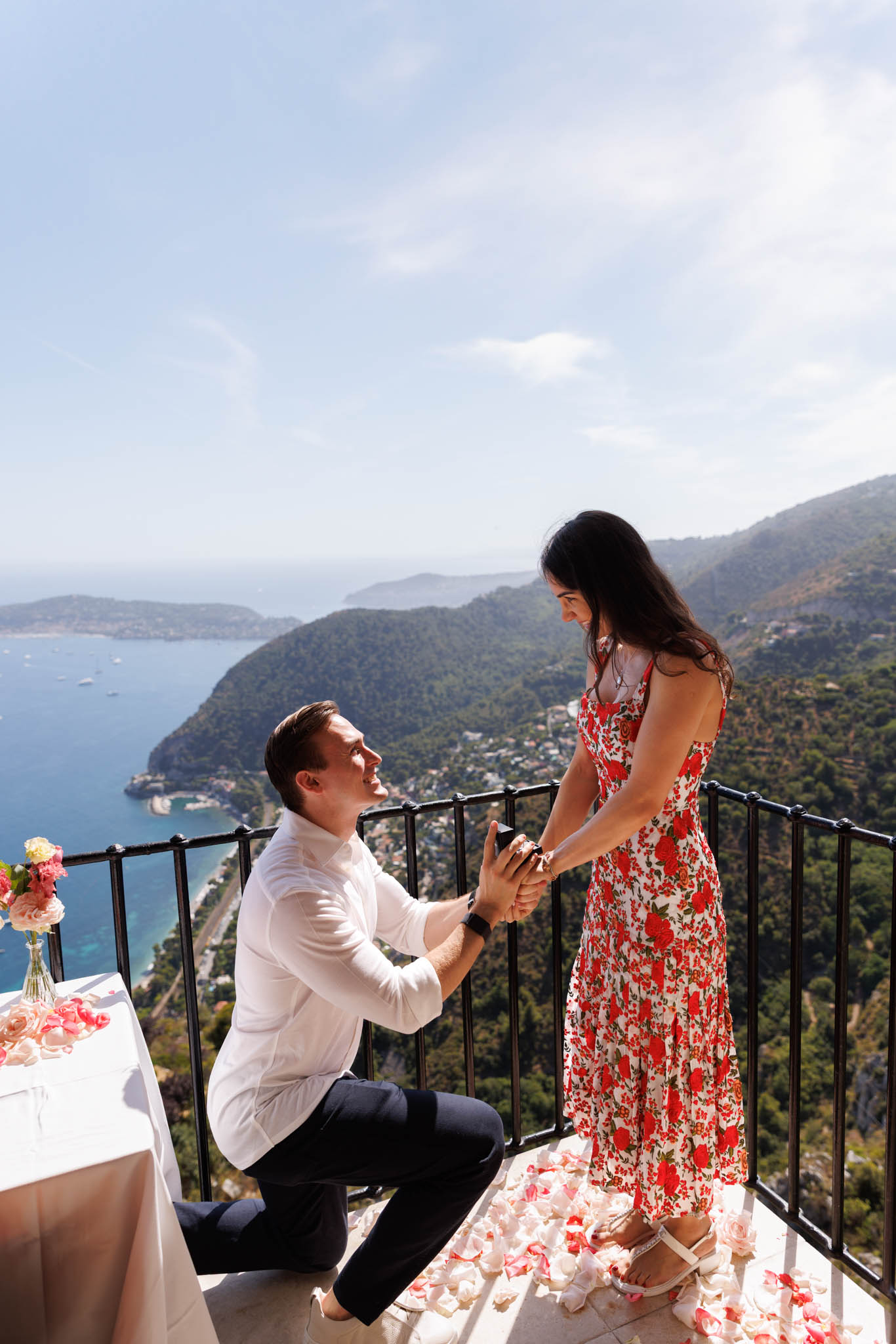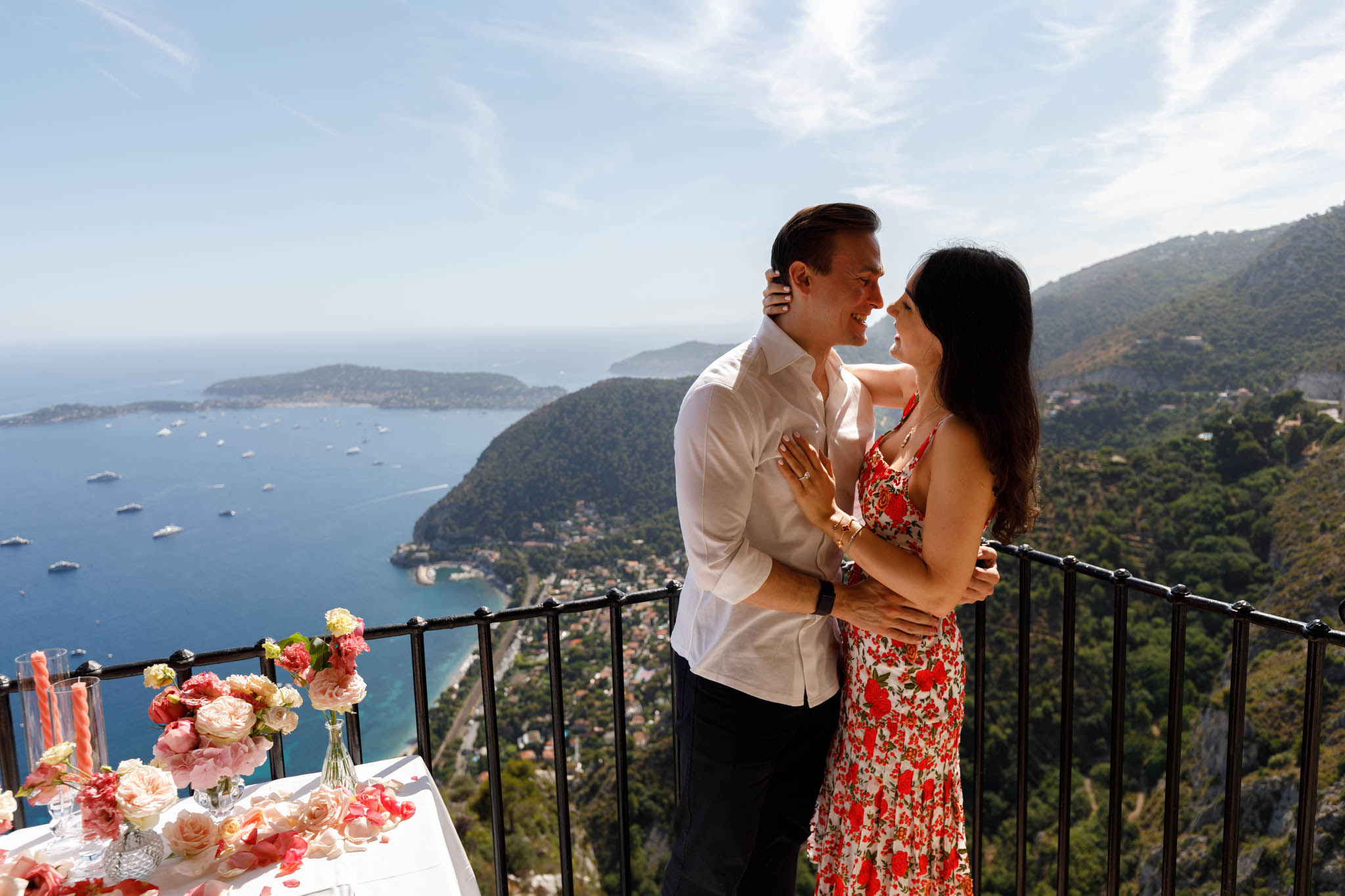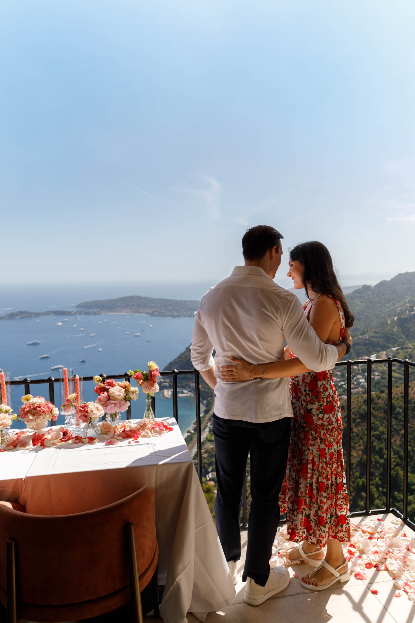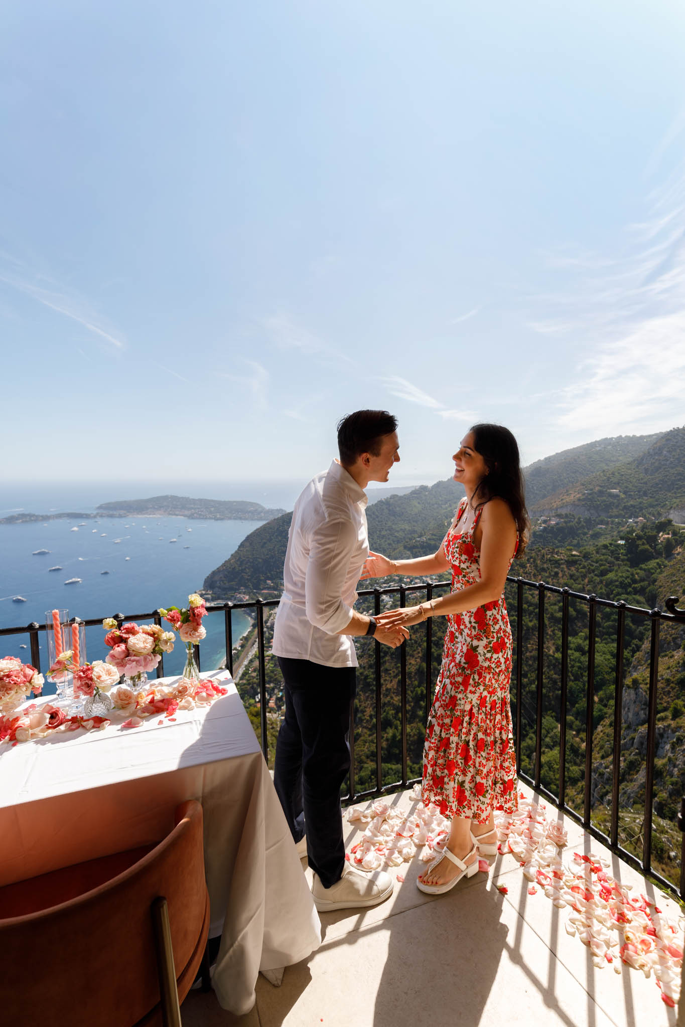 This beautiful proposal between S and C took place in late July from 16:20 to 17:20, set within the peaceful surroundings of Château Eza. C chose this location because he wanted an intimate and private moment, and the balcony at the hotel offers exactly that.