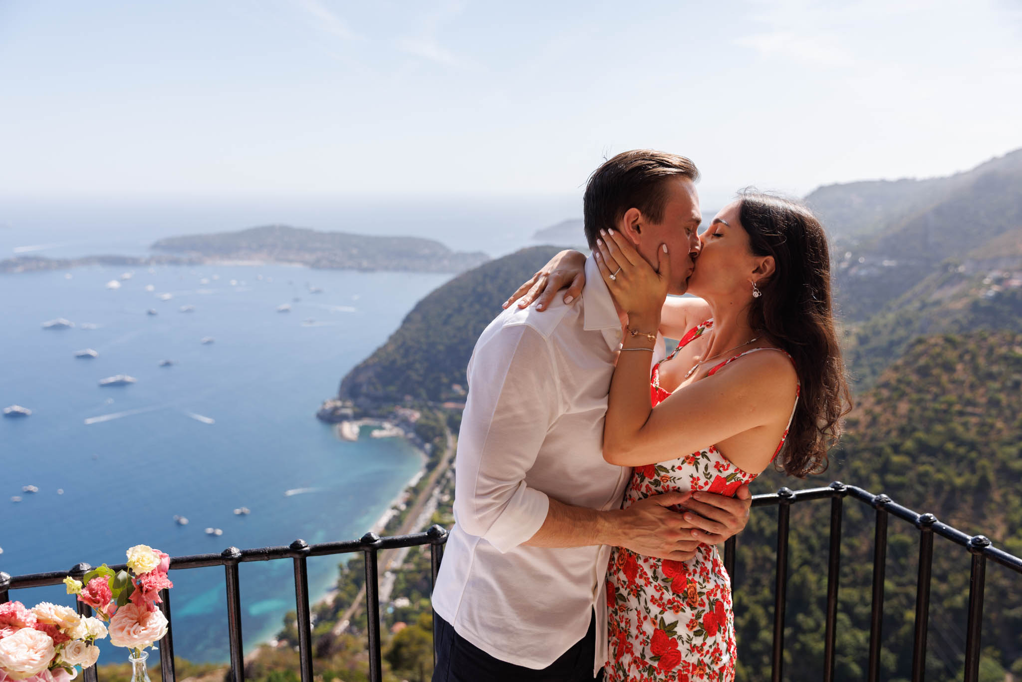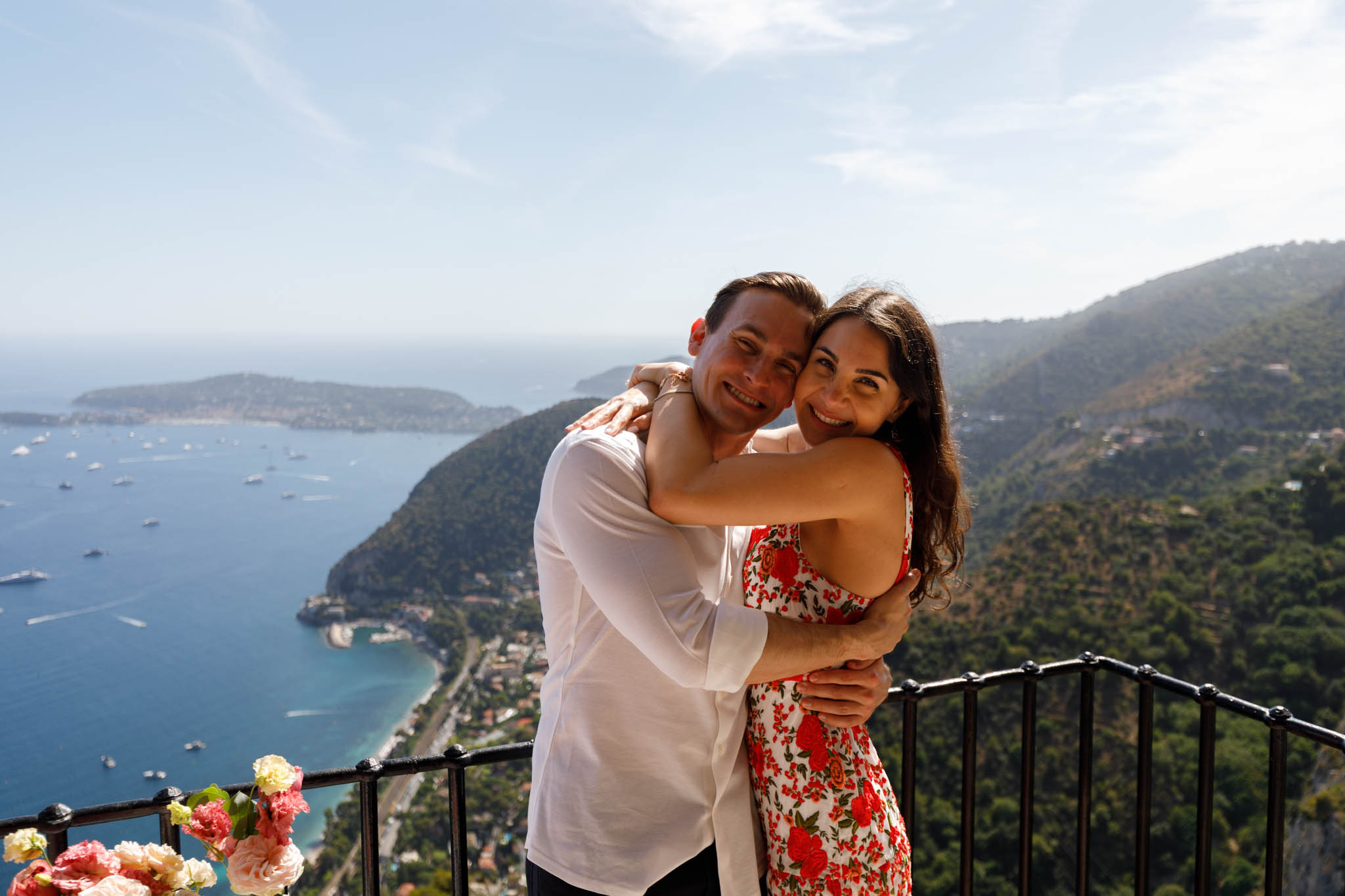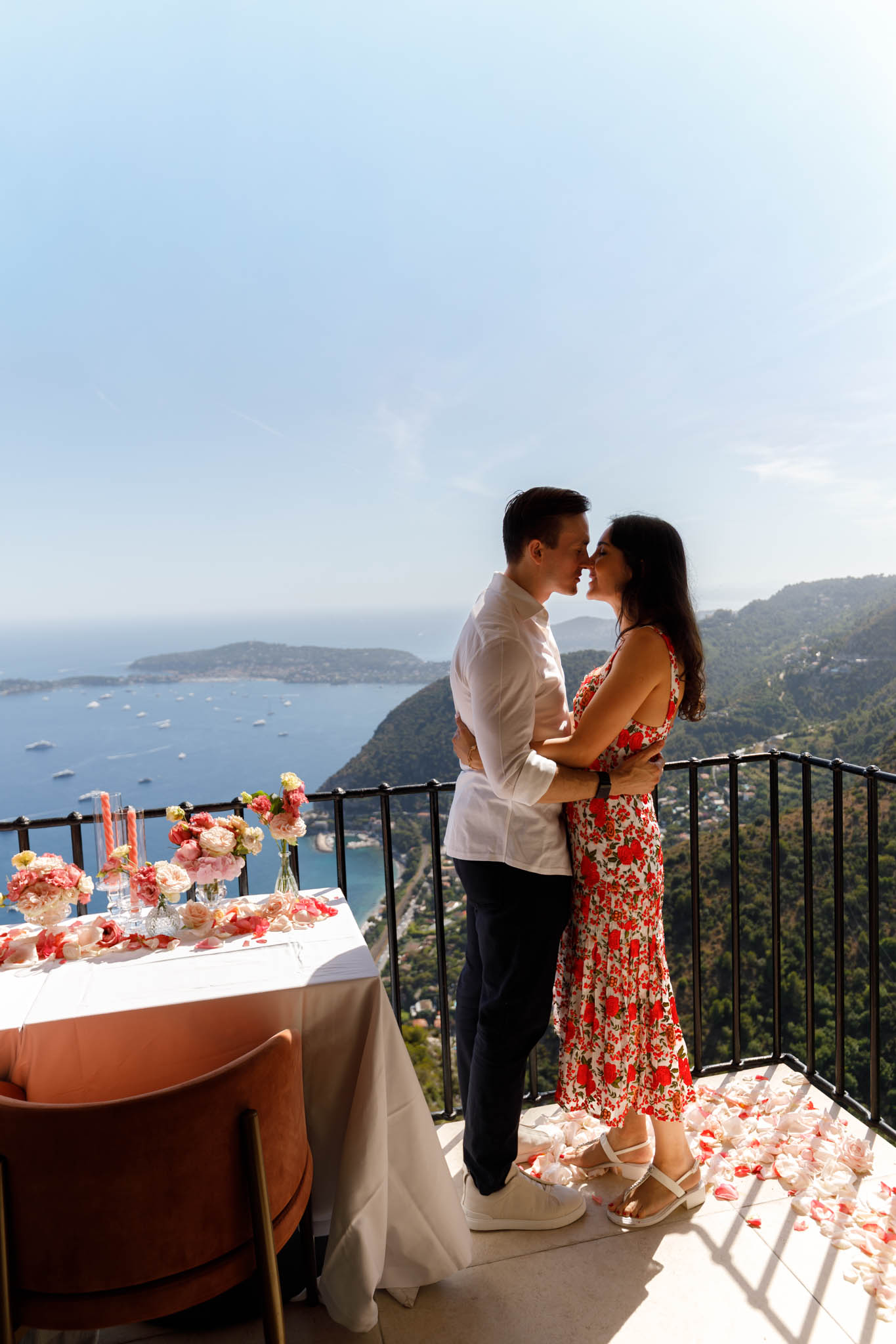 C proposed on the balcony with soft afternoon light surrounding them. This time of day is especially beautiful in Èze.