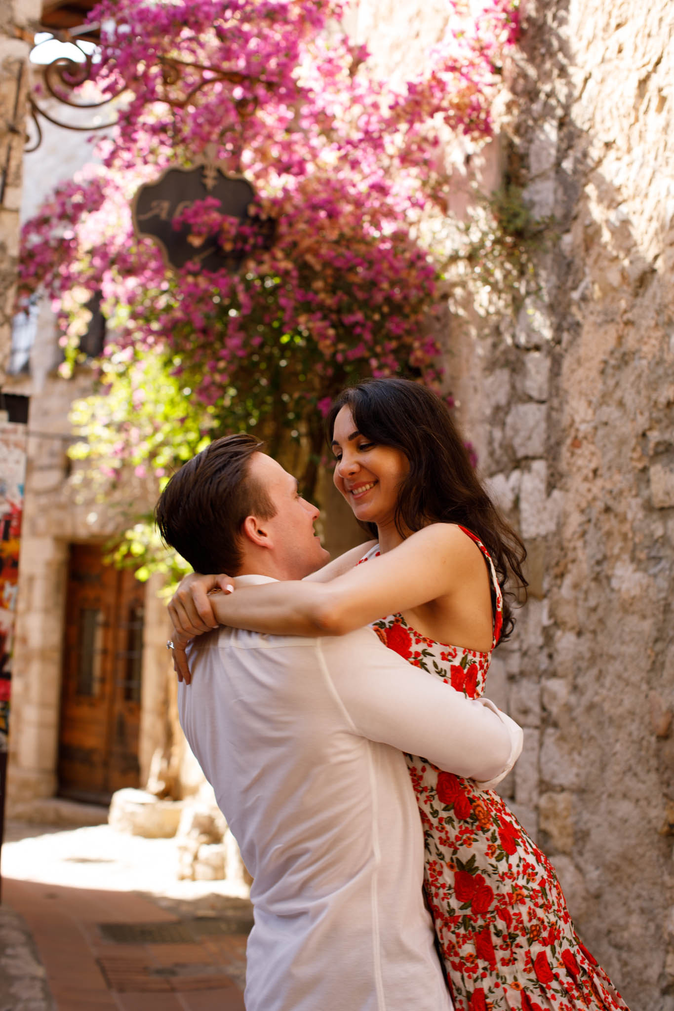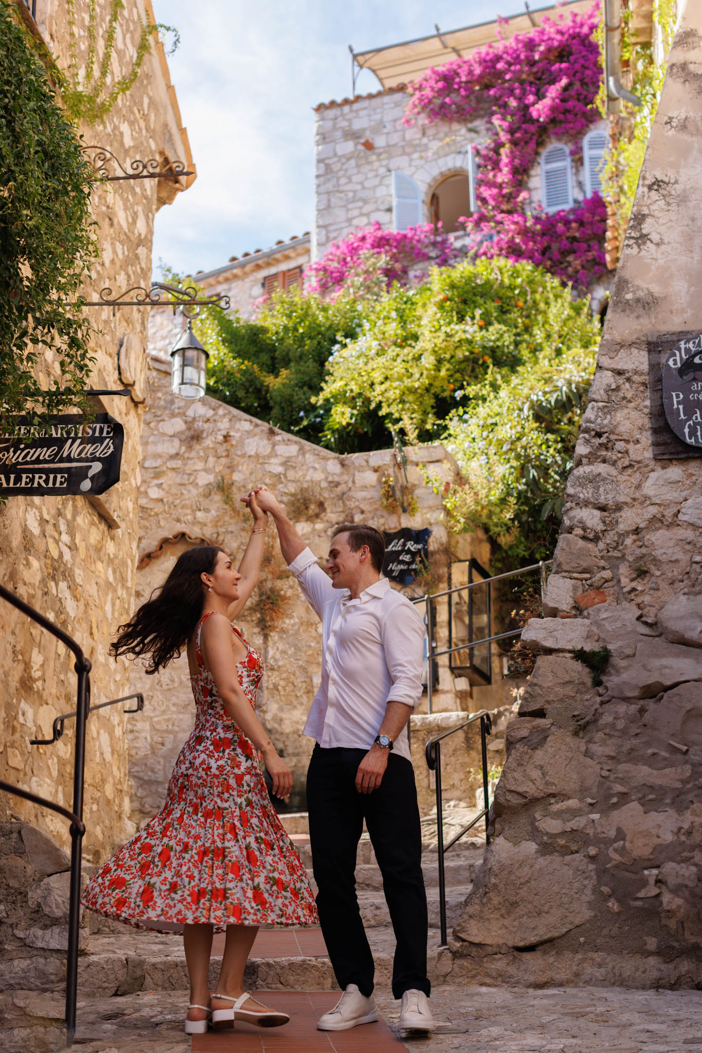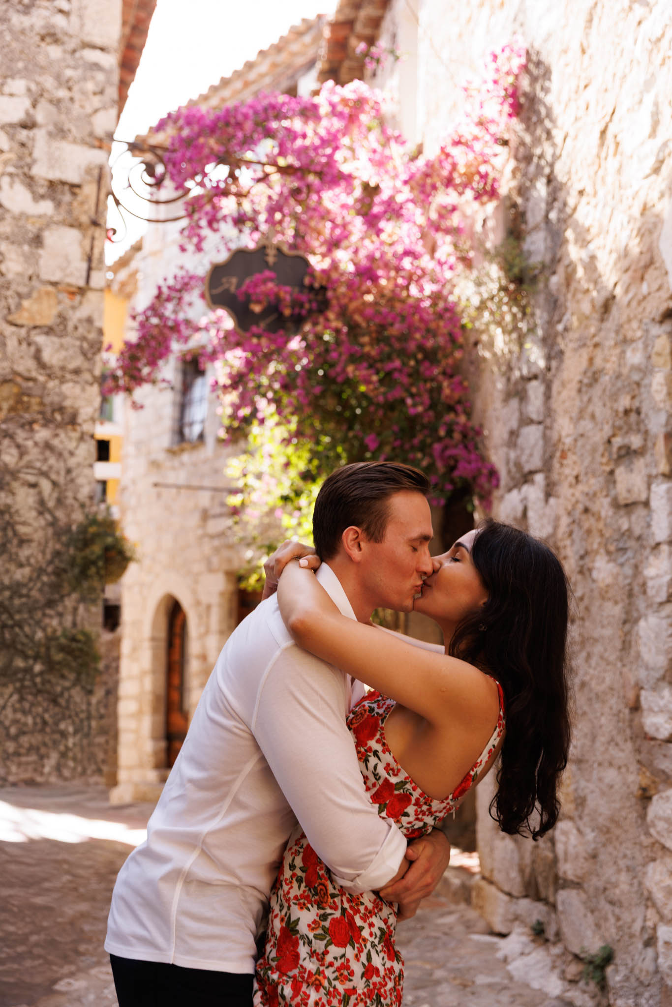 After the proposal, we spent time wandering through the village for a relaxed portrait session. Èze is a hilltop medieval village filled with winding cobblestone paths, ivy-covered stone walls, and quiet corners that open onto sweeping views of the Mediterranean. Every turn feels cinematic, with warm tones and a peaceful atmosphere that makes it one of the most enchanting locations on the French Riviera.