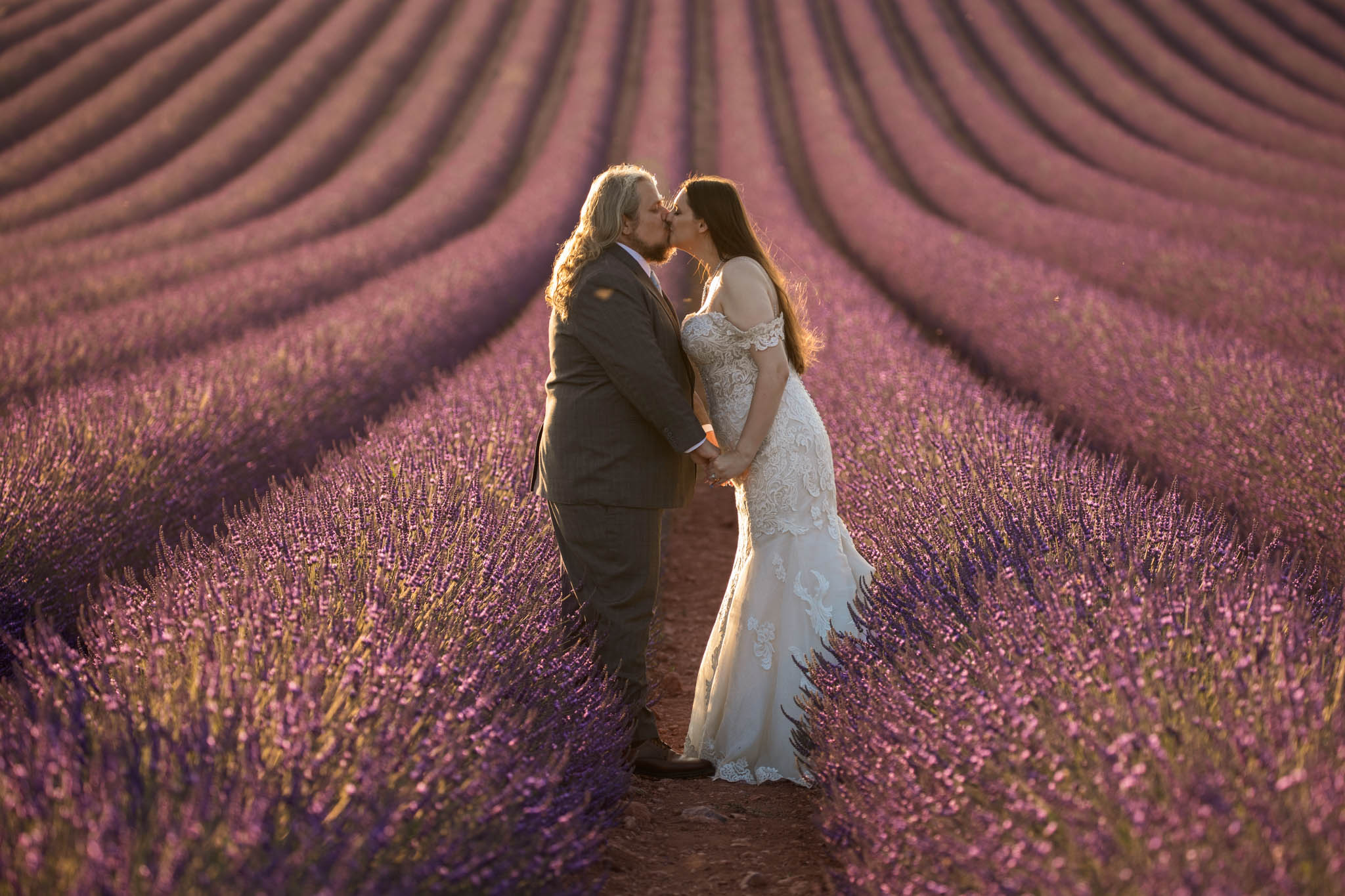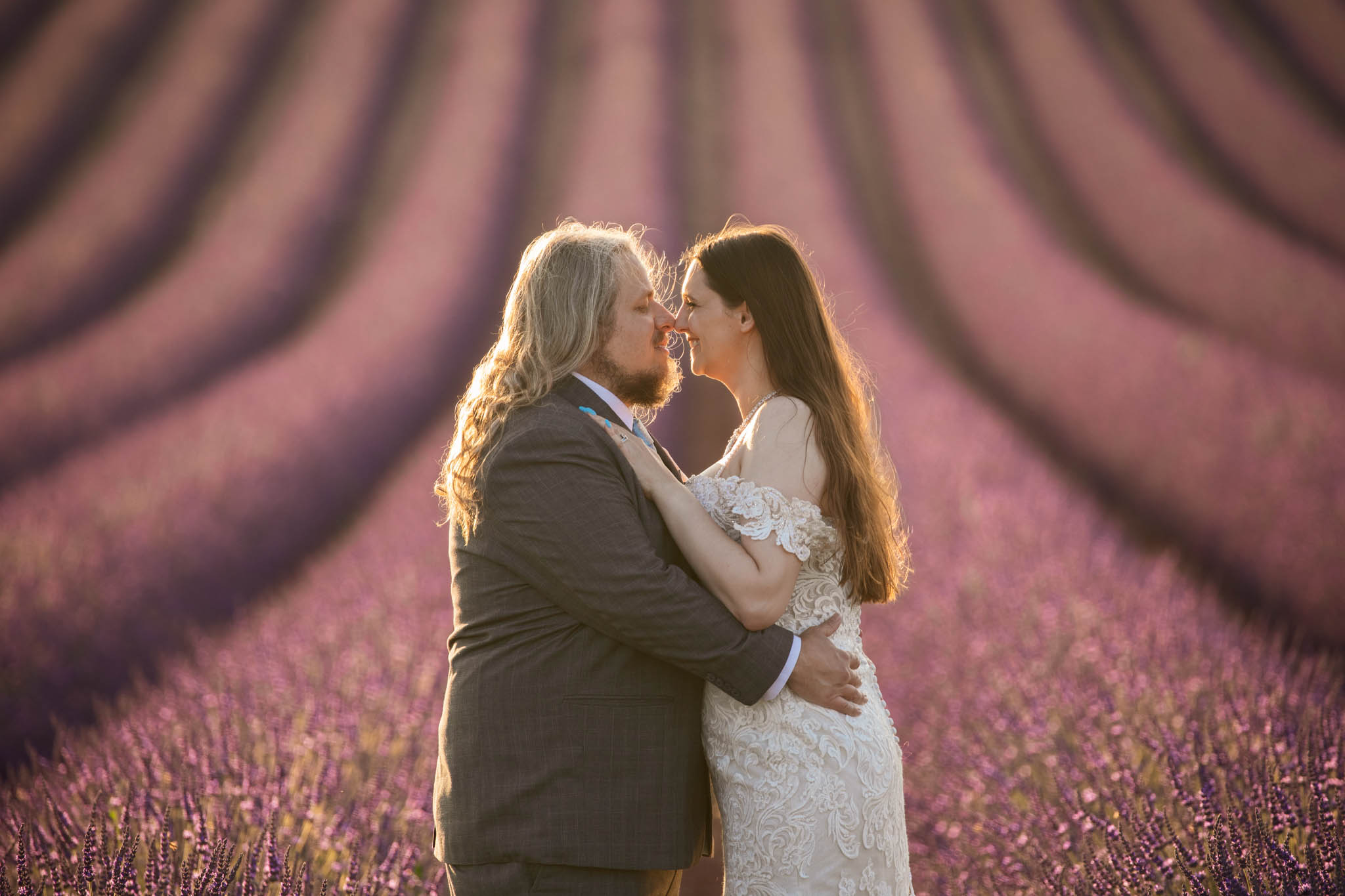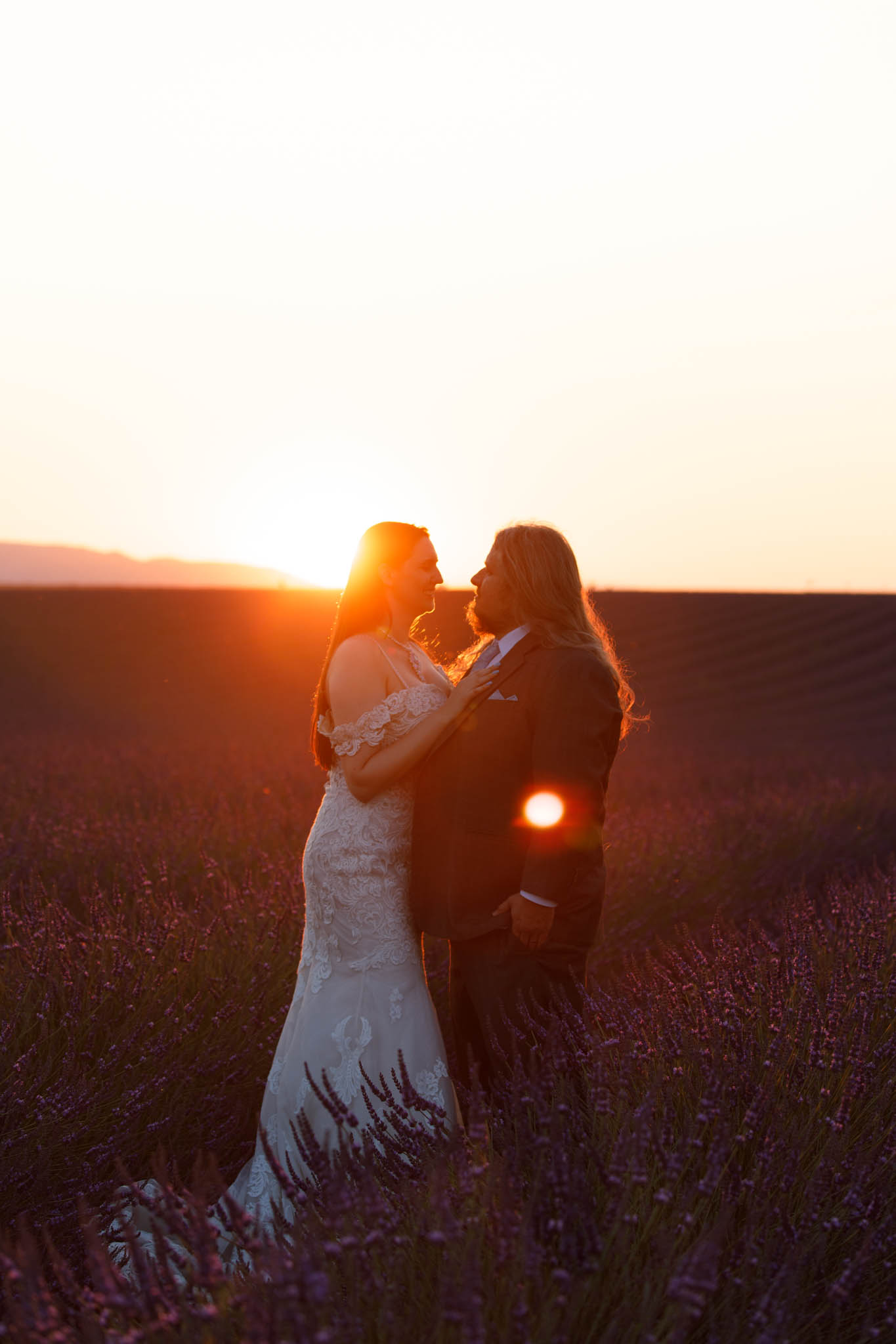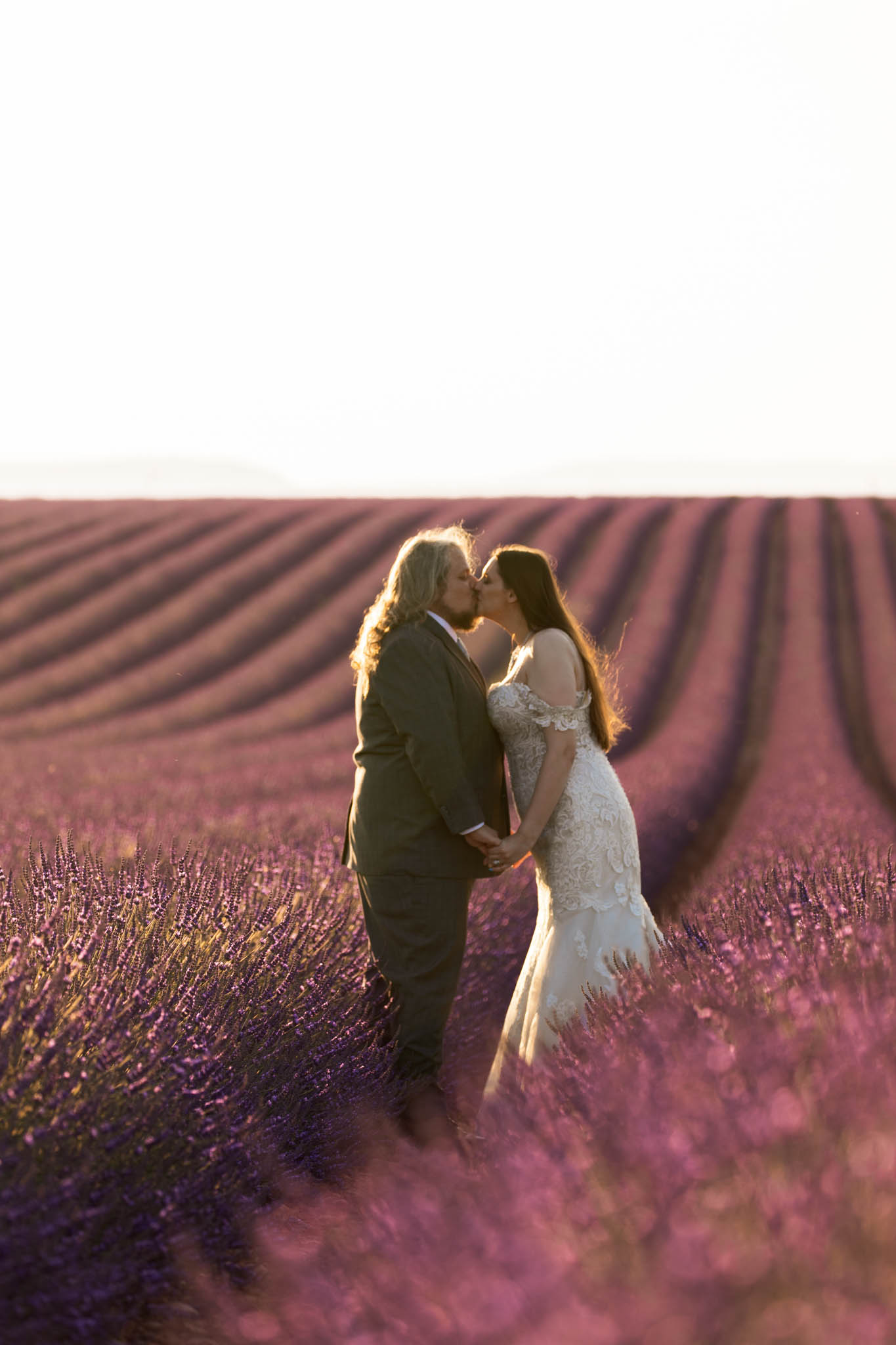 We selected a quieter field located between Lavandes Angelvin and Valensole. This field is ideal for sunset sessions because it receives direct light from behind, creating a warm golden glow across the lavender, making it perfect for an intimate elopement.