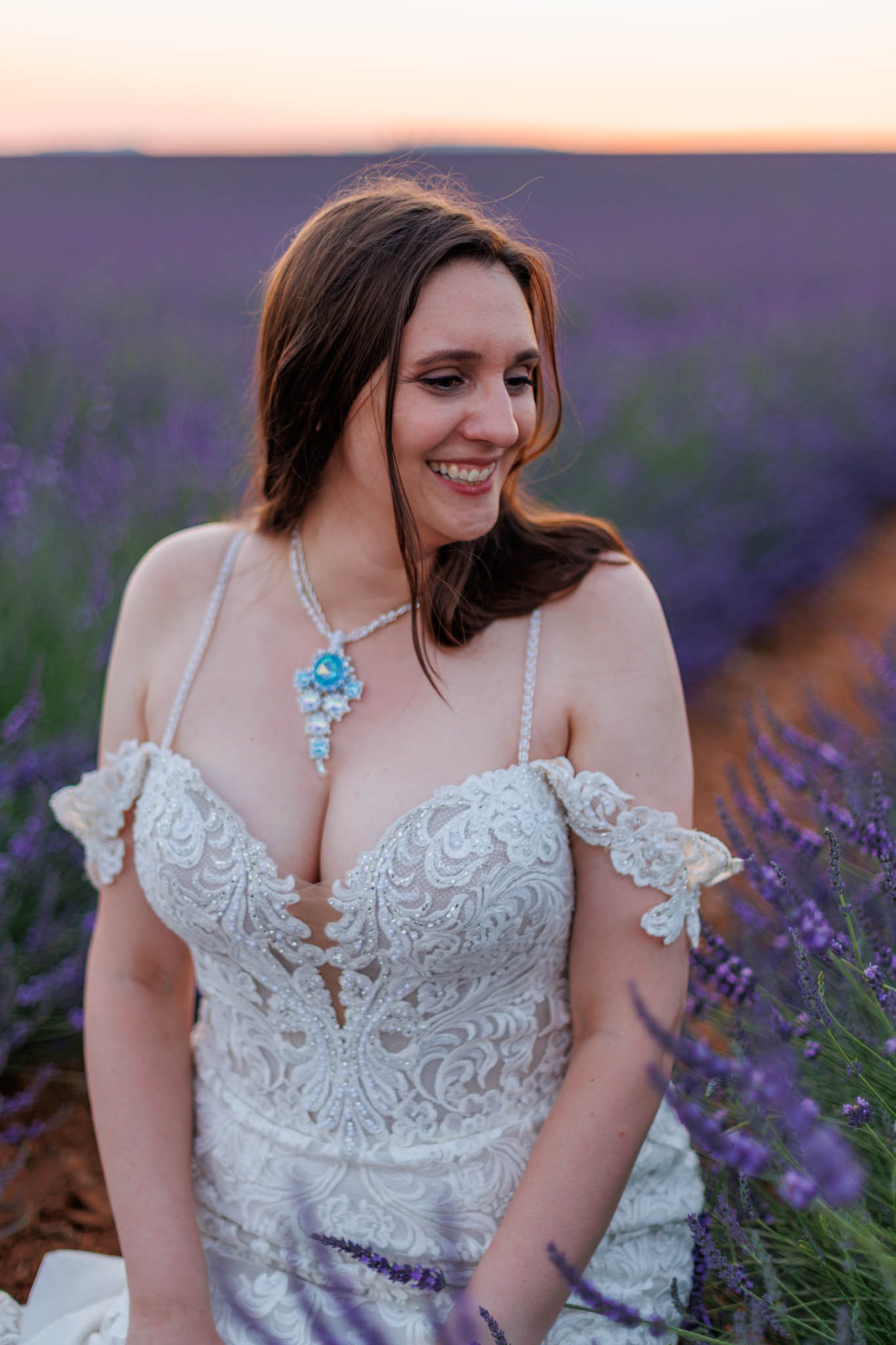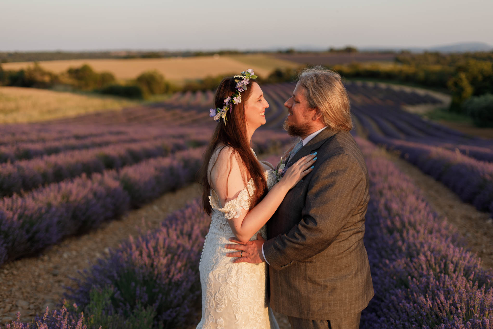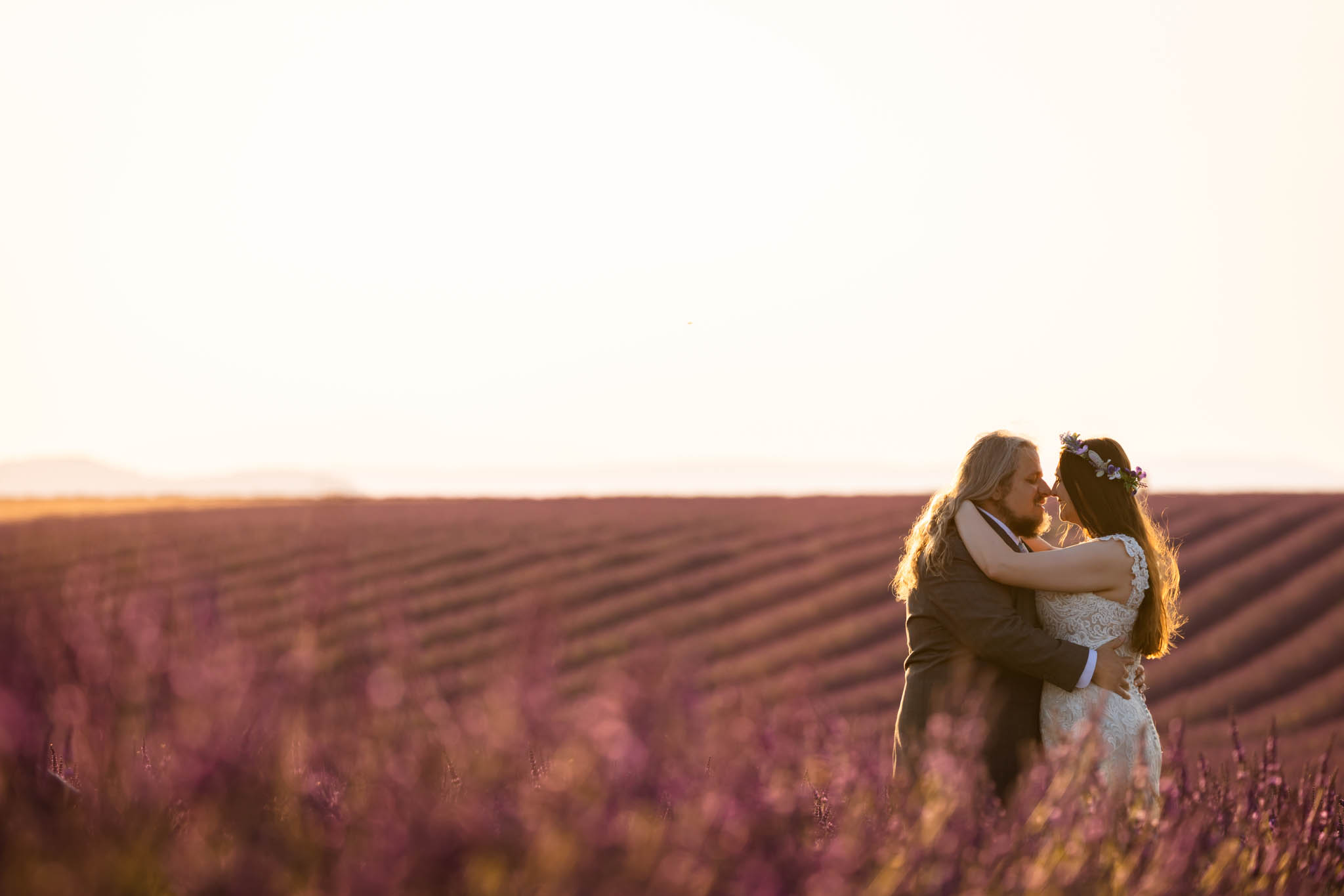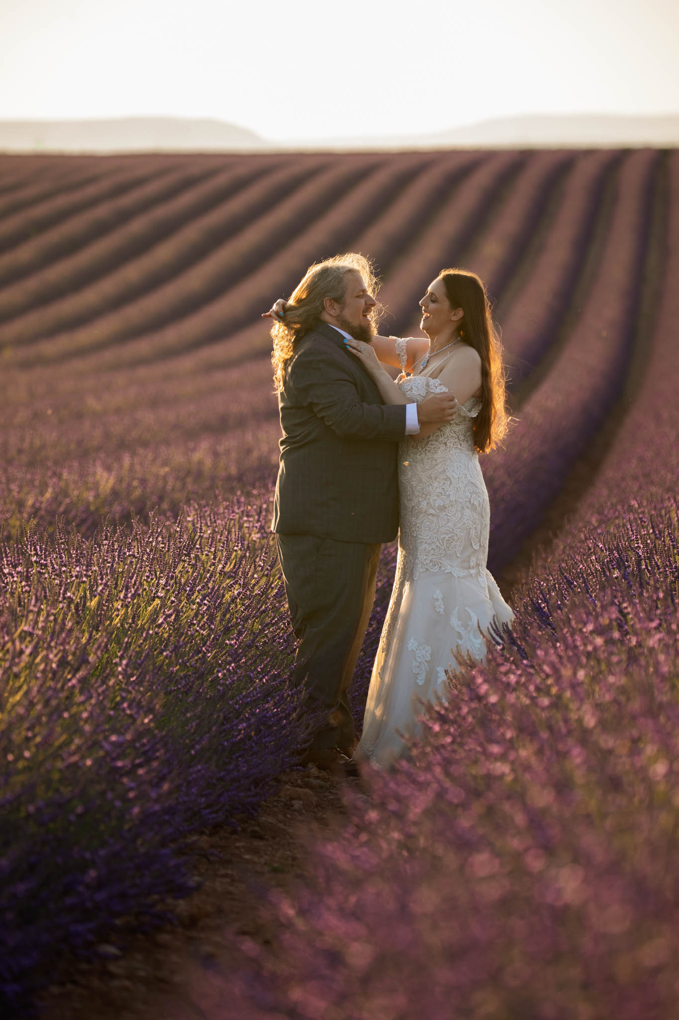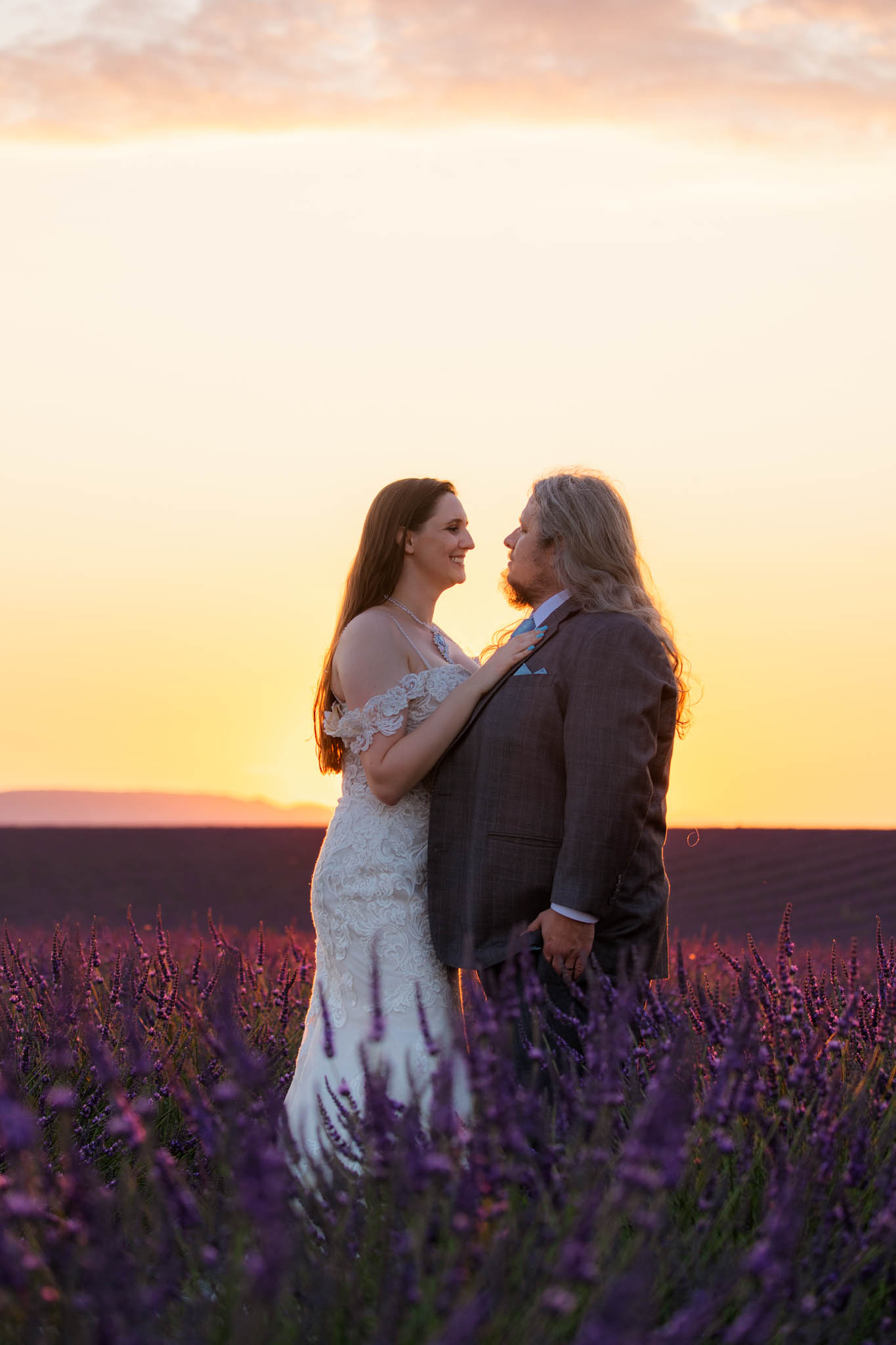 We selected a quieter field located between Lavandes Angelvin and Valensole. This field is ideal for sunset sessions because it receives direct light from behind, creating a warm golden glow across the lavender, making it perfect for an intimate elopement.