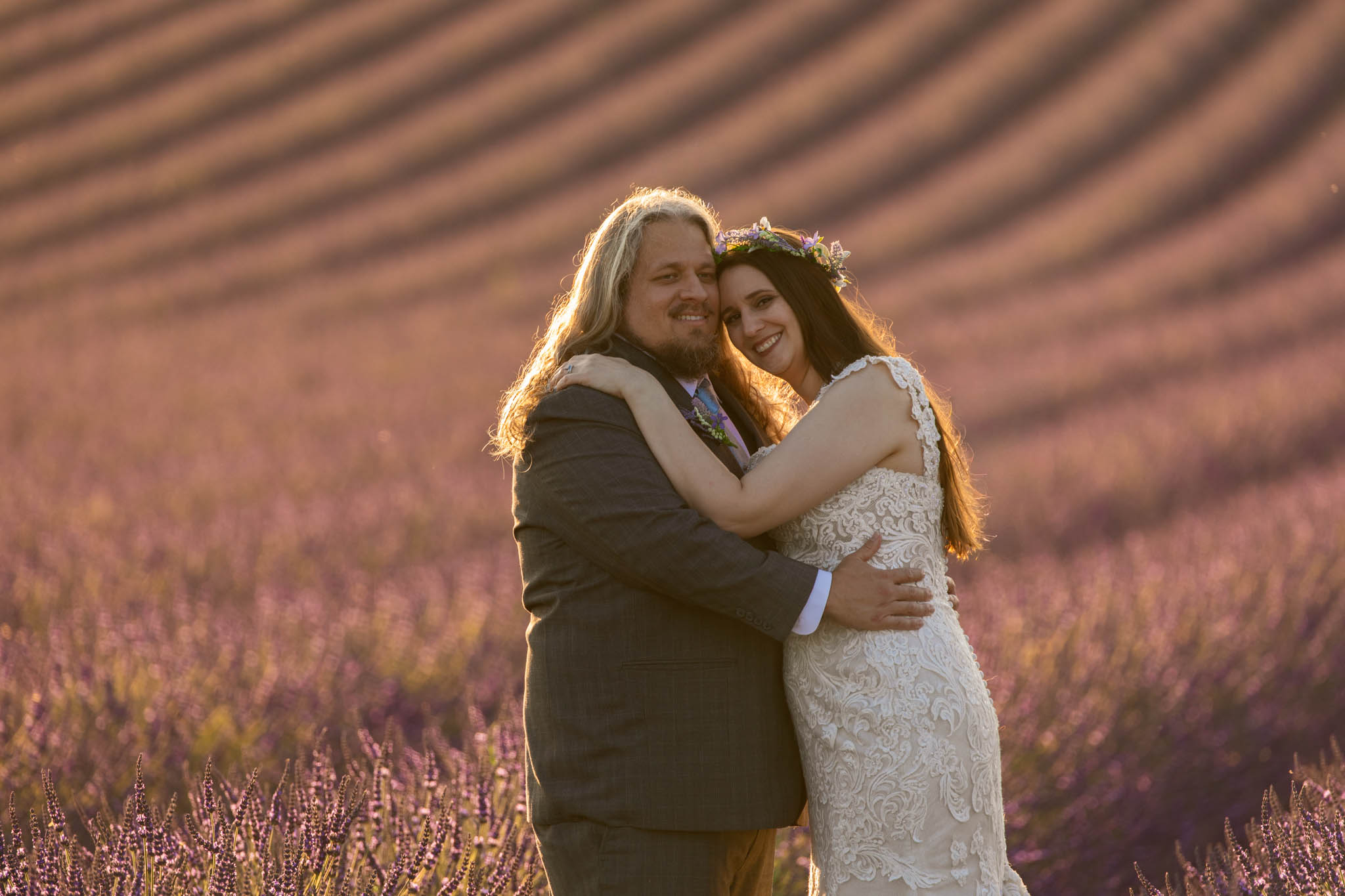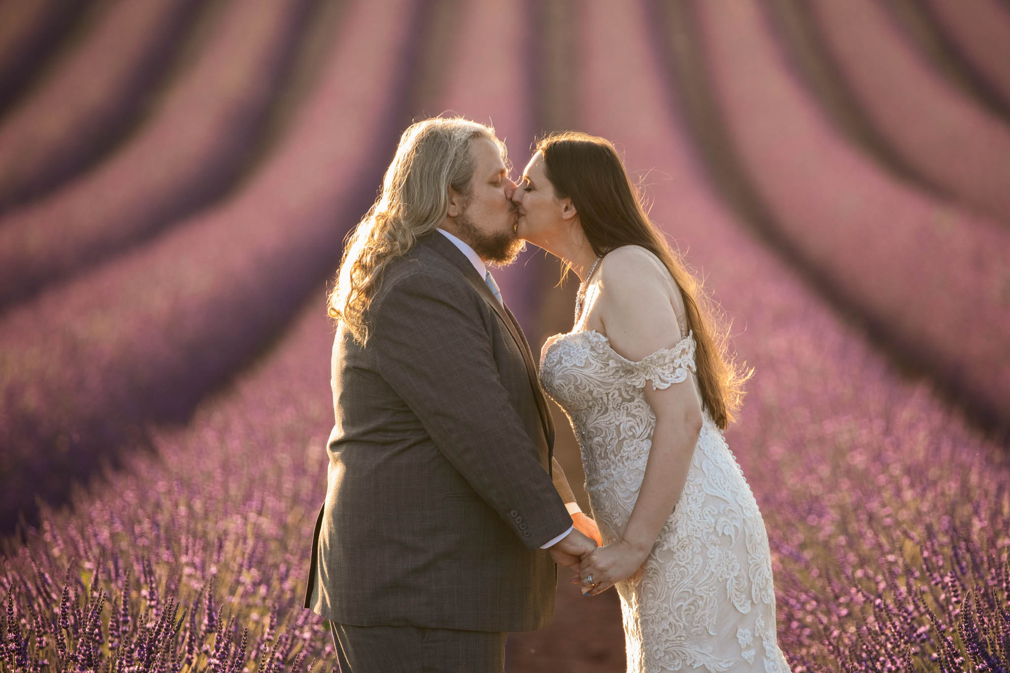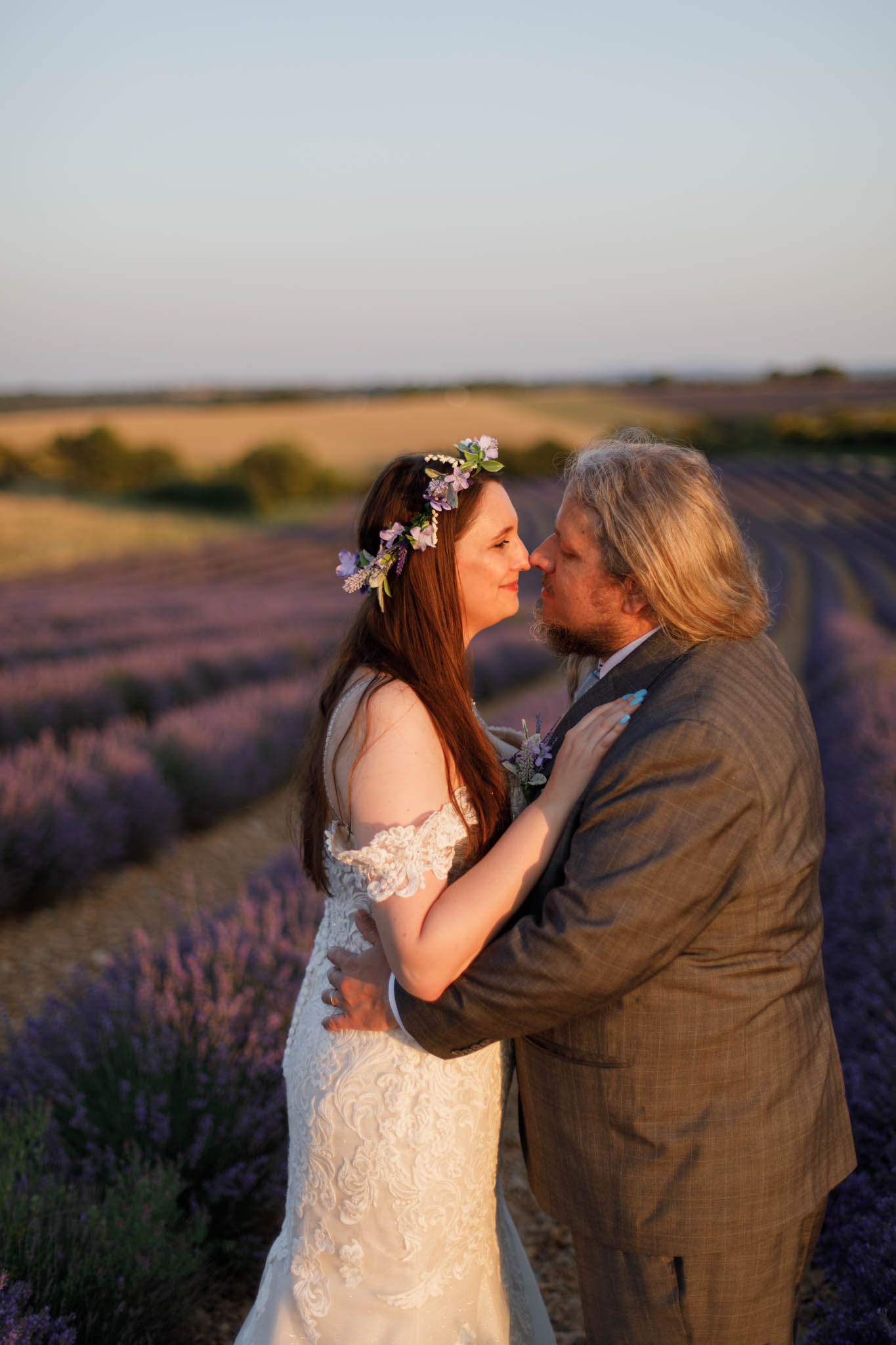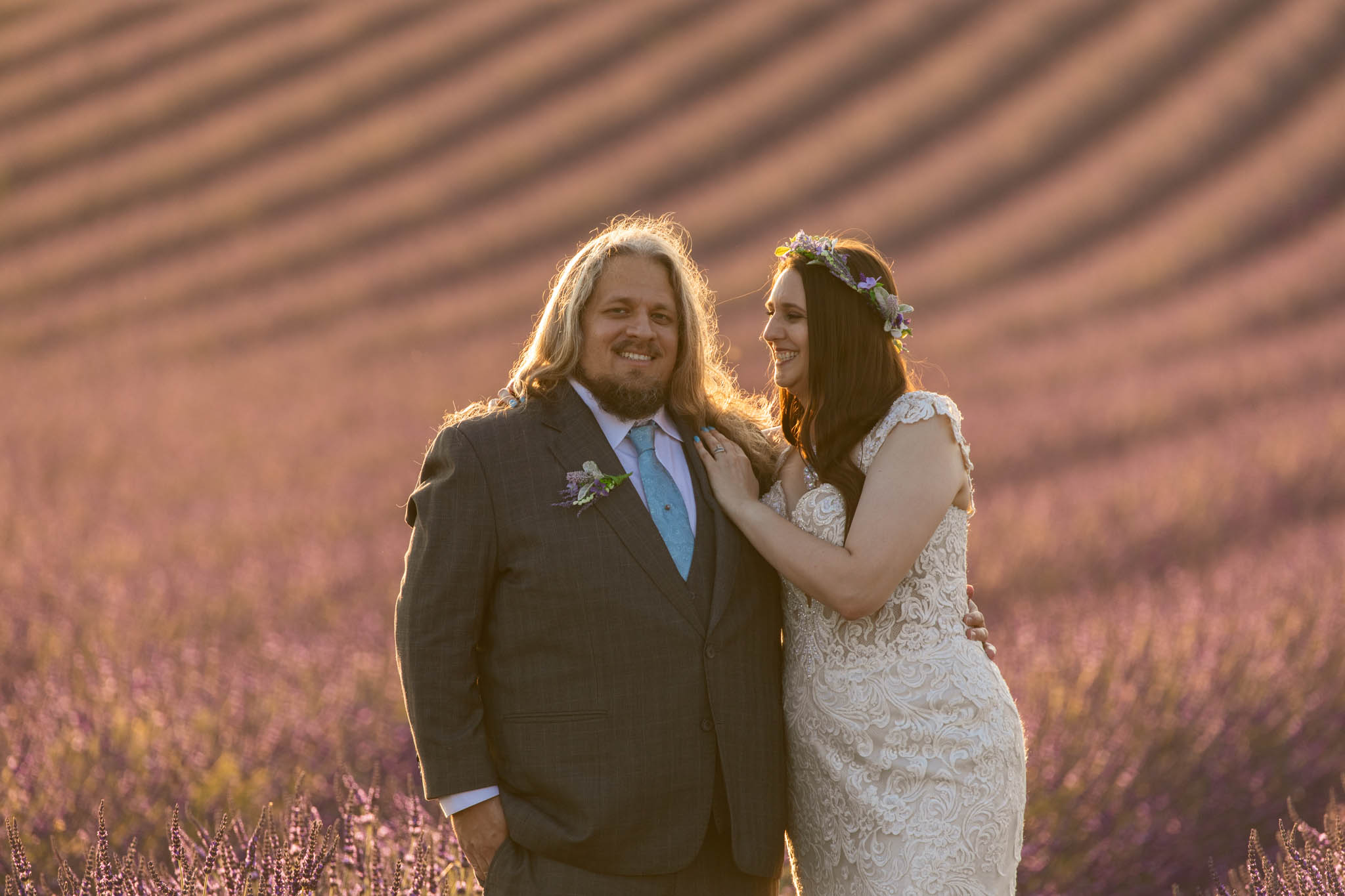 The light remained perfect, softening as the sun continued to set, and the couple looked stunning against the textured lavender and gentle curves of the field.