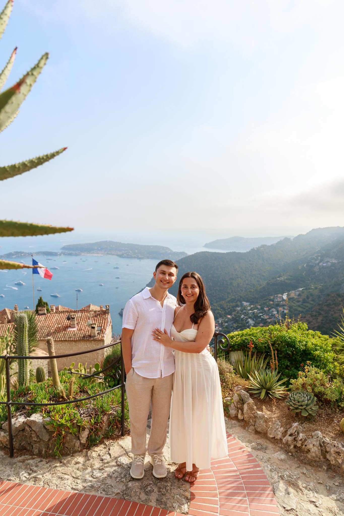 This proposal between A and D took place in mid-July from 17:20 to 18:20 inside the beautiful Jardin Exotique d’Èze. D chose this location for its breathtaking panoramic views over the sea, one of the only places in the village where the water is visible without booking a private hotel venue. Access to the garden requires general admission tickets plus a photography fee of 200€, but the setting, atmosphere, and scenery make it entirely worth it.