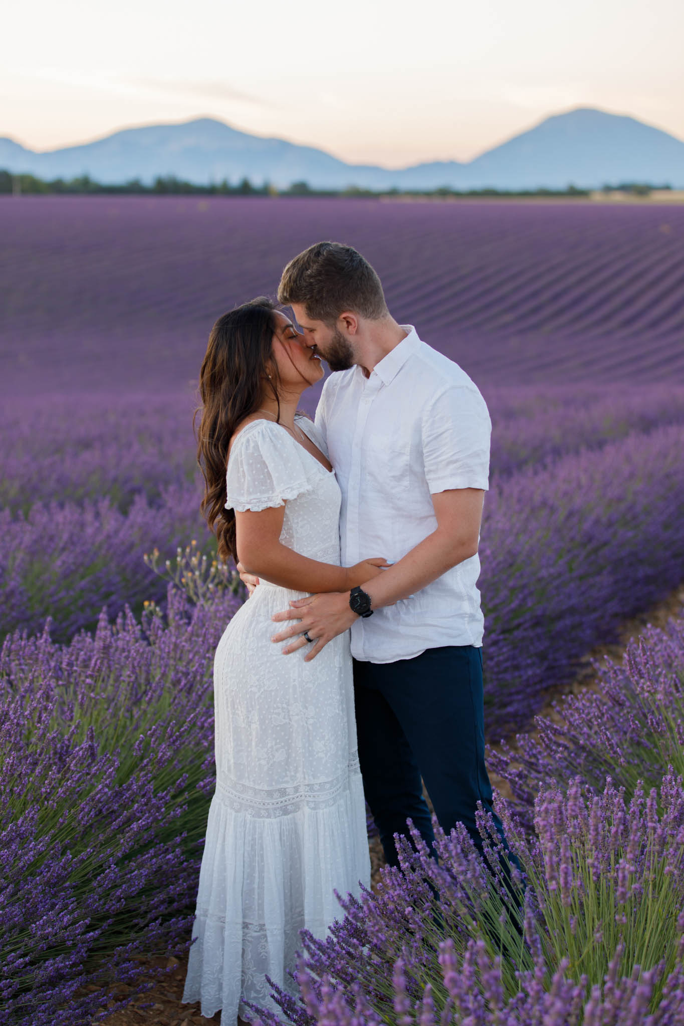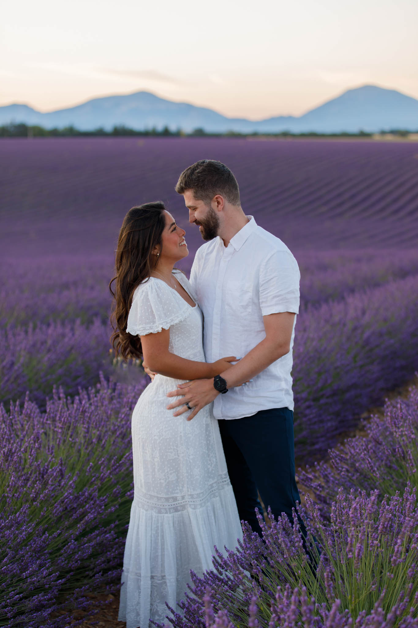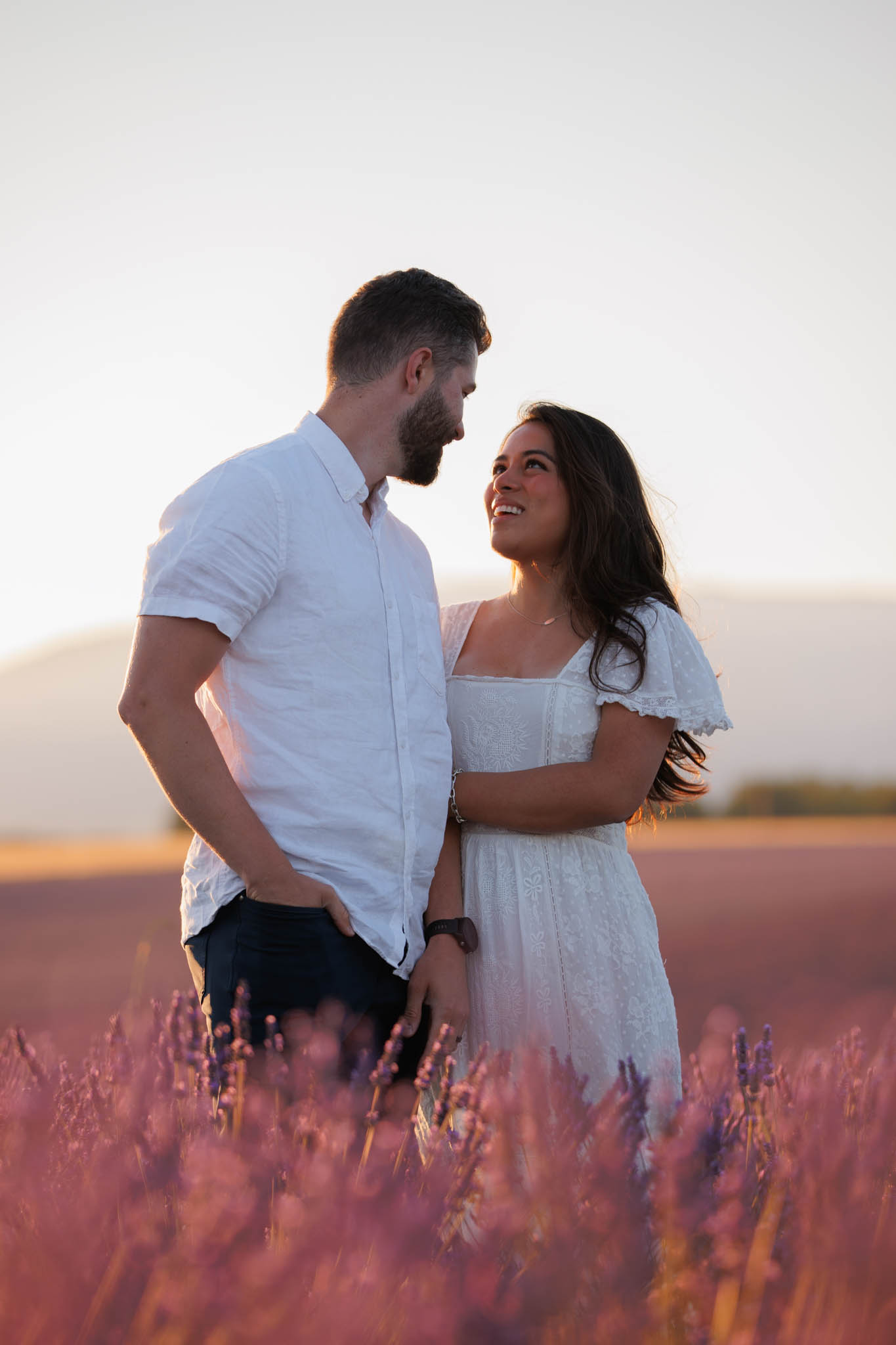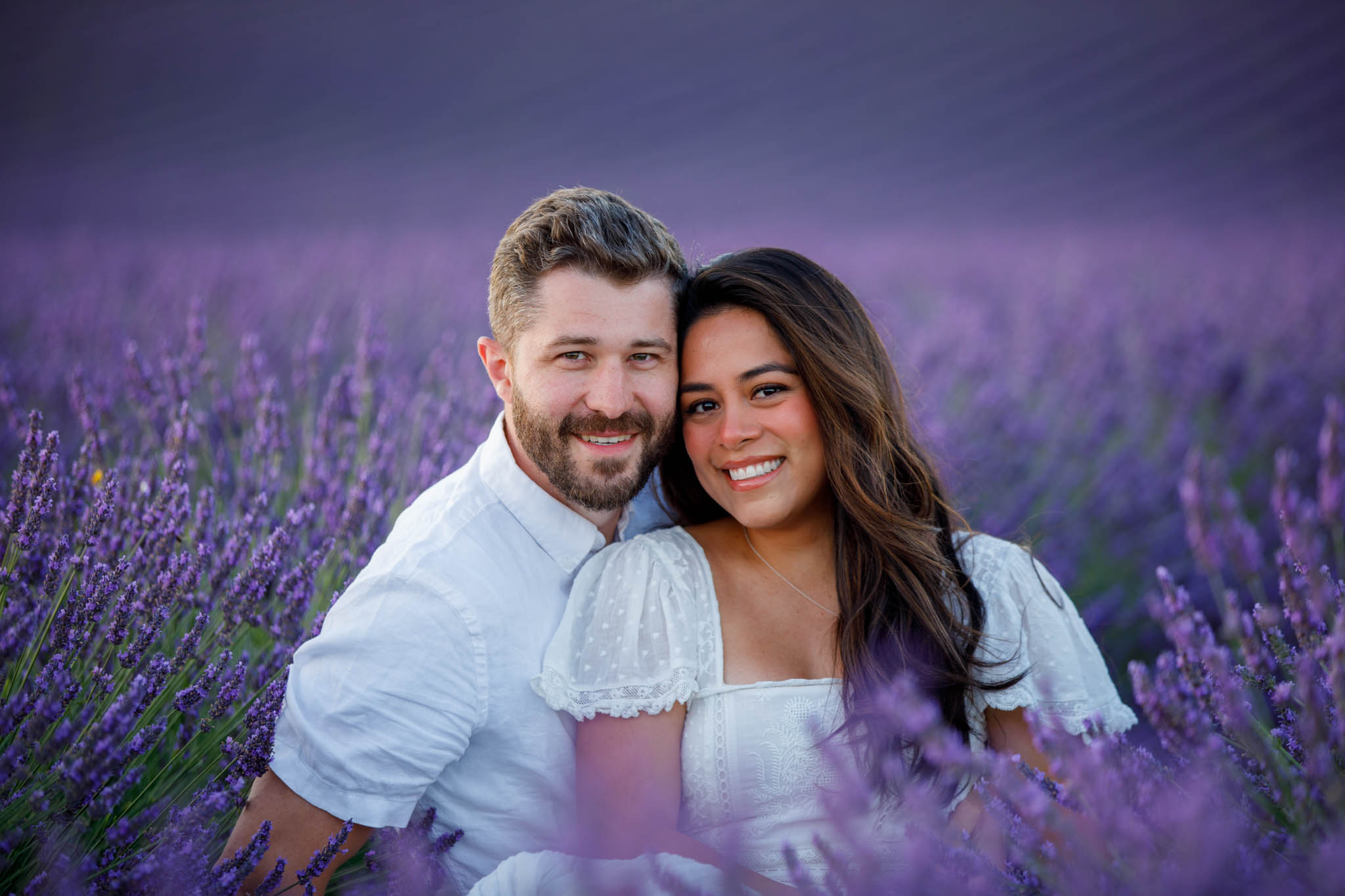 J and S were simply travelling through the region and wanted beautiful photos together. It was a relaxed and casual session, just the two of them enjoying the moment. They both wore white, which works perfectly in lavender fields. The white outfits stood out against the purple tones and kept the images looking fresh and timeless.