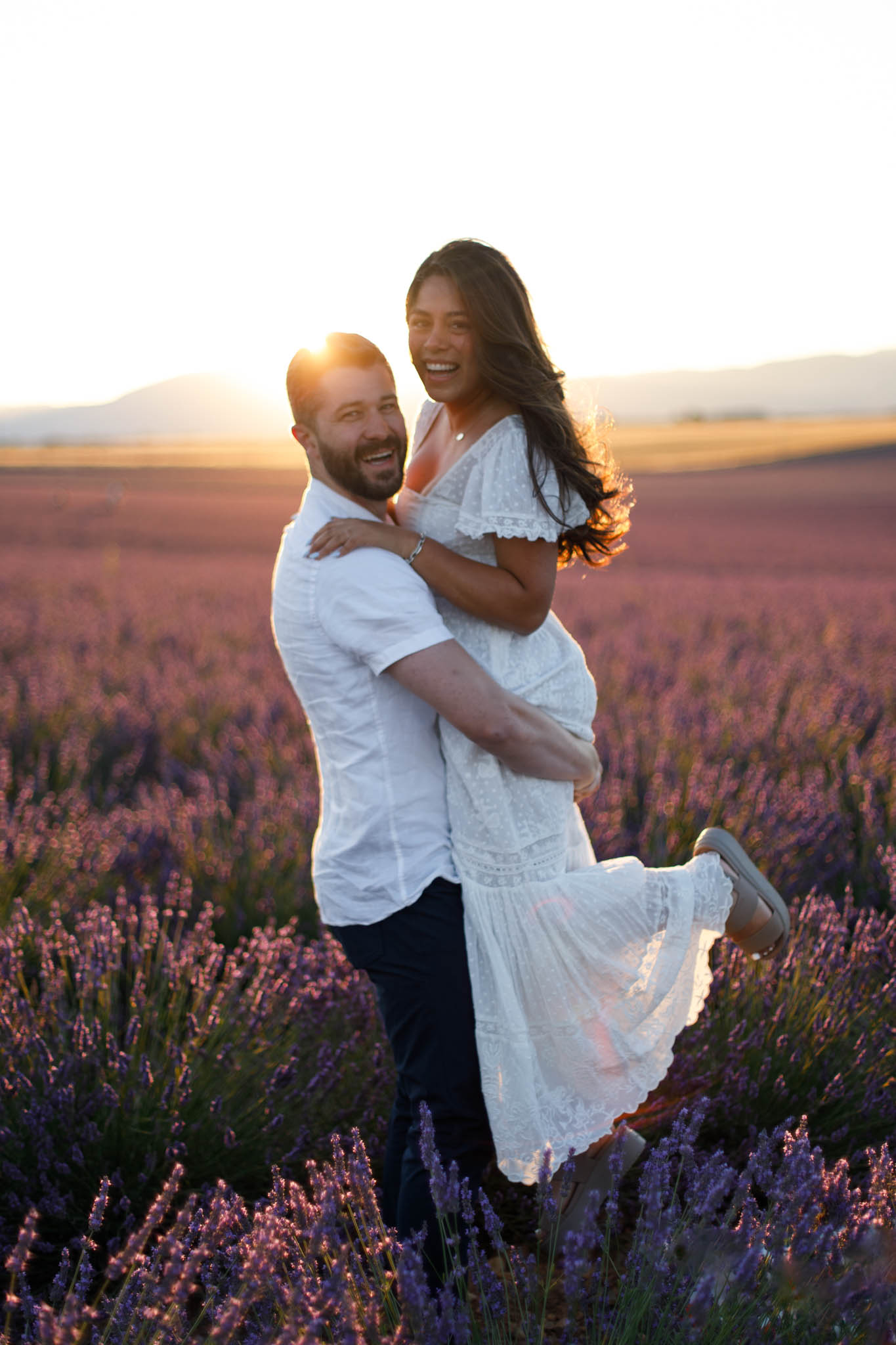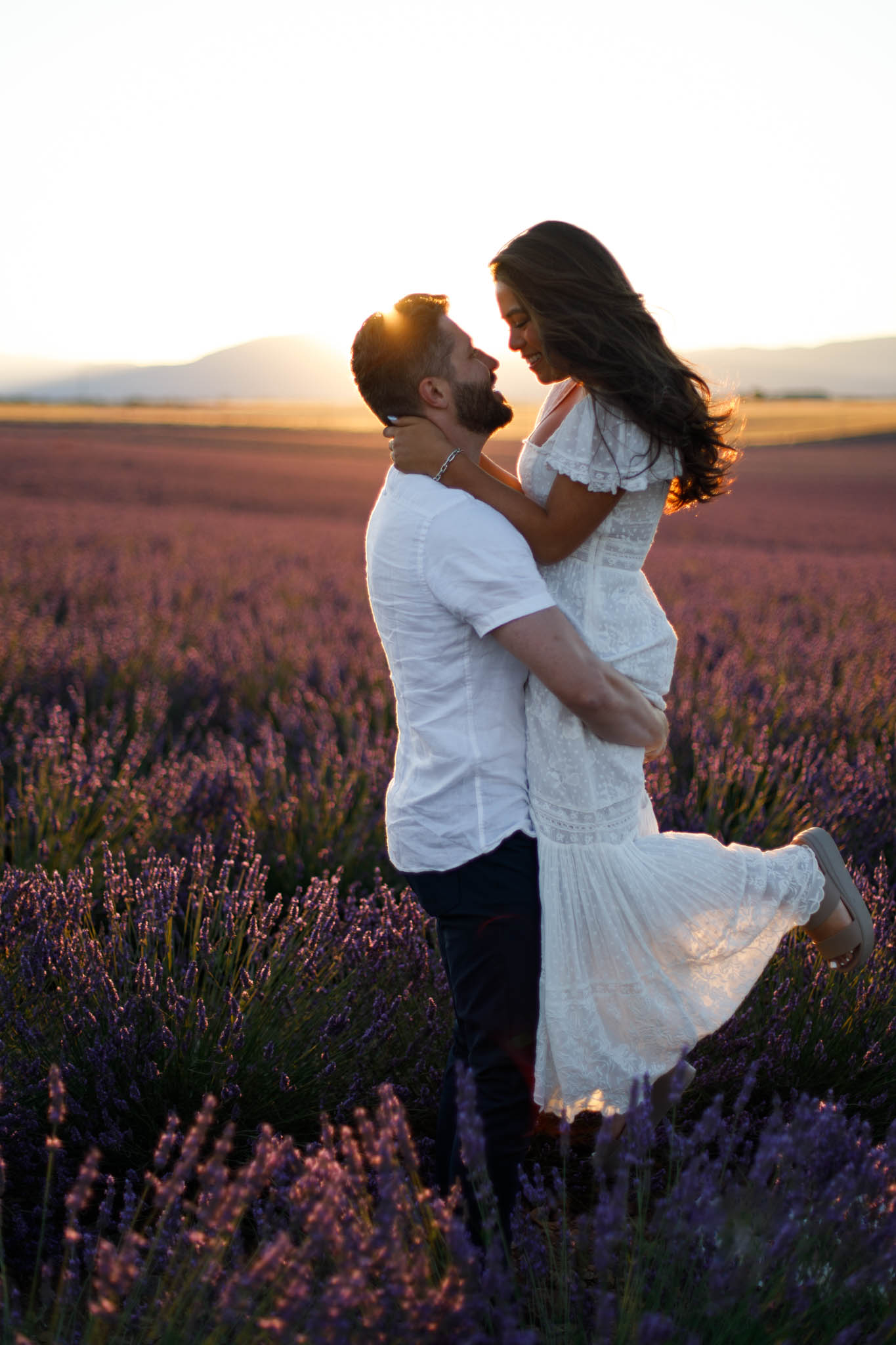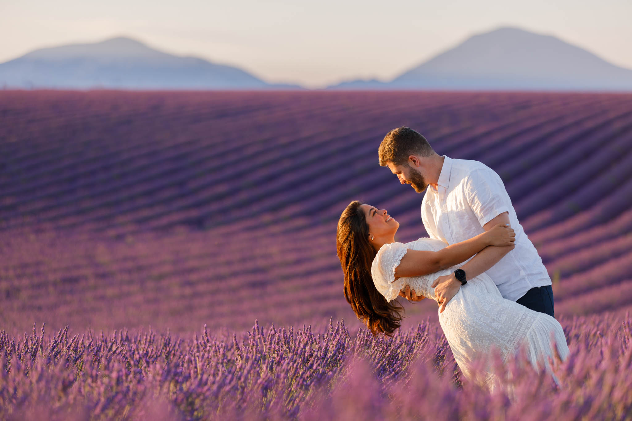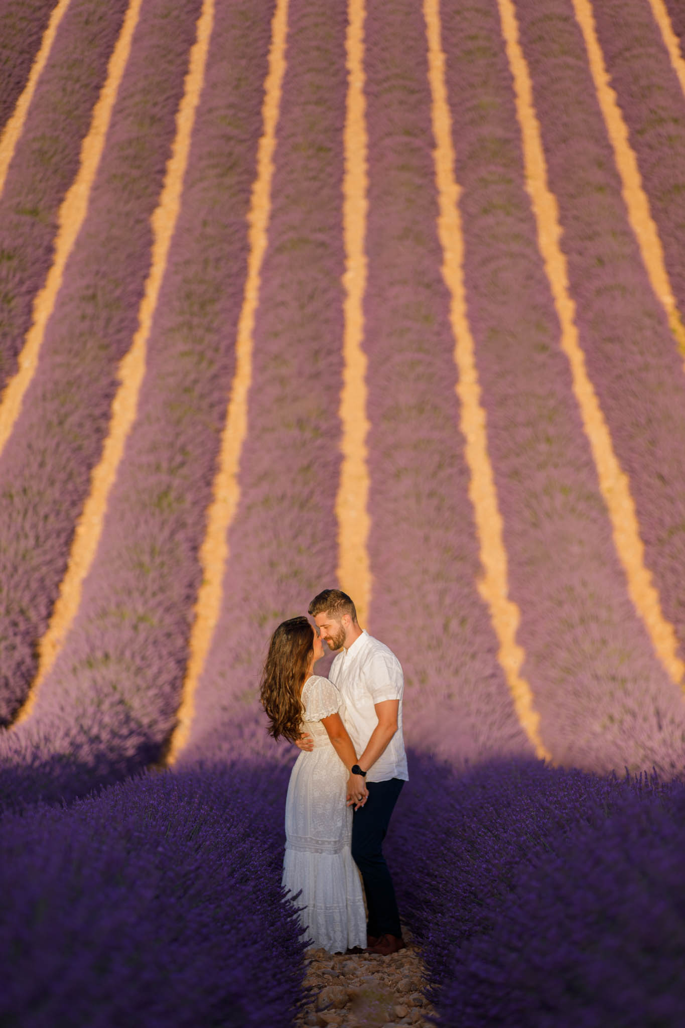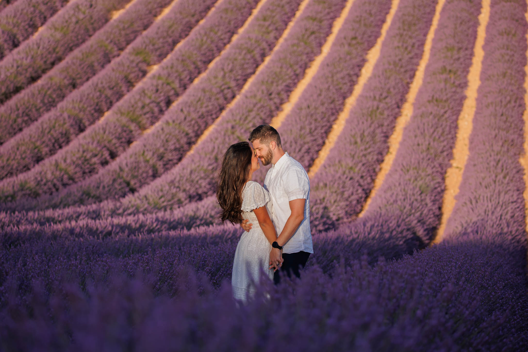 J and S were simply travelling through the region and wanted beautiful photos together. It was a relaxed and casual session, just the two of them enjoying the moment. They both wore white, which works perfectly in lavender fields. The white outfits stood out against the purple tones and kept the images looking fresh and timeless.