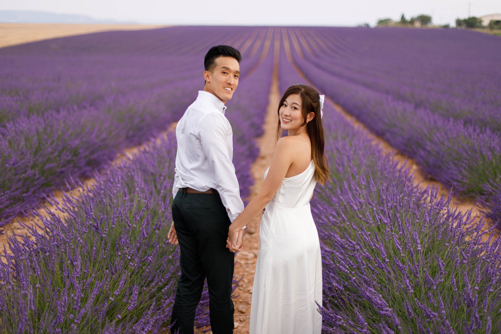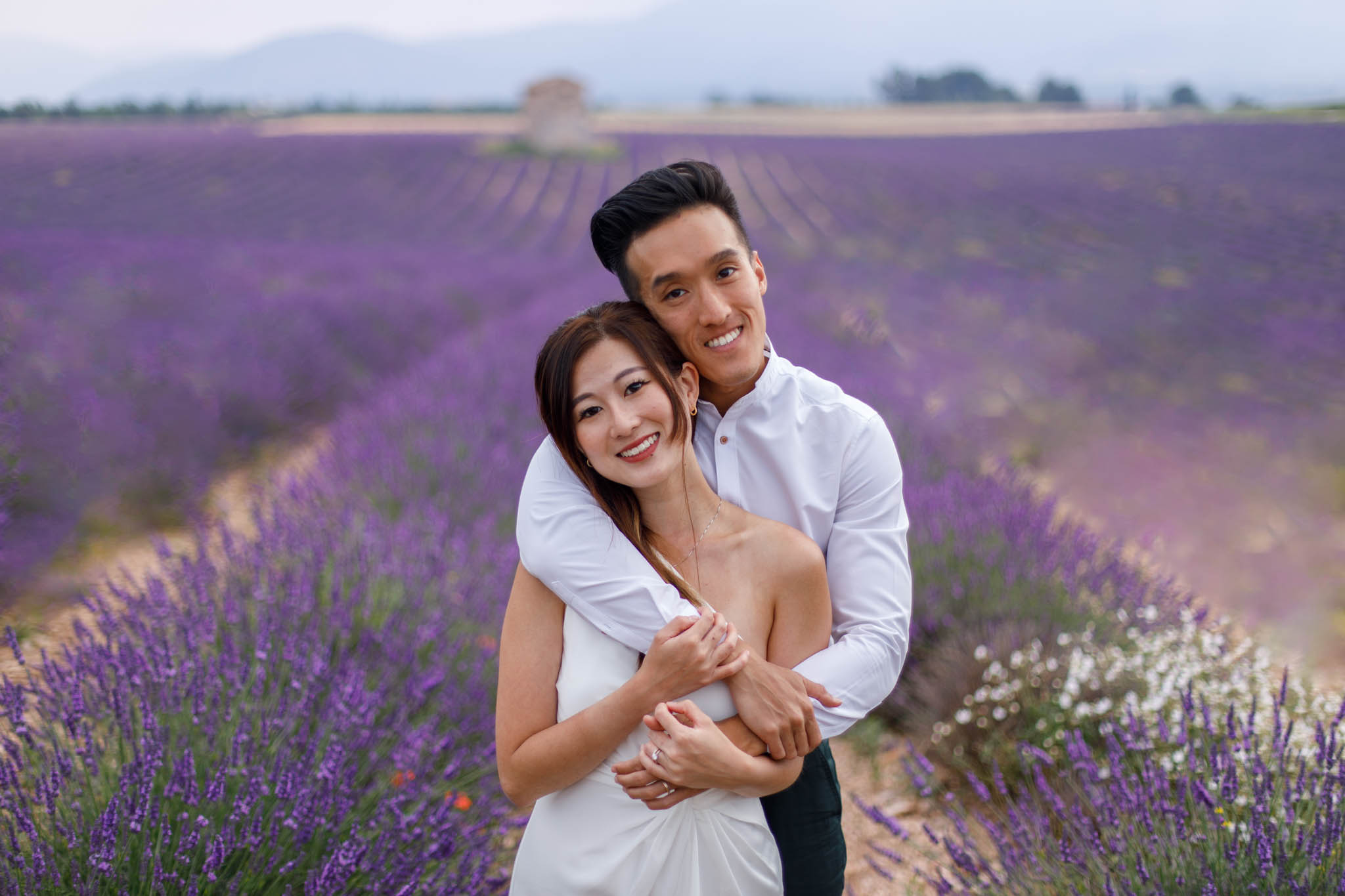 This session took place in early July, with I and D visiting from Singapore. They had recently gotten engaged and were travelling through Provence with some friends. They wanted a celebratory photo session during this trip. They chose a morning session from 07:30 to 09:00. The session lasted an hour and a half to allow time for photography in two separate fields.