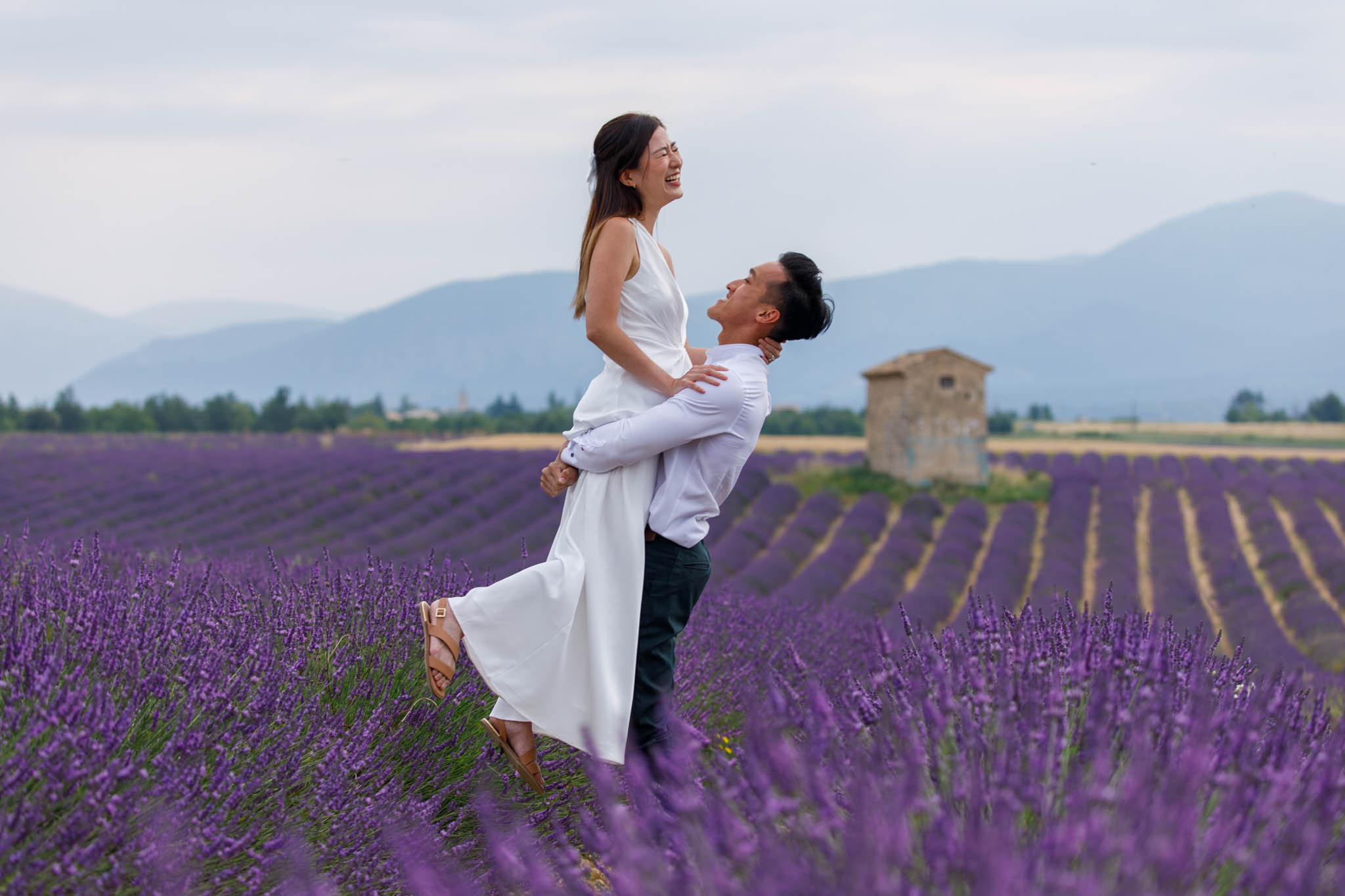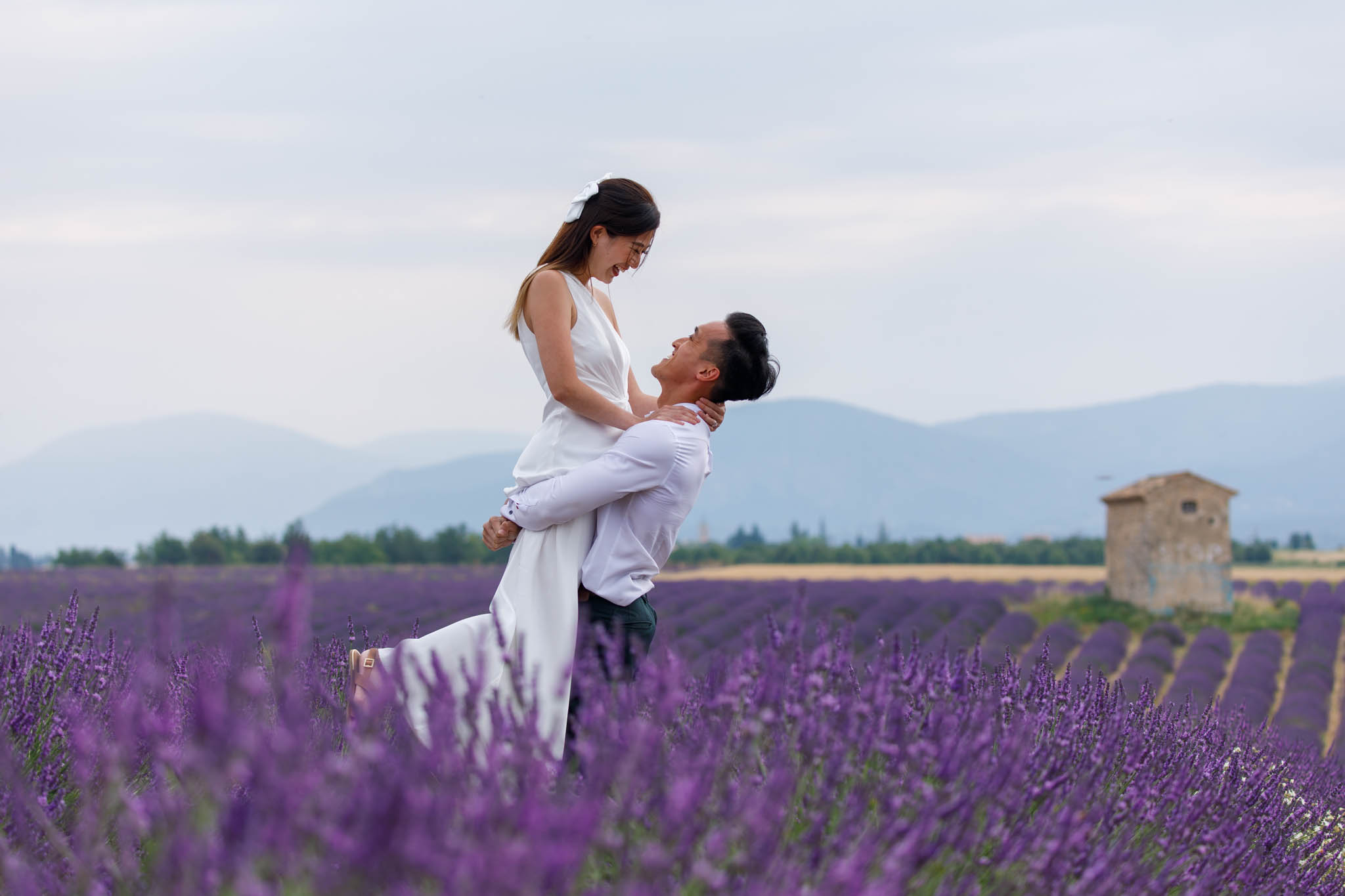 After around 30 minutes, we drove about 20 minutes to the second field in Puimoisson. This location is a little farther from Valensole but well worth the drive. The highlight of this field is a charming hut in the background, which adds a unique element to the photos and frames the couple beautifully.