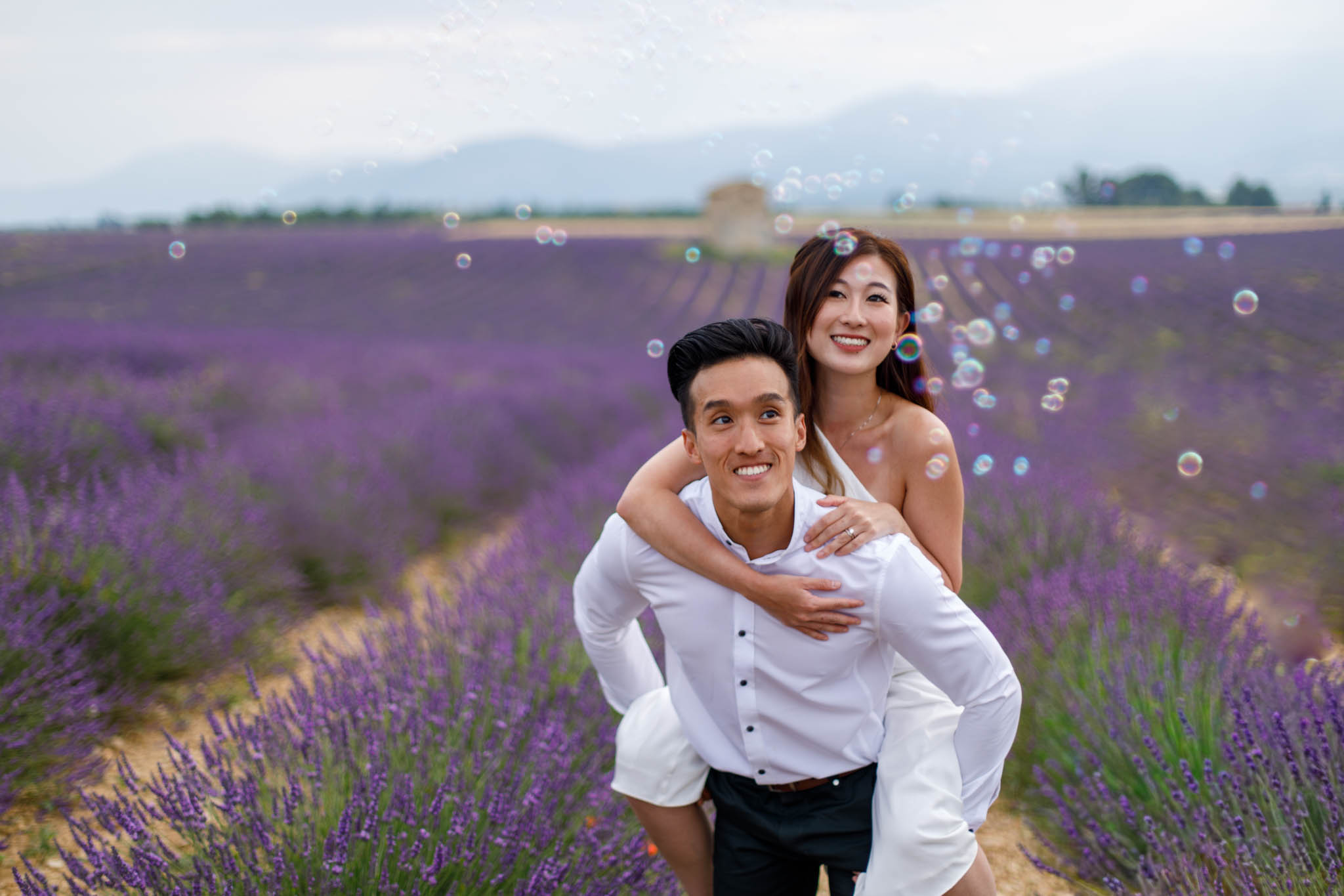 We captured a variety of shots: romantic portraits of the couple, candid moments of them interacting, and creative shots with the bubble machine. The first field’s cloudy lighting enhanced the purple hues of the lavender, while the second field in Puimoisson offered a contrasting backdrop with the hut and more structured rows of lavender.