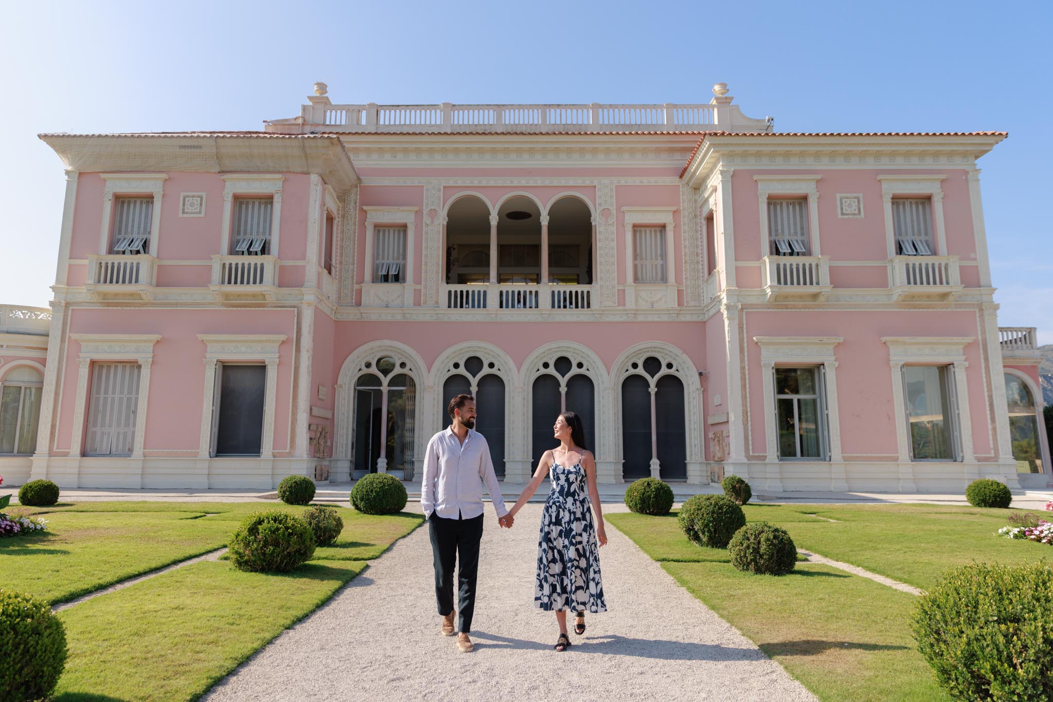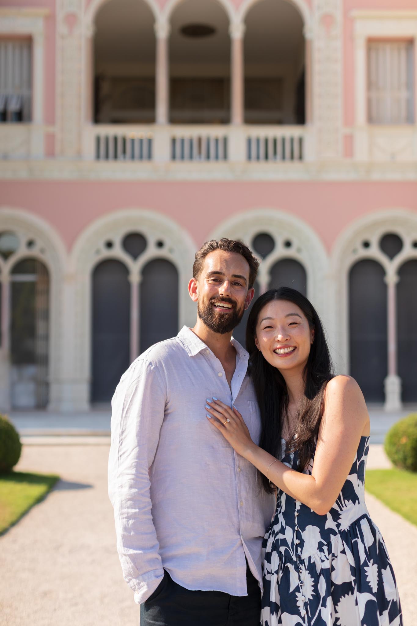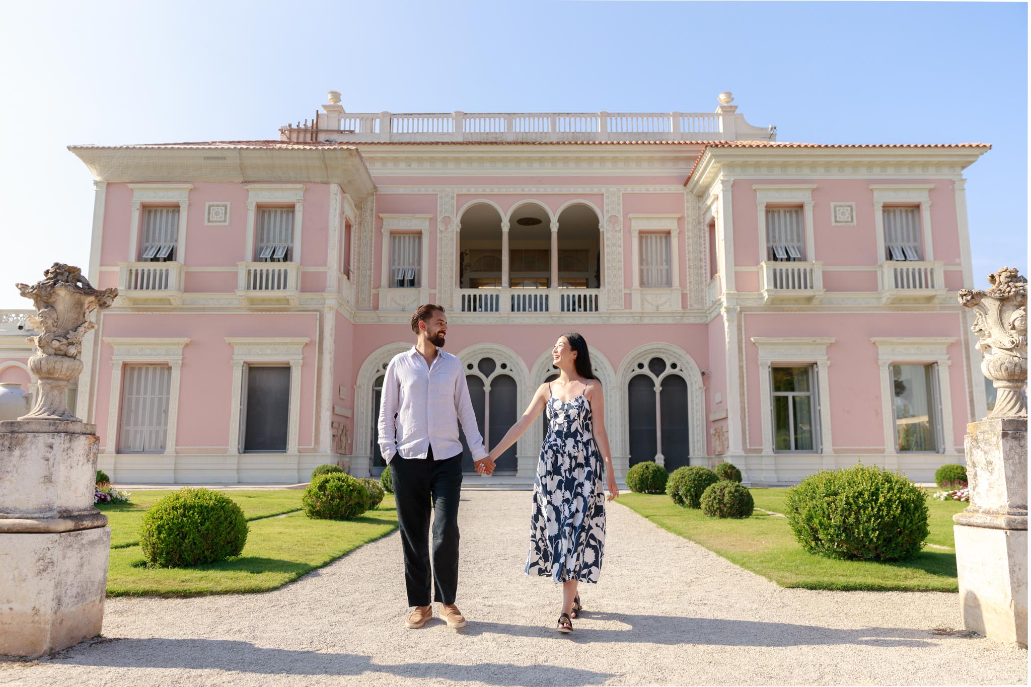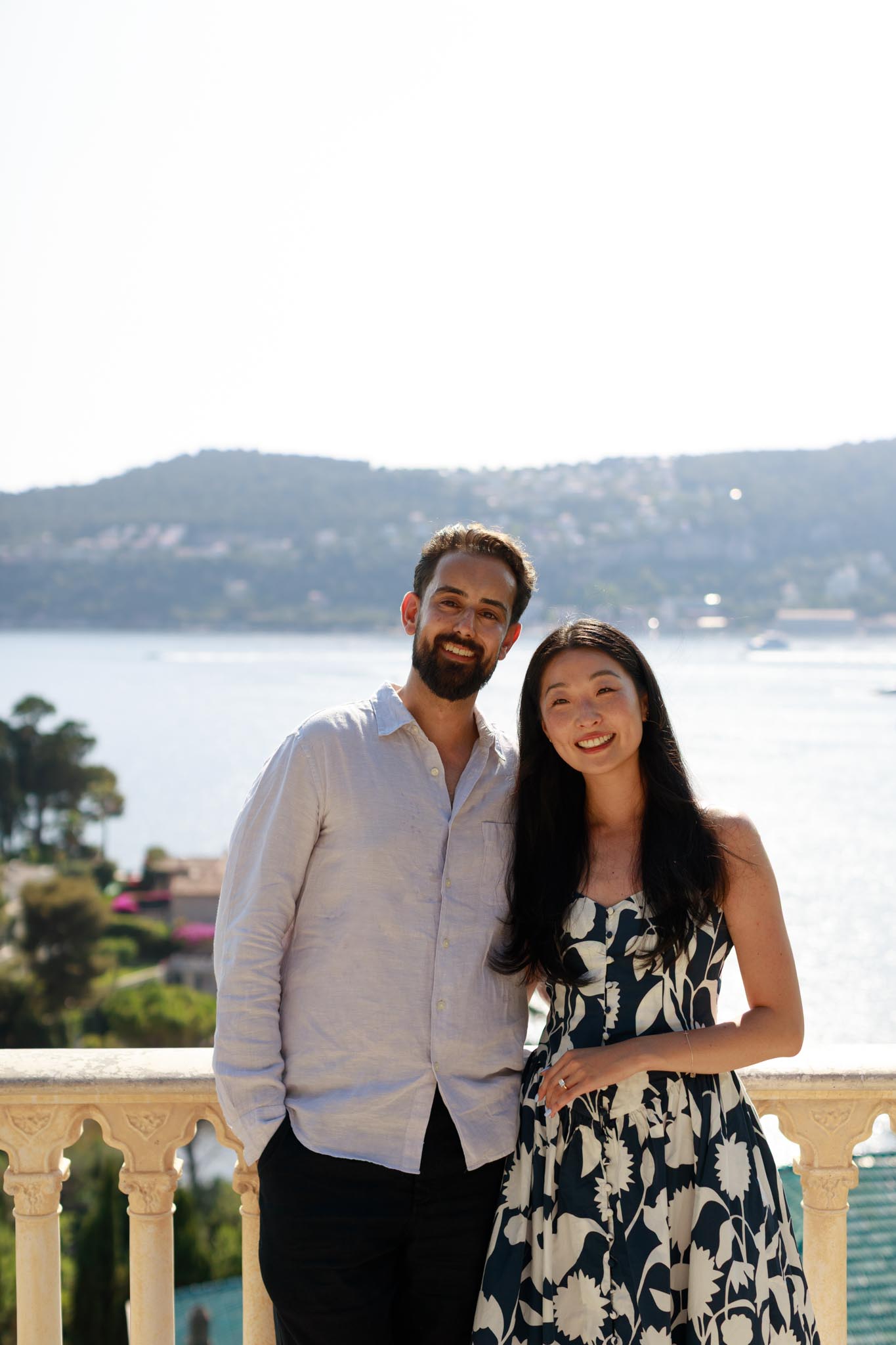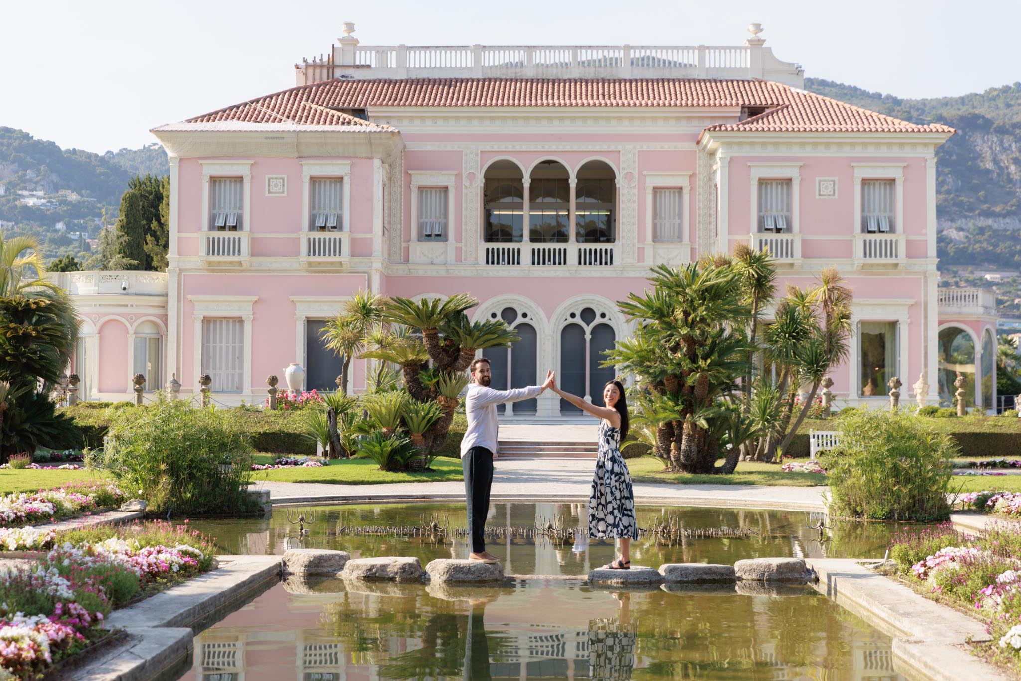 R planned a thoughtful and romantic proposal for S at the beautiful Villa Ephrussi de Rothschild in Saint‑Jean‑Cap‑Ferrat. This location is one of the most elegant settings on the French Riviera, known for its pastel pink façade, refined architecture, and themed gardens overlooking the Mediterranean Sea.
