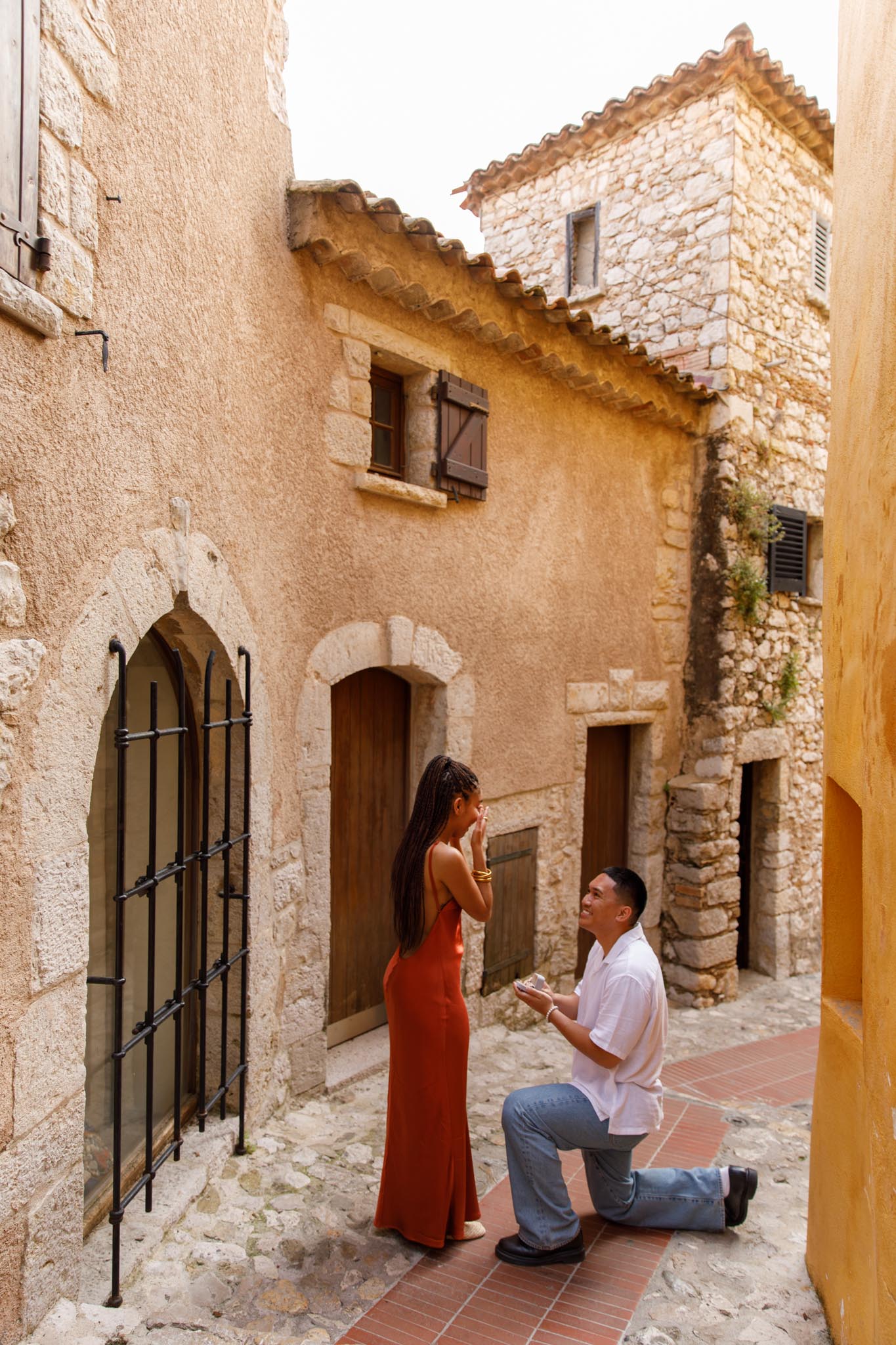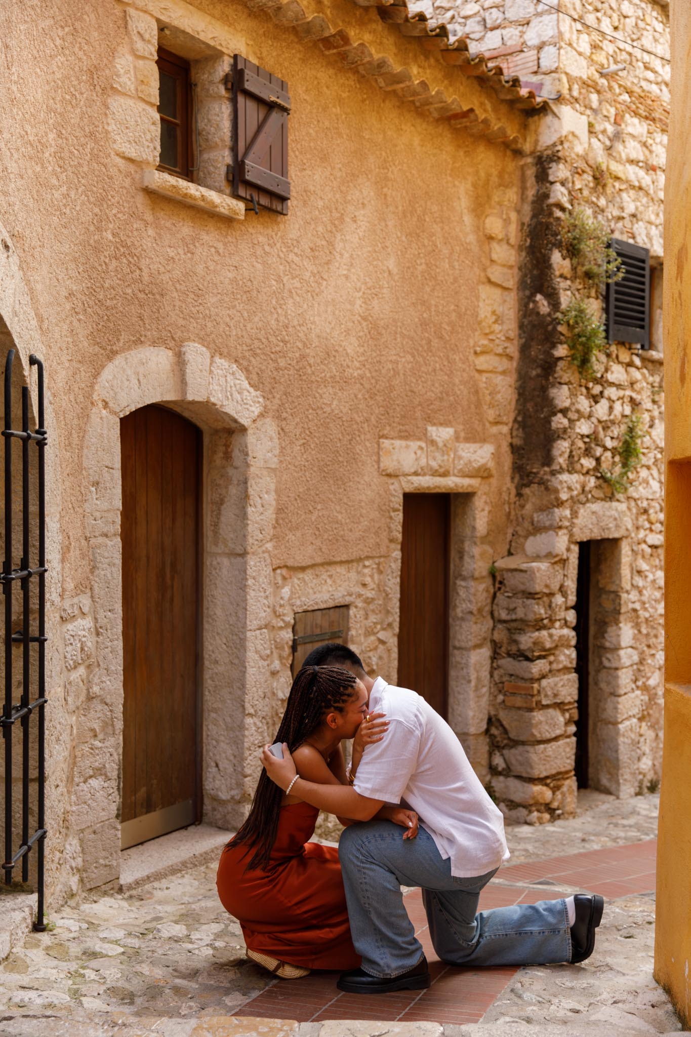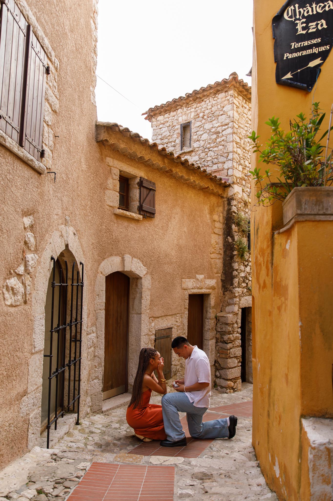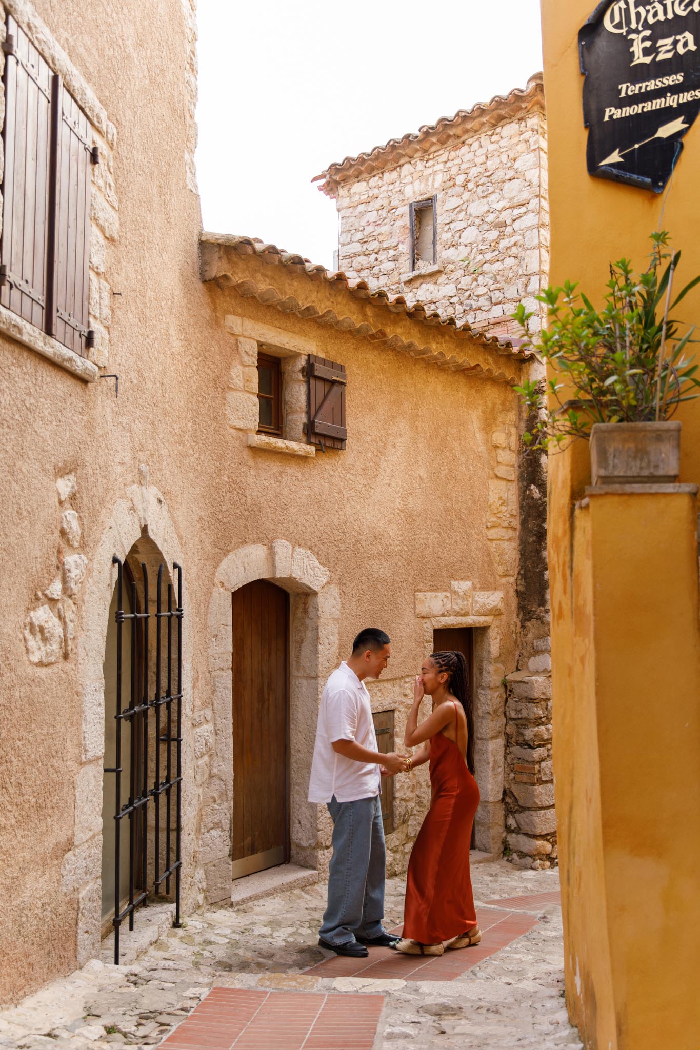 In early June, B planned a short and intimate proposal for his partner, S, in one of our “We Capture Your Proposal” sessions. B chose a charming alleyway in Èze, filled with classic French Riviera character. The yellow walls of the buildings, the narrow streets, and the warm Mediterranean charm made it a perfect backdrop.