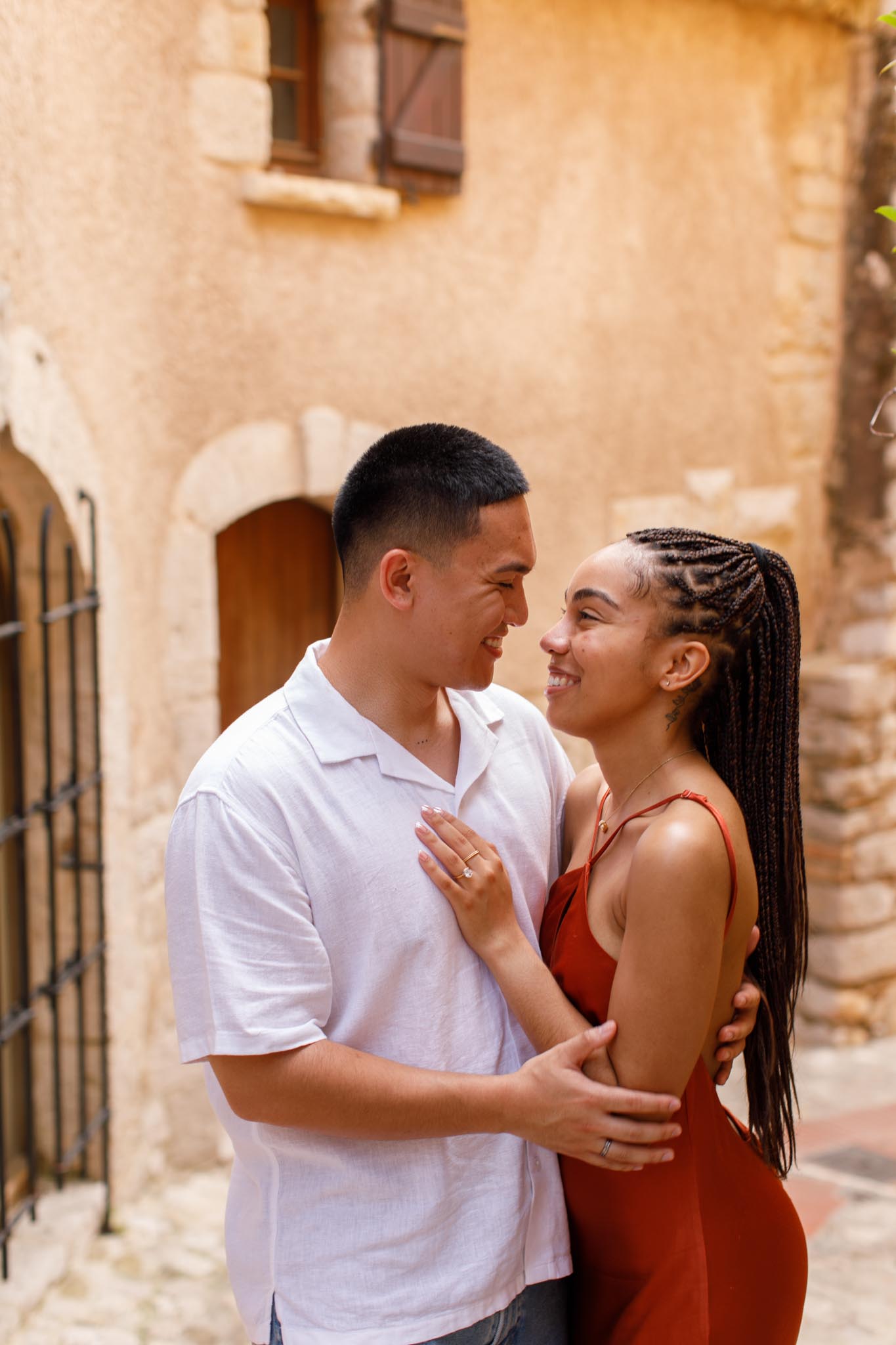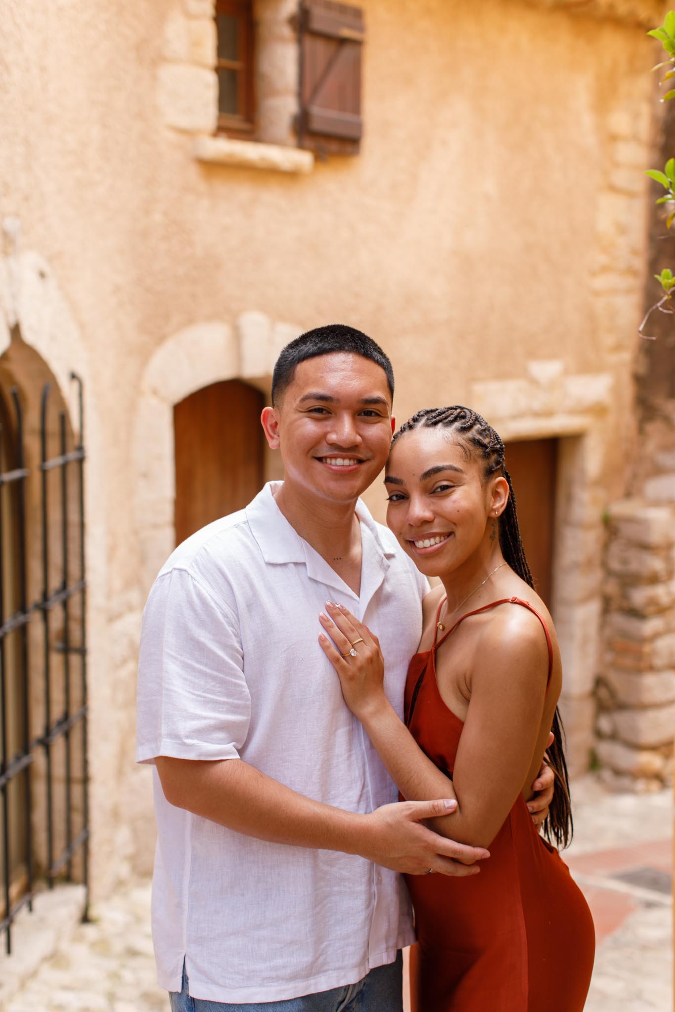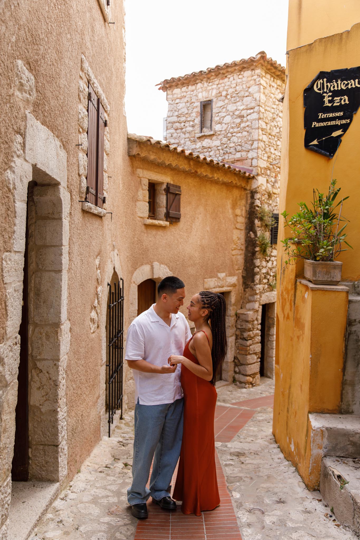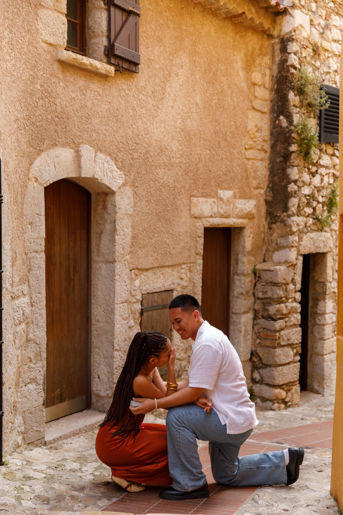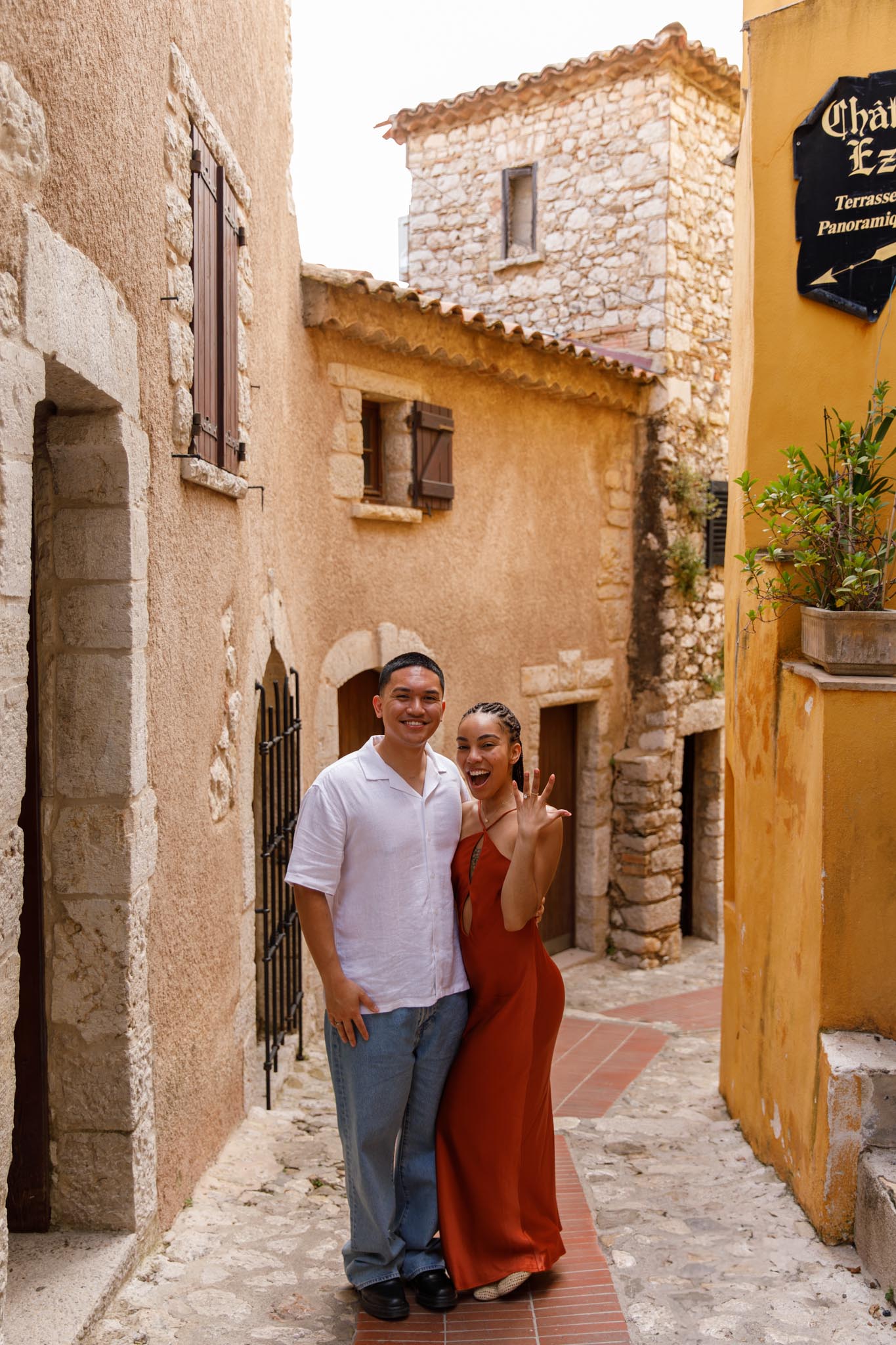 In early June, B planned a short and intimate proposal for his partner, S, in one of our “We Capture Your Proposal” sessions. B chose a charming alleyway in Èze, filled with classic French Riviera character. The yellow walls of the buildings, the narrow streets, and the warm Mediterranean charm made it a perfect backdrop.