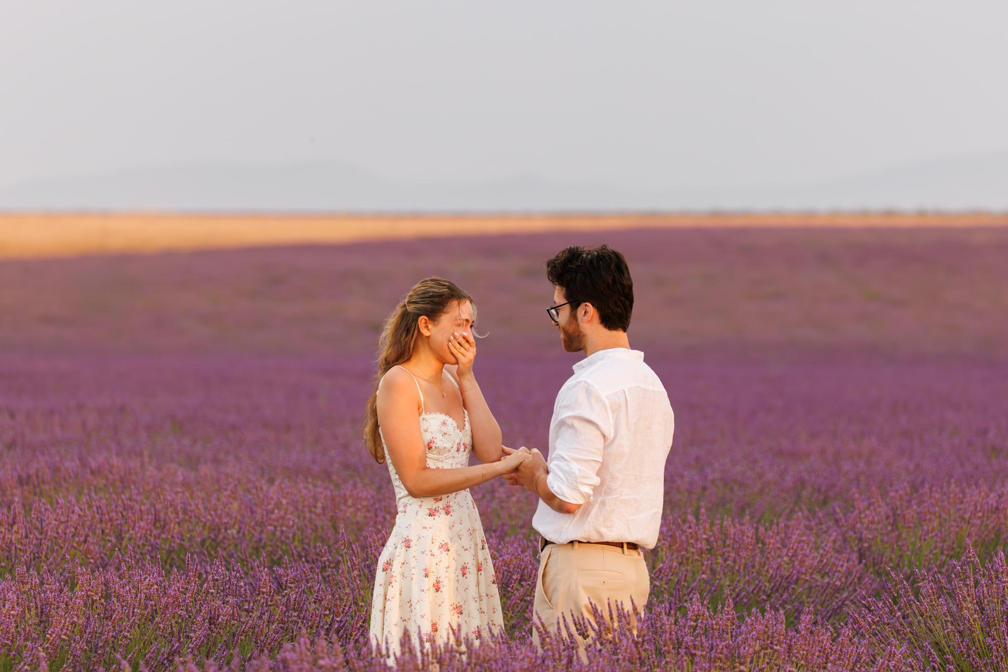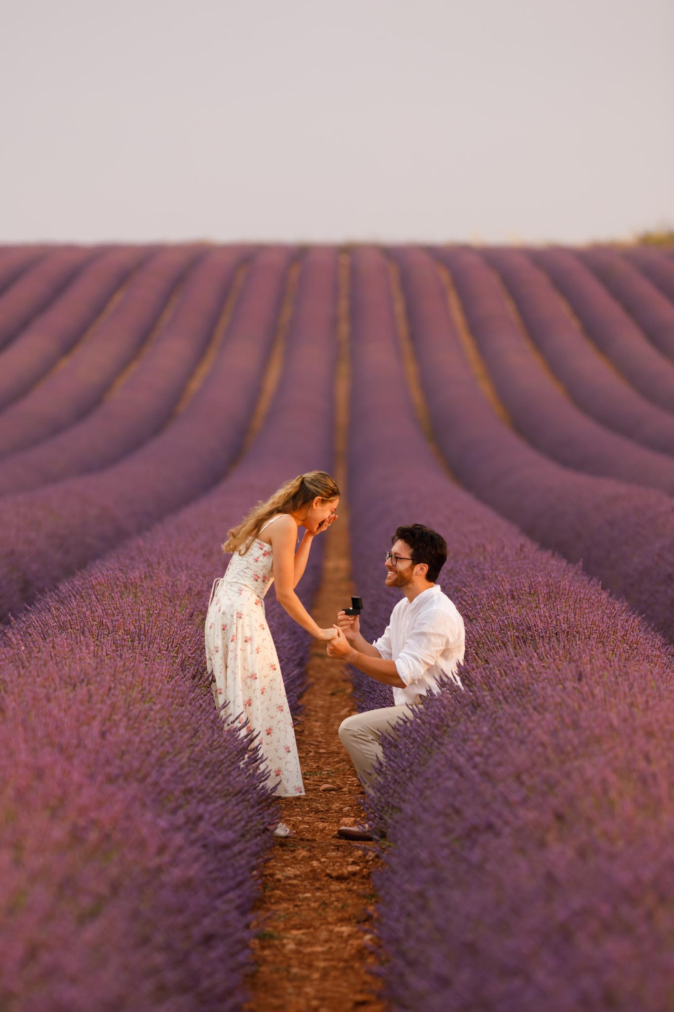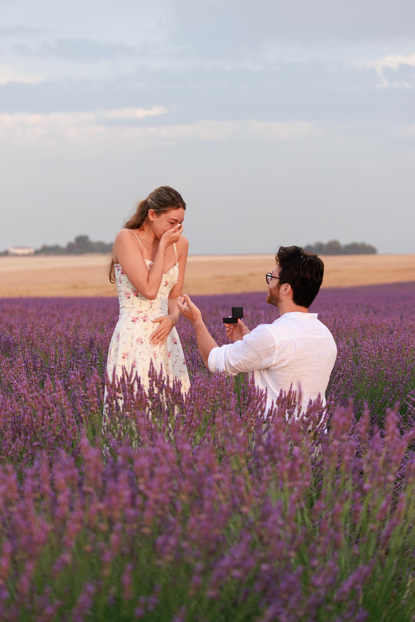 M had carefully prepared the surprise. D had always imagined a proposal in the lavender fields, so he playfully convinced her it would not happen there, making the real moment completely unexpected. When he finally proposed, her reaction was pure shock and joy, creating one of those genuine, emotional moments that feels timeless in photographs.