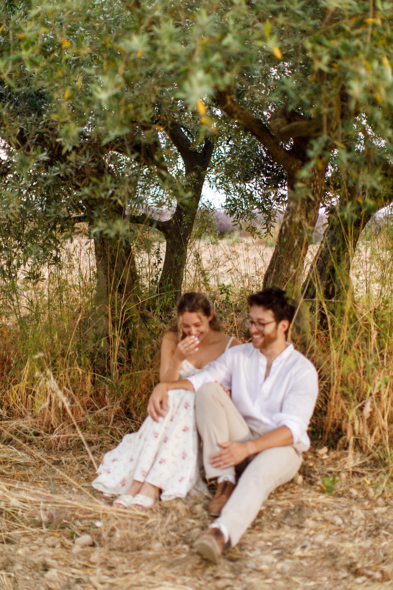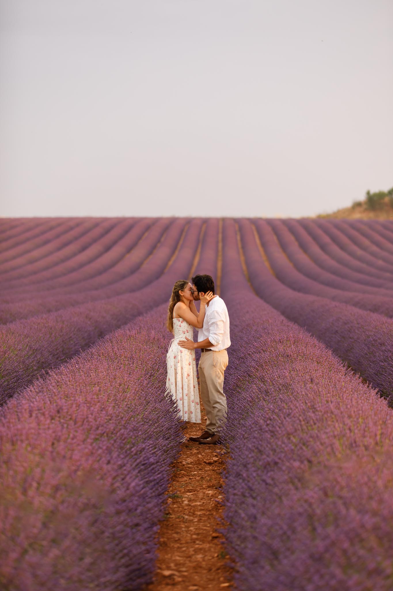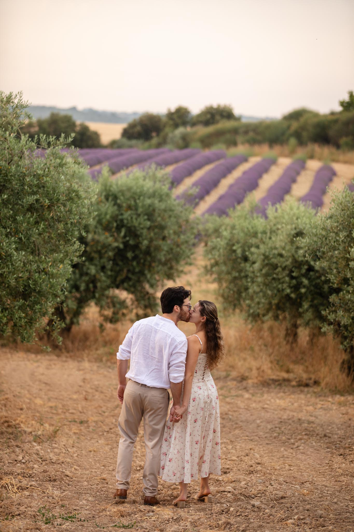 Afterwards, we spent time walking through nearby fields, photographing them among the rows of lavender and in a second location where the landscape curves softly with olive trees in the distance. The peaceful surroundings and early summer bloom made every scene feel romantic and serene.