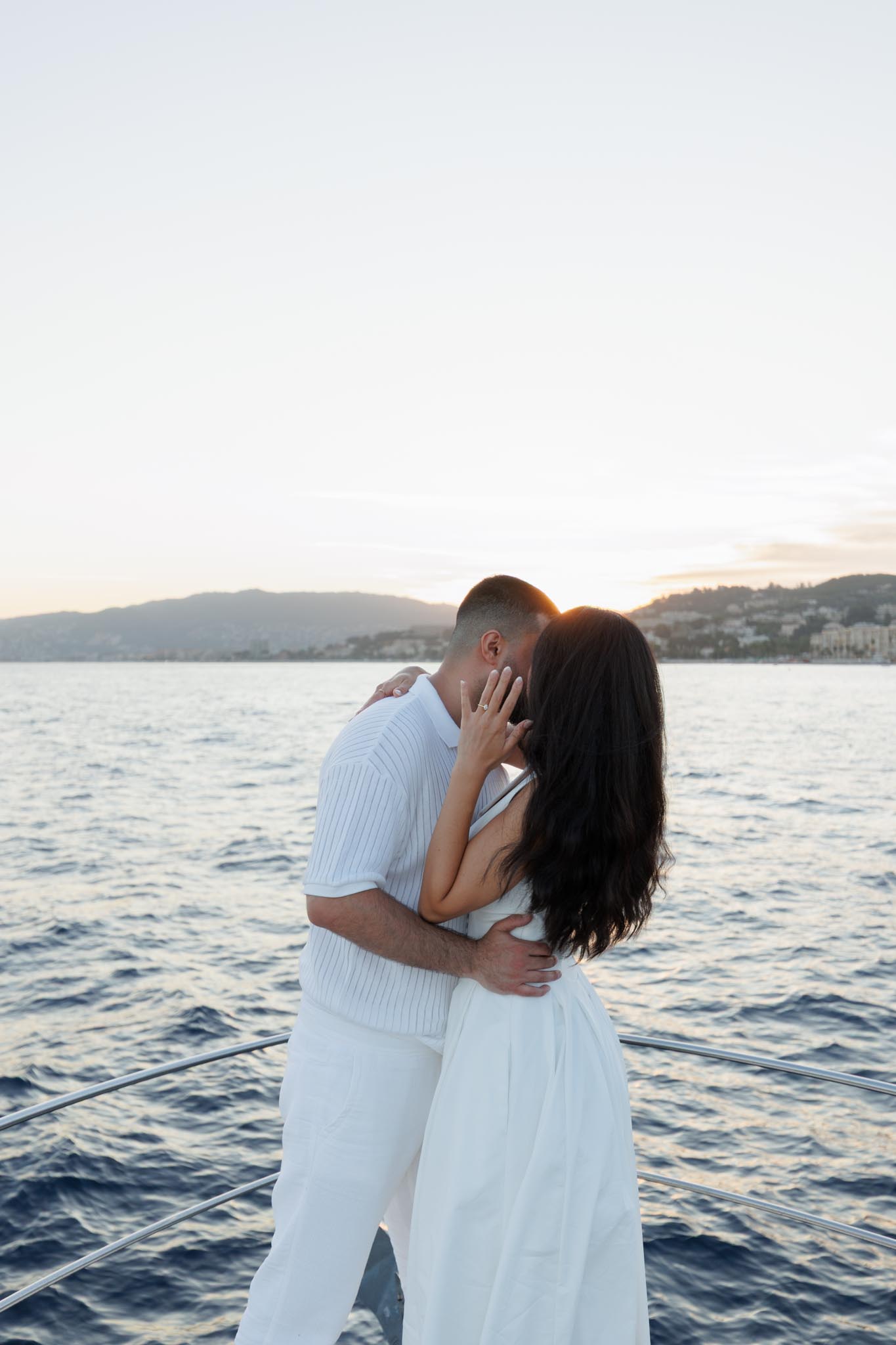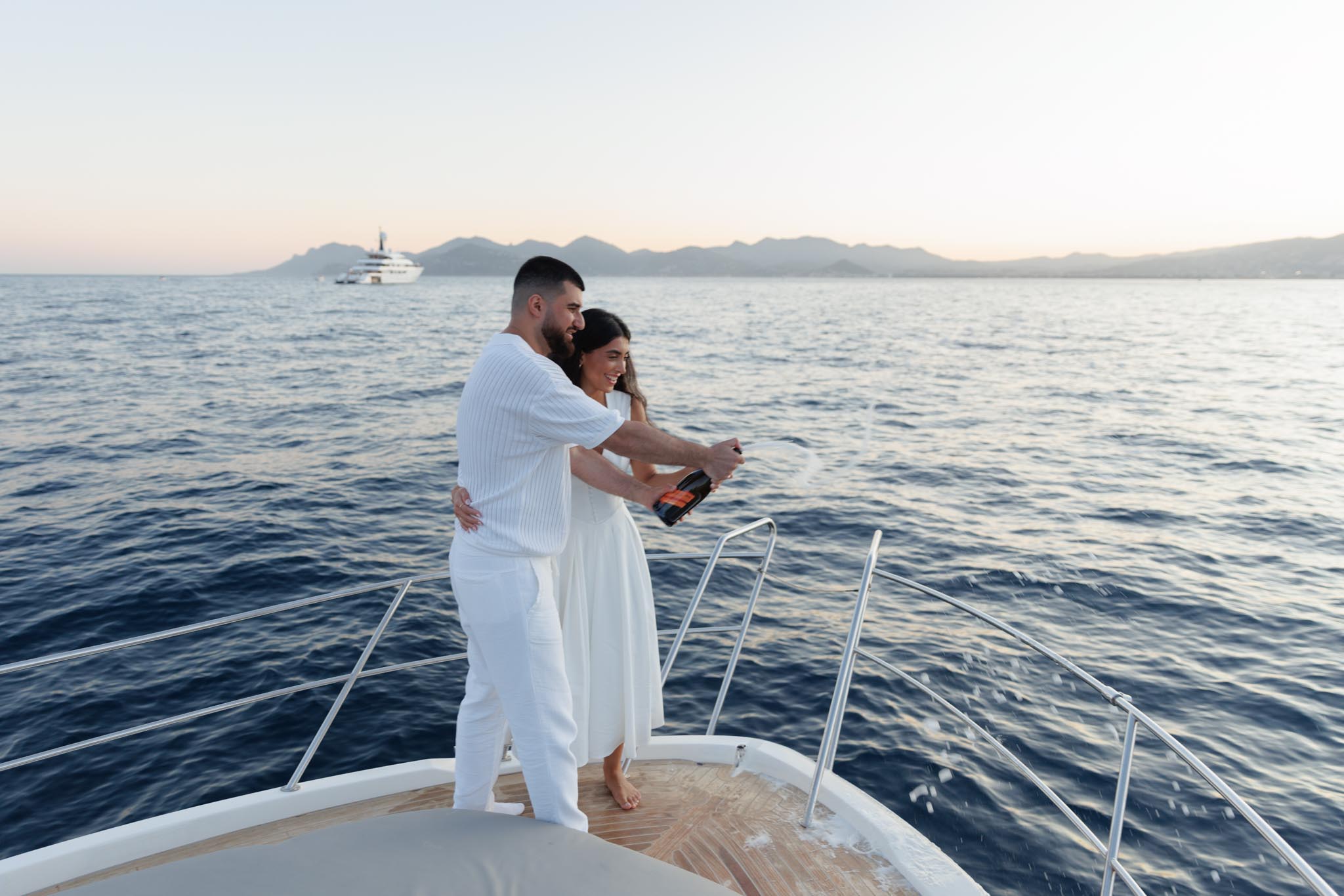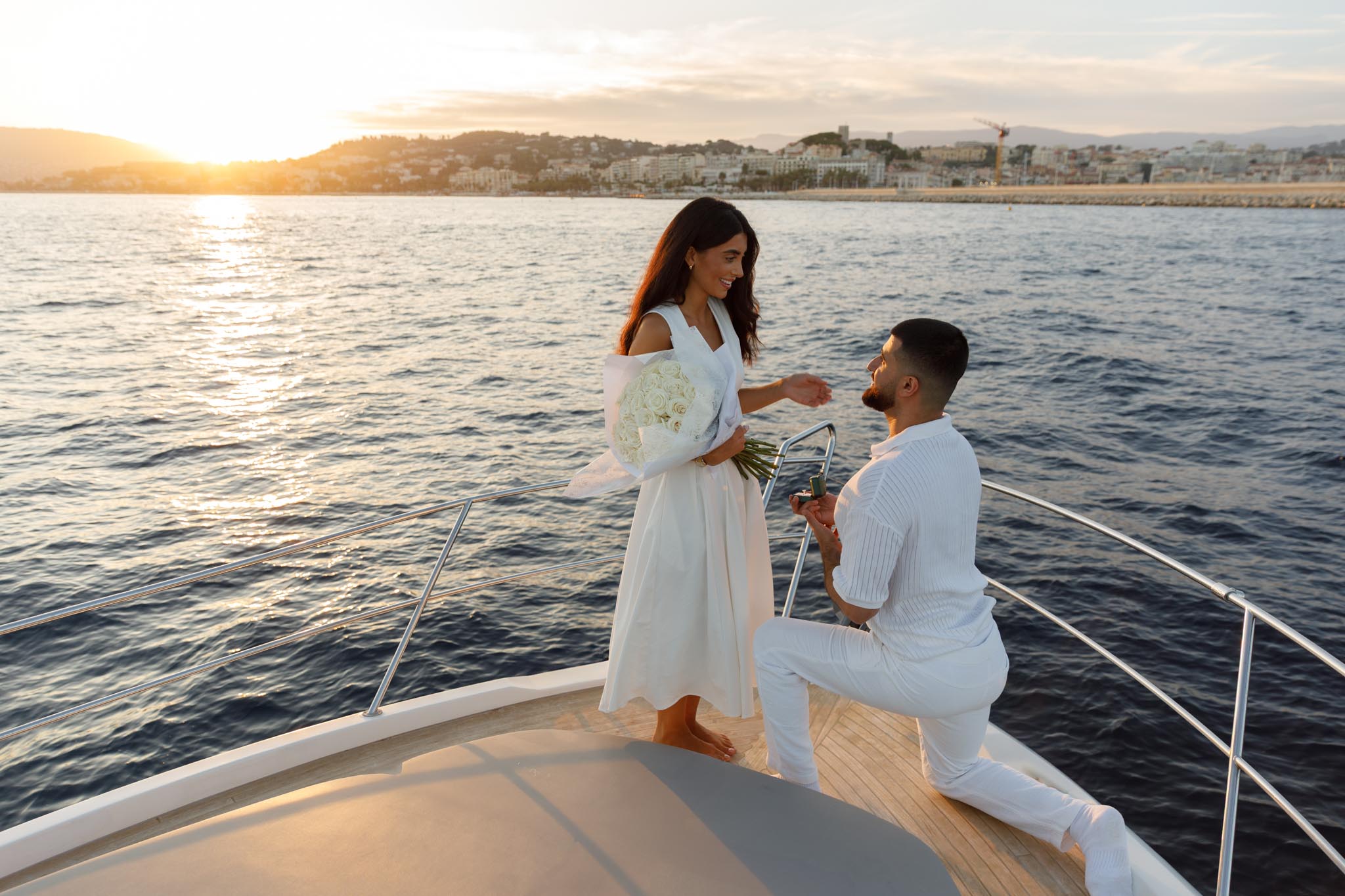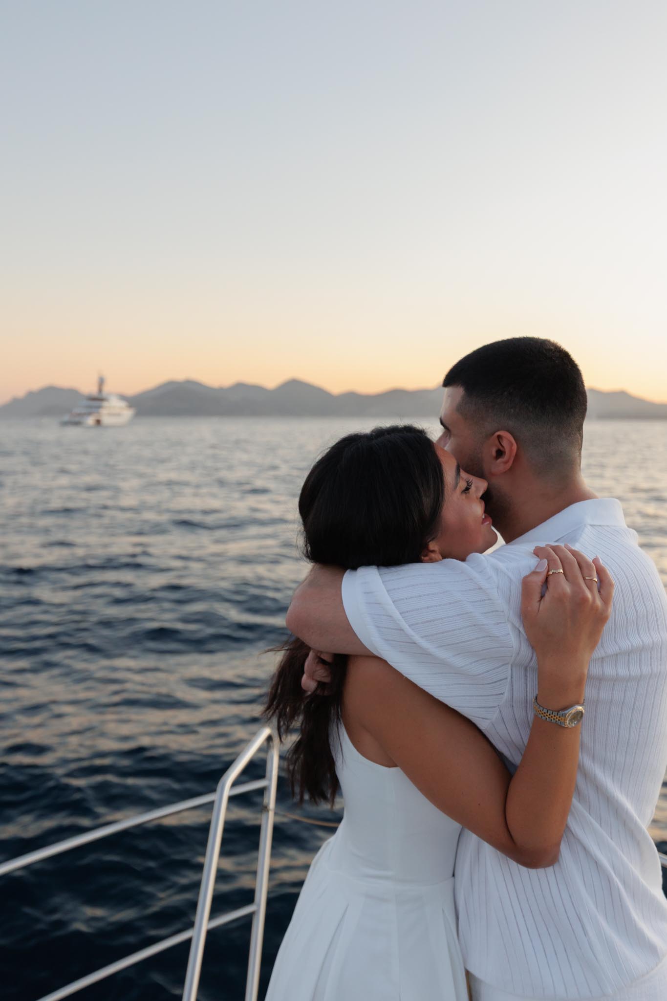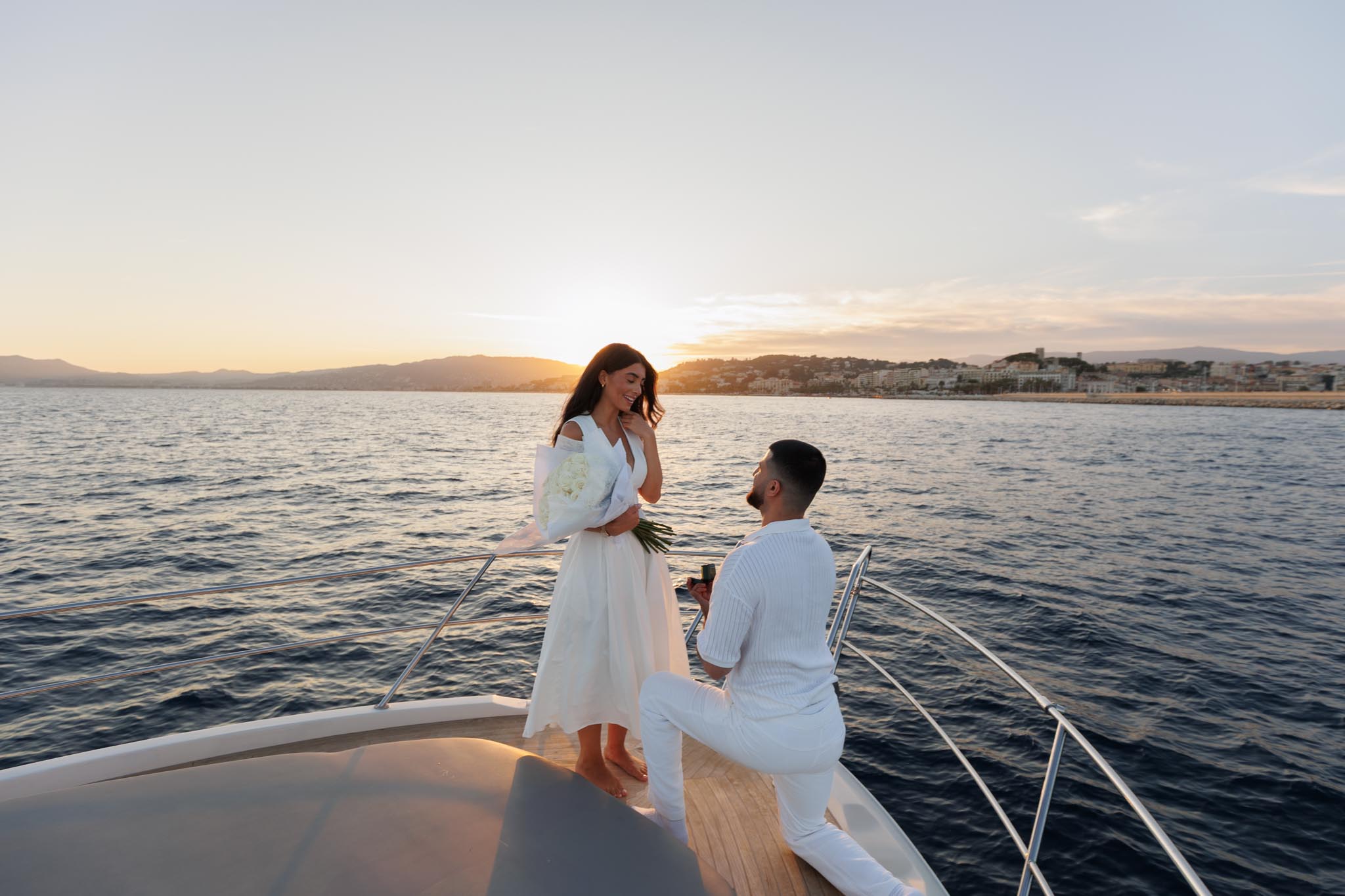 R and C decided to rent a private boat for the proposal and planned the timing carefully. We departed in the early evening and headed into the harbour just before sunset. The proposal itself took place as the sun was going down, with the coastline of Cannes visible in the background. Being on the water provided open views of the city, the surrounding hills, and the changing light as day transitioned into night.