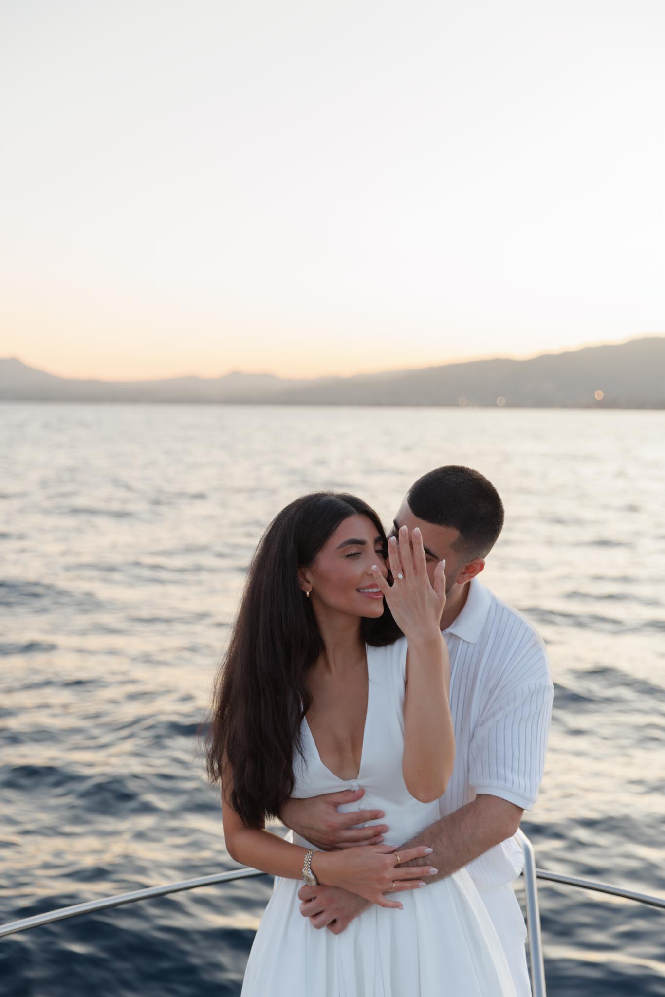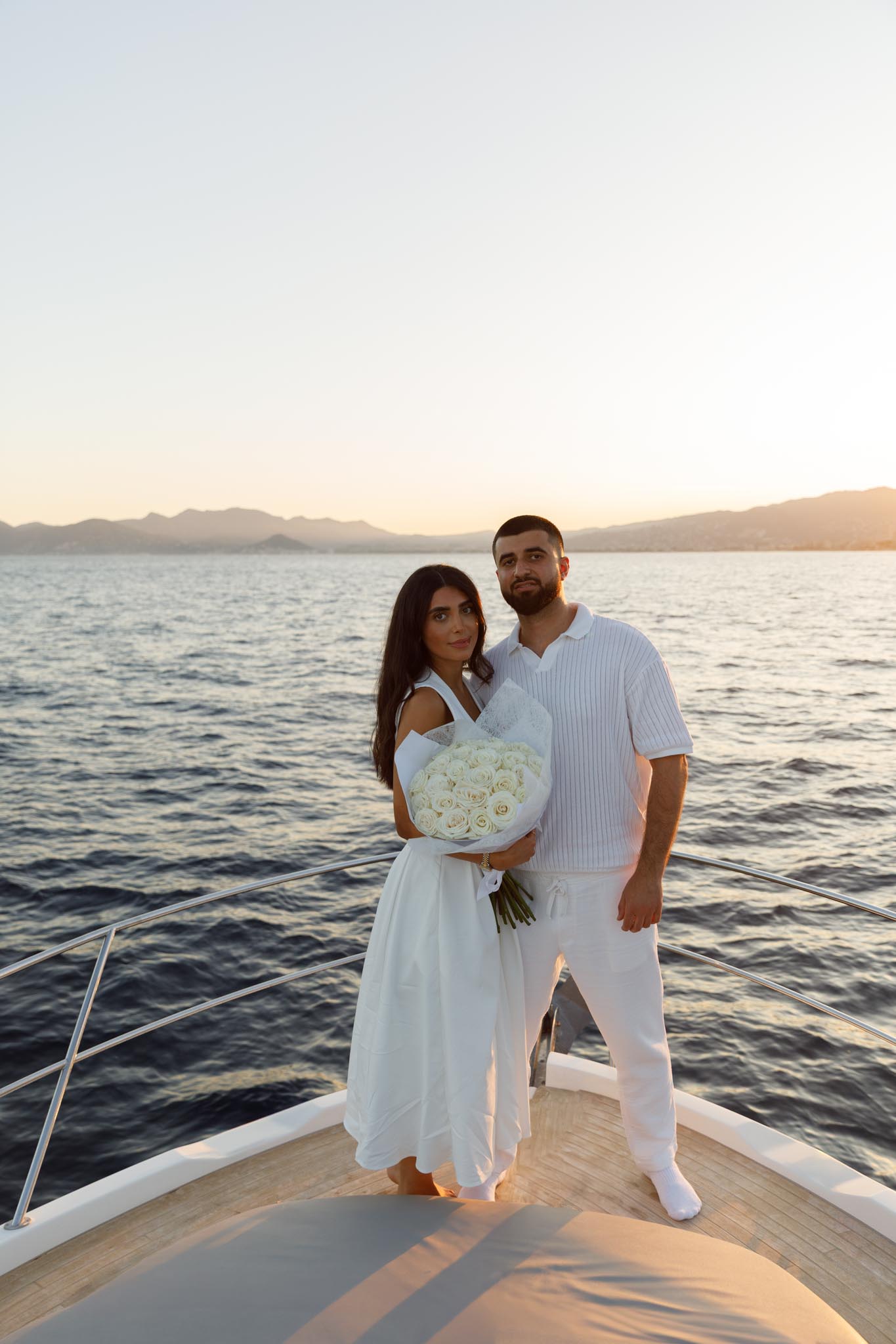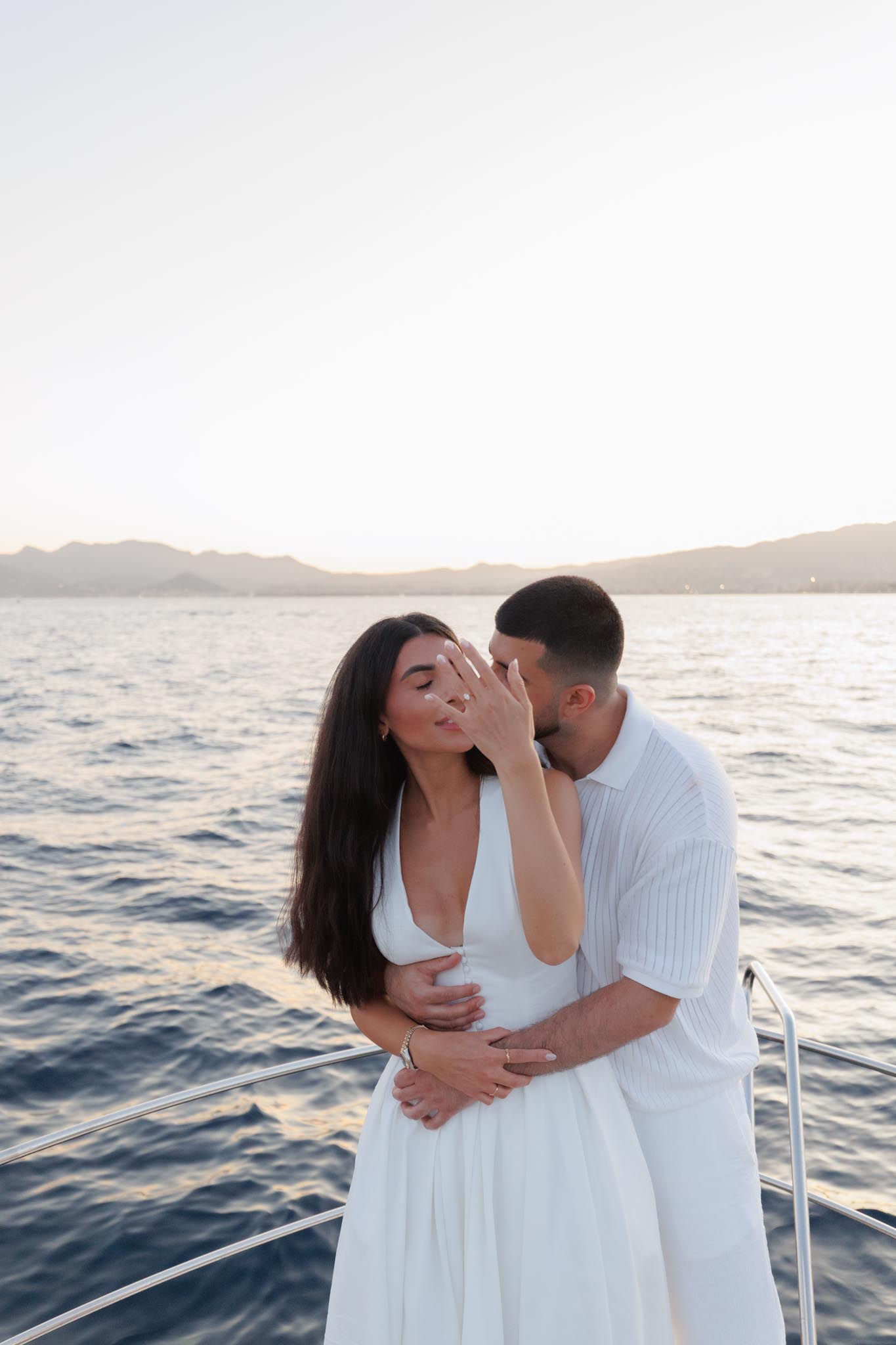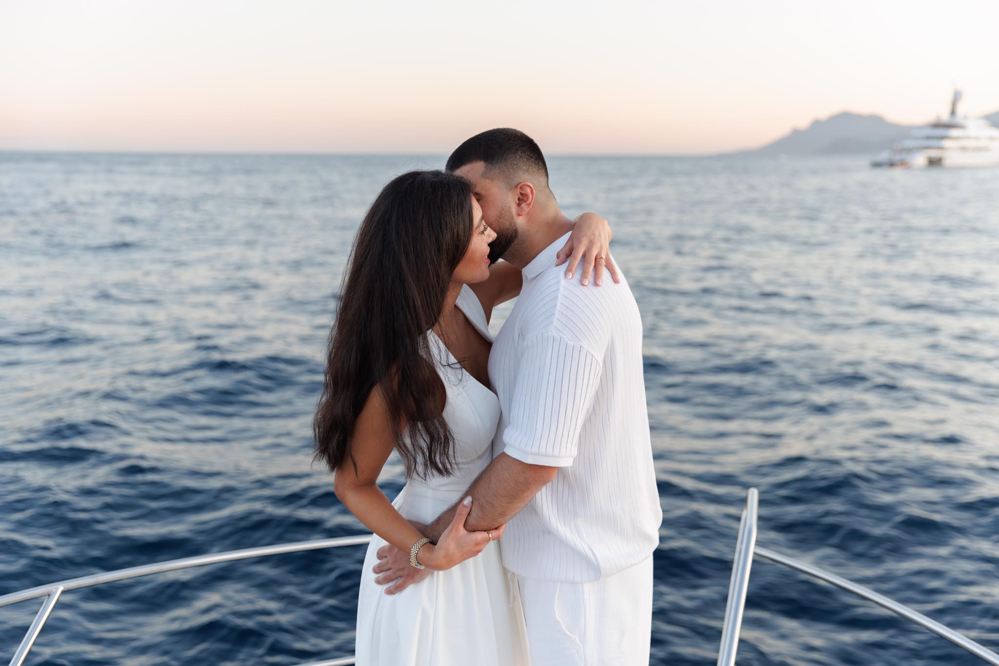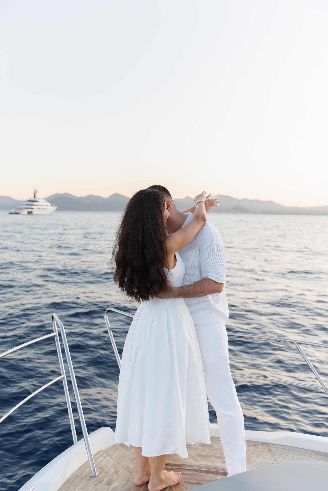 R and C decided to rent a private boat for the proposal and planned the timing carefully. We departed in the early evening and headed into the harbour just before sunset. The proposal itself took place as the sun was going down, with the coastline of Cannes visible in the background. Being on the water provided open views of the city, the surrounding hills, and the changing light as day transitioned into night.