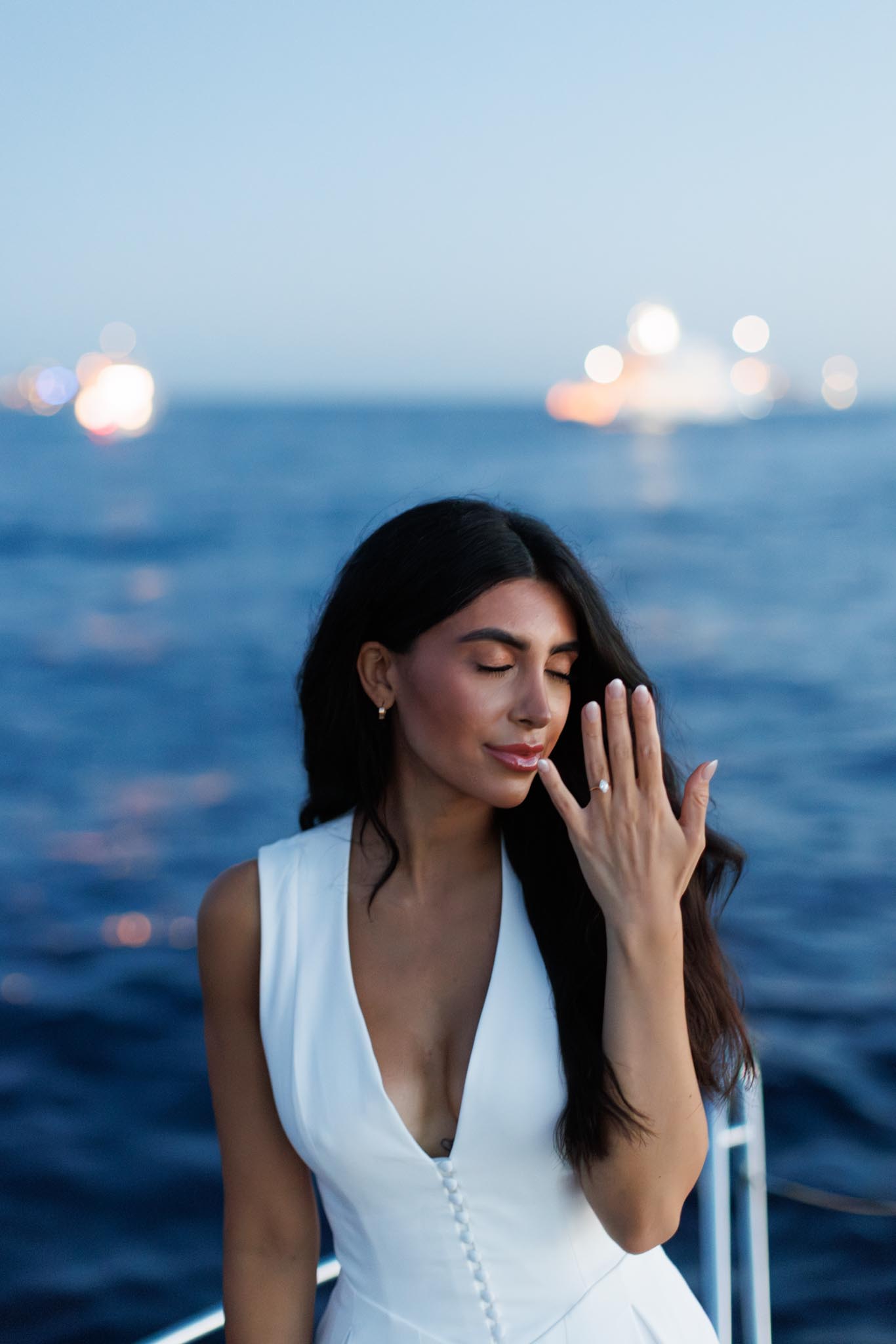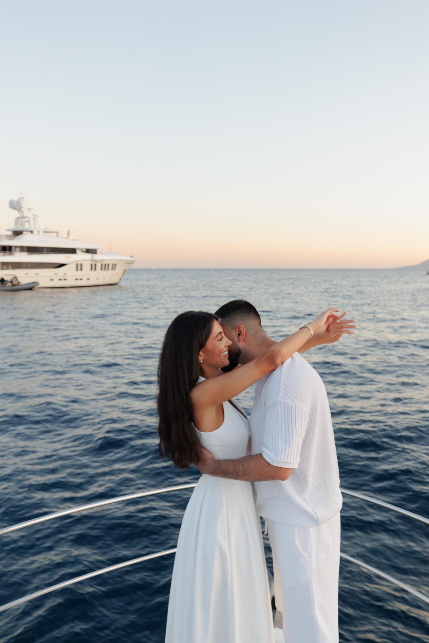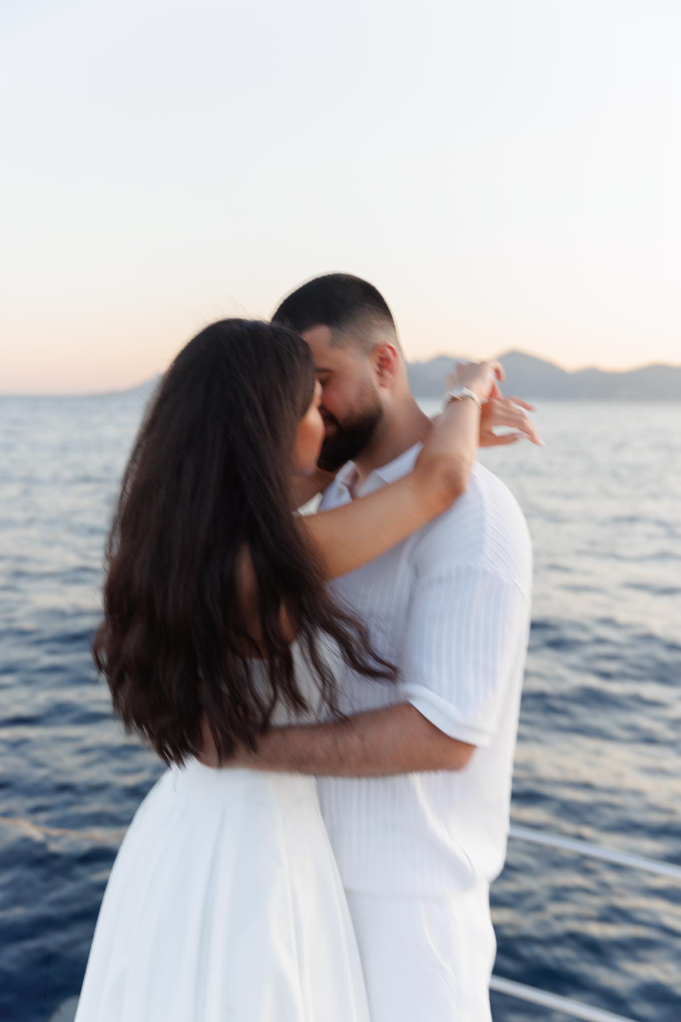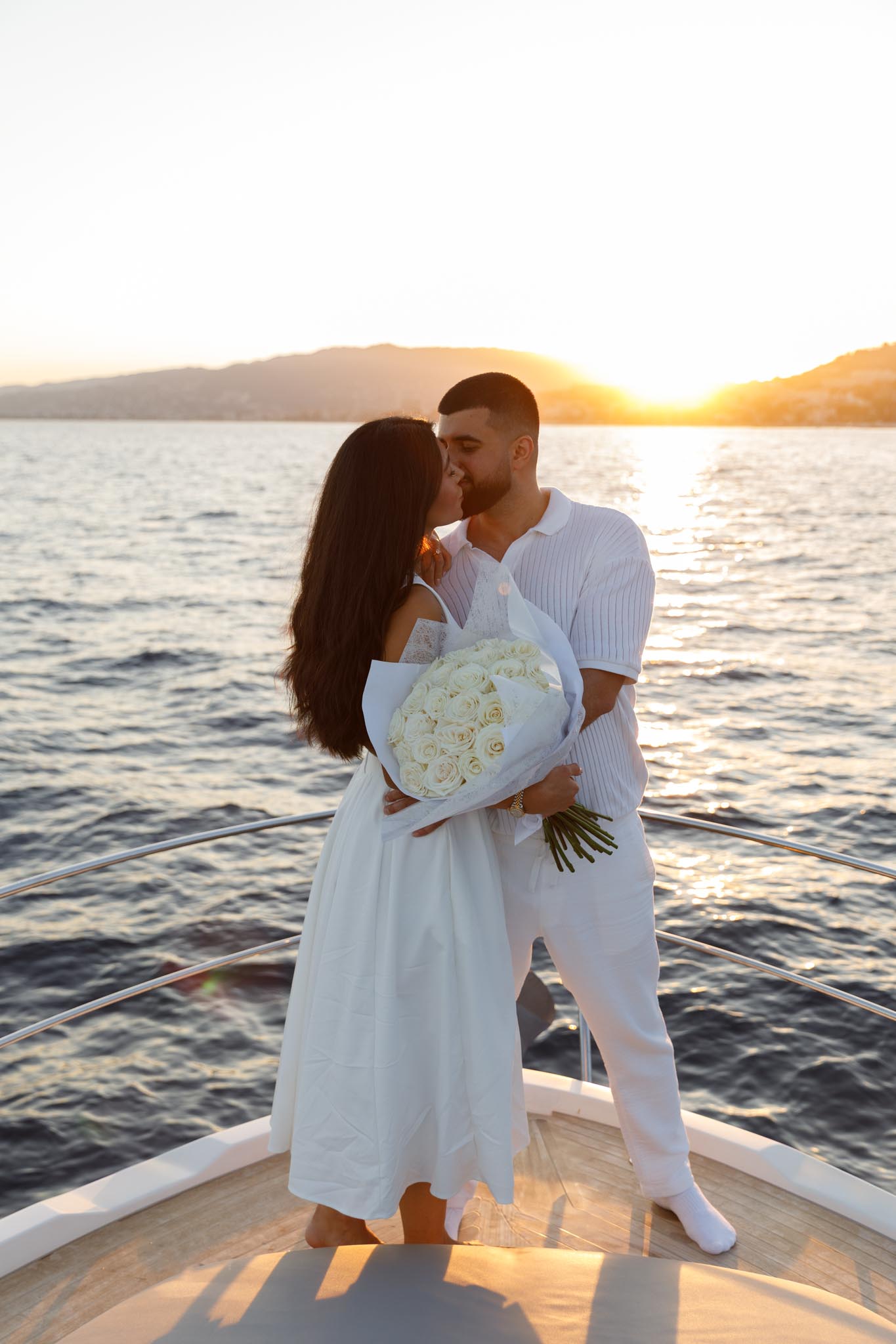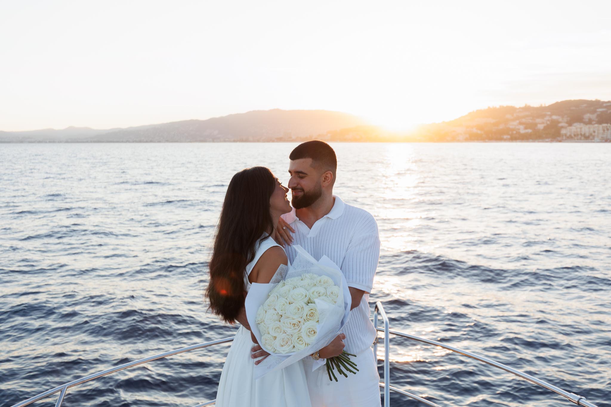 R and C decided to rent a private boat for the proposal and planned the timing carefully. We departed in the early evening and headed into the harbour just before sunset. The proposal itself took place as the sun was going down, with the coastline of Cannes visible in the background. Being on the water provided open views of the city, the surrounding hills, and the changing light as day transitioned into night.