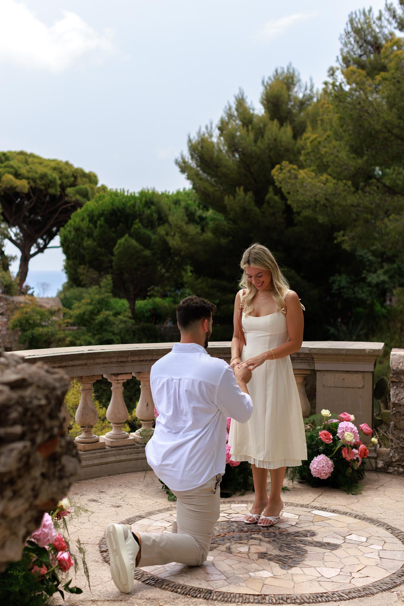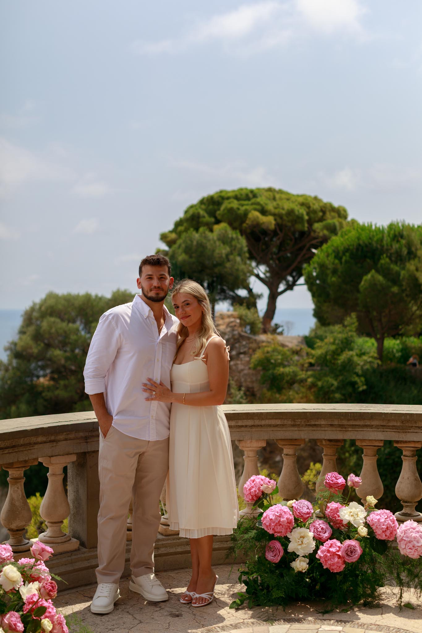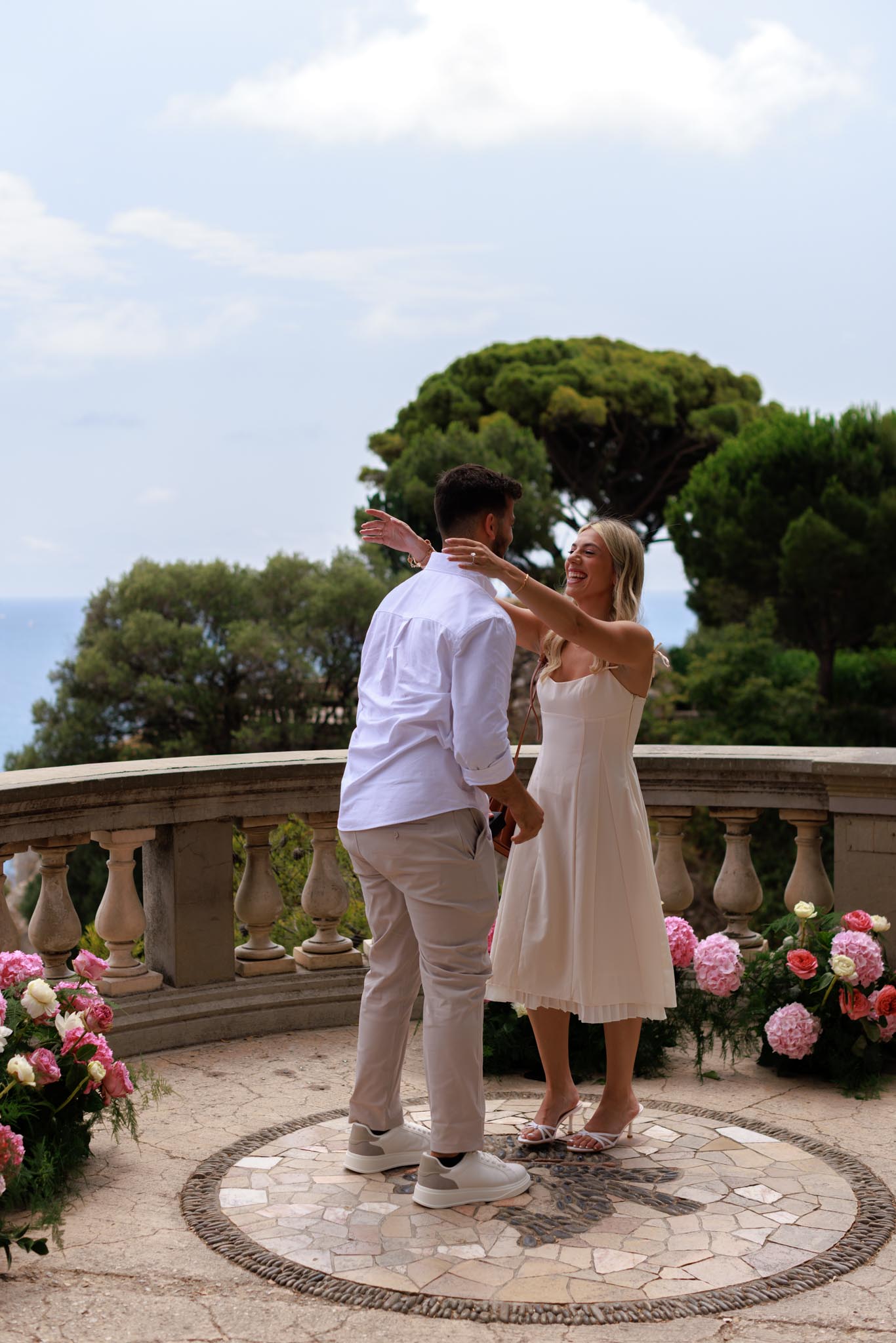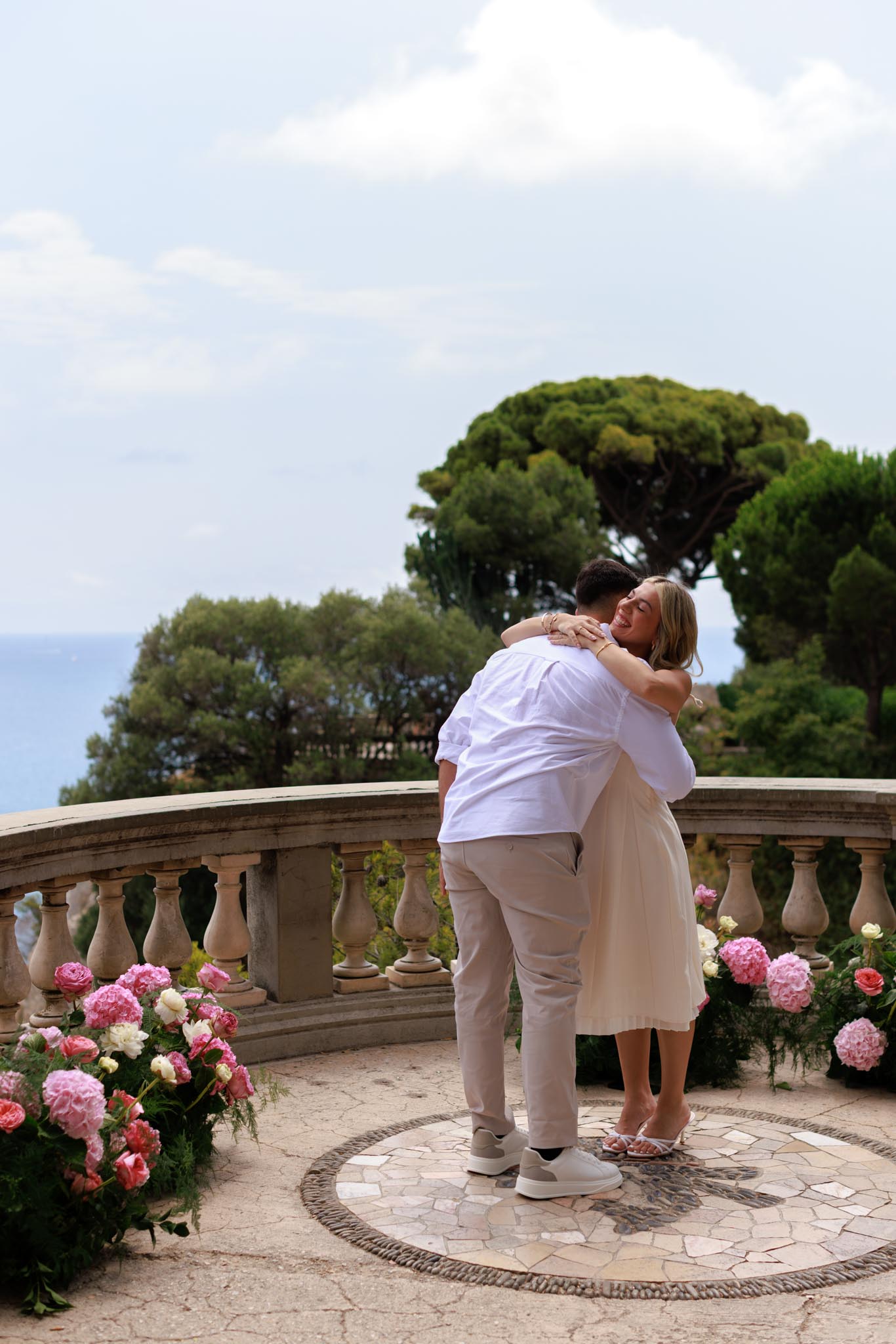 A wanted to propose to M with a very lush, elegant floral arrangement with large hydrangeas and peonies in shades of pink and white. The flowers added vibrancy without distracting from the natural French Riviera backdrop. The decorations were striking, and the entire setup elevated the proposal without taking away from the view.