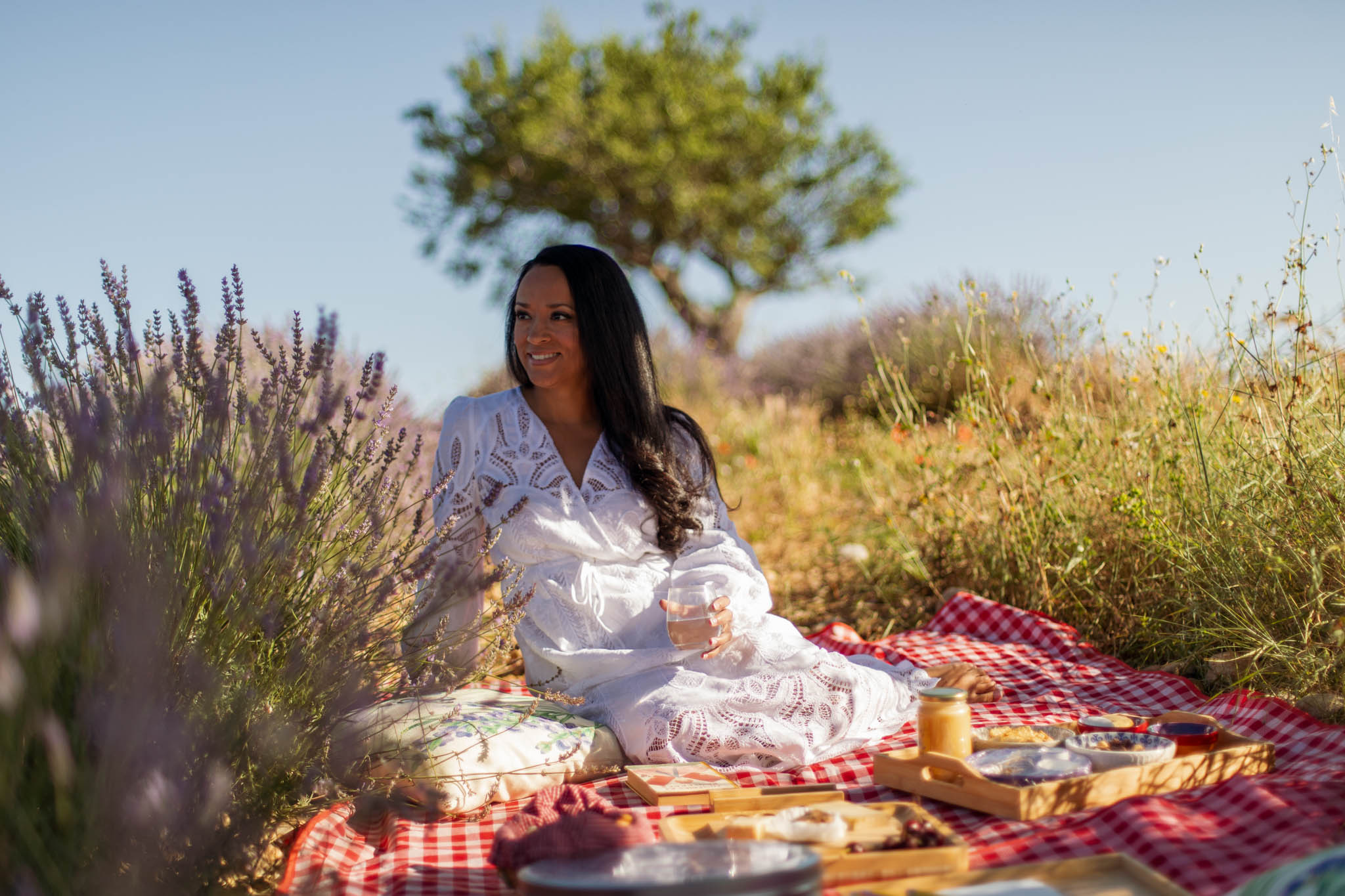 This session took place in early July, from 08:00 to 09:30. K booked a solo picnic photo session to celebrate her birthday while visiting Provence. For picnic sessions, mornings or evenings work best, as the light is soft and comfortable, and you are not sitting directly in the sun. Kim chose the breakfast timing, which was perfect for a calm, quiet experience.