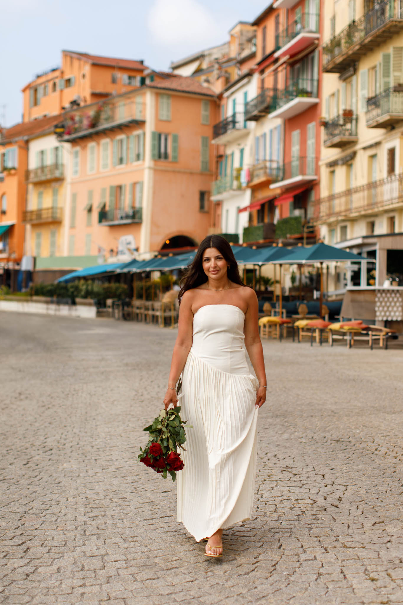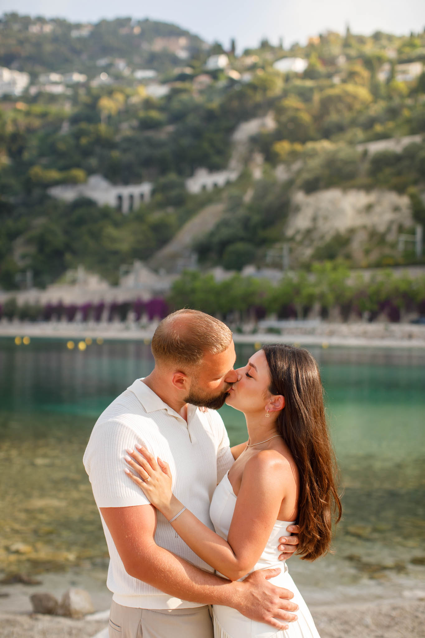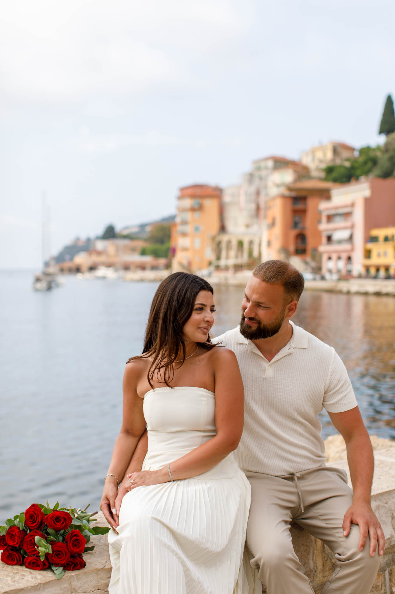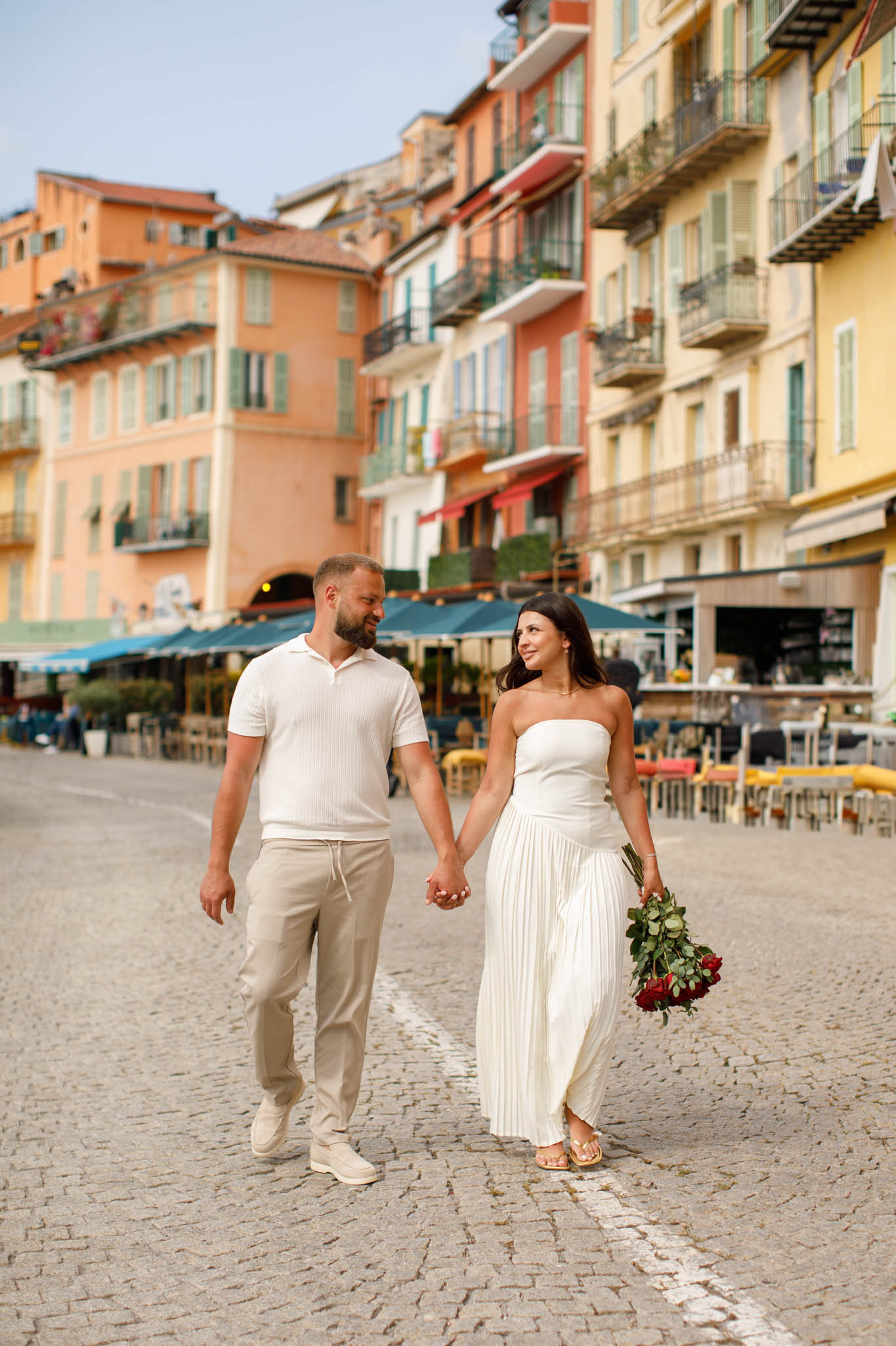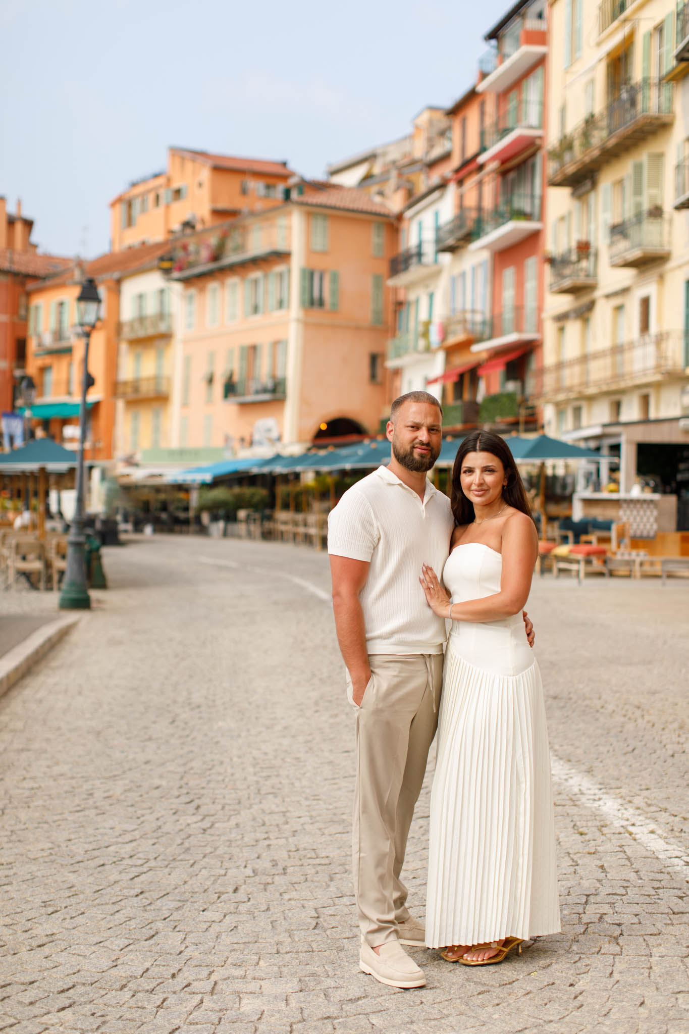 After the proposal and picnic, we continued with a 30-minute photo session around Villefranche-sur-Mer. We walked through the town and captured images along the waterfront, using the charming streets and colourful buildings as a backdrop. The combination of soft morning light and the quiet town created a natural, serene feel for the photos.