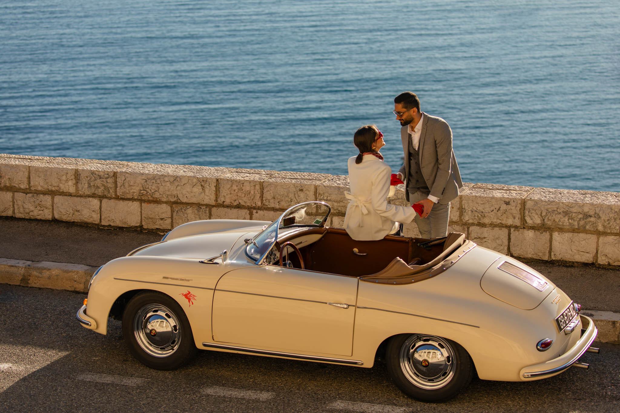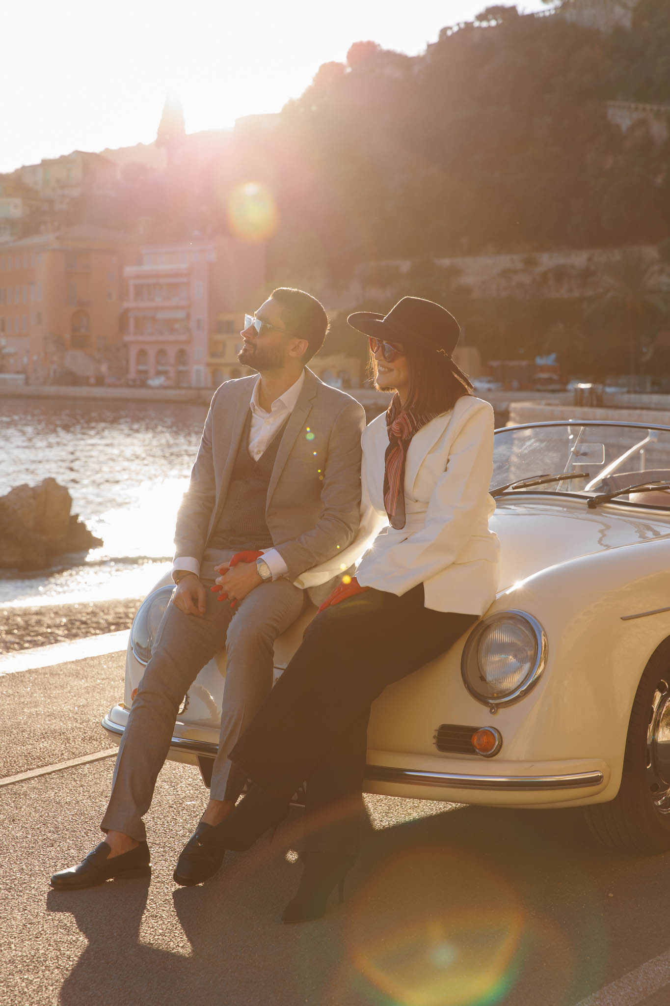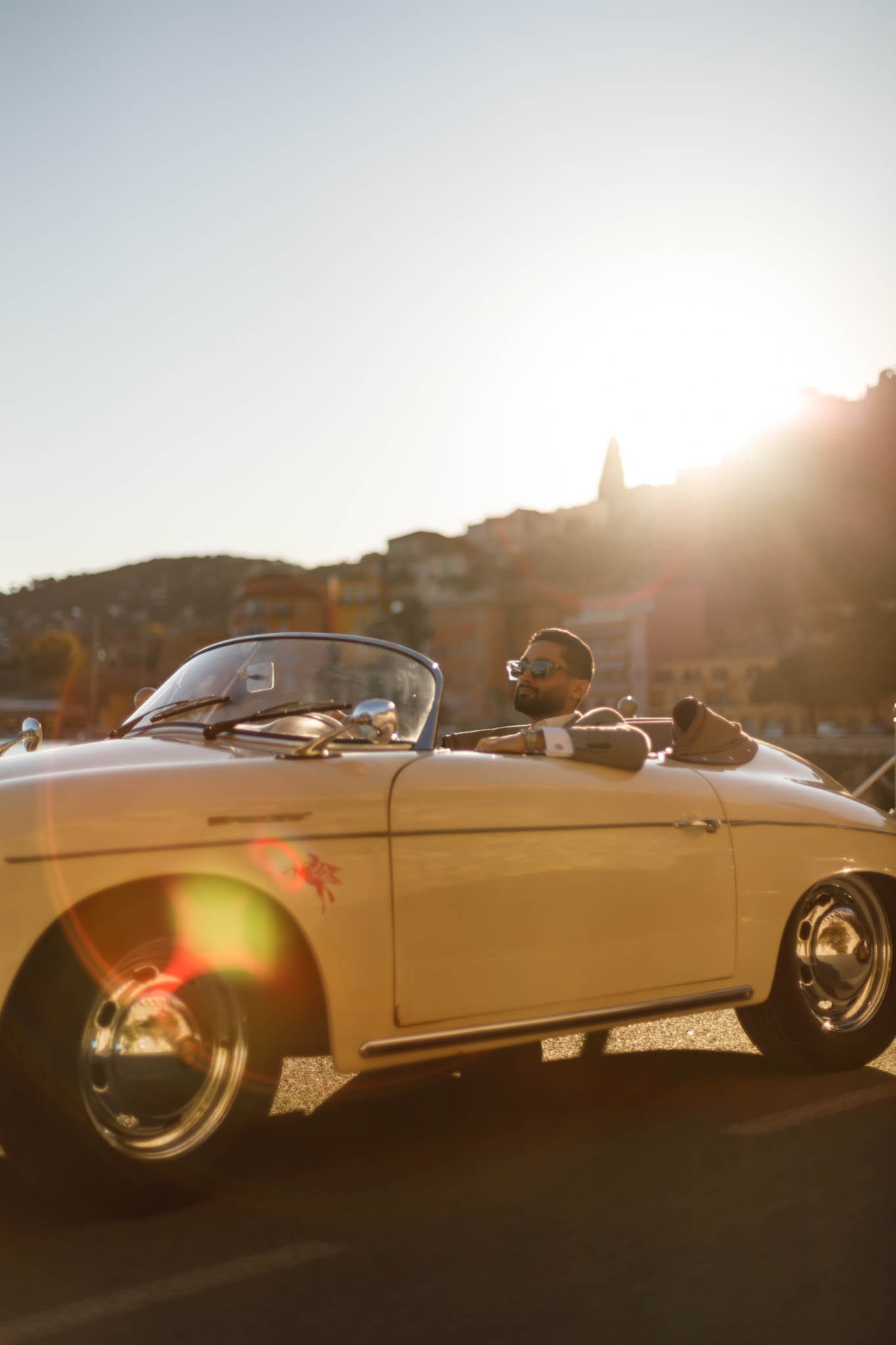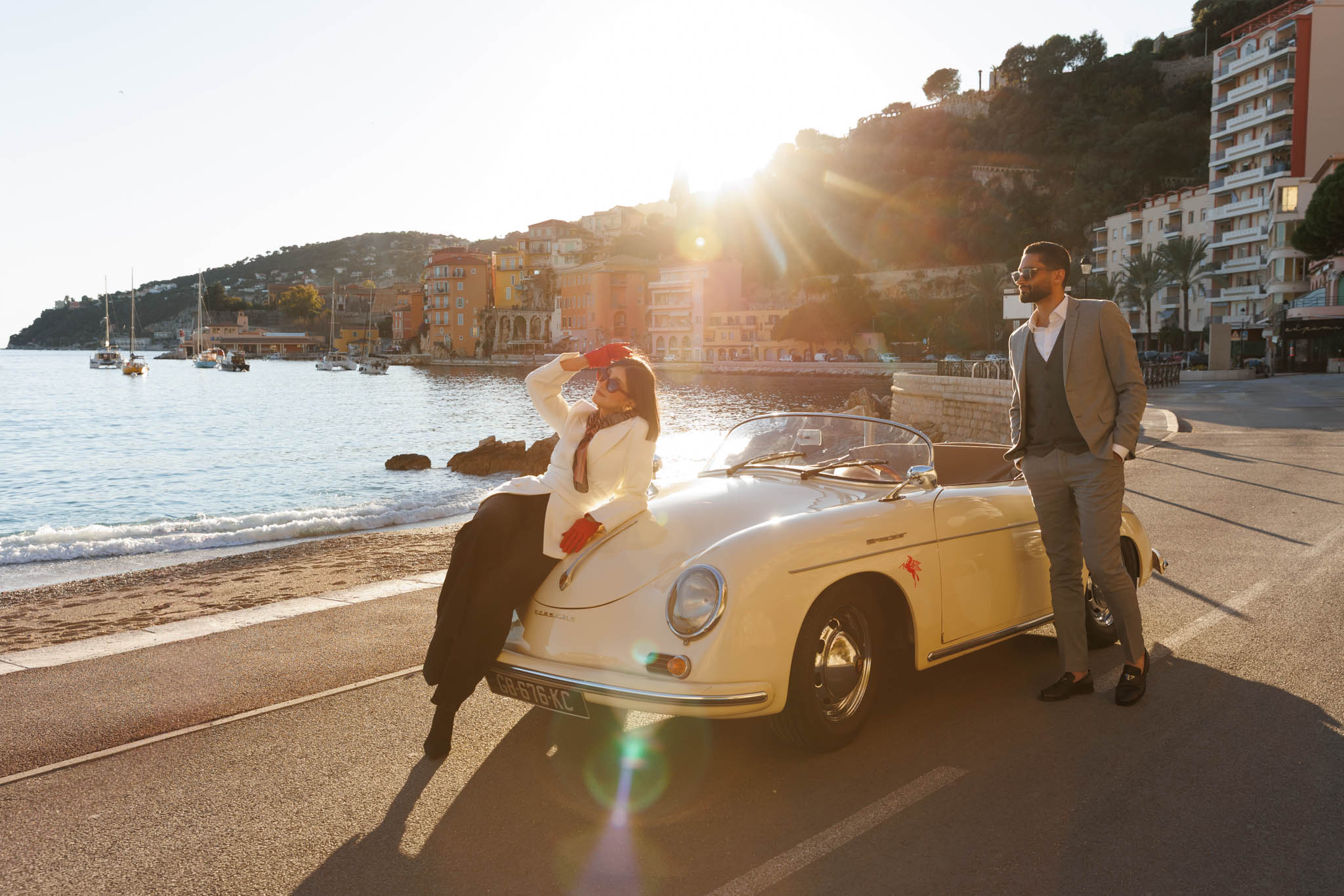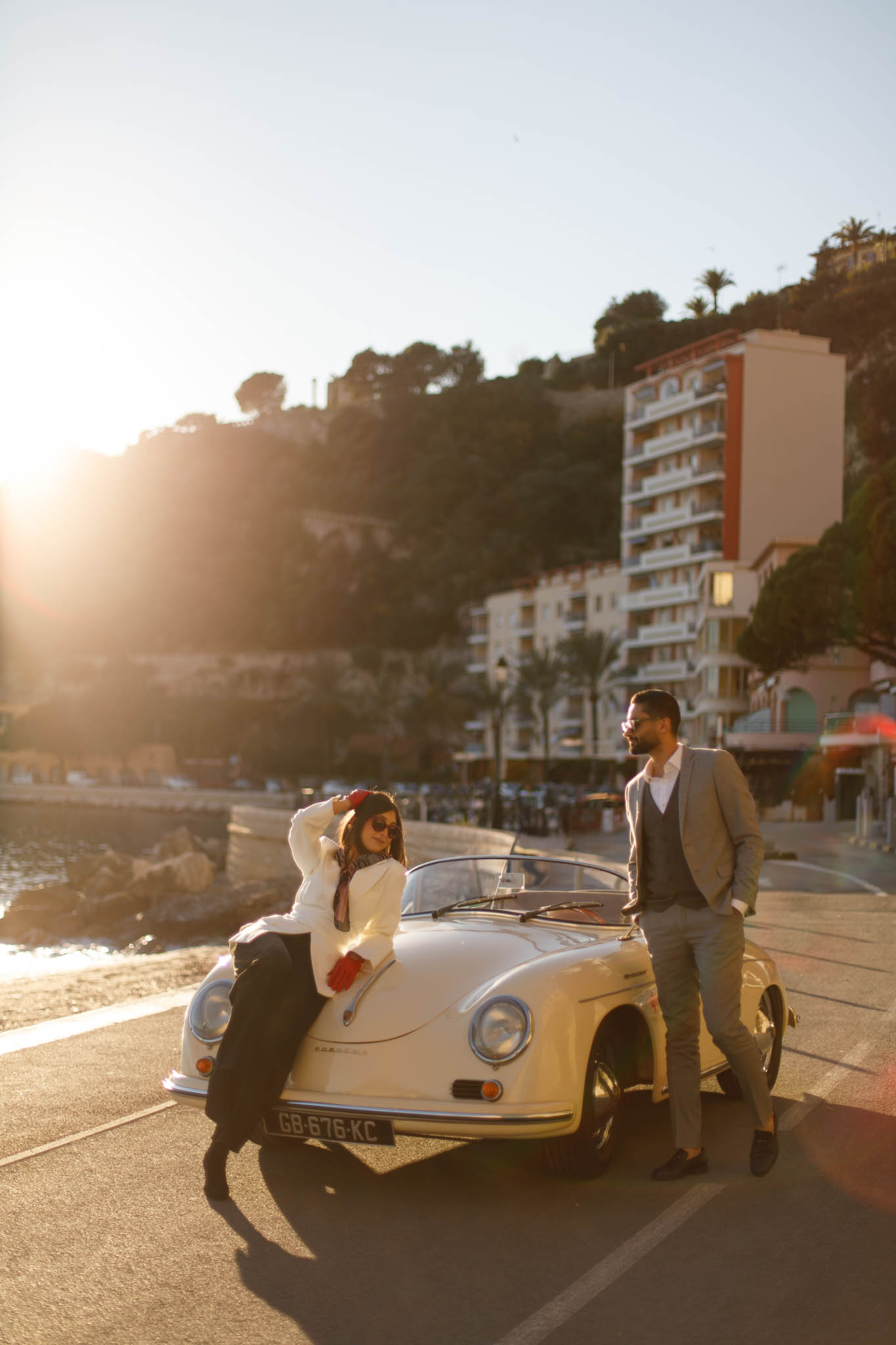This photoshoot took place on December 20th, 2024, with N and O, who wanted a fun, vintage-inspired session while travelling along the French Riviera. They decided to incorporate a classic car for a playful and stylish experience. We rented a 1973 Porsche 356 Speedster through Sunset Ride, a charming beige car that matched perfectly with the golden late afternoon light.