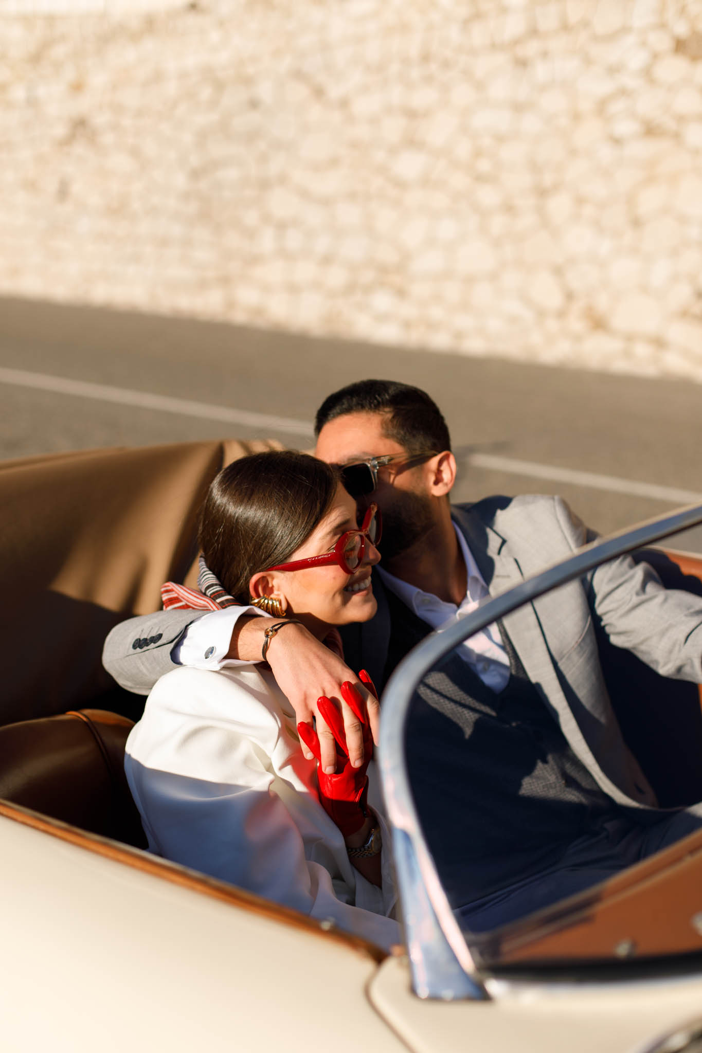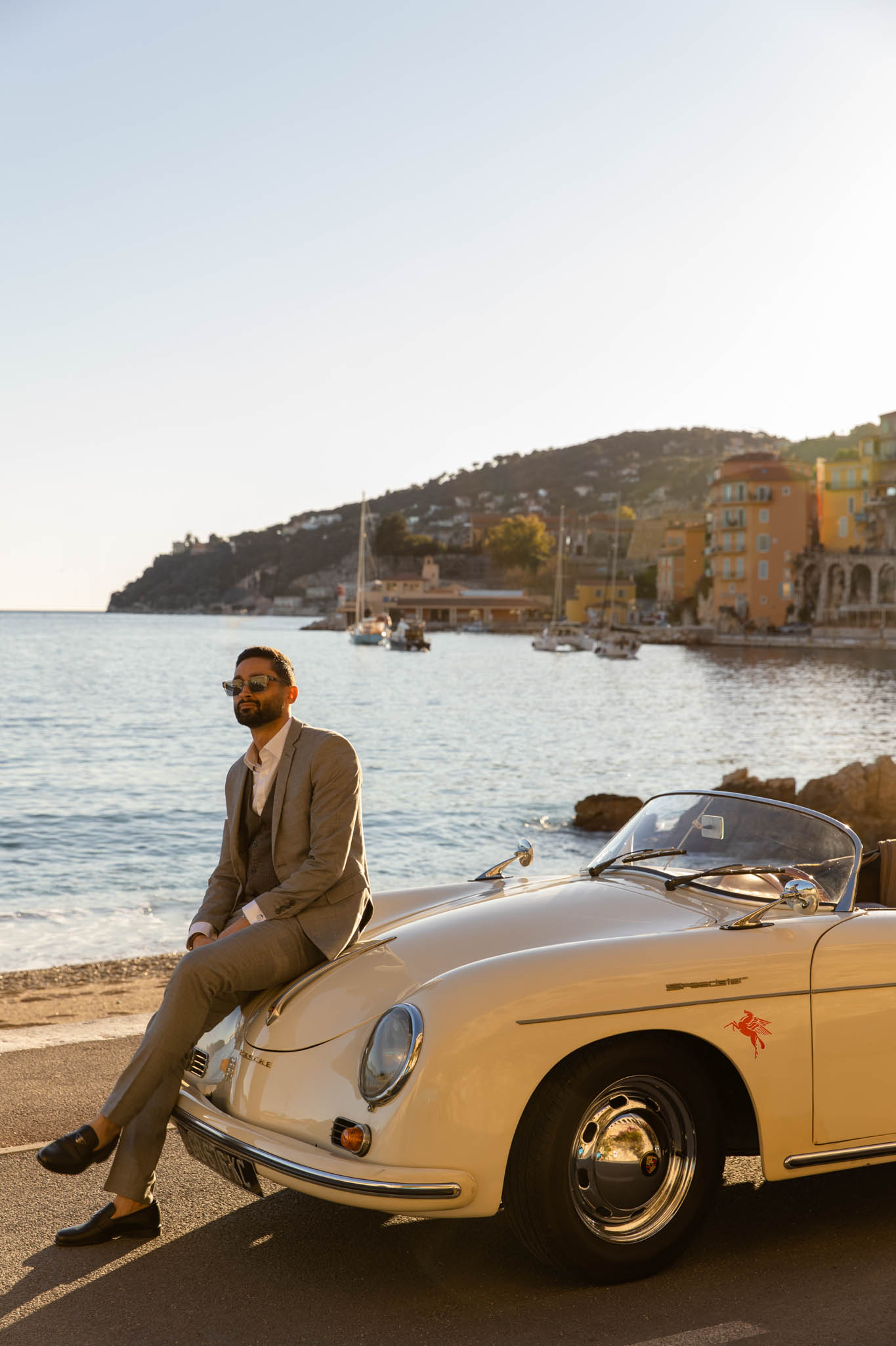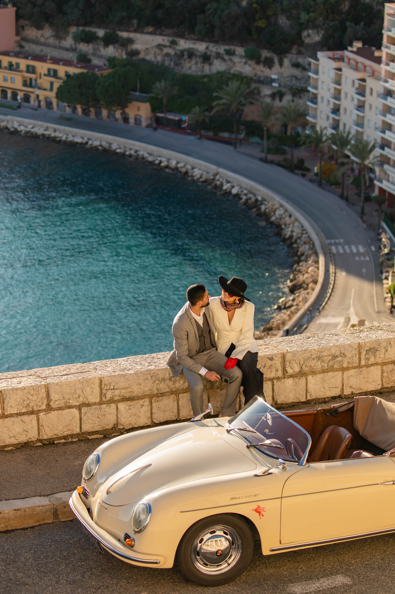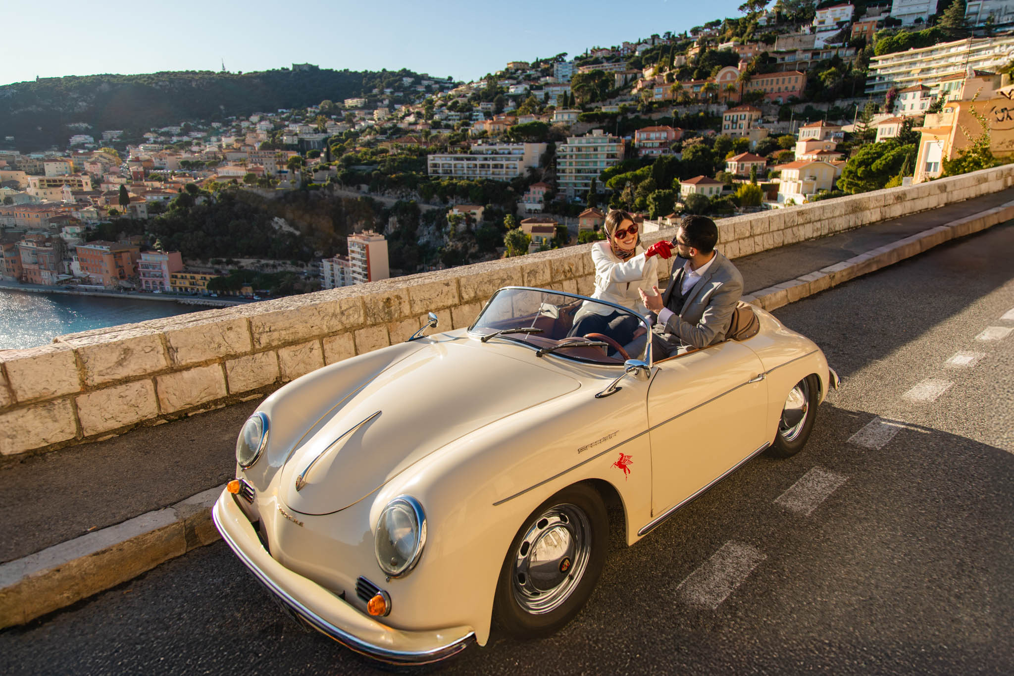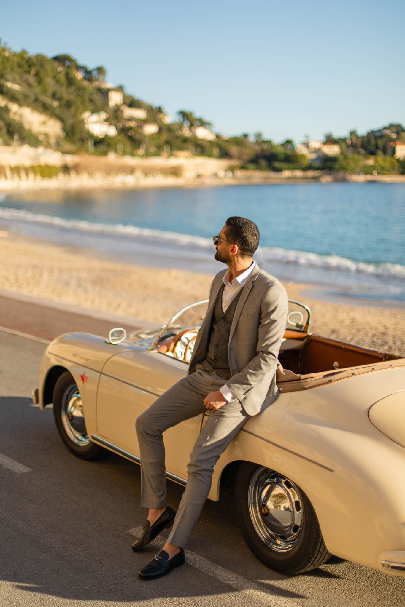 This photoshoot took place on December 20th, 2024, with N and O, who wanted a fun, vintage-inspired session while travelling along the French Riviera. They decided to incorporate a classic car for a playful and stylish experience. We rented a 1973 Porsche 356 Speedster through Sunset Ride, a charming beige car that matched perfectly with the golden late afternoon light.