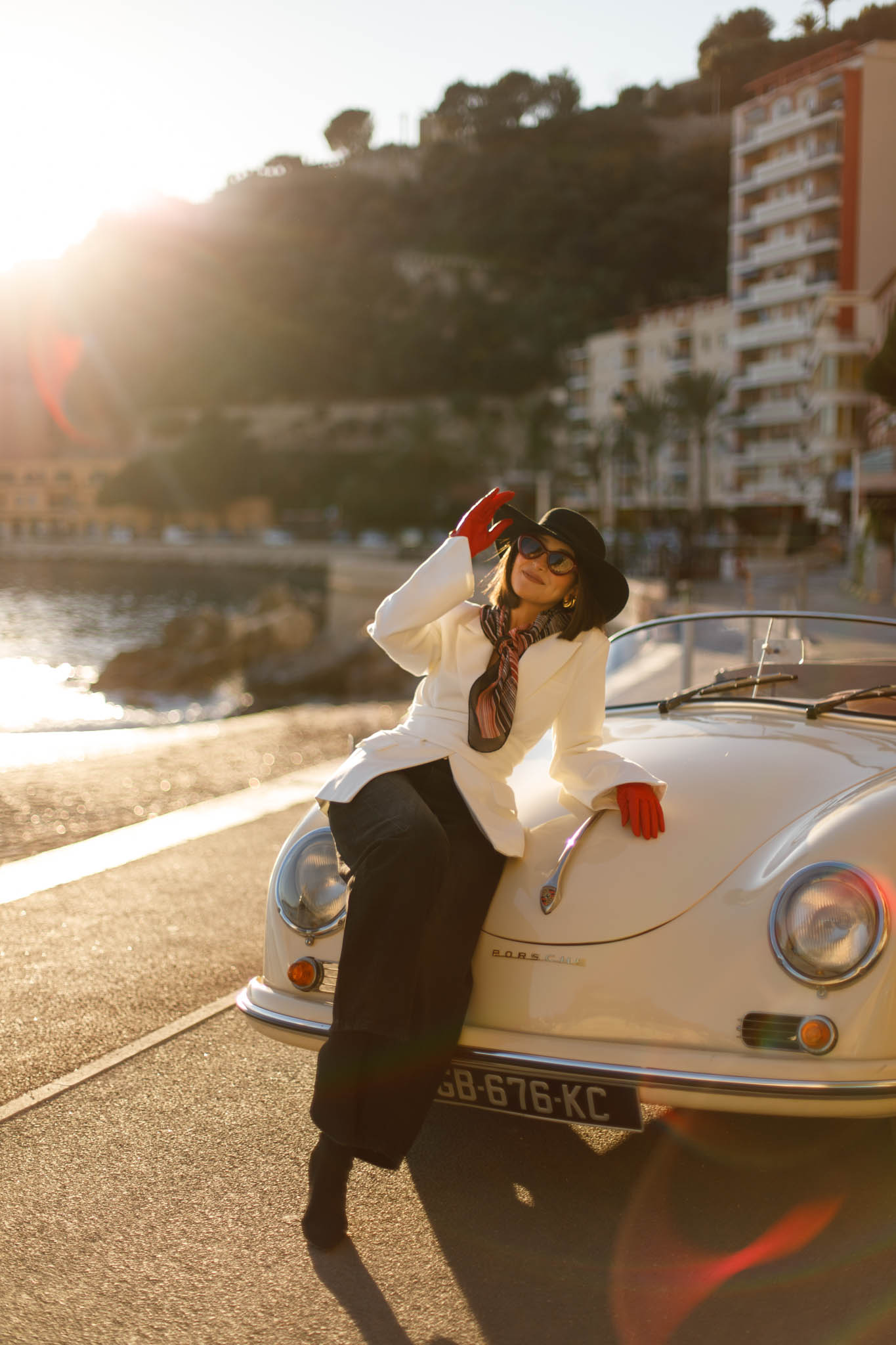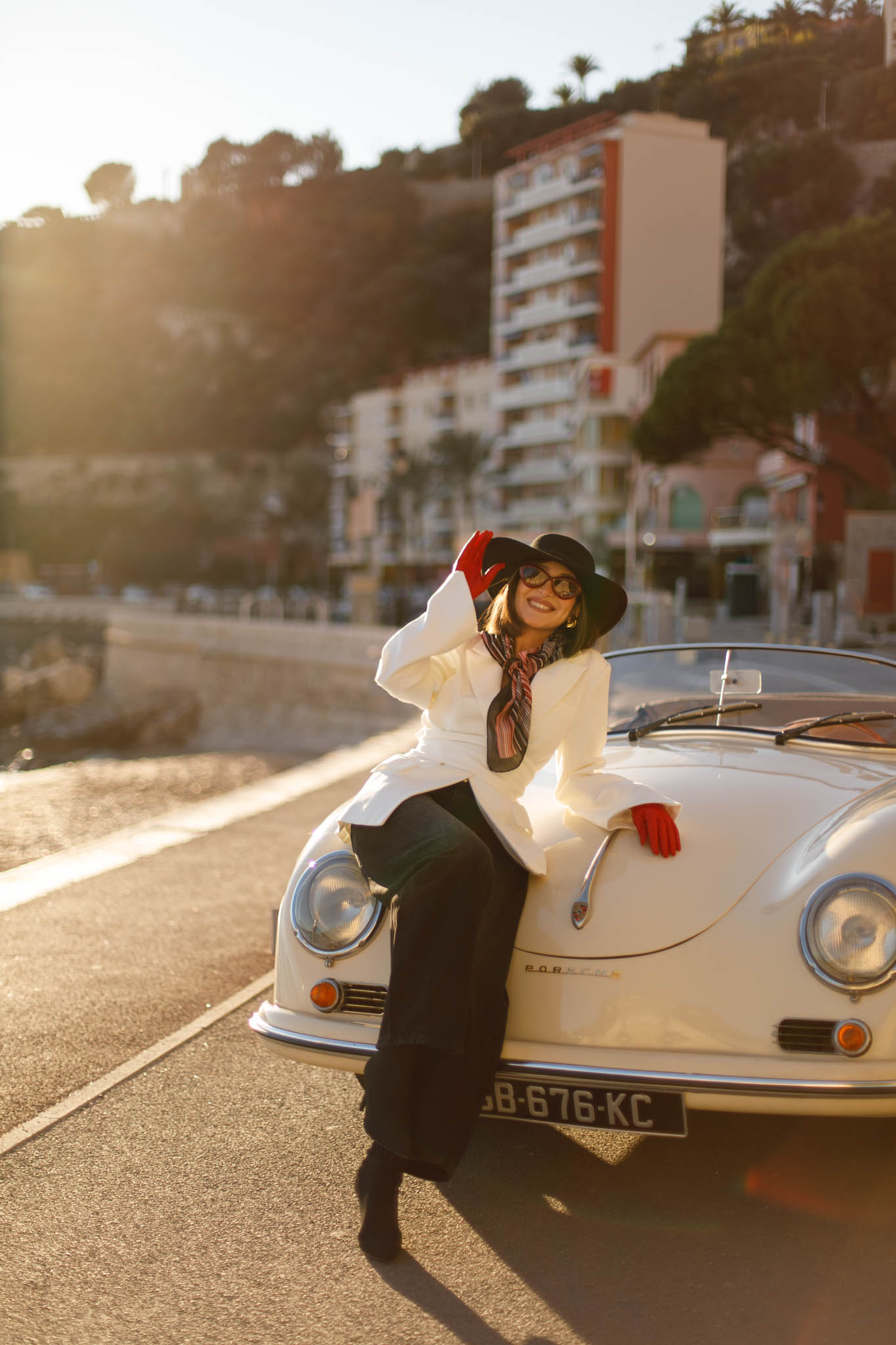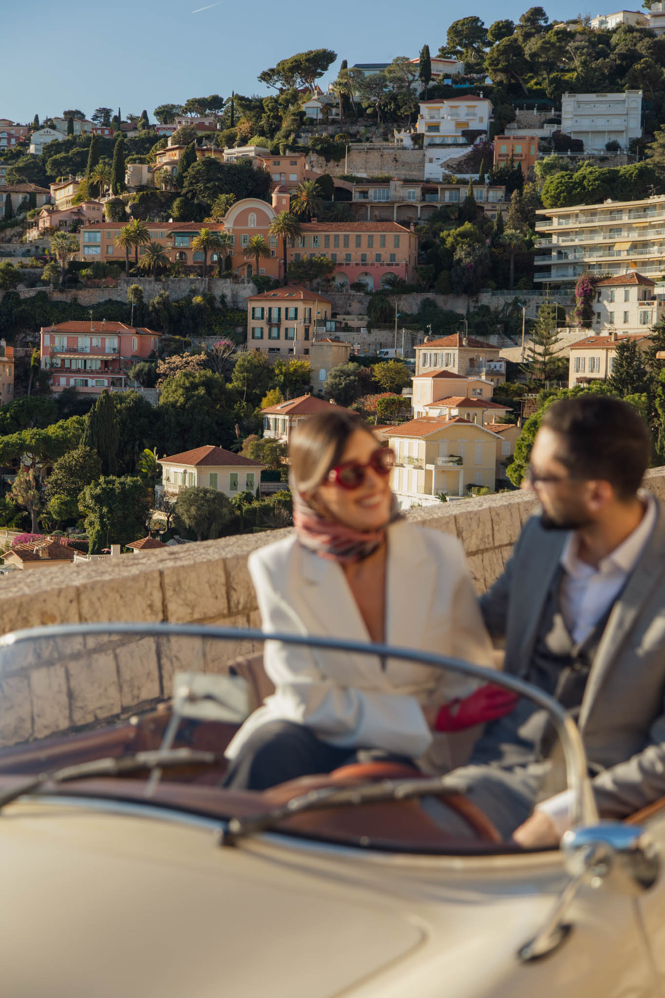 We met at 14:30, as in December the sun sets early along the Riviera. On this date, the sun was scheduled to set around 16:54, so the timing allowed us to capture both soft afternoon light and the warm tones of the approaching sunset. Our first stop was on Boulevard Napoleon III, a small viewpoint overlooking Villefranche-sur-Mer Bay. The combination of the sparkling water and the car created a visually striking setting. The couple looked incredible in their first outfits, vintage-inspired with scarves and a stylish black hat, which complemented the classic car perfectly. We took a mixture of portraits of N and O individually, photos together, and detailed shots of the car itself.
