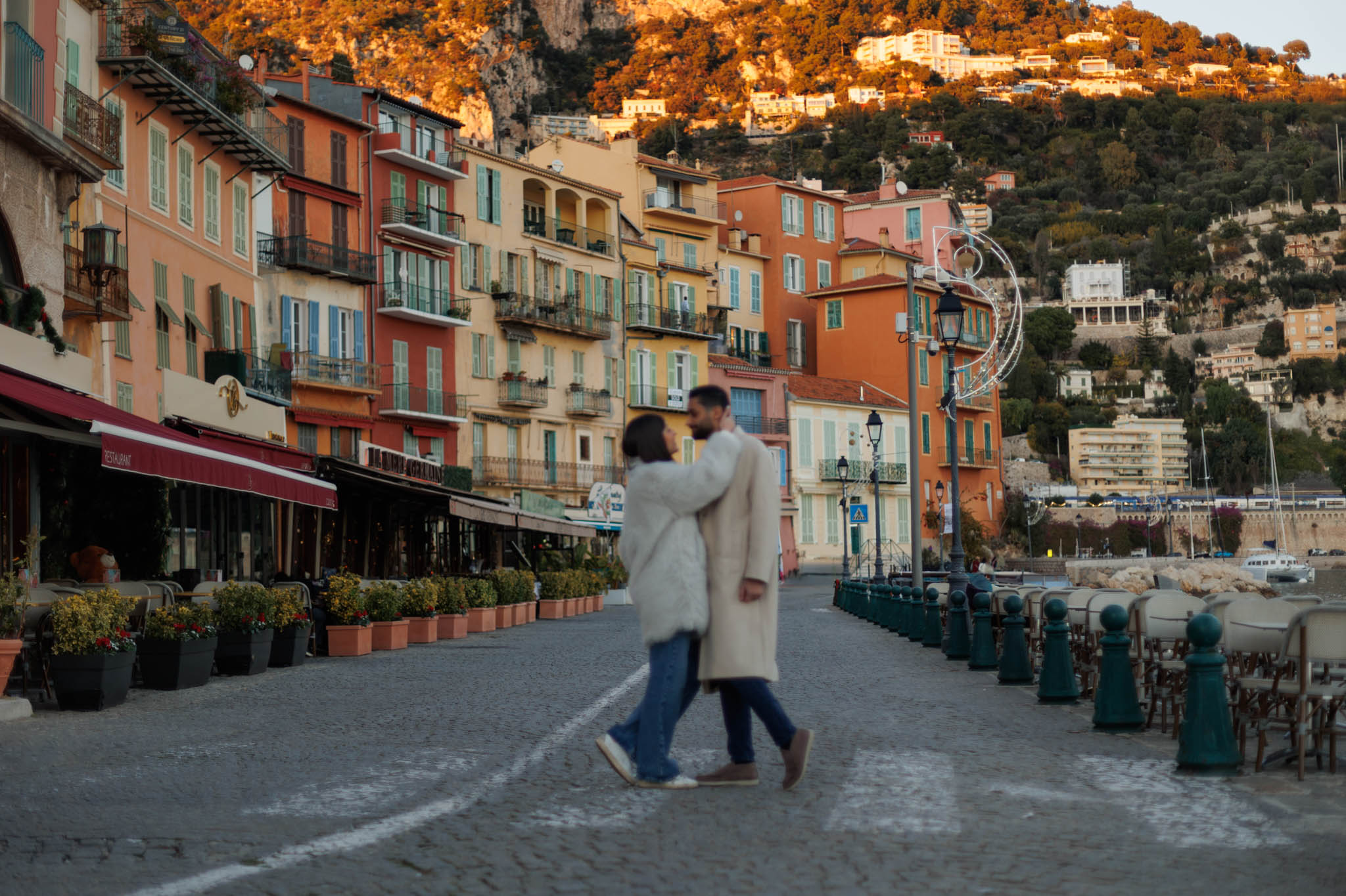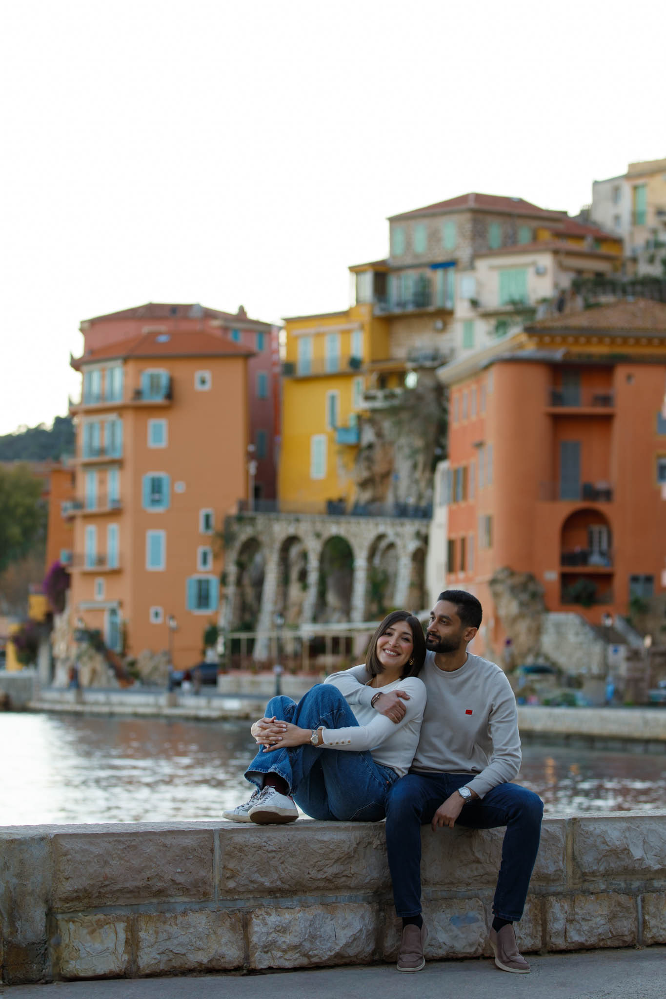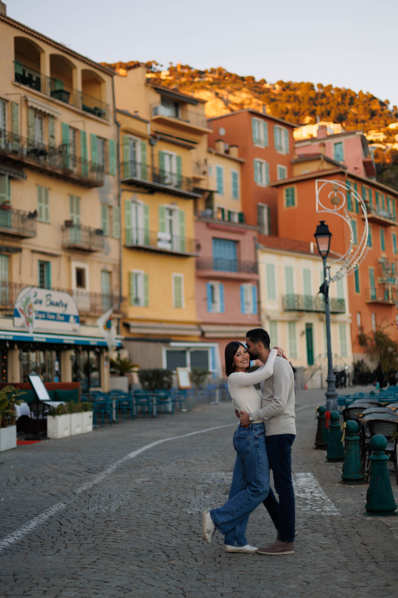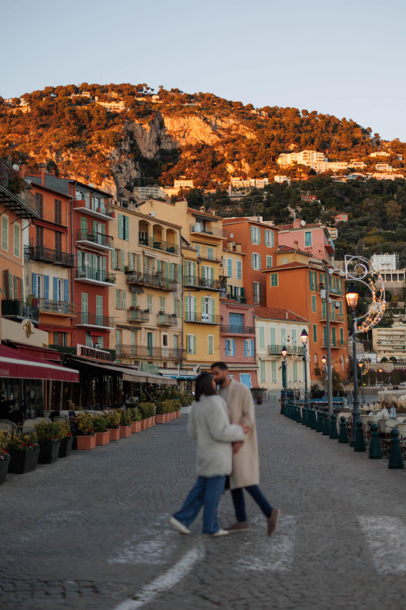 After an outfit change, we concluded the session with a short walk in Villefranche-sur-Mer. Although the sun had mostly set behind the mountains by this time, the soft residual light reflected on the buildings and harbour, creating a warm glow and beautiful reflections on the water. We captured a variety of shots along the harbour front, ending with scenic views of the colourful buildings against the fading sunset.