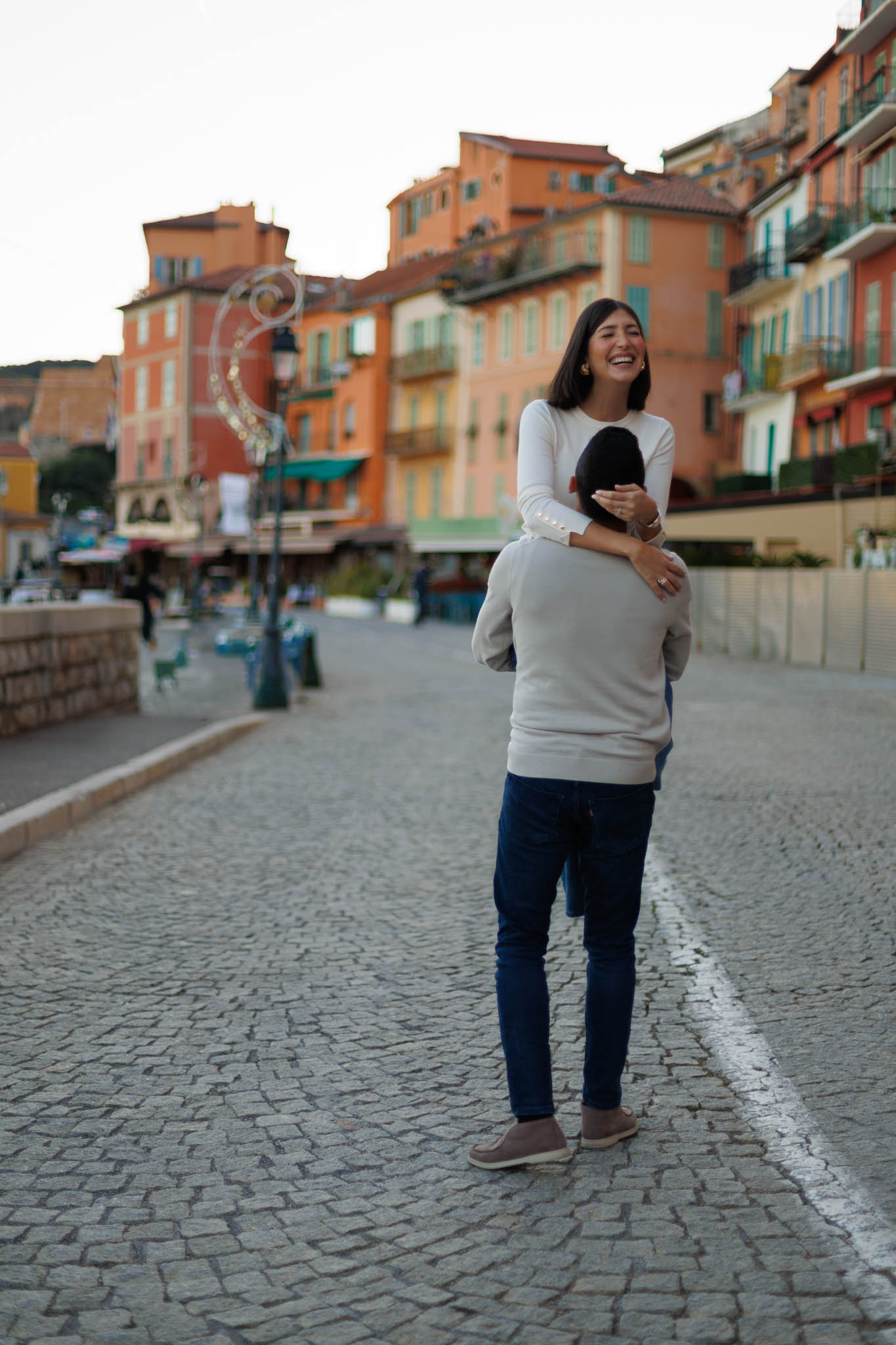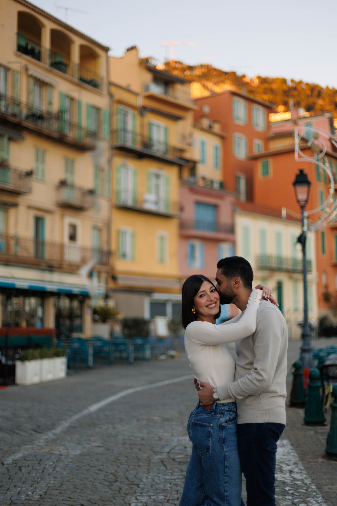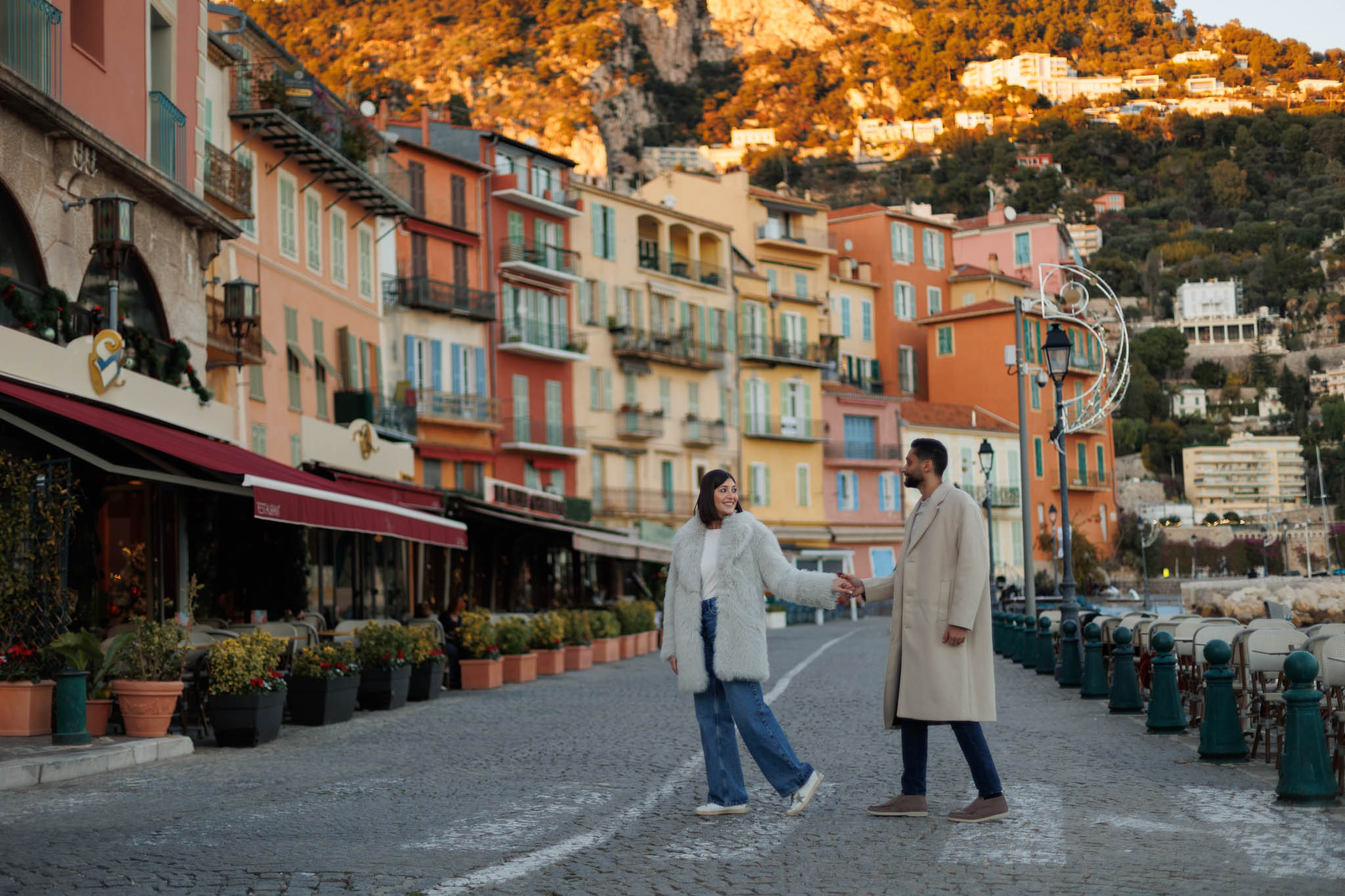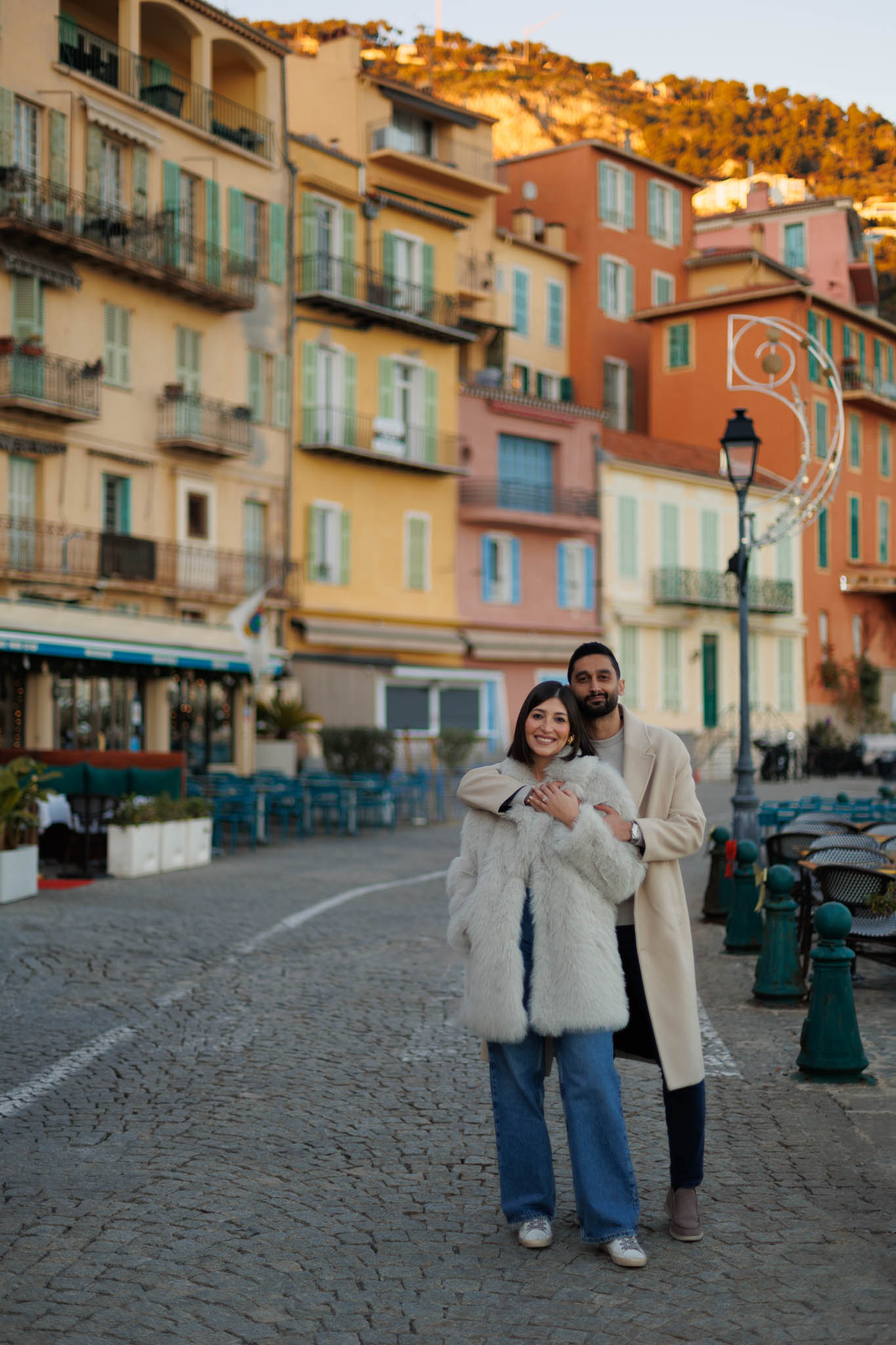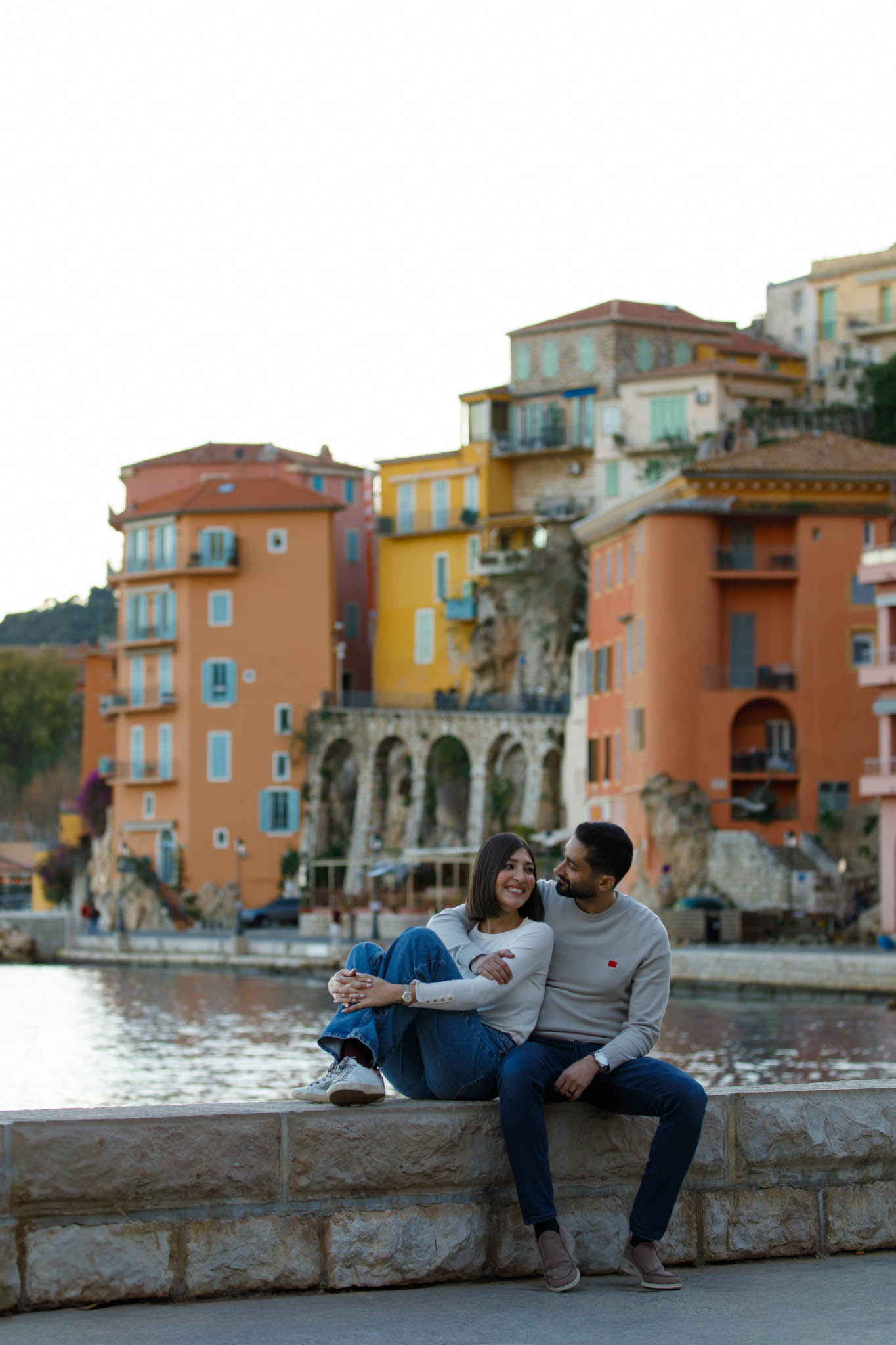 After an outfit change, we concluded the session with a short walk in Villefranche-sur-Mer. Although the sun had mostly set behind the mountains by this time, the soft residual light reflected on the buildings and harbour, creating a warm glow and beautiful reflections on the water. We captured a variety of shots along the harbour front, ending with scenic views of the colourful buildings against the fading sunset.