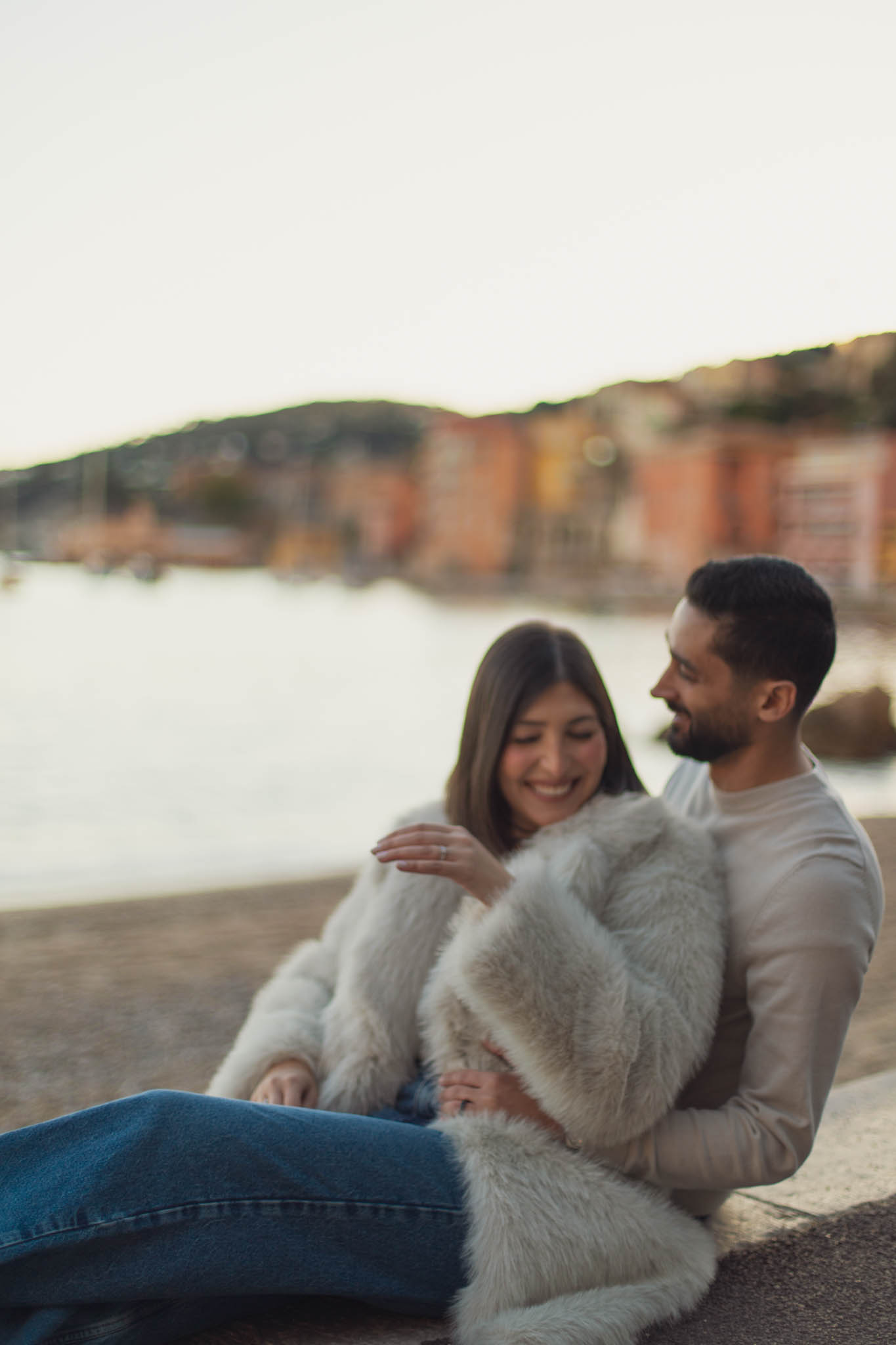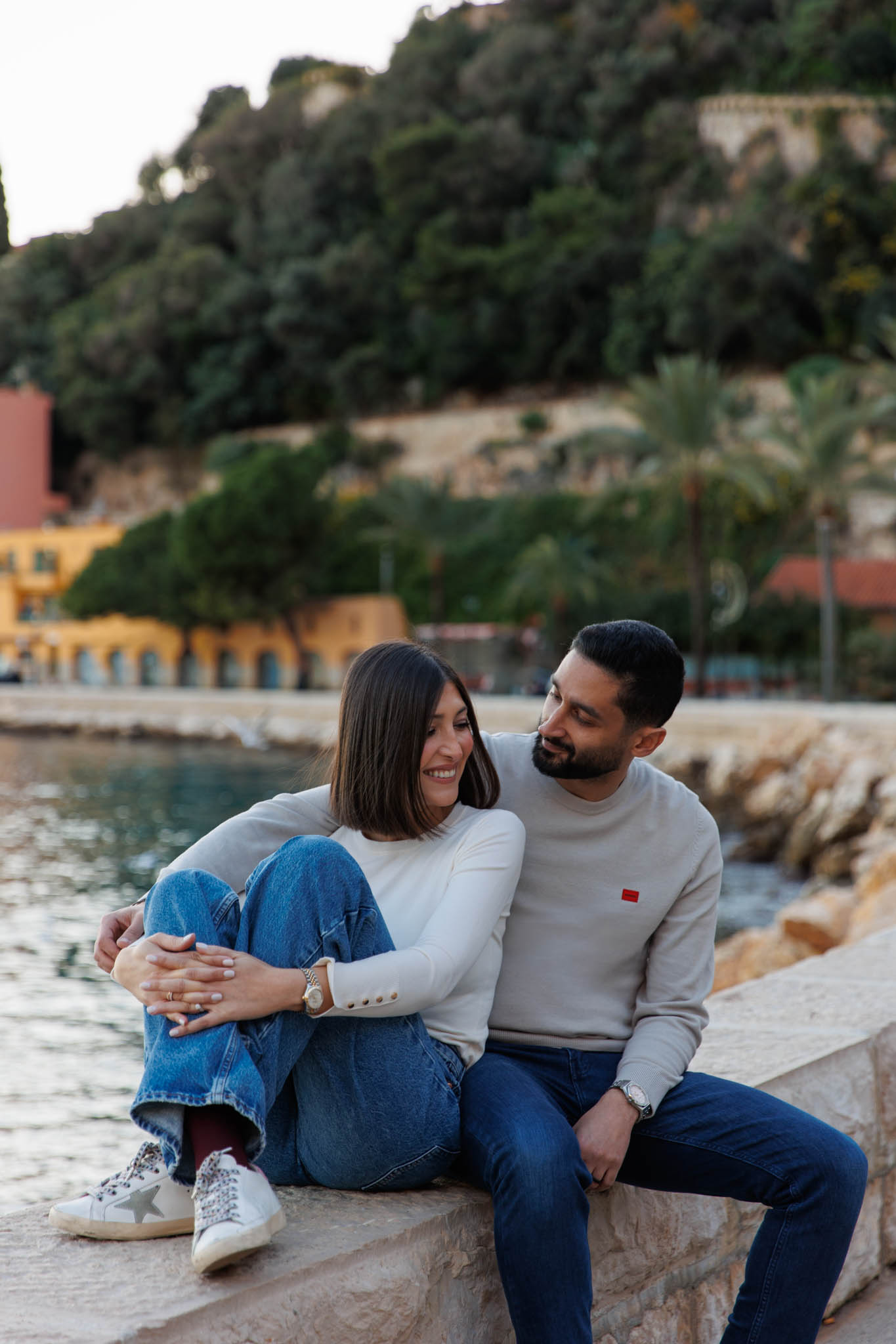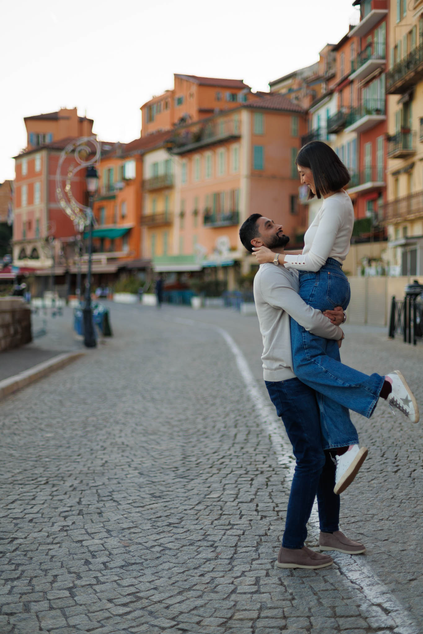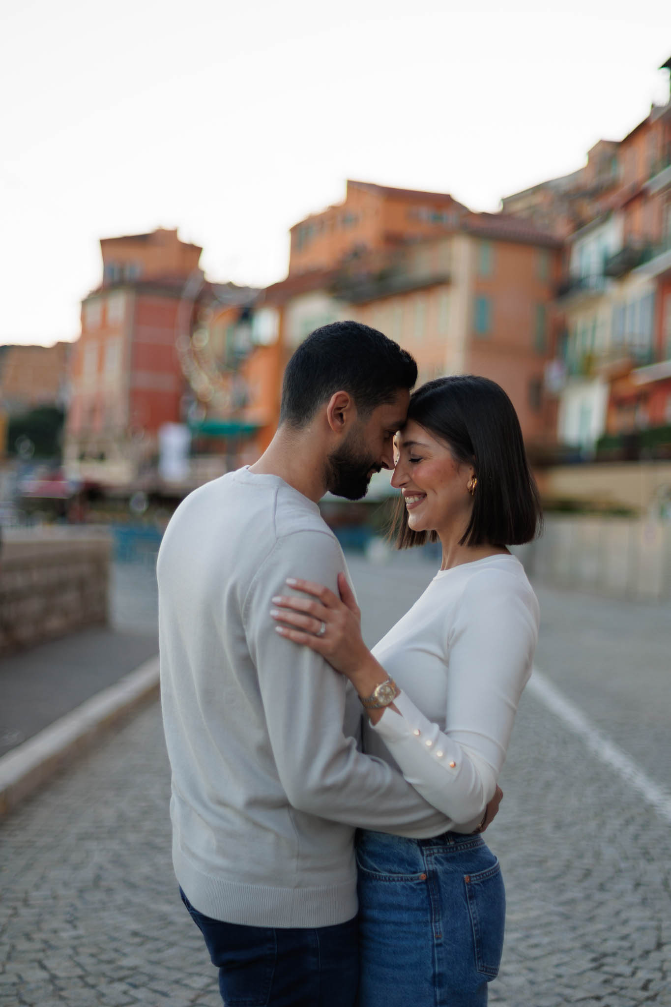 After an outfit change, we concluded the session with a short walk in Villefranche-sur-Mer. Although the sun had mostly set behind the mountains by this time, the soft residual light reflected on the buildings and harbour, creating a warm glow and beautiful reflections on the water. We captured a variety of shots along the harbour front, ending with scenic views of the colourful buildings against the fading sunset.